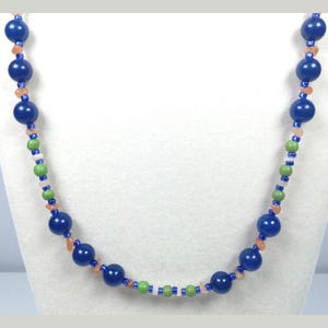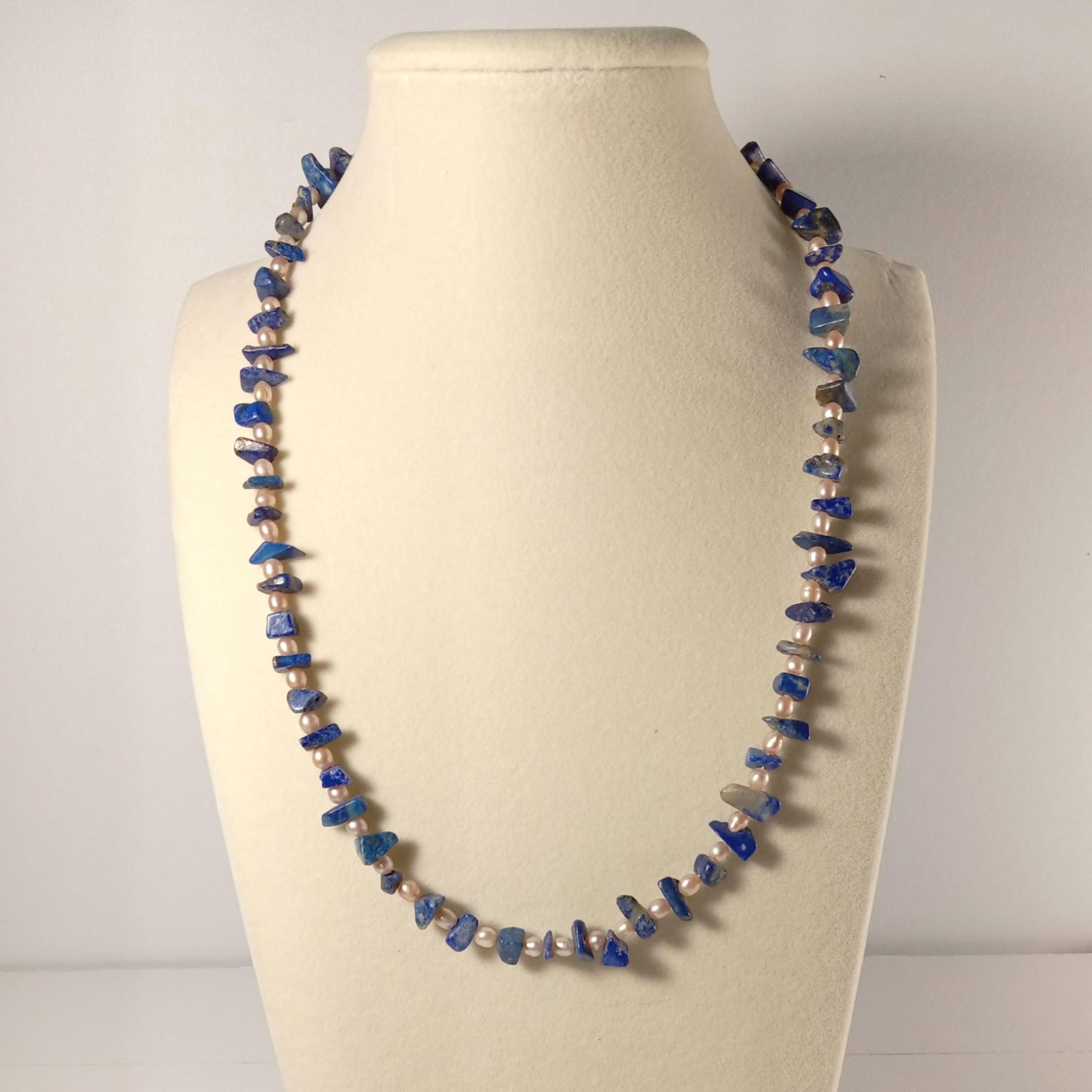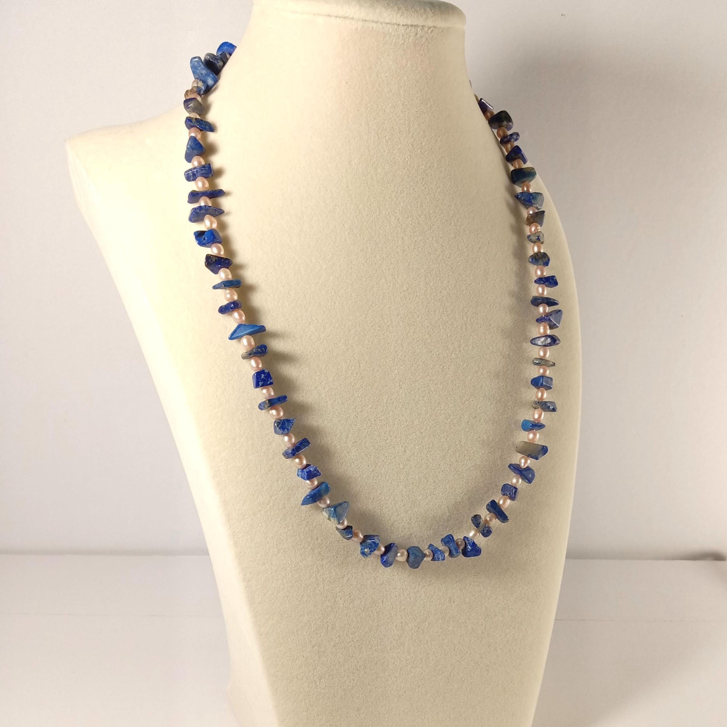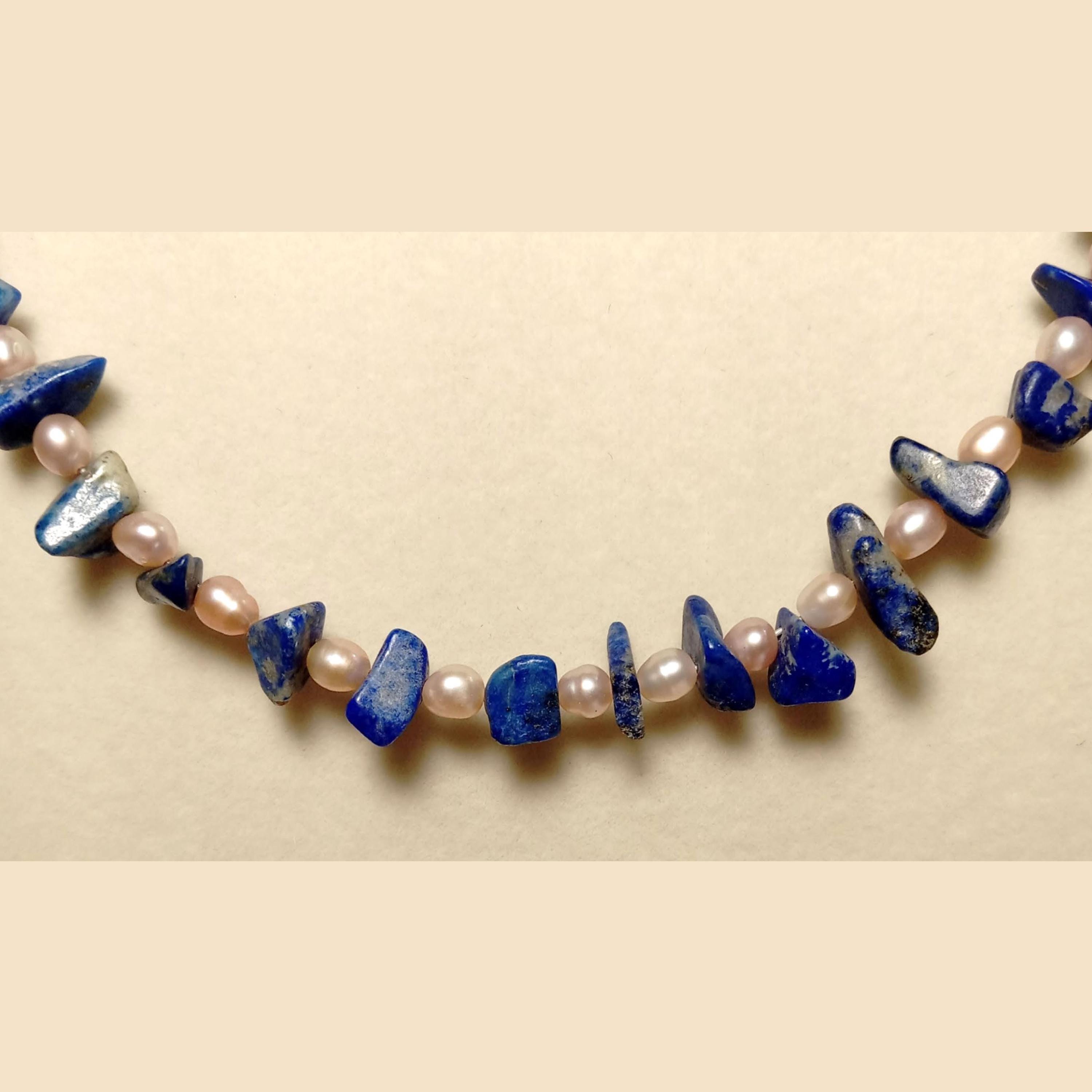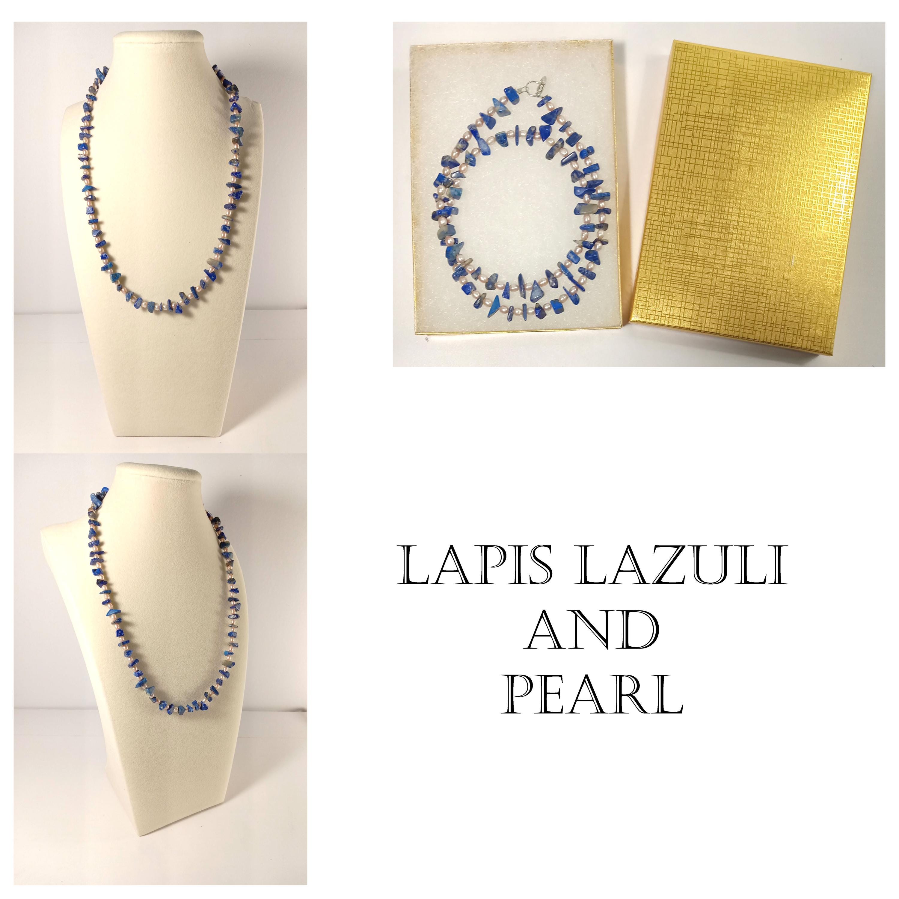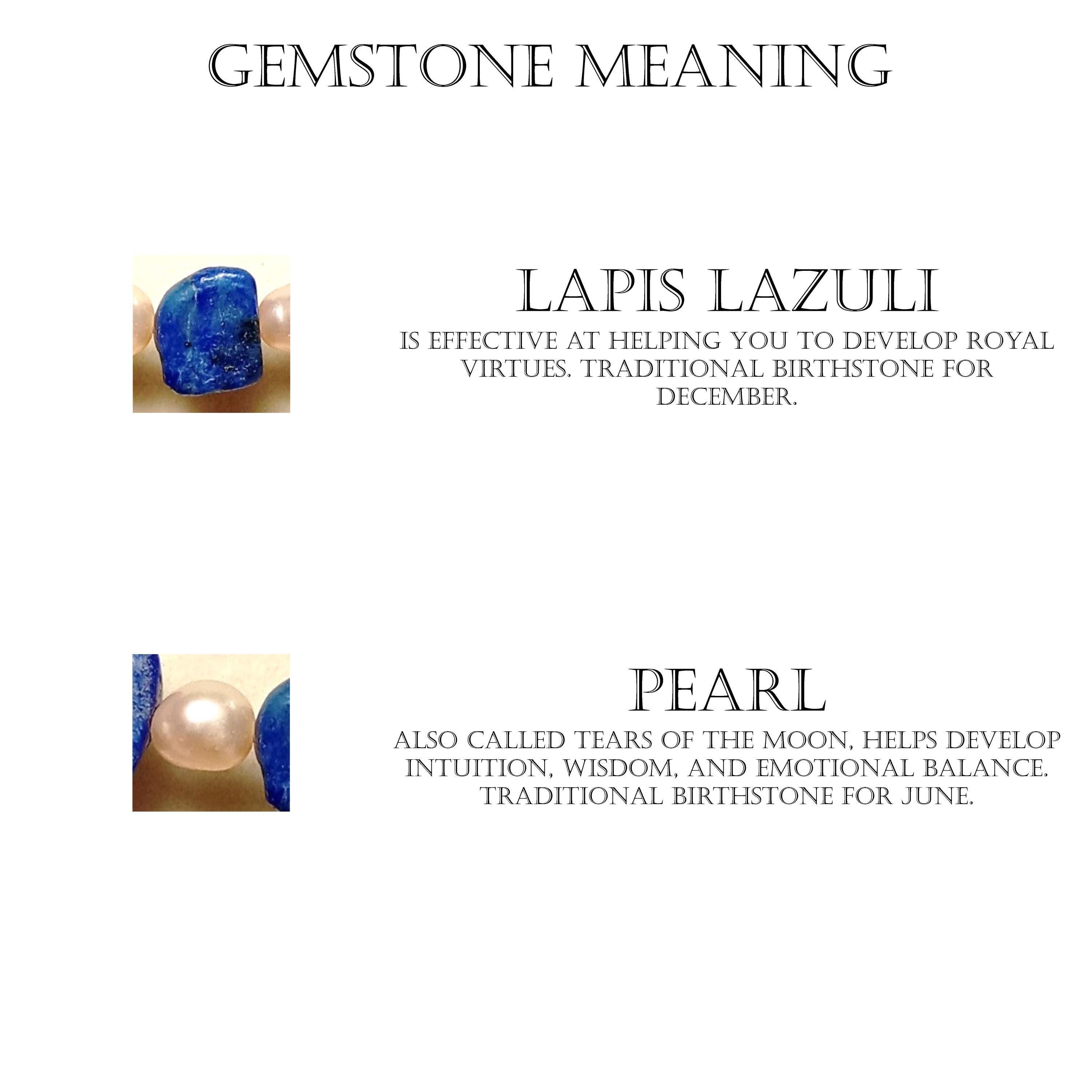 This one-of-a-kind Lapis Lazuli and Pearl is a necklace made with natural stones. Both of the beads are birthstones for the months of June and December.