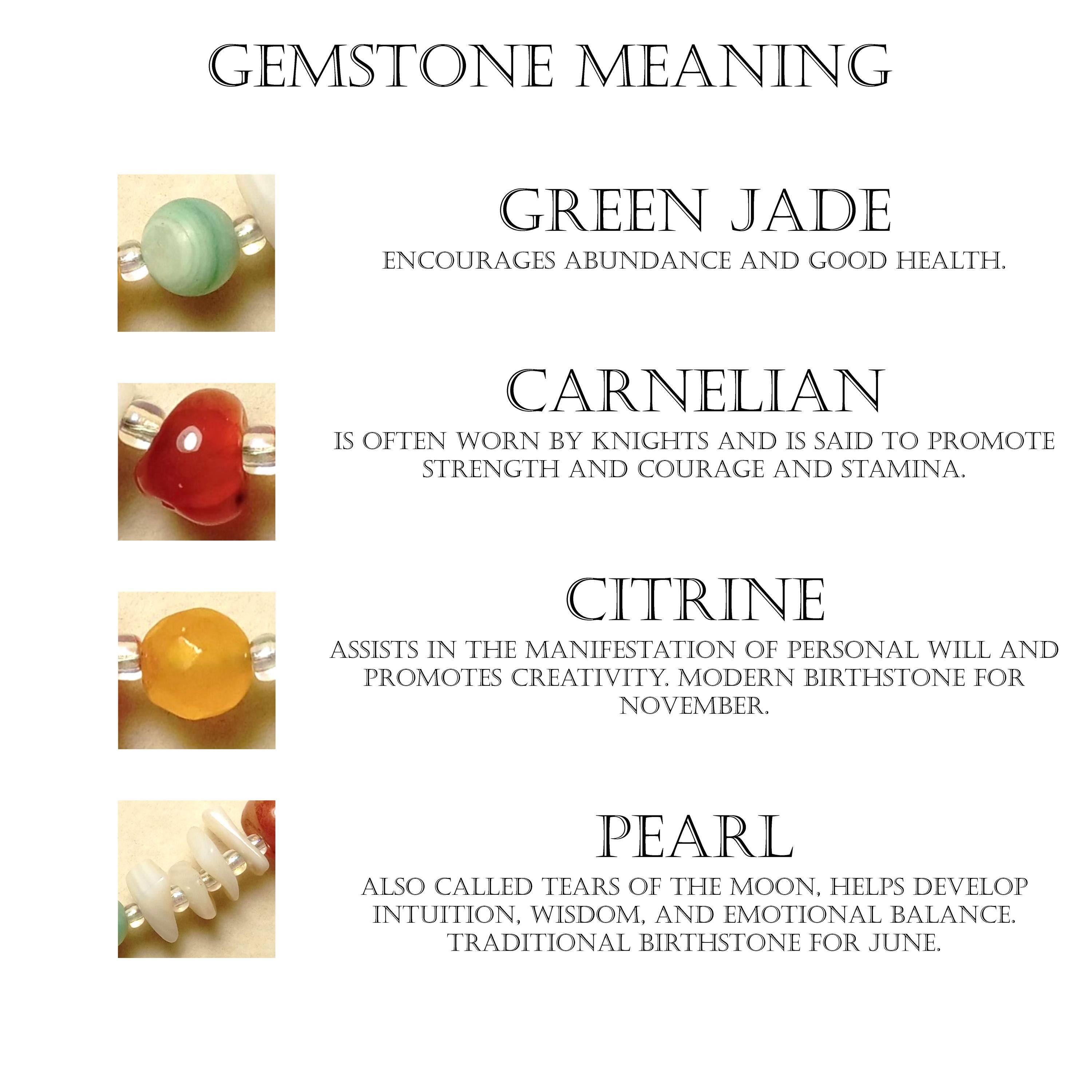 This one-of-a-kind Sea Green Jade with Carnelian and Citrine plus Mother of Pearl Chips is a necklace made with natural stones. Two of the beads are birthstones for the months of June and November.