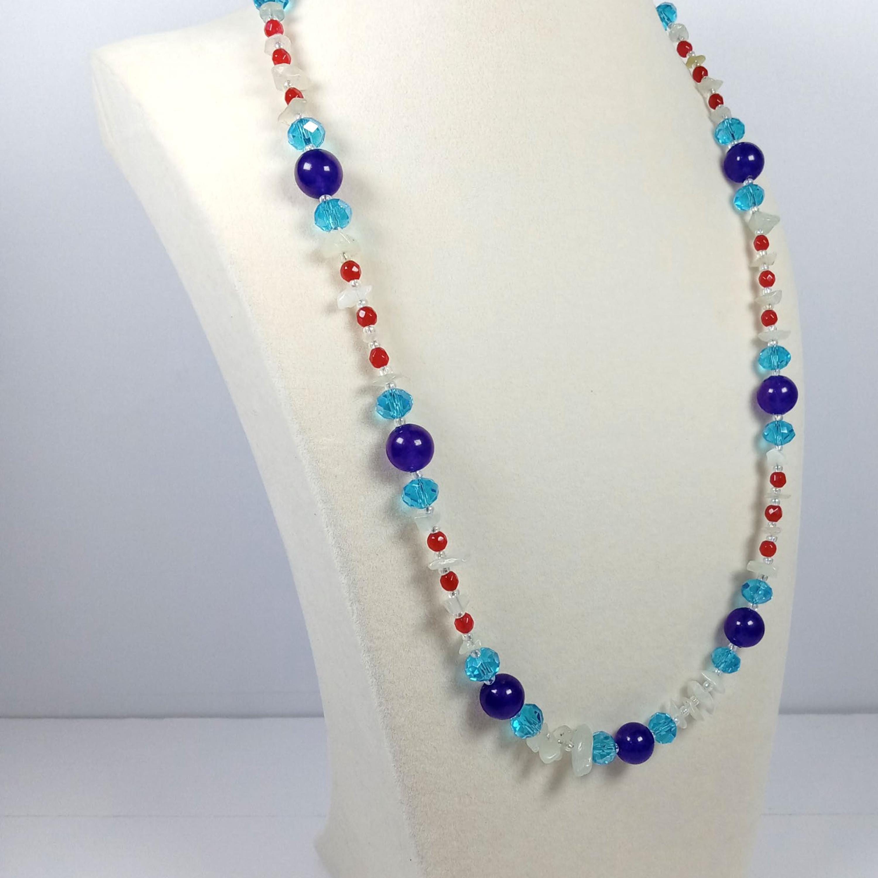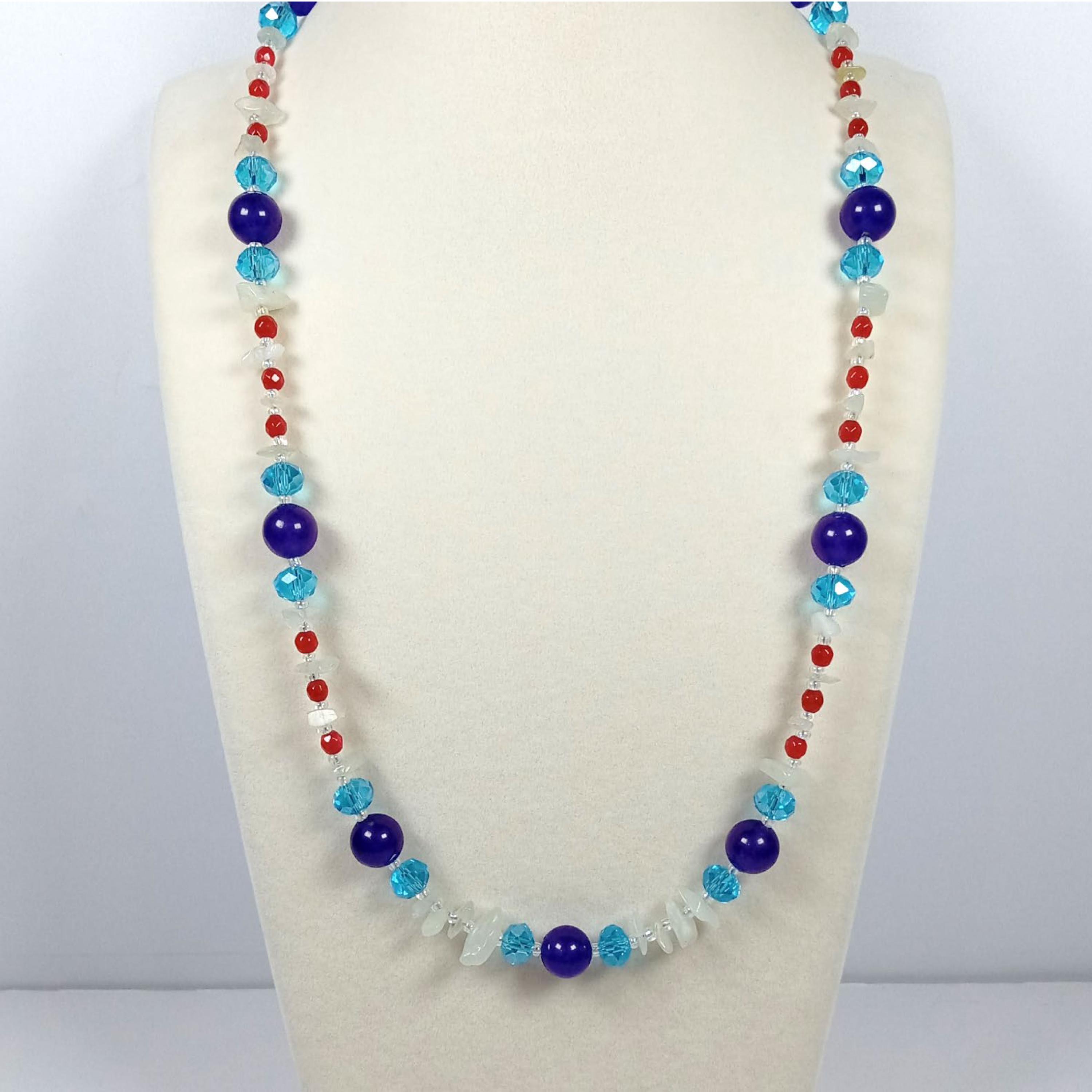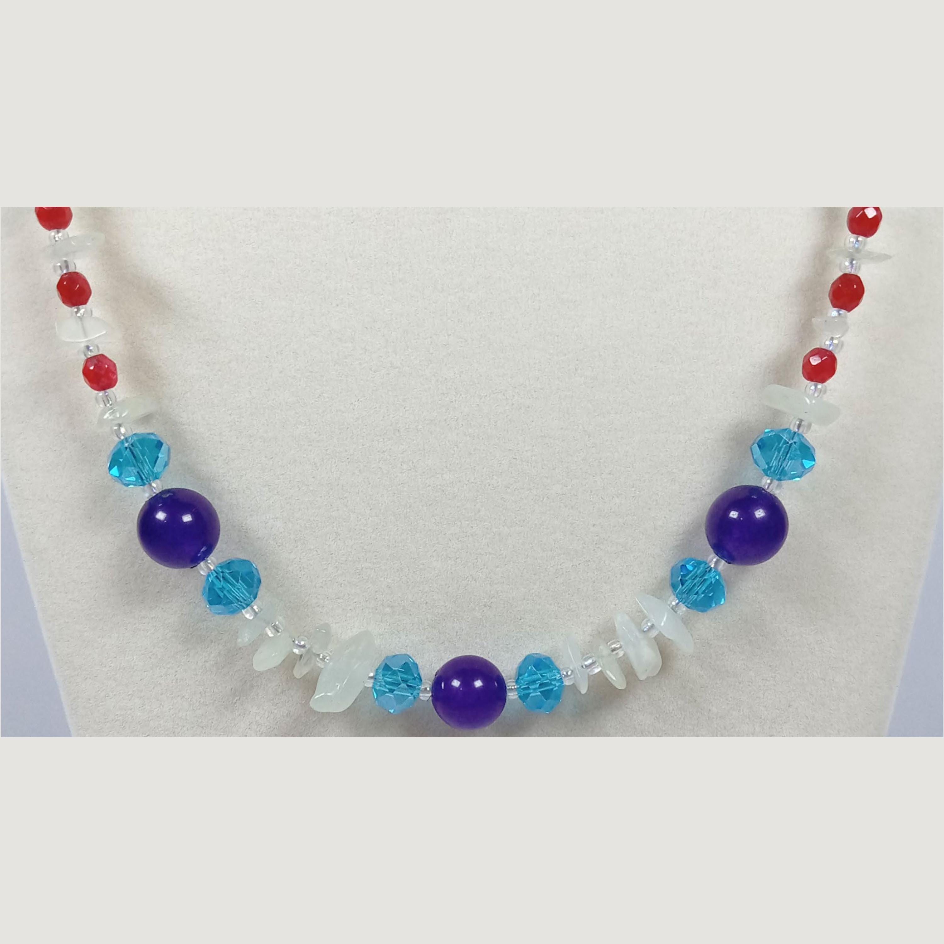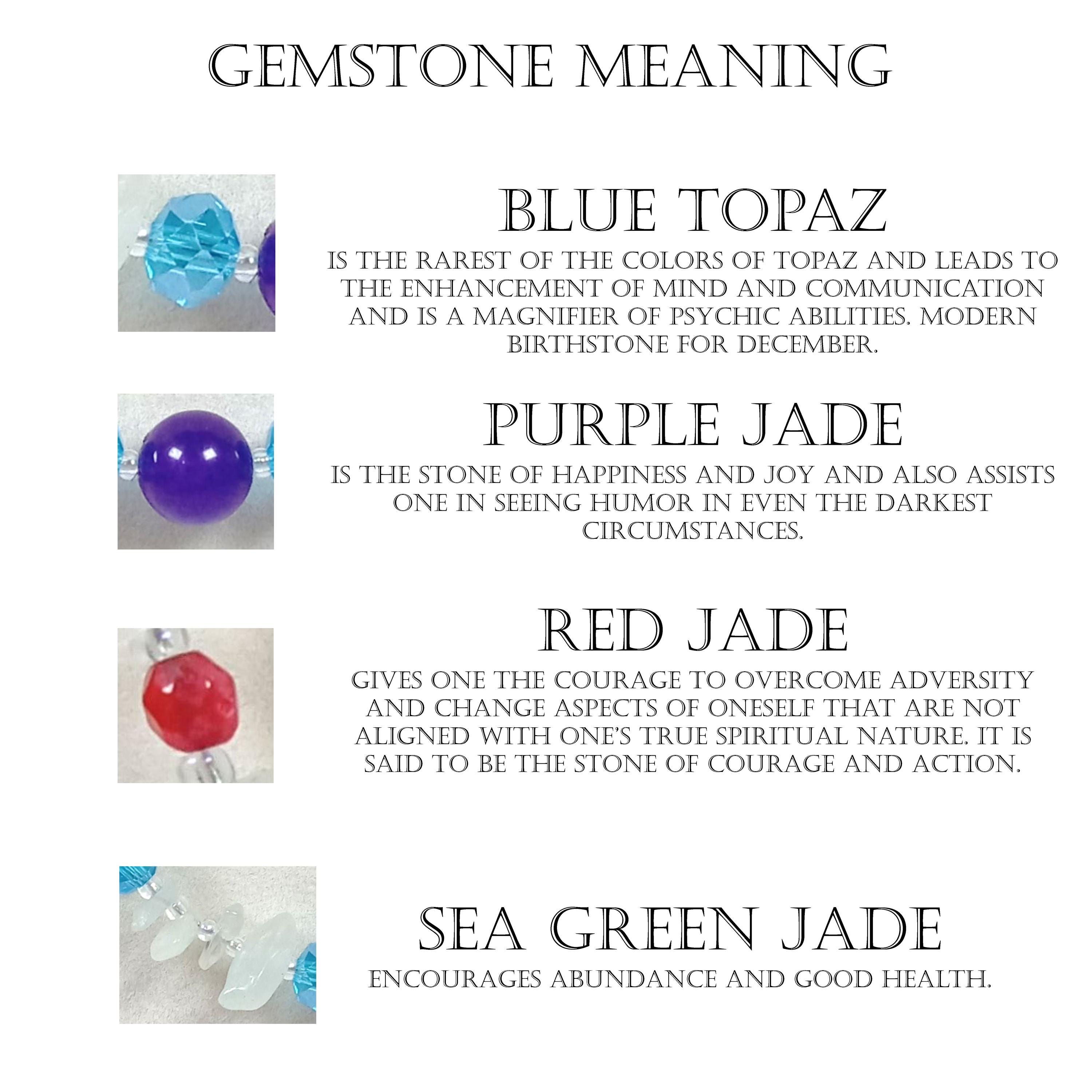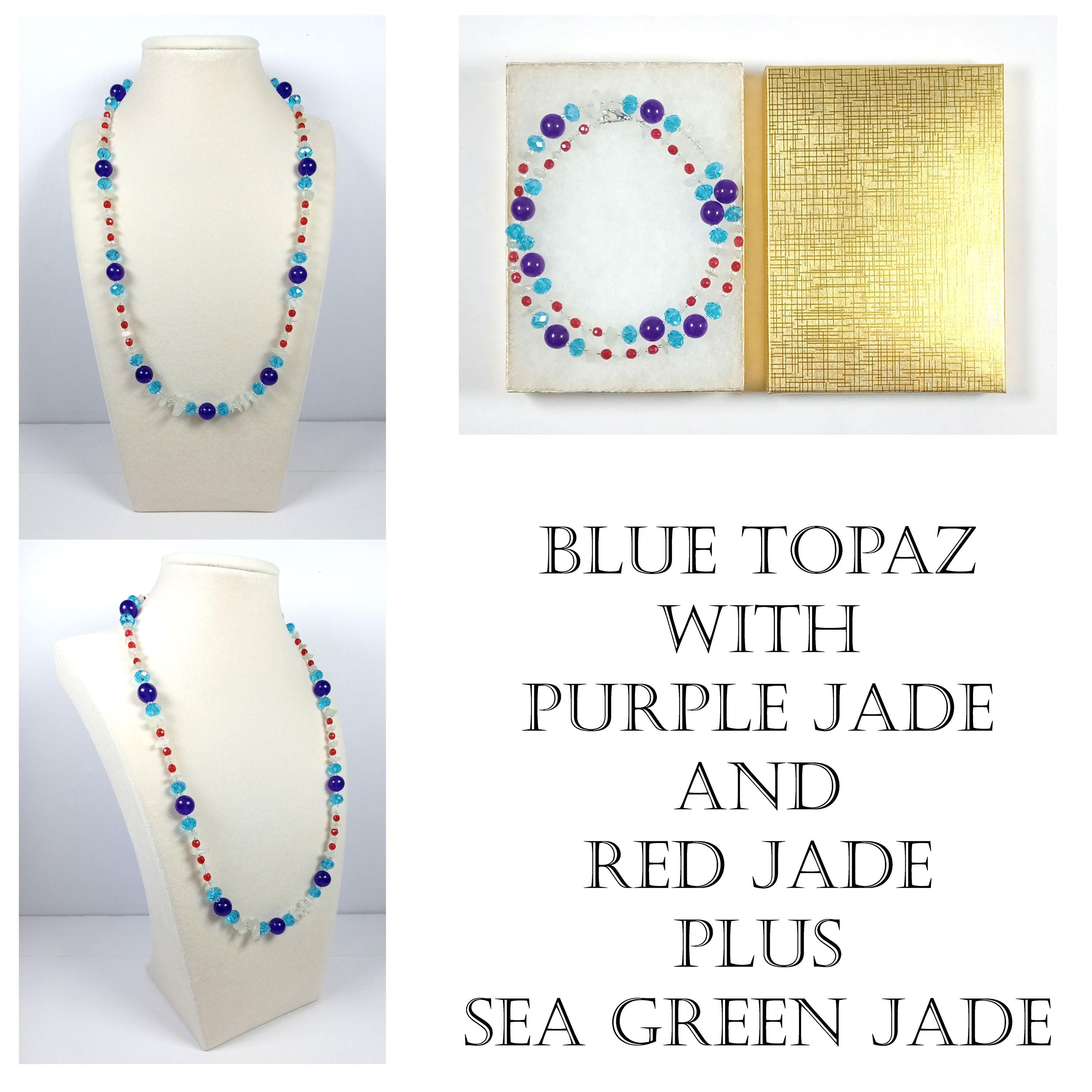 This one-of-a-kind Blue Topaz with Purple Jade and Red Jade plus Sea Green Jade Chips is a necklace made with natural stones. One of the beads are birthstone for the month of December.