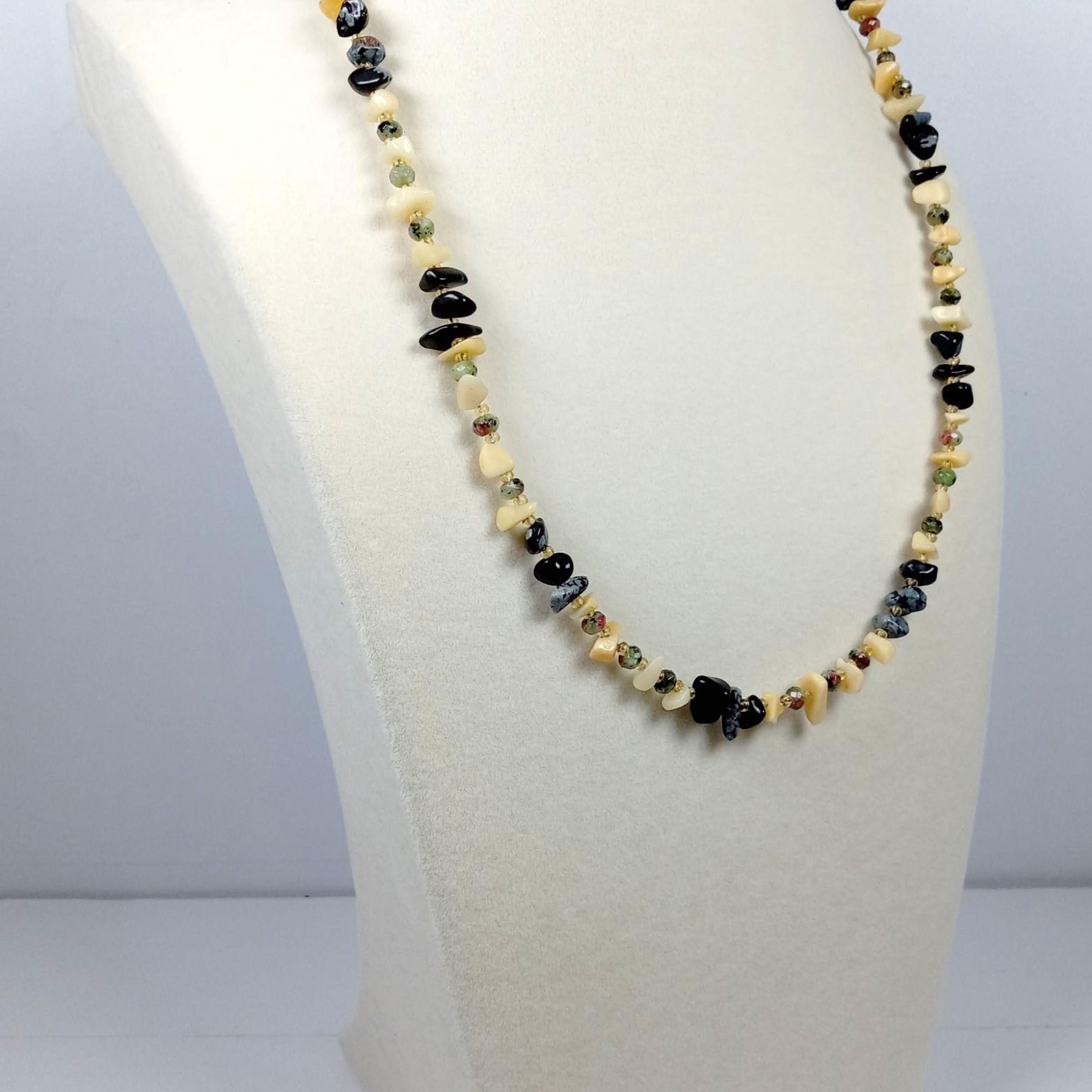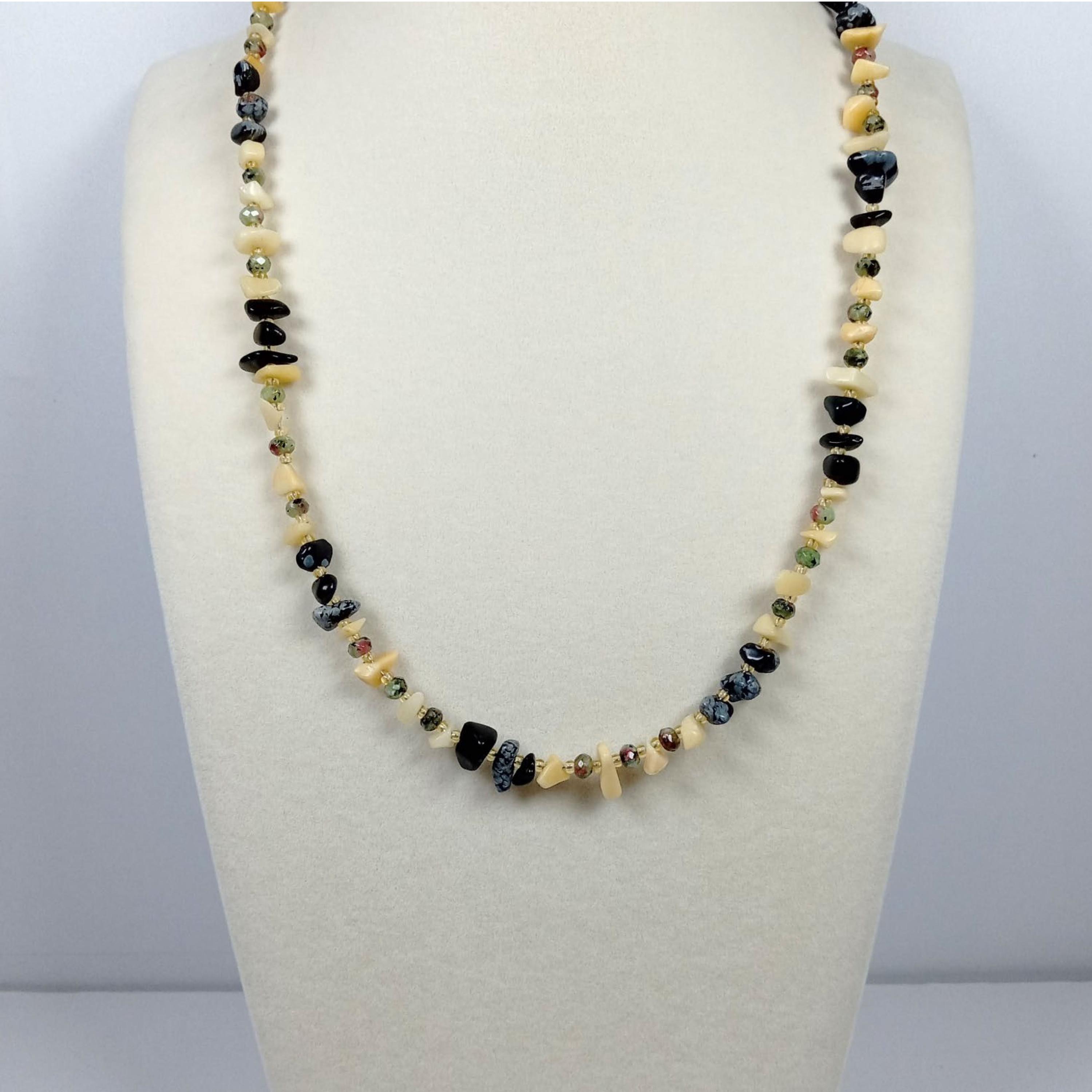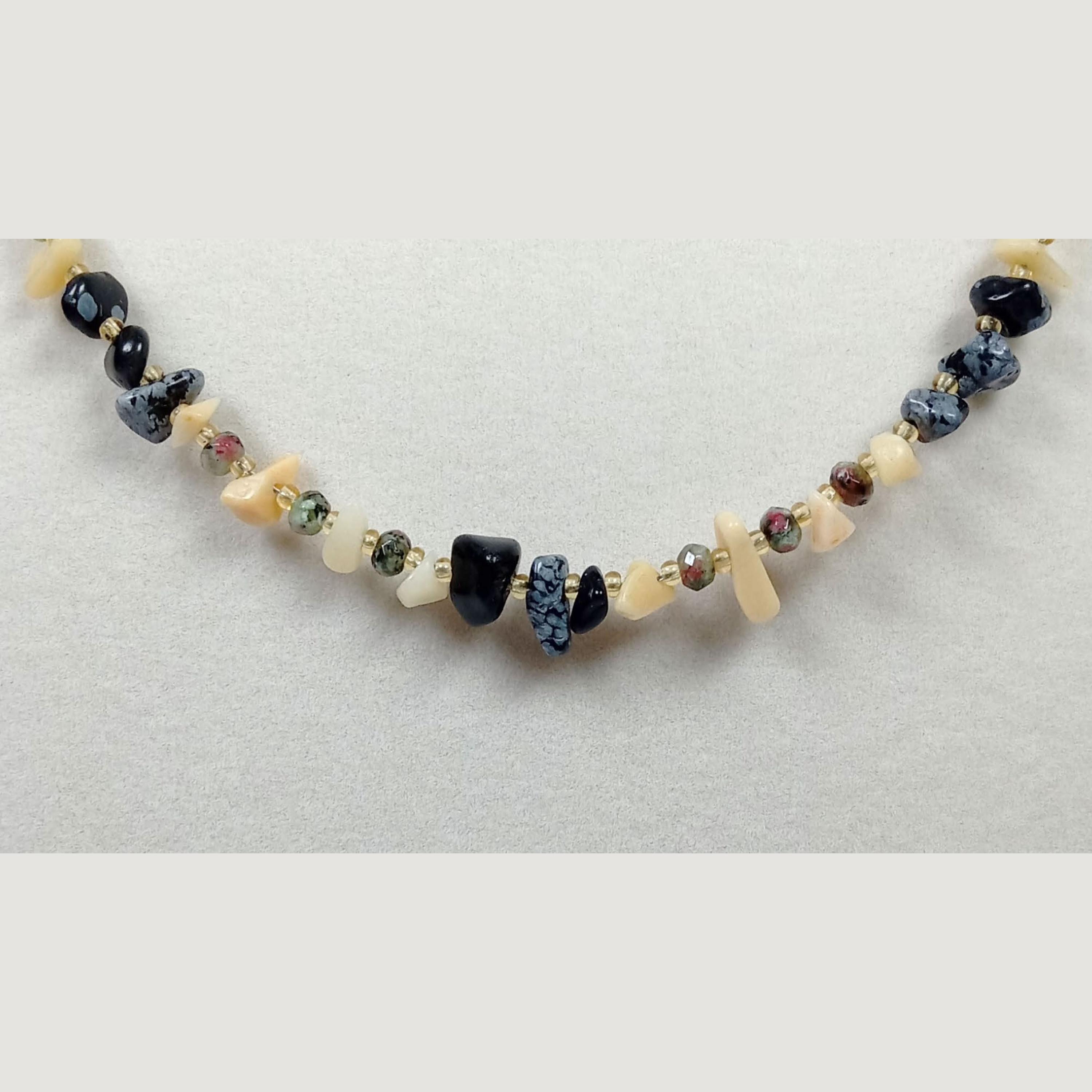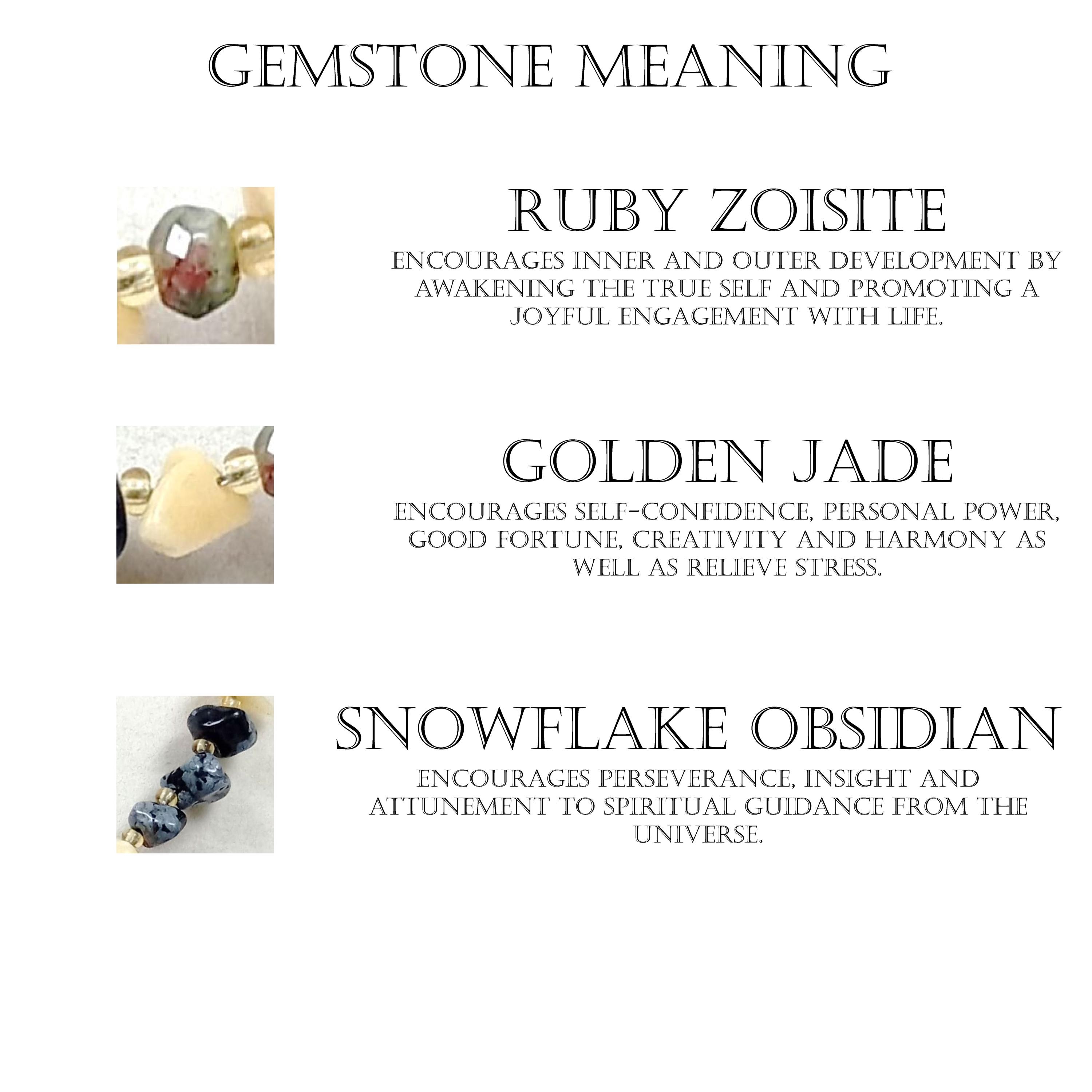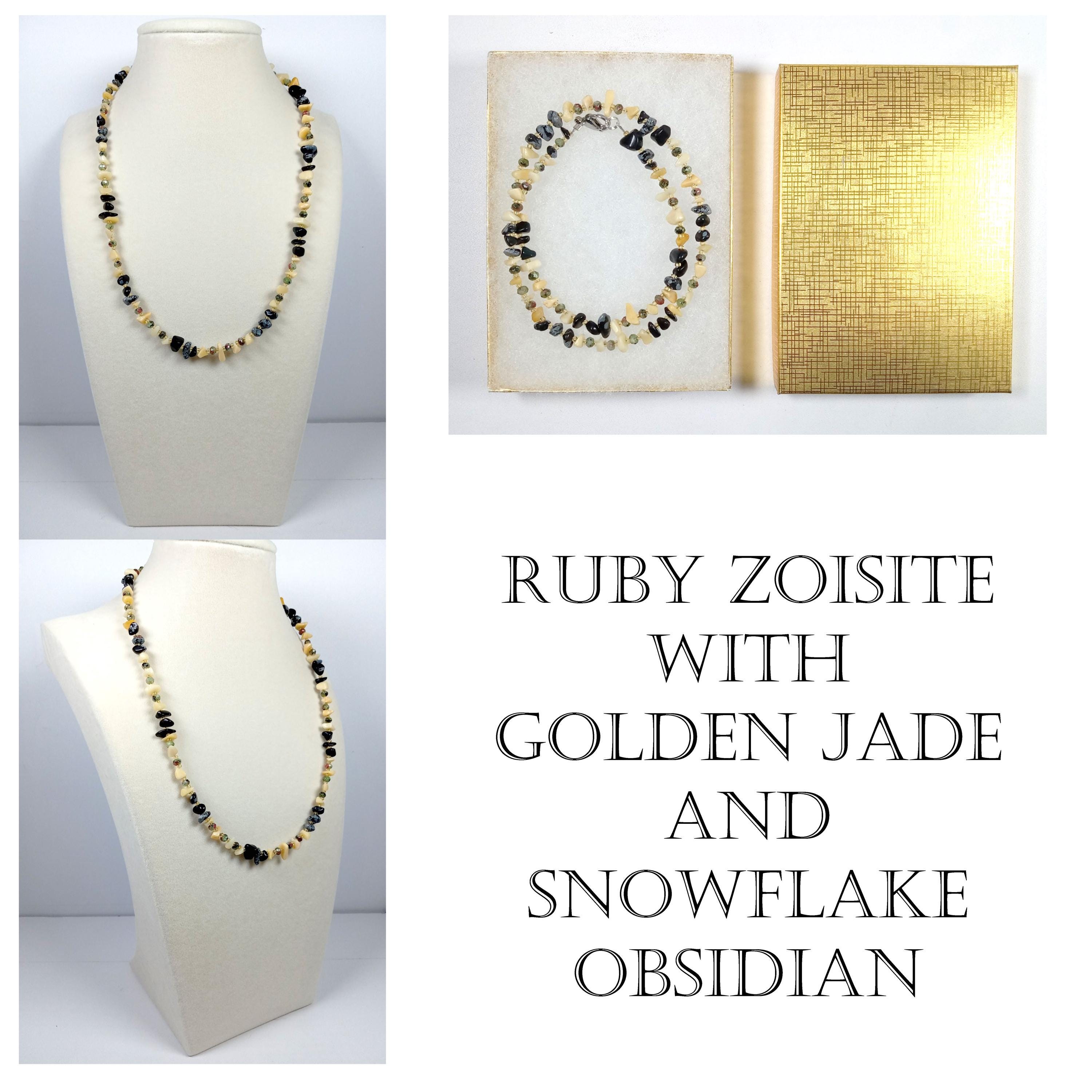 This one-of-a-kind Ruby Zoisite with Golden Jade and Snowflake Obsidian necklace is made with natural stones.