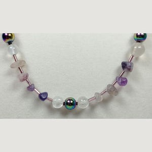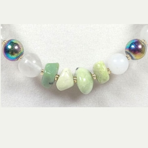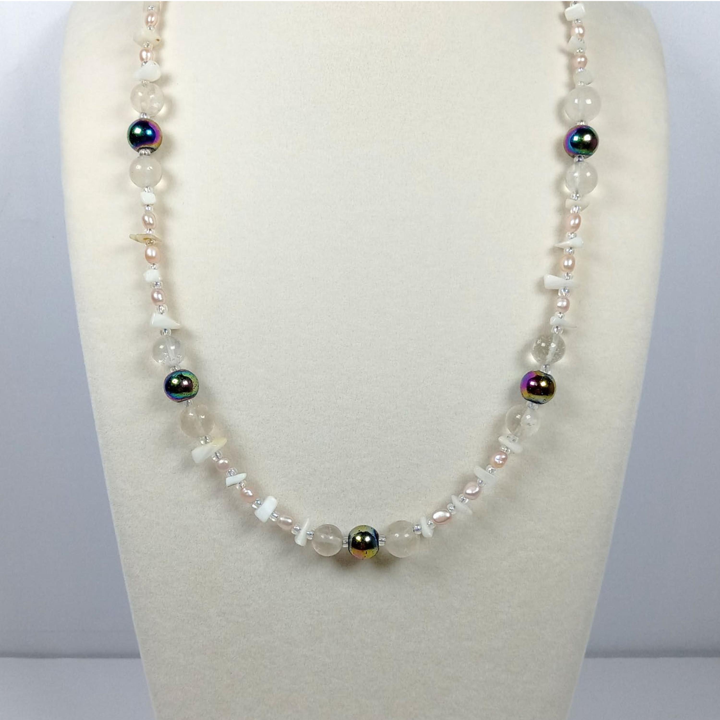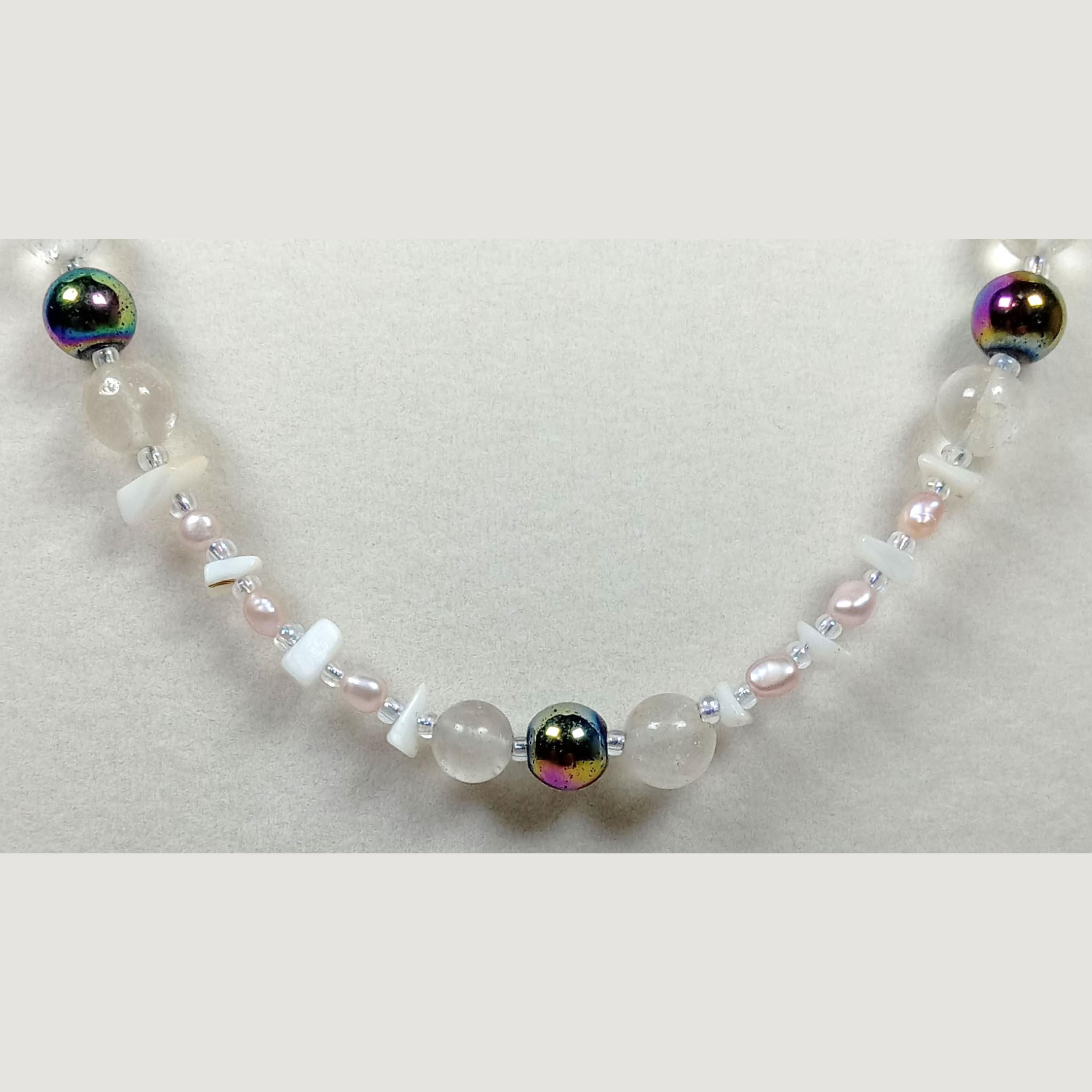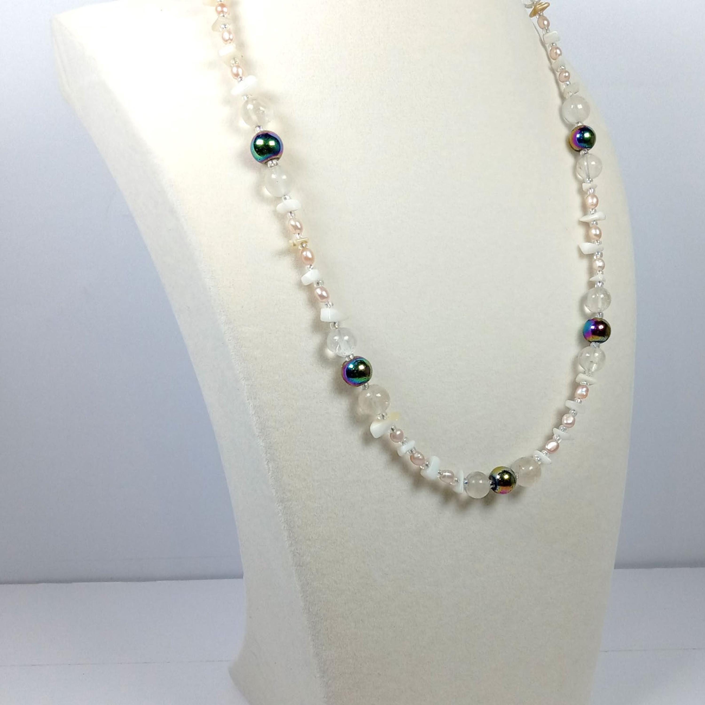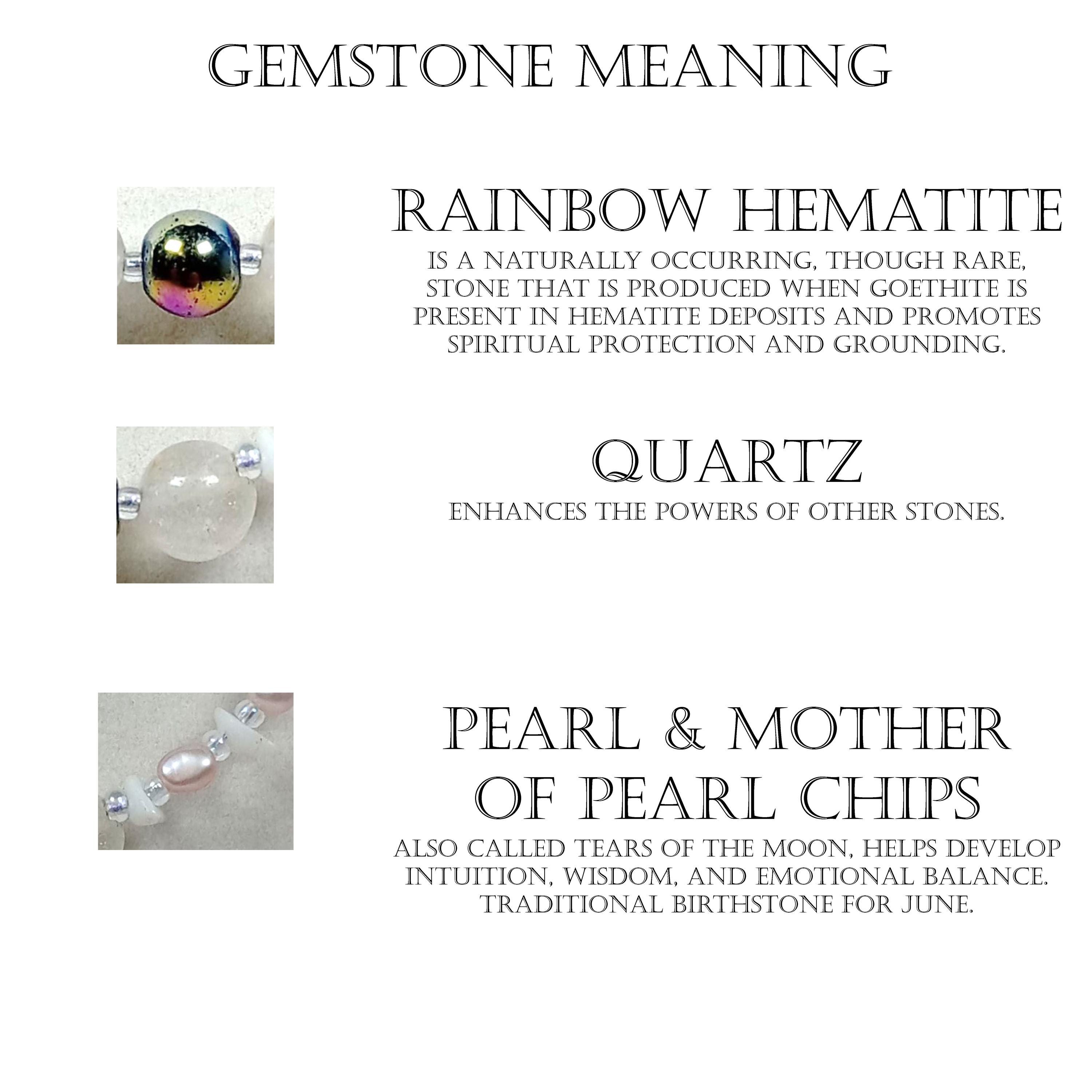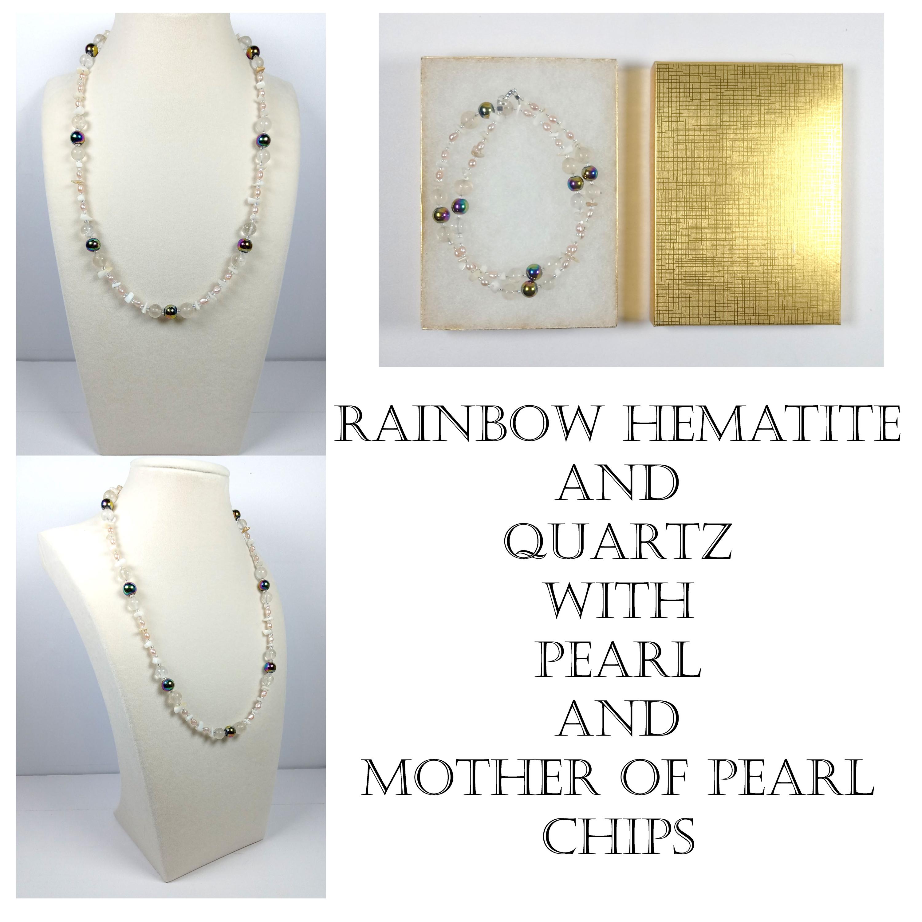 This one-of-a-kind Rainbow Hematite and Quartz with Pearl and Mother of Pearl Chips necklace is made with natural stones. One of the beads are birthstone for the month of June