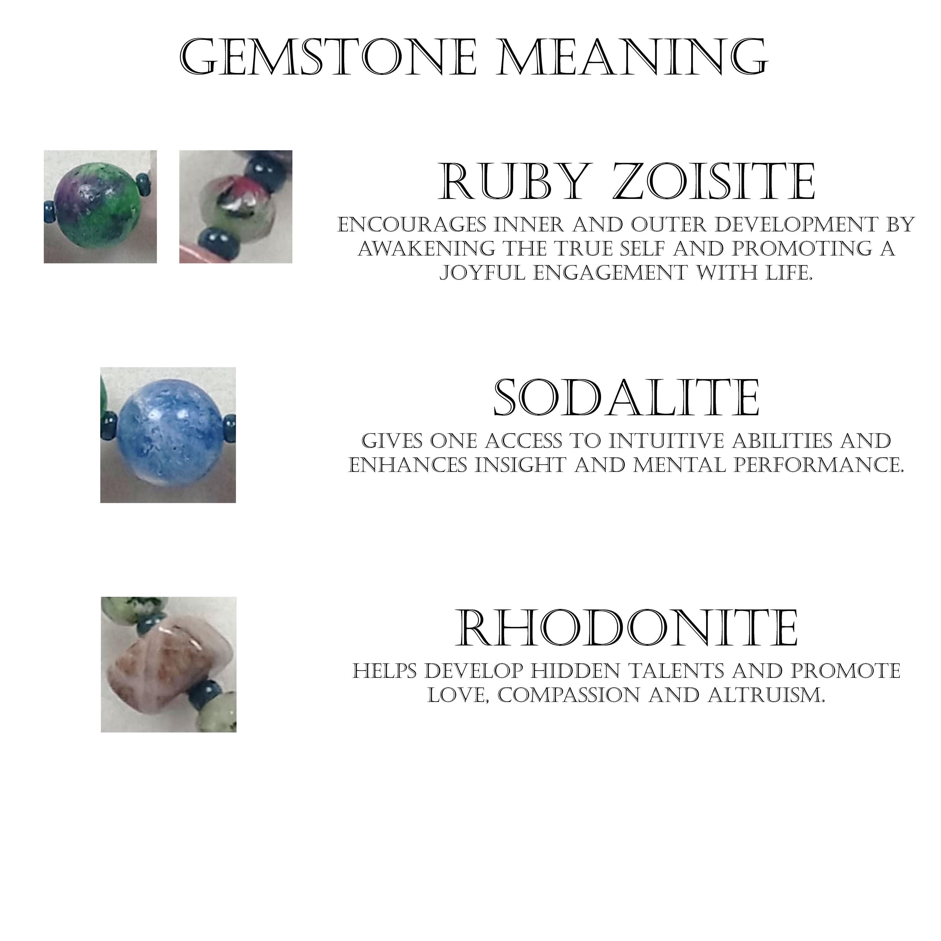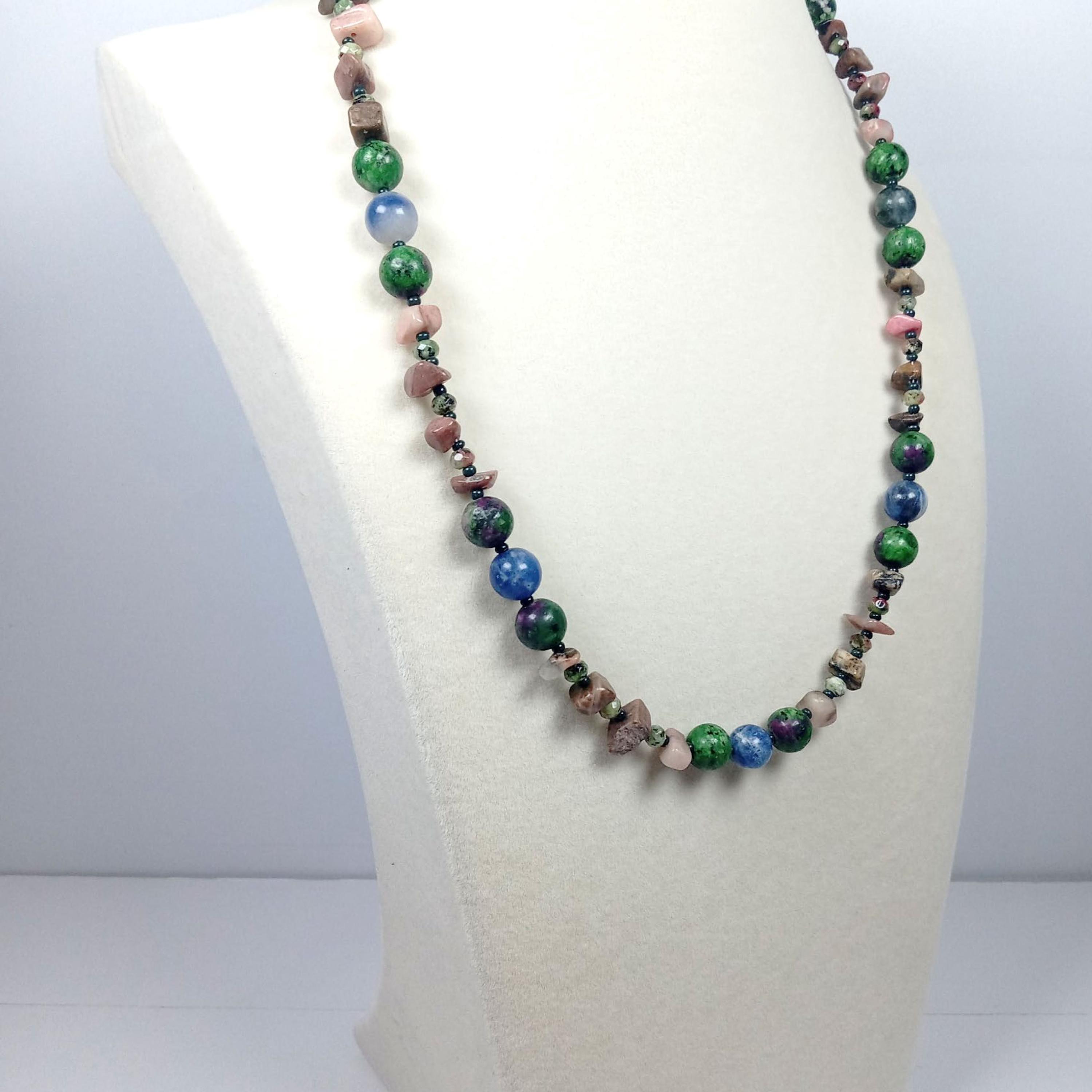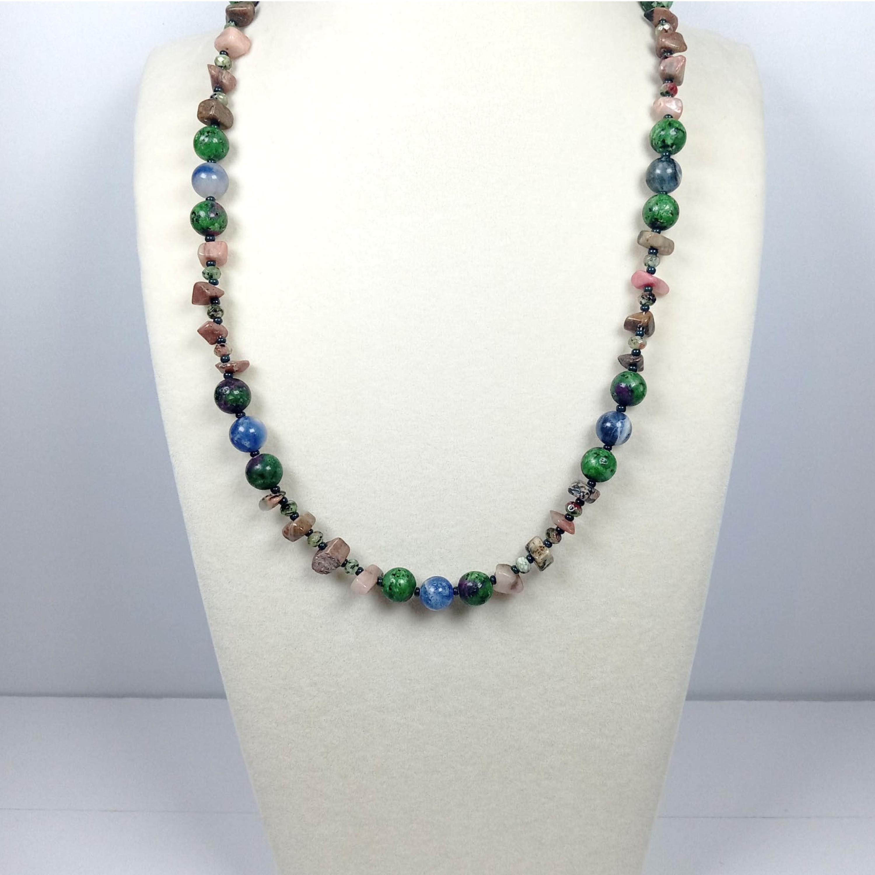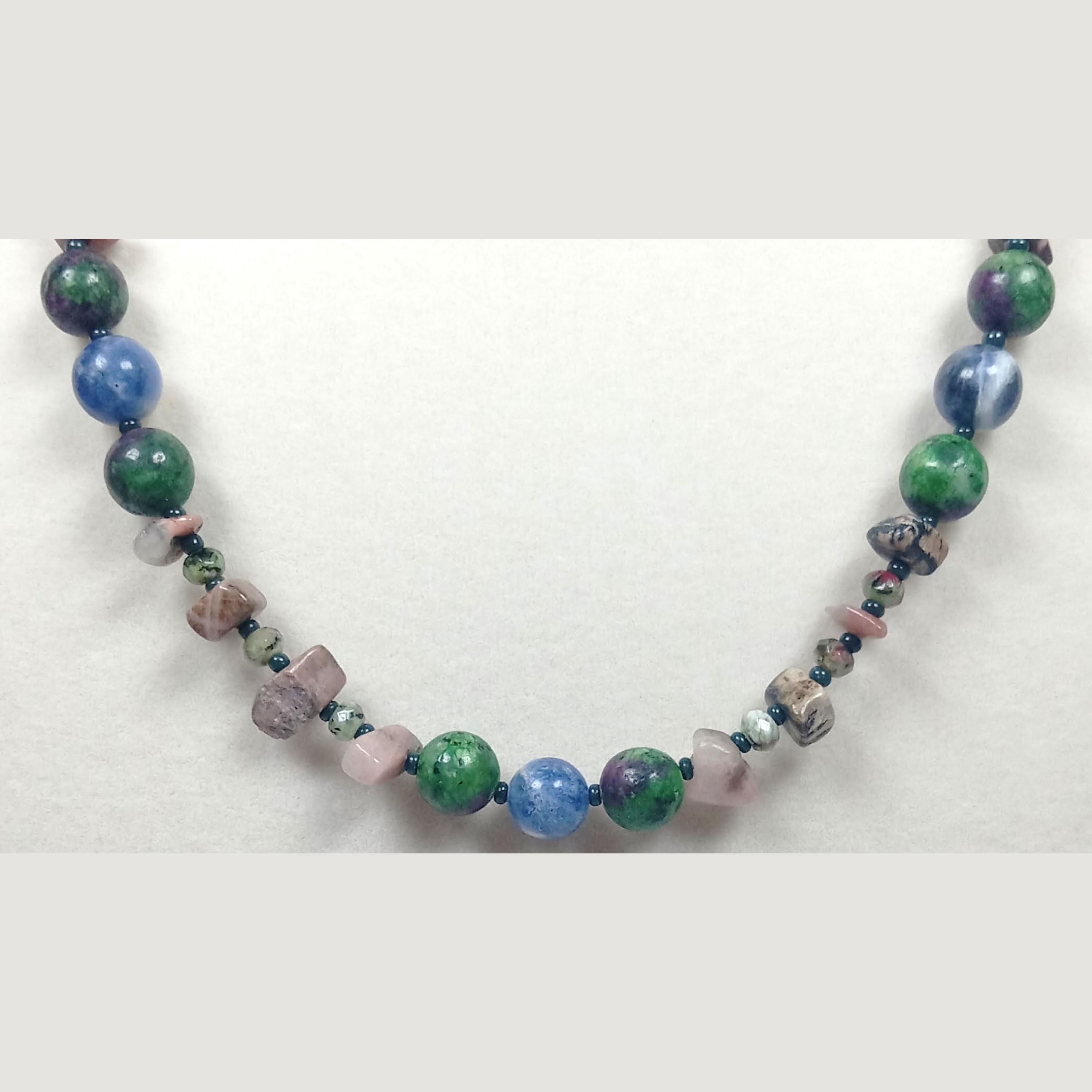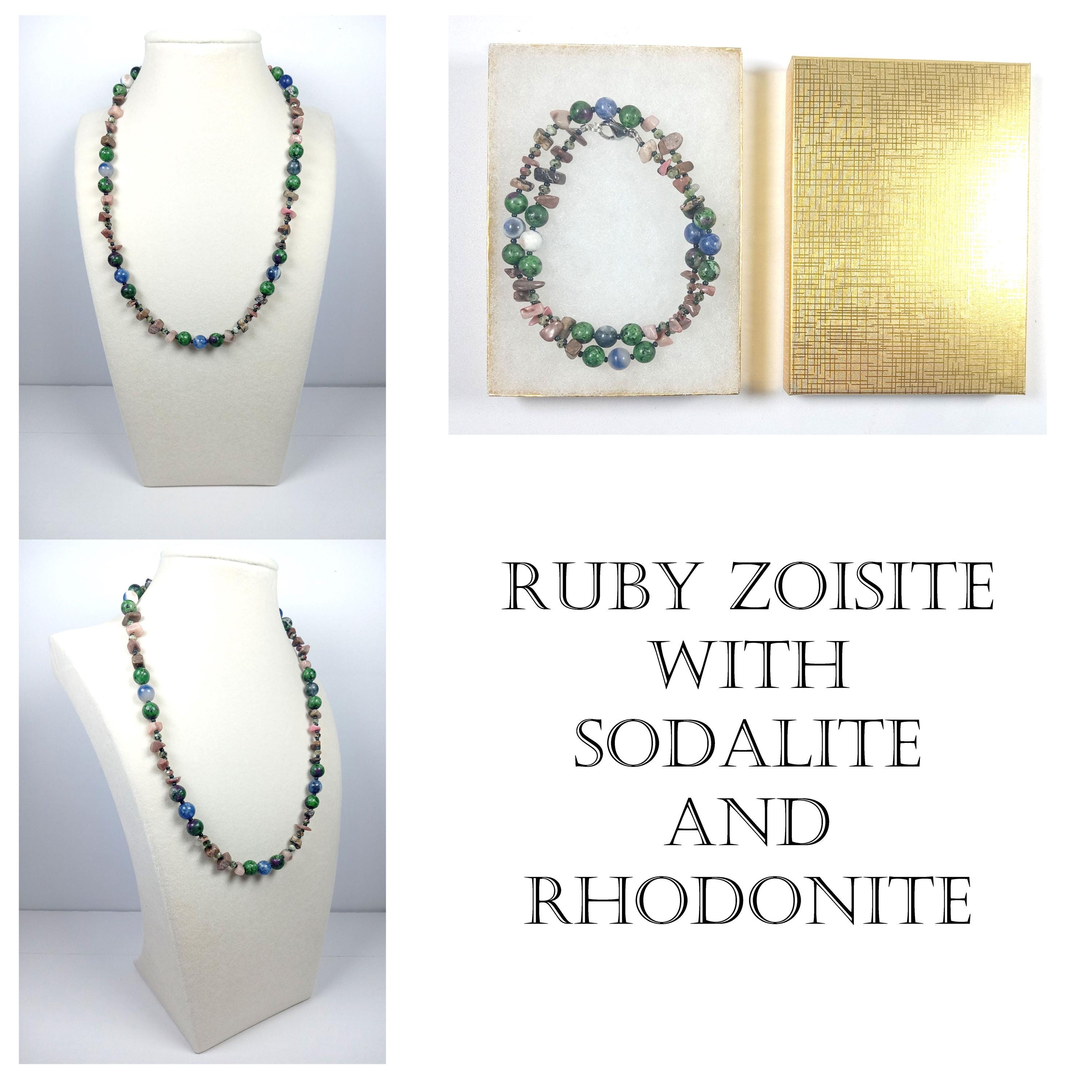 This one-of-a-kind Ruby Zoisite with Sodalite and Rhodonite necklace is made with natural stones.
