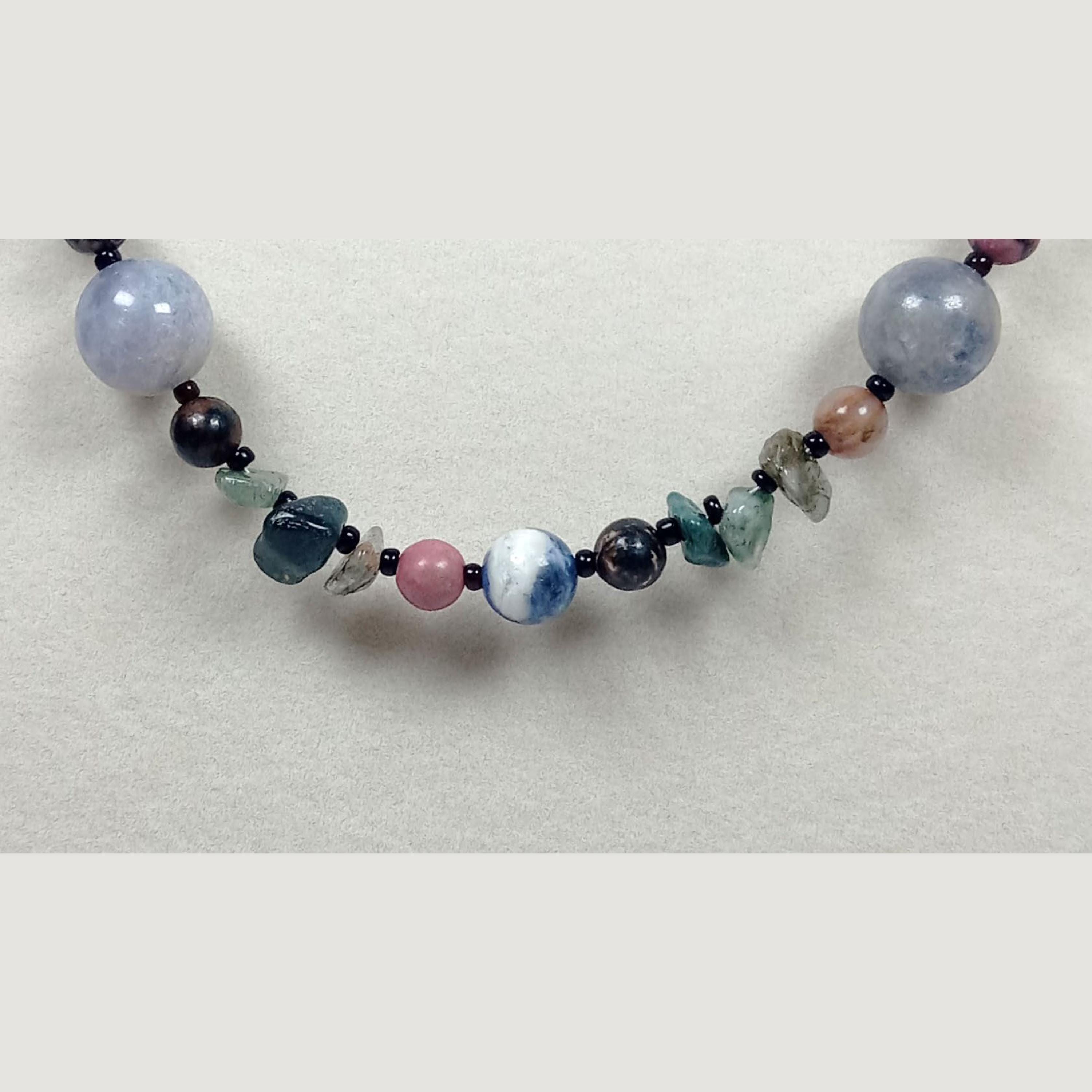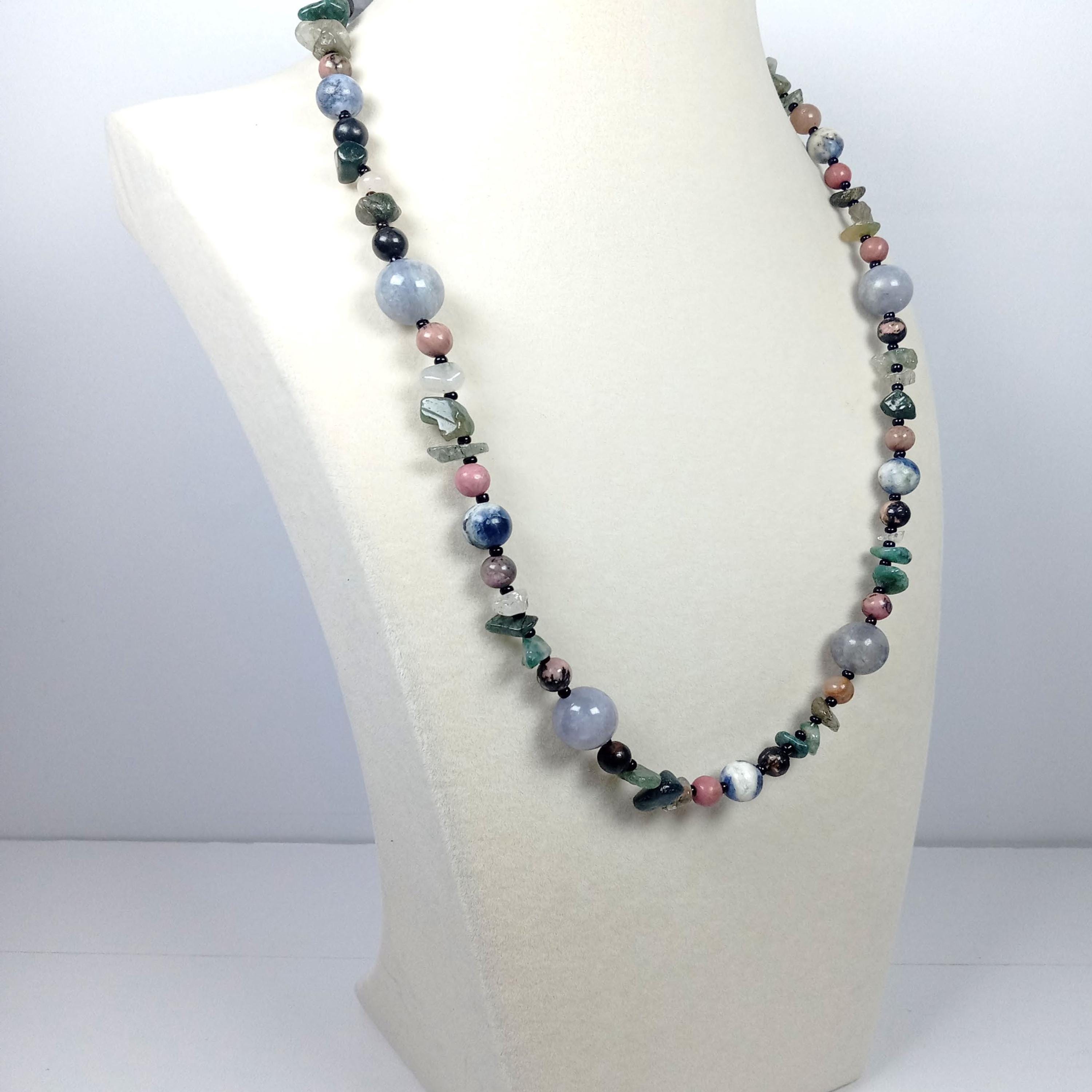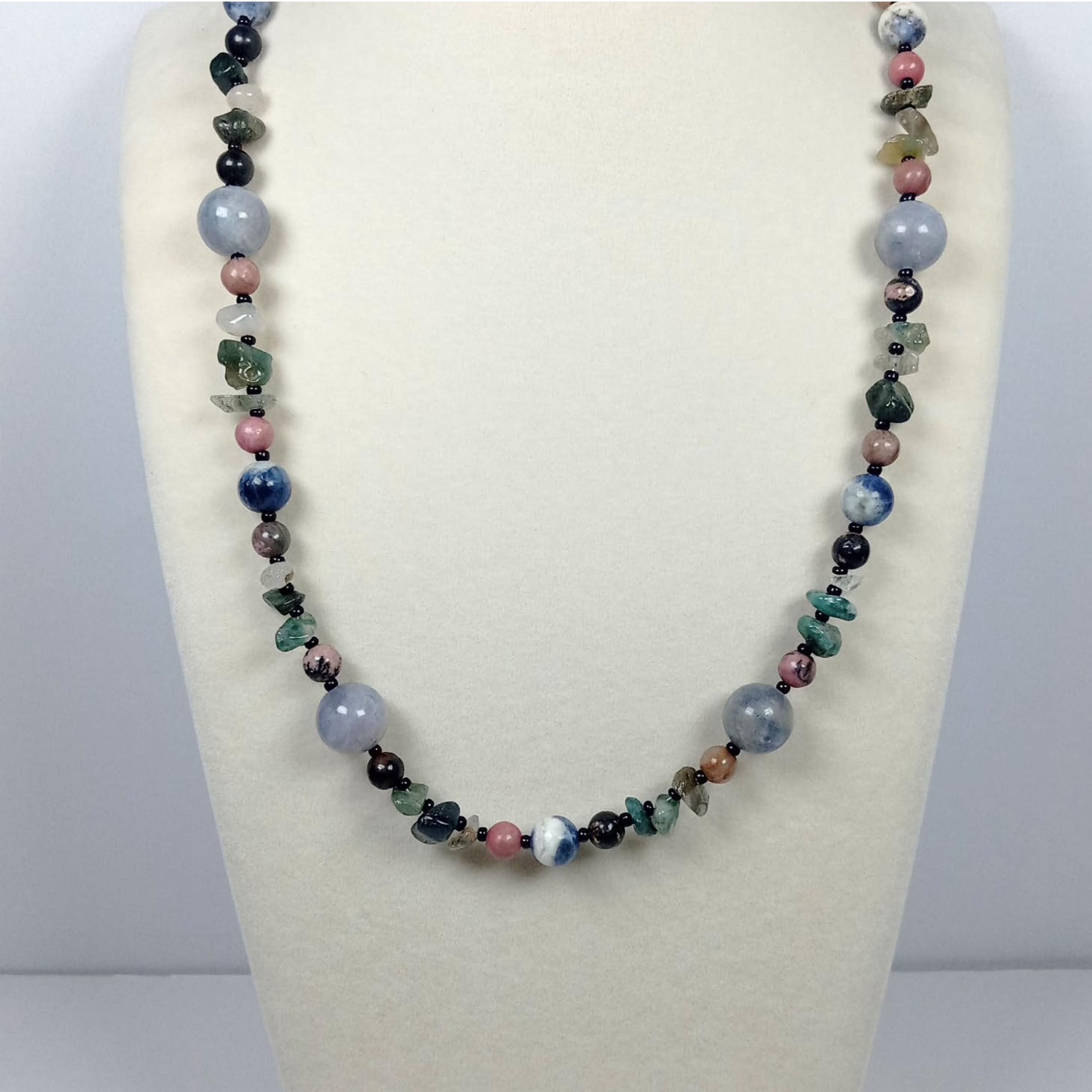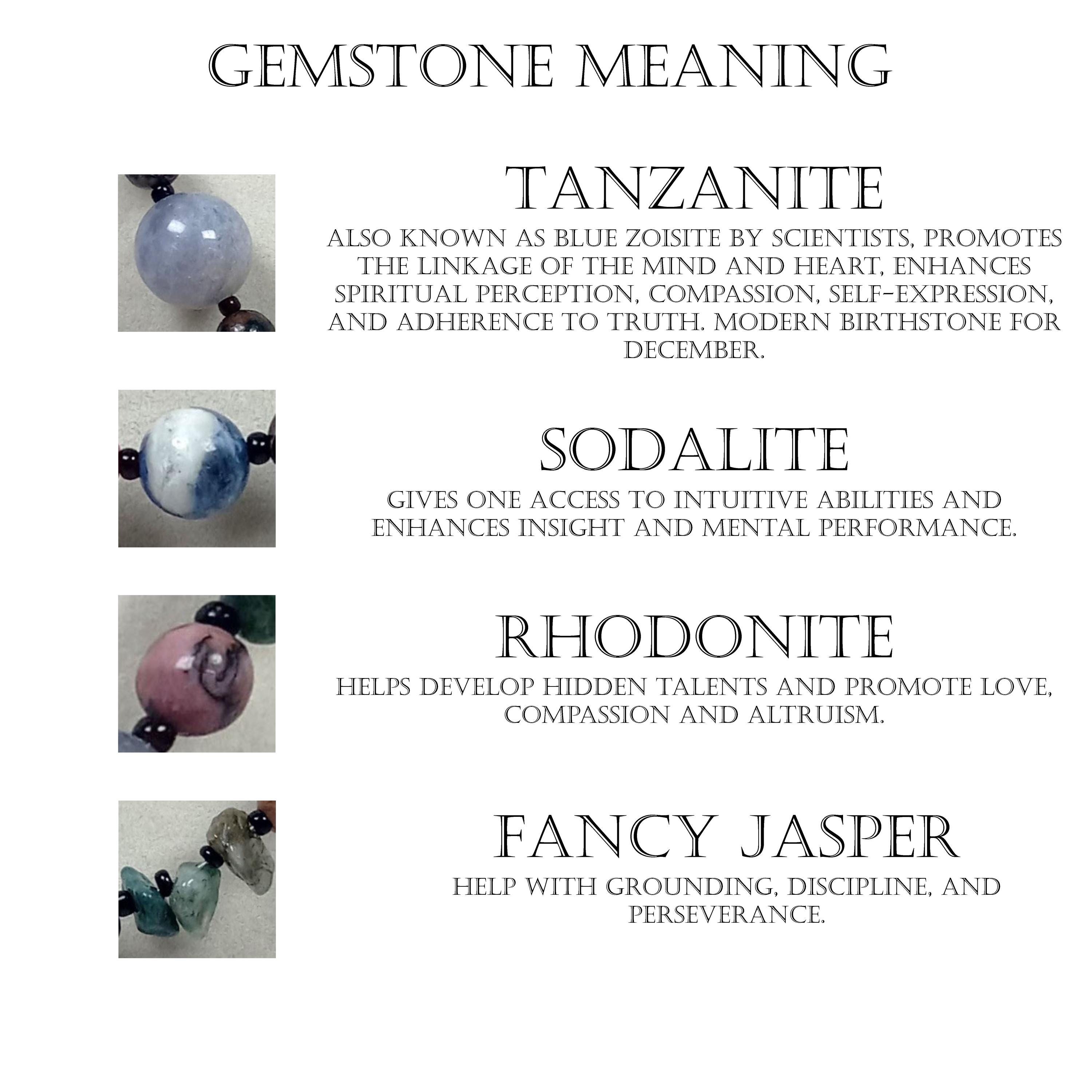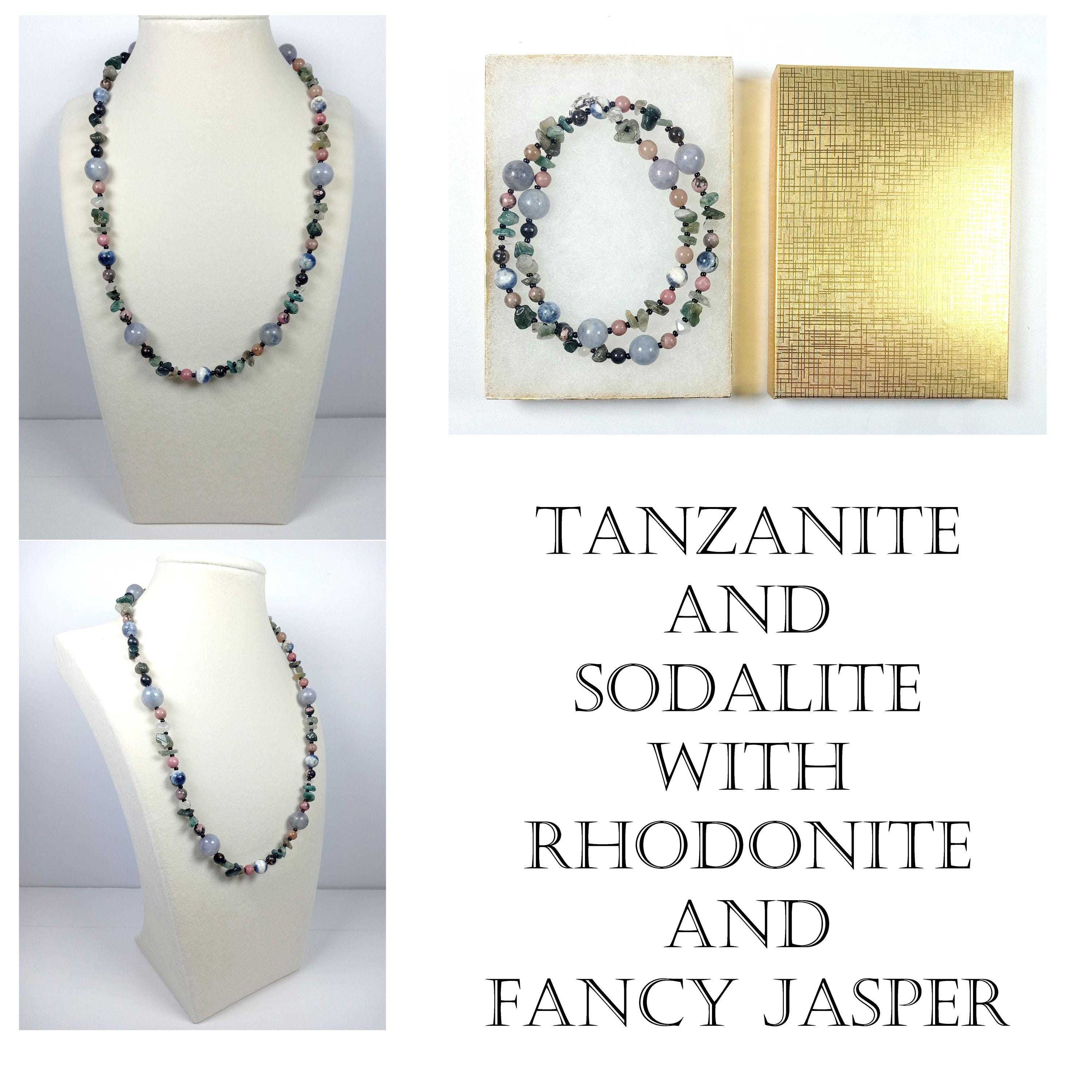 This one-of-a-kind Tanzanite and Sodalite with Rhodonite and Fancy Jasper necklace is made with natural stones. One of the beads are birthstone for the month of December.