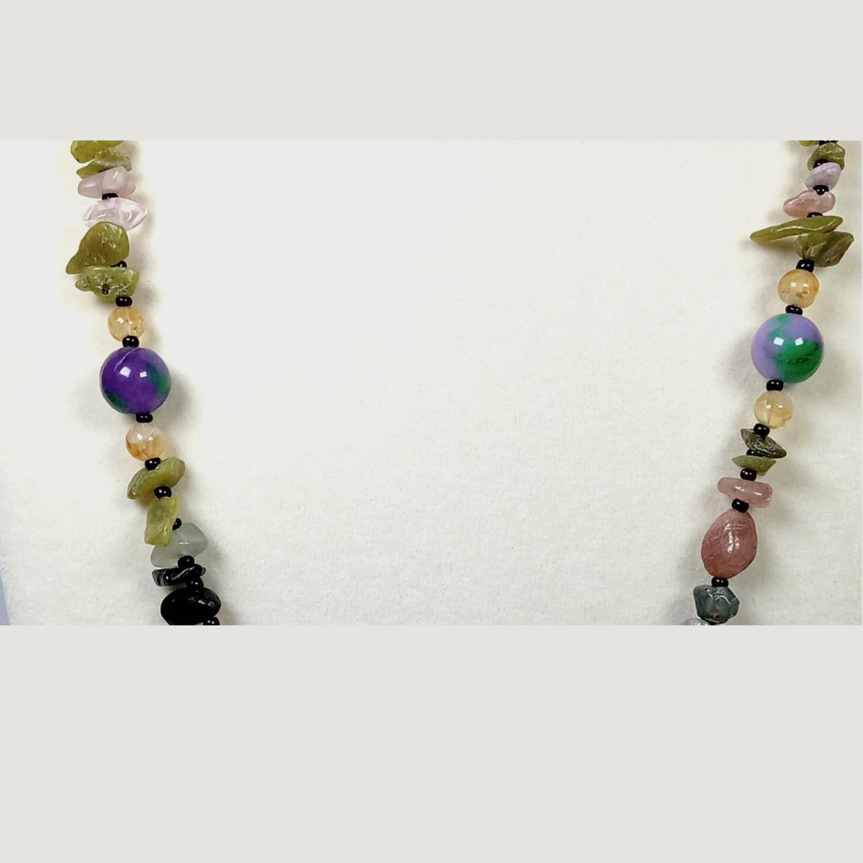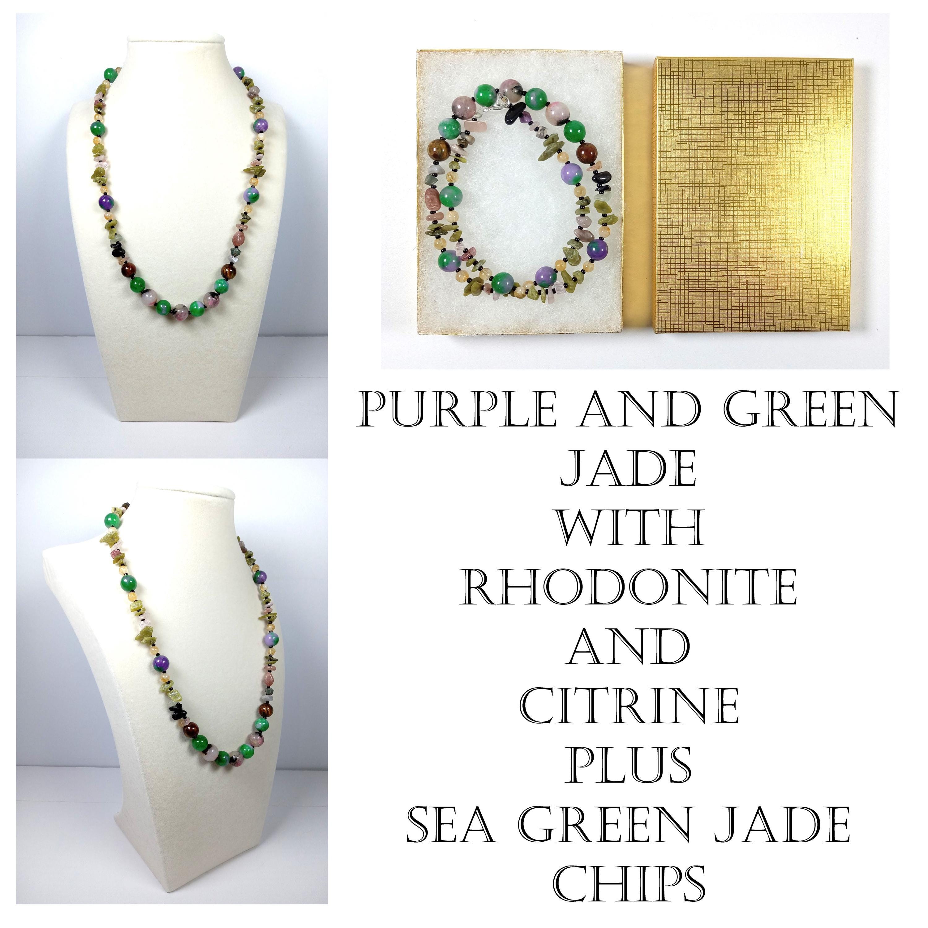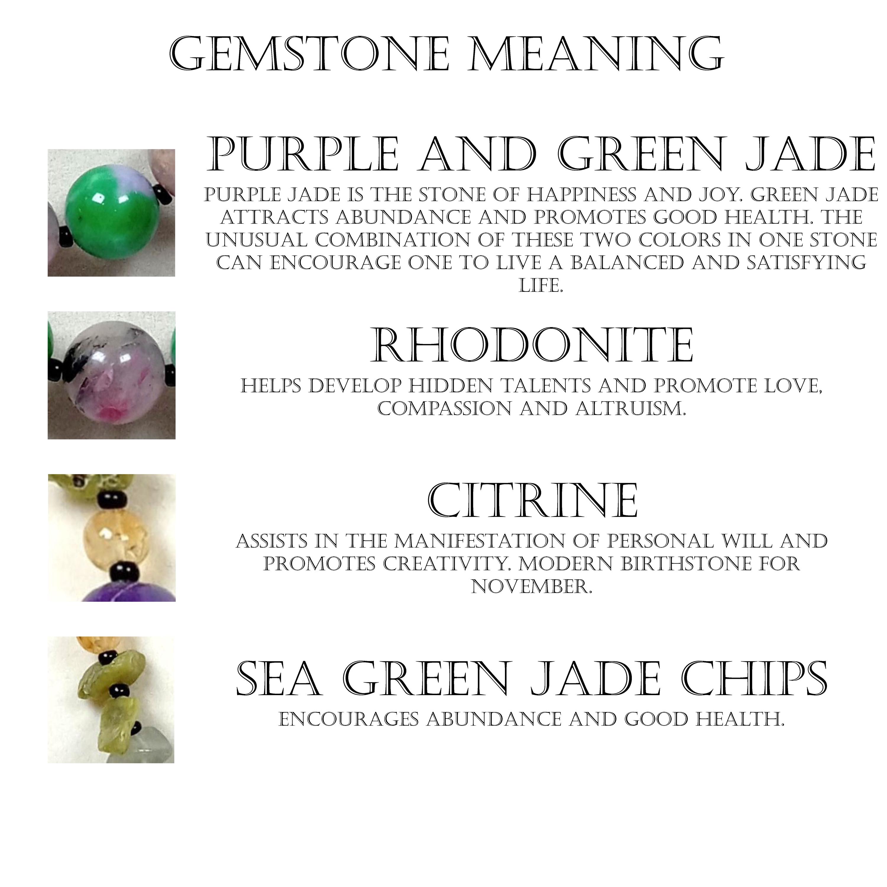 This one-of-a-kind Purple and Green Jade with Rhodonite and Citrine plus Sea Green Jade Chips necklace is made with natural stones. One of the beads are birthstone for the month of November.