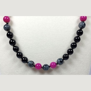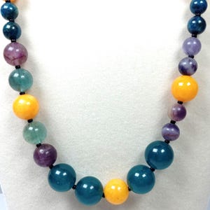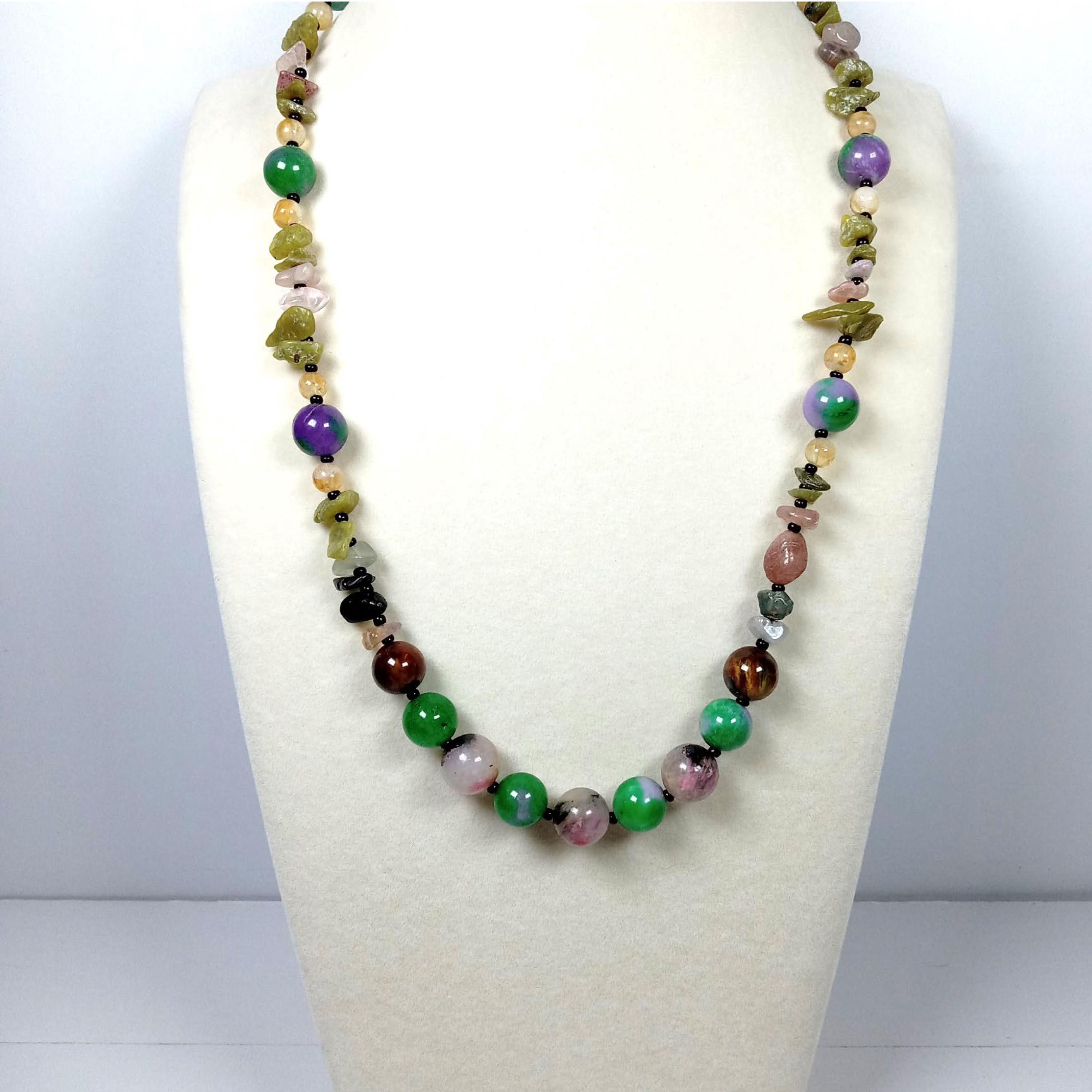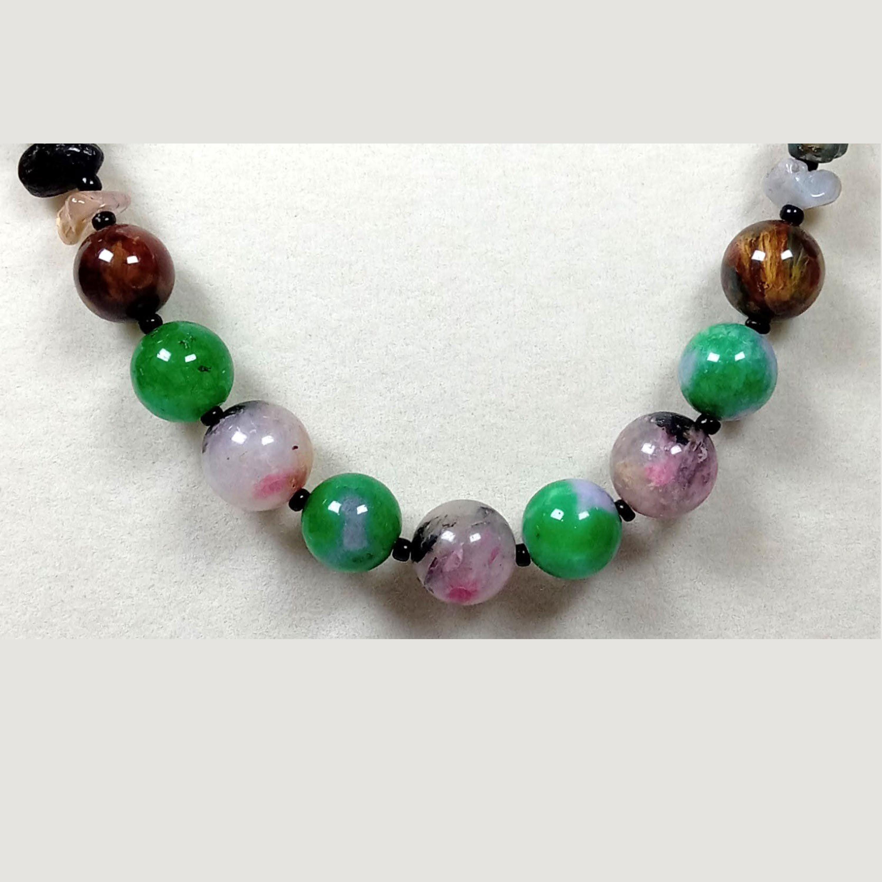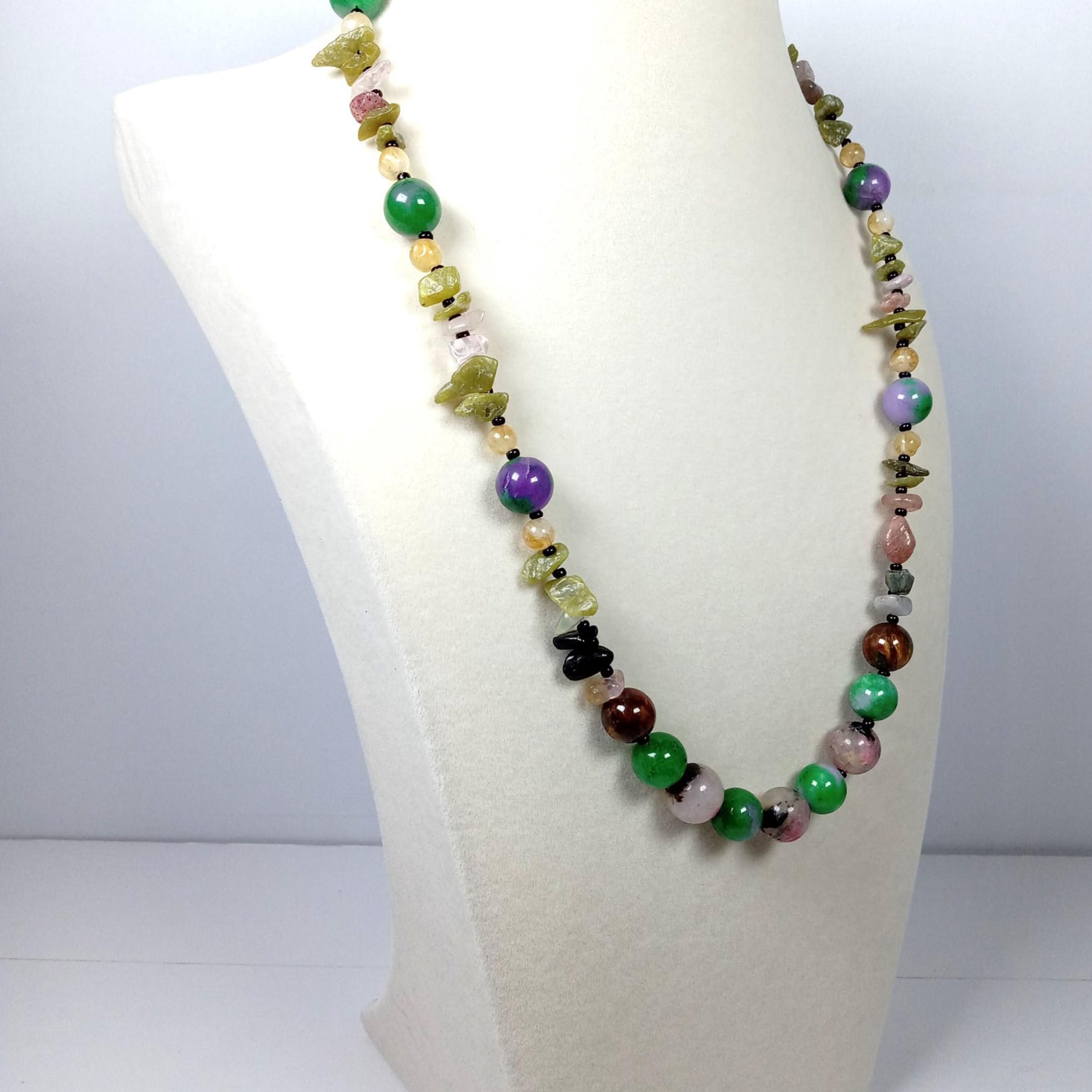 This one-of-a-kind Purple and Green Jade with Rhodonite and Citrine plus Sea Green Jade Chips necklace is made with natural stones. One of the beads are birthstone for the month of November.