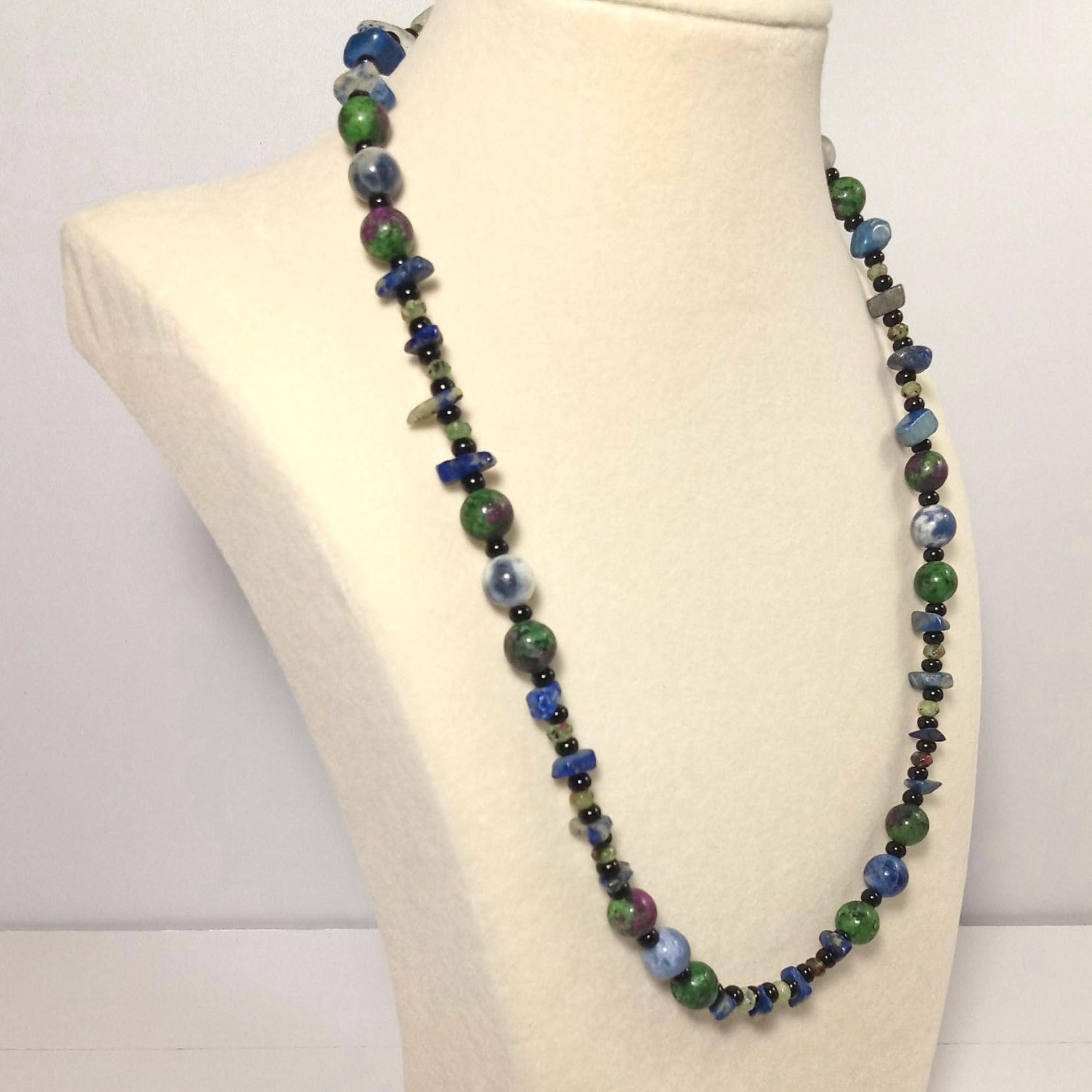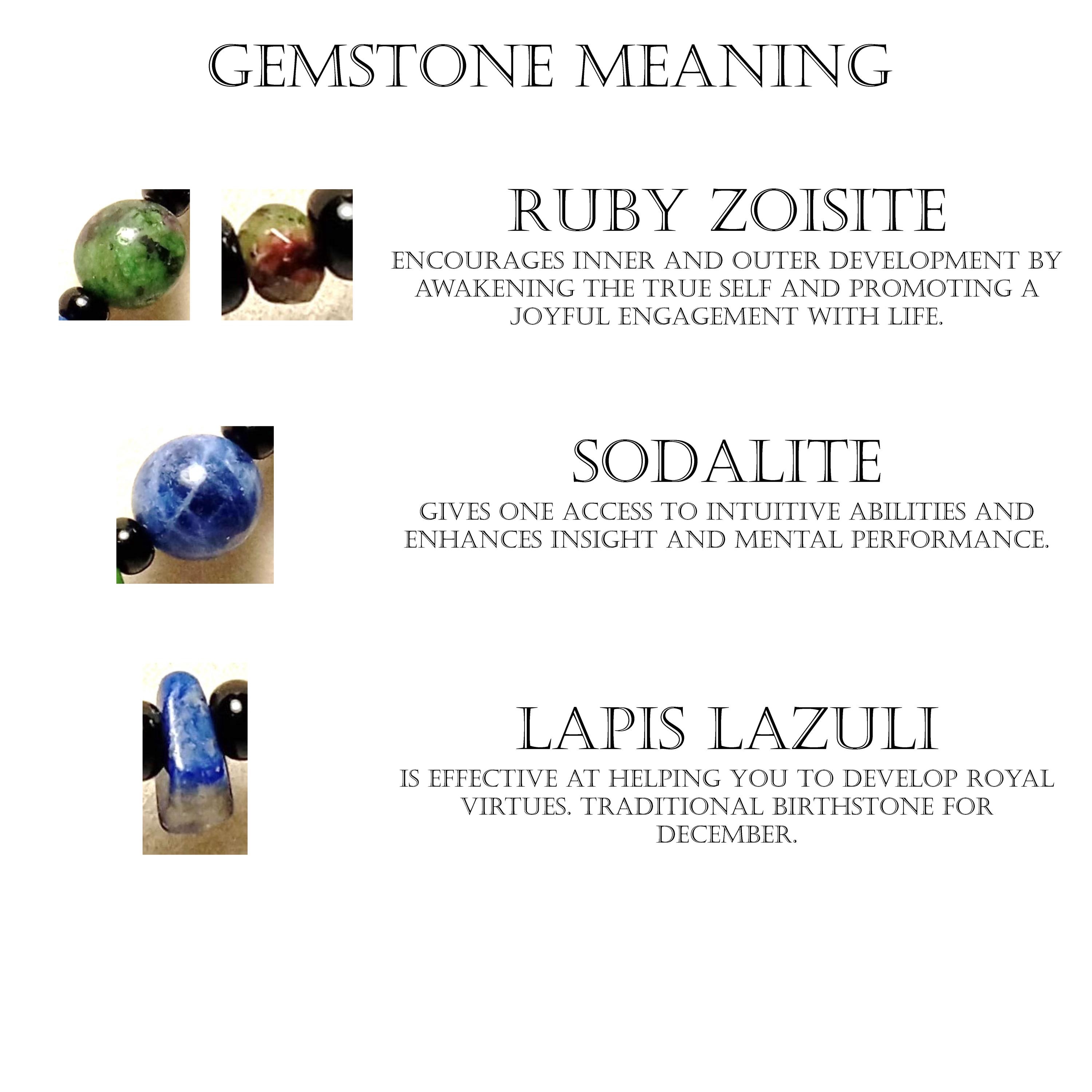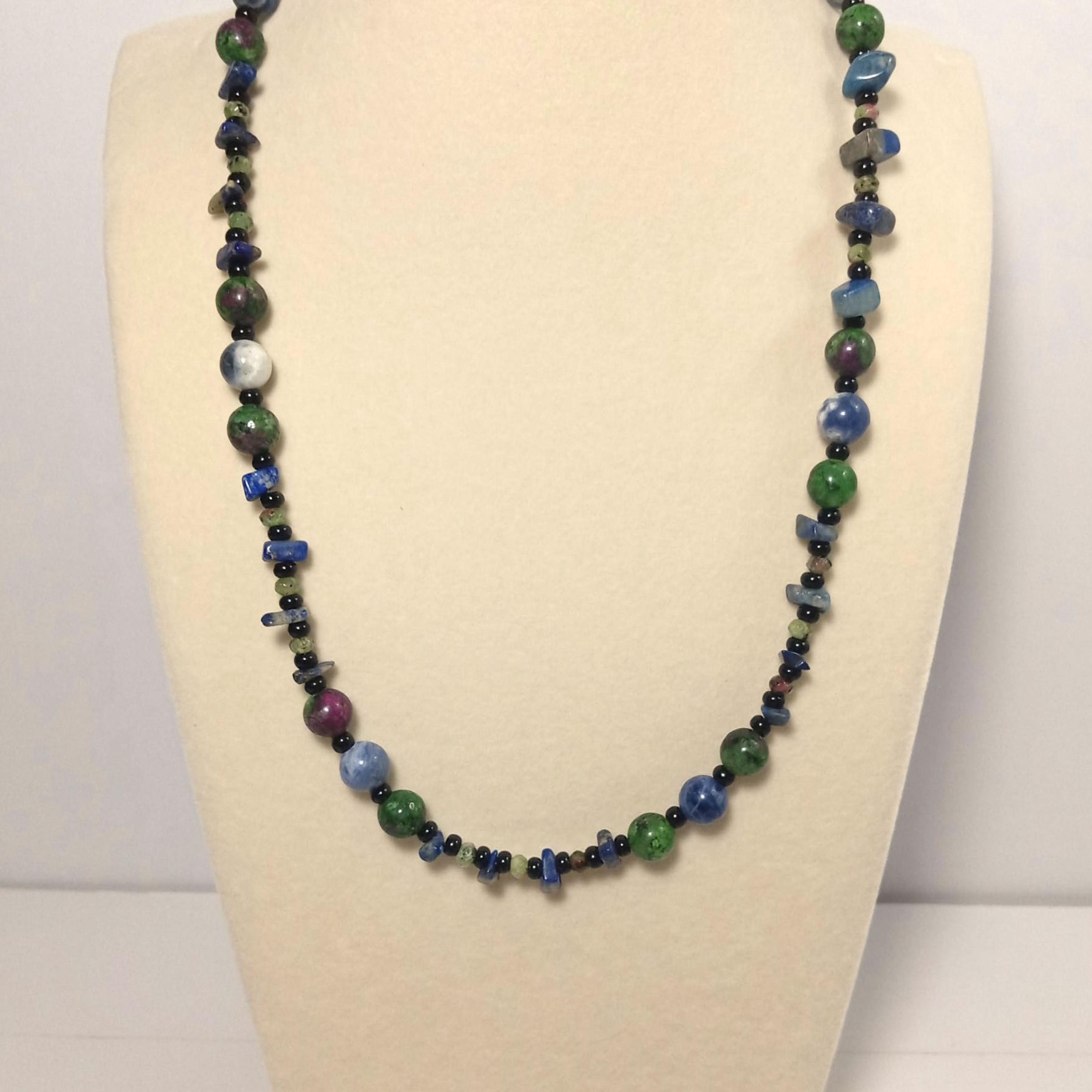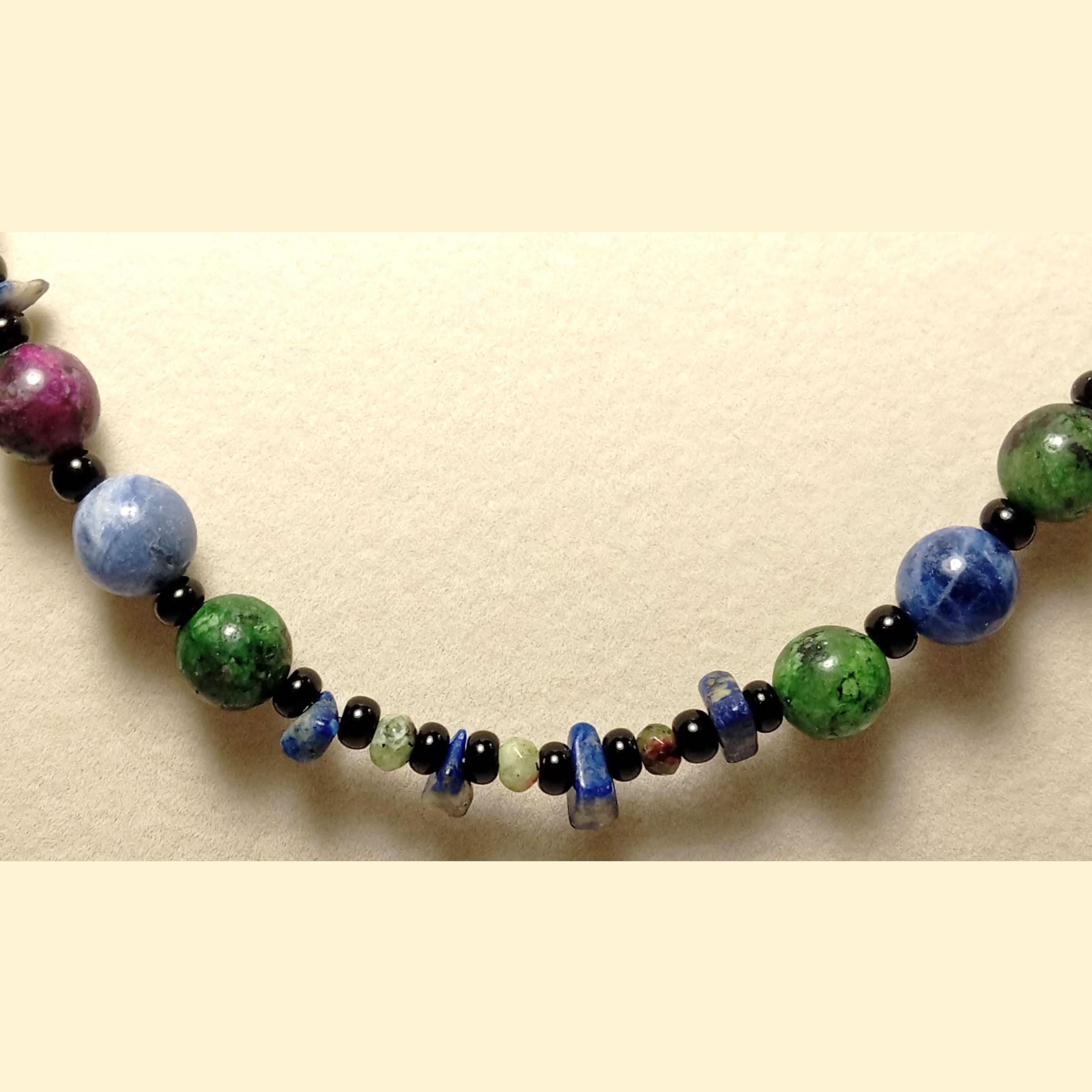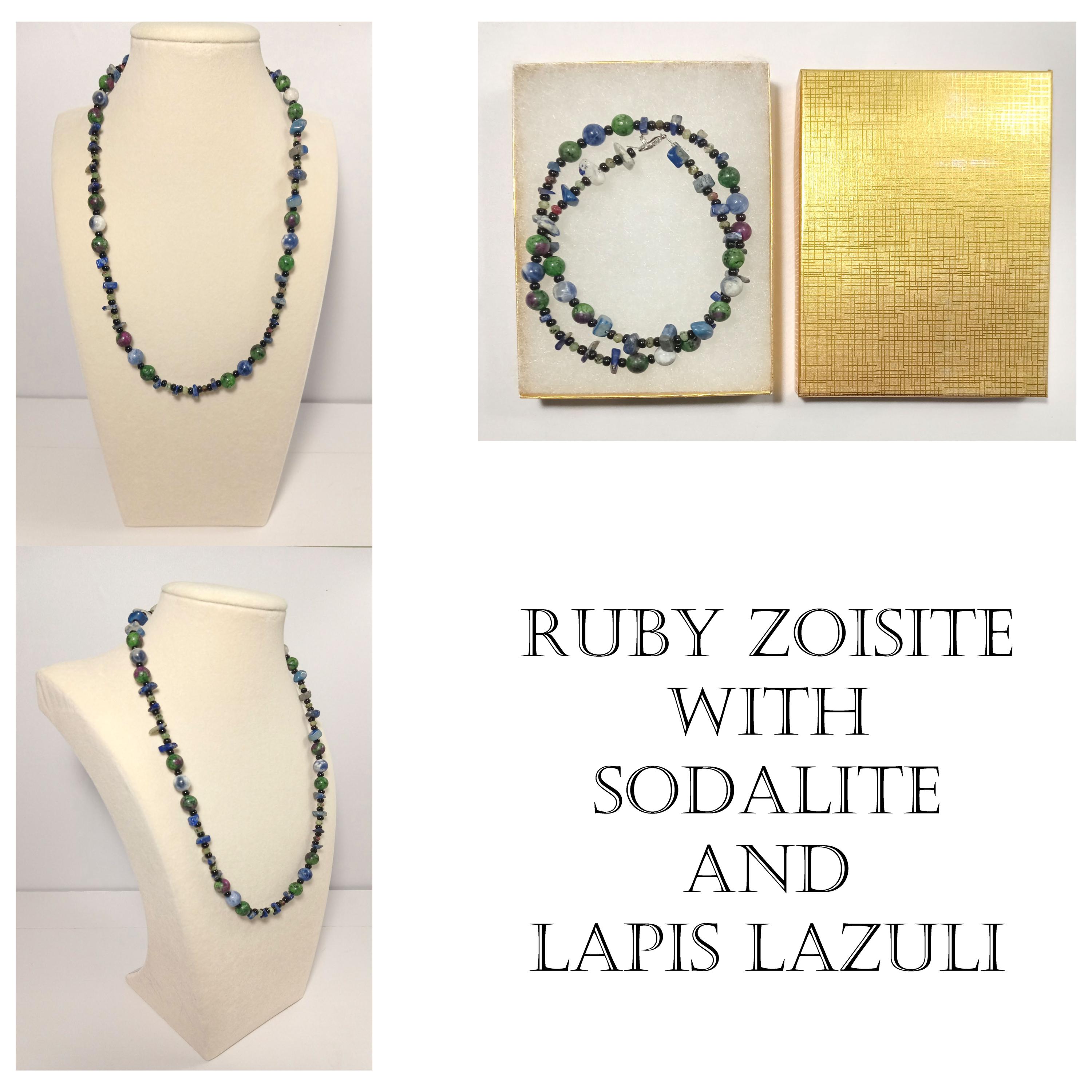This one-of-a-kind Ruby Zoisite with Sodalite and Lapis Lazuli is a necklace made with natural stones. One of the beads are birthstone for the month of December.