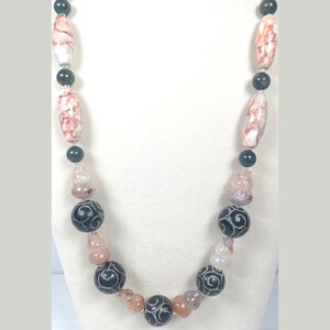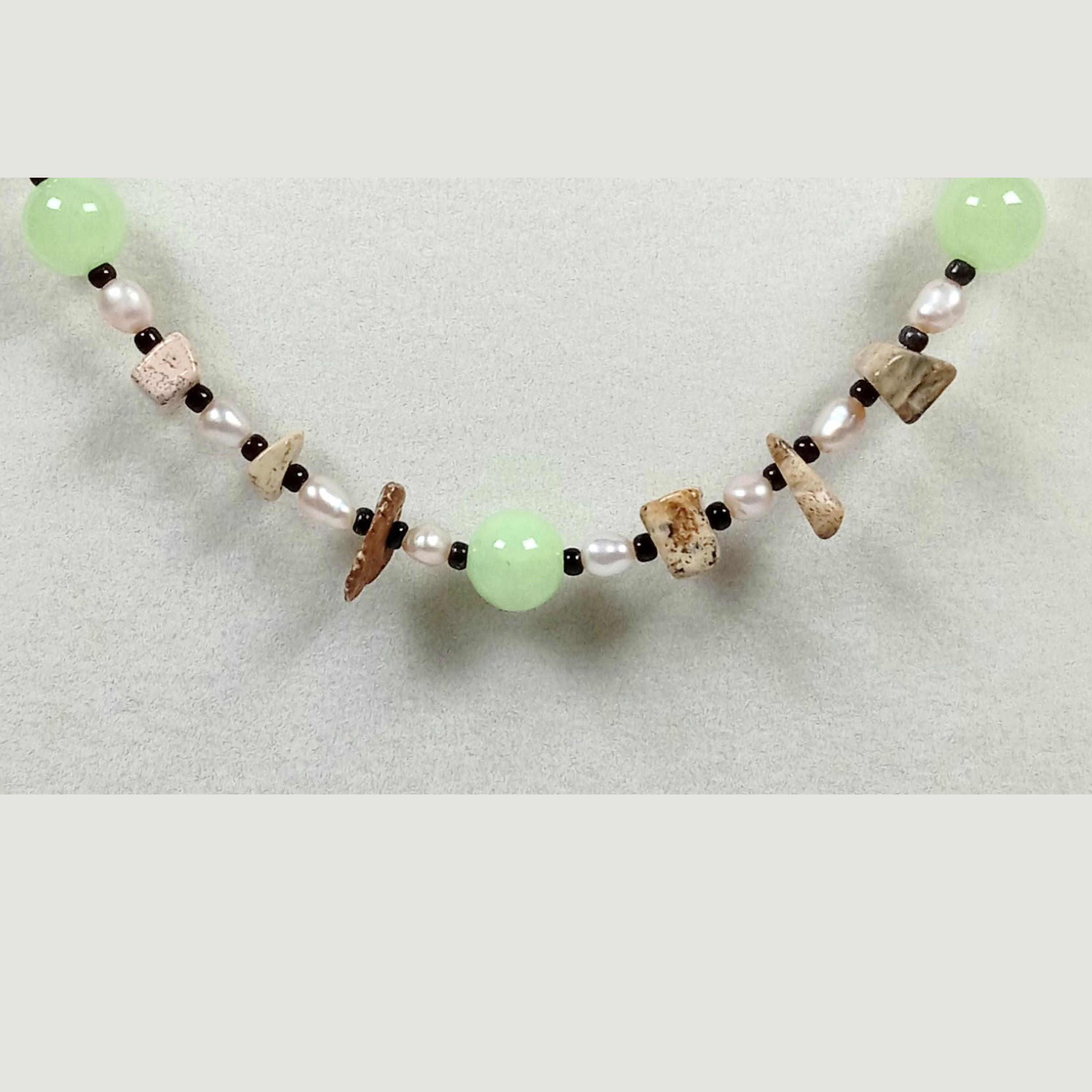 This one-of-a-kind Chrysoprase with Picture Jasper and Pearl is a necklace made with natural stones. One of the beads are birthstone for the month of June.