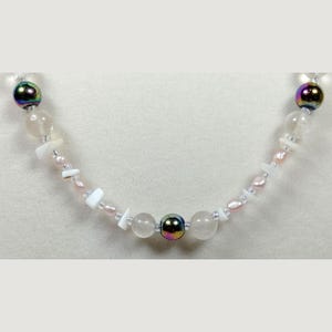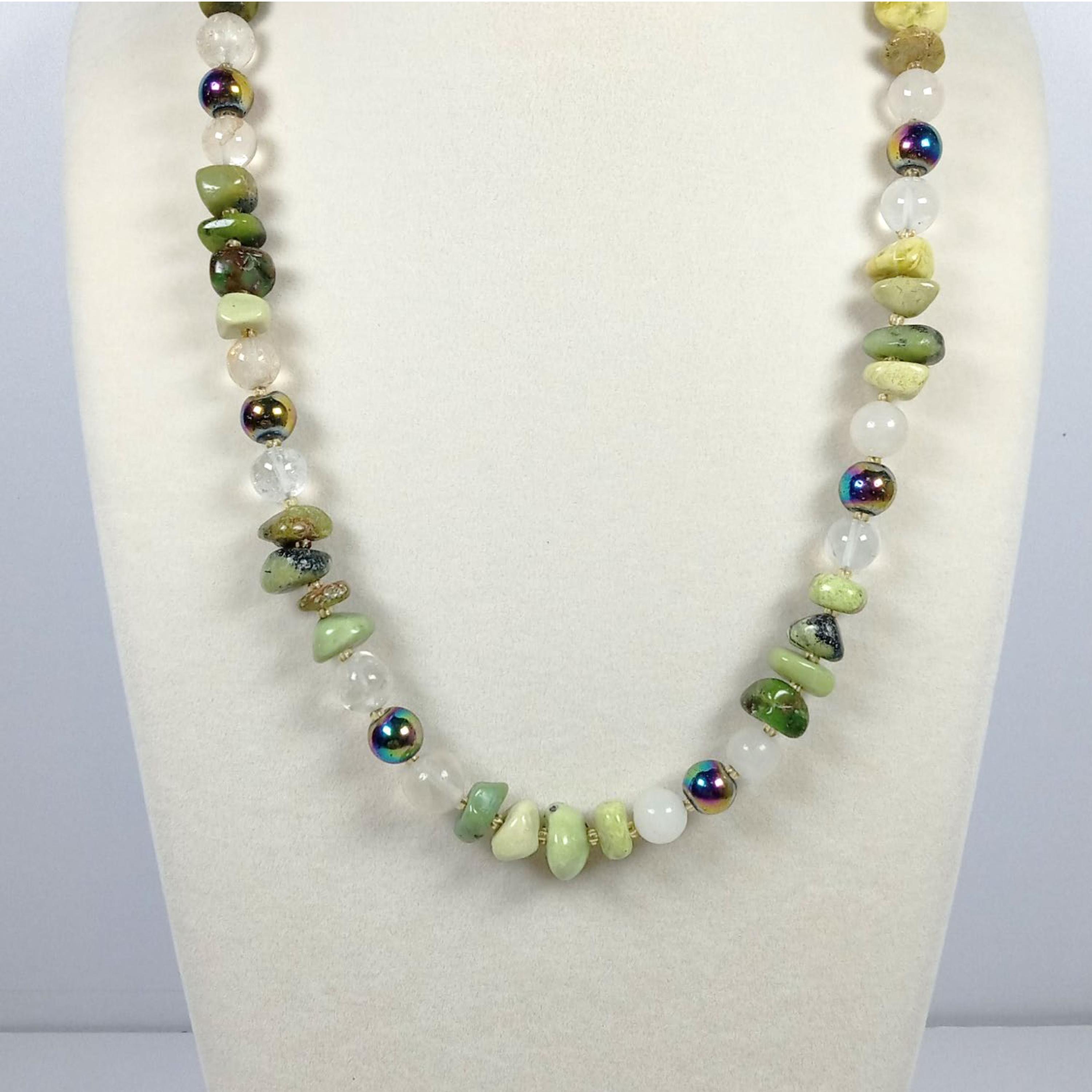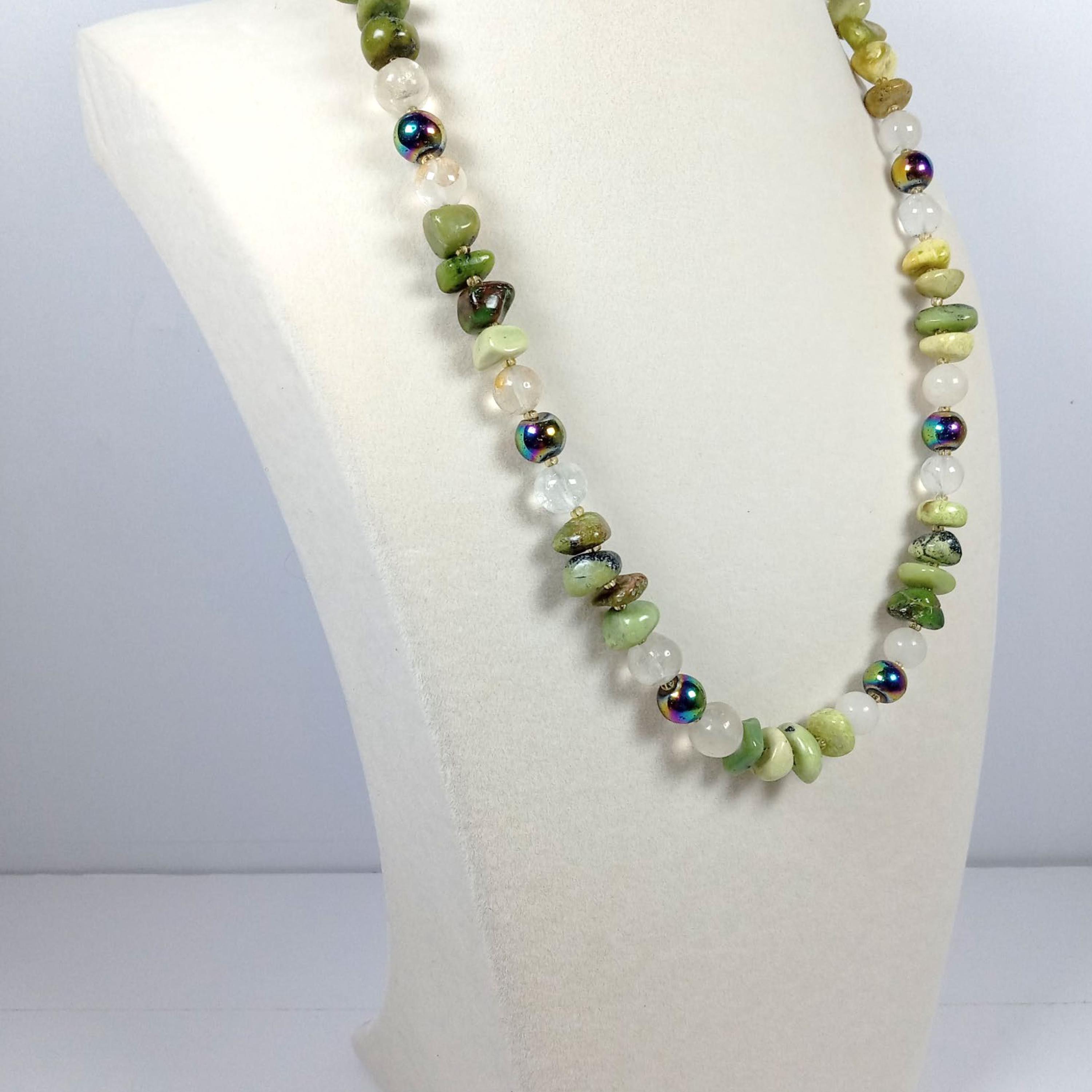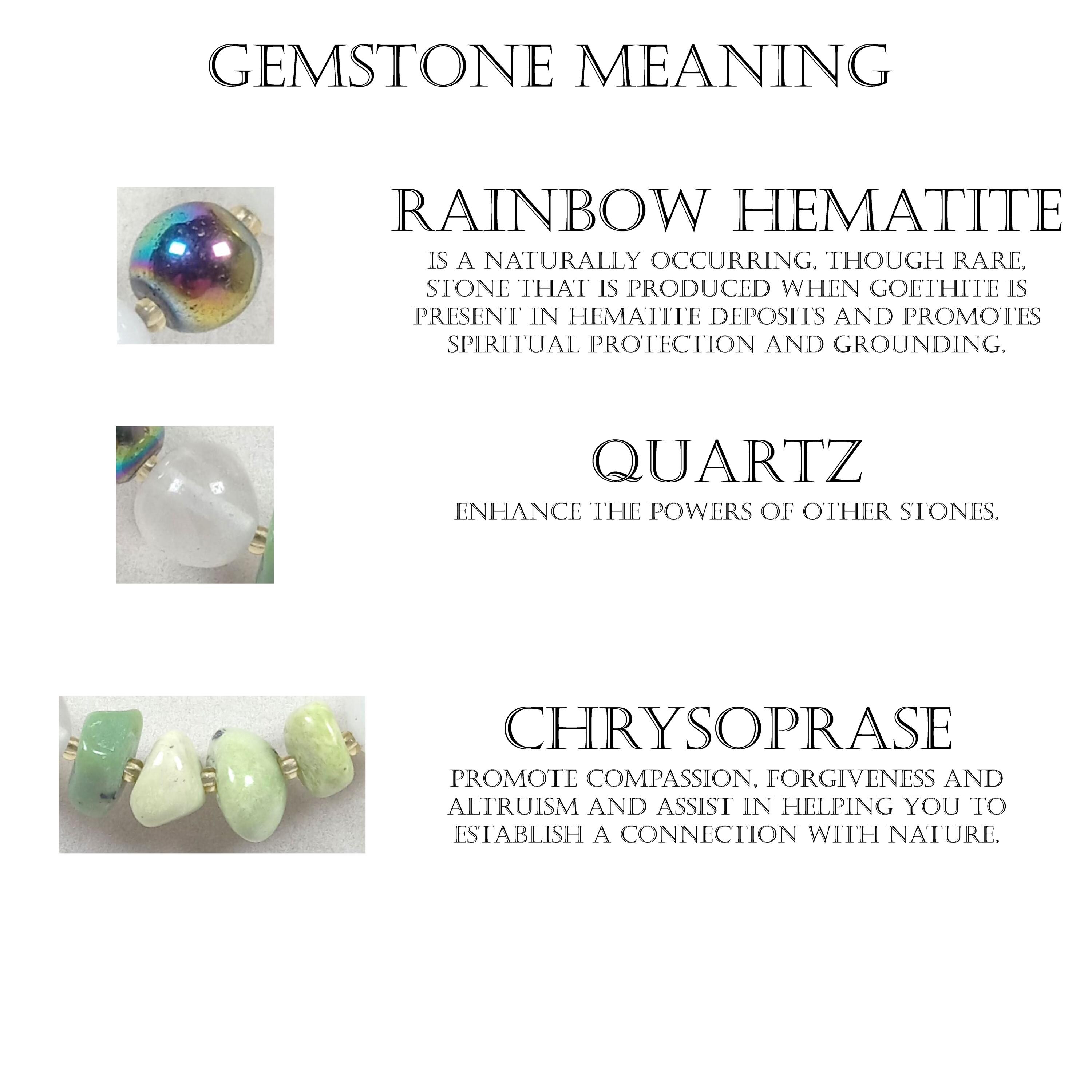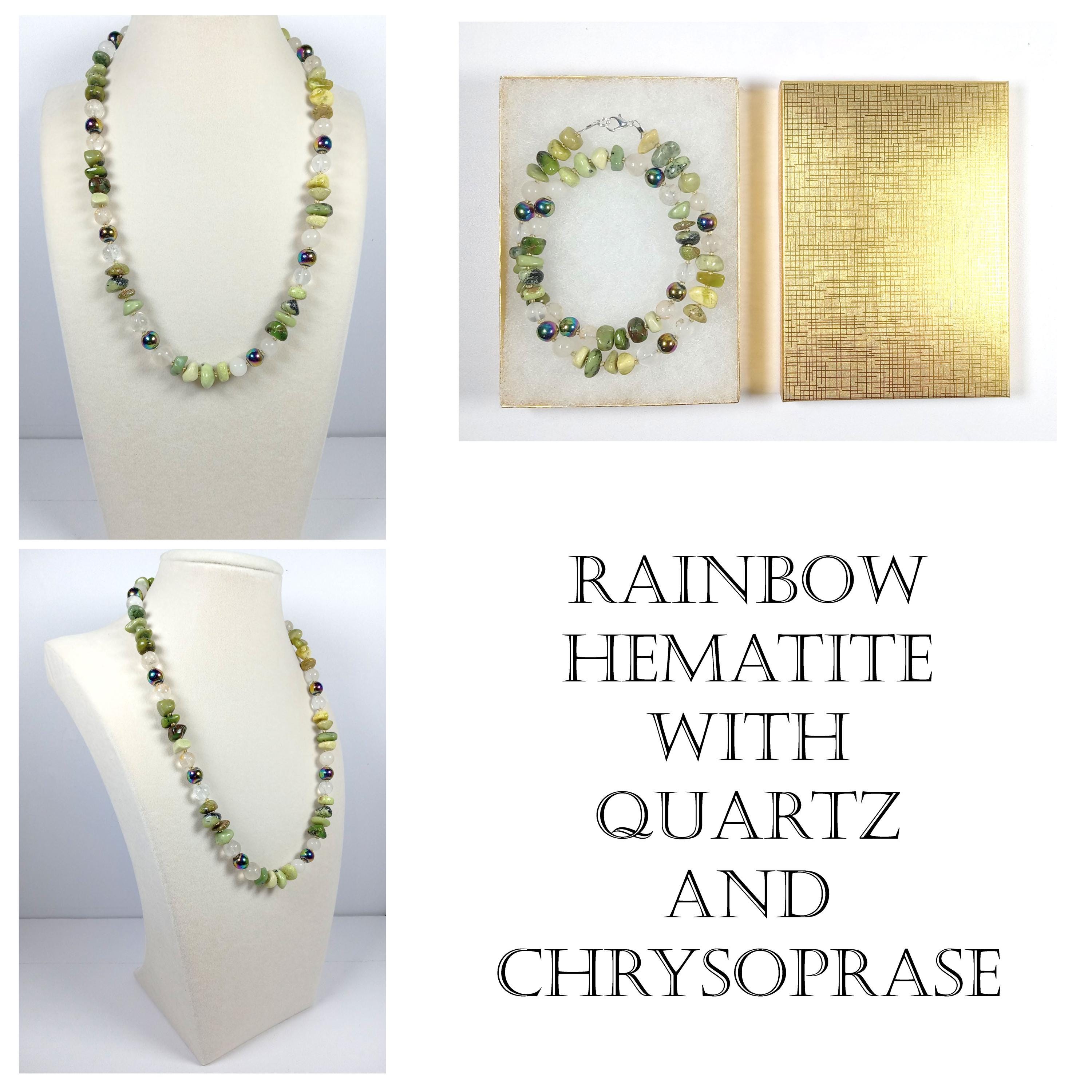 This one-of-a-kind Rainbow Hematite with Quartz and Chrysoprase is a necklace made with natural stones.