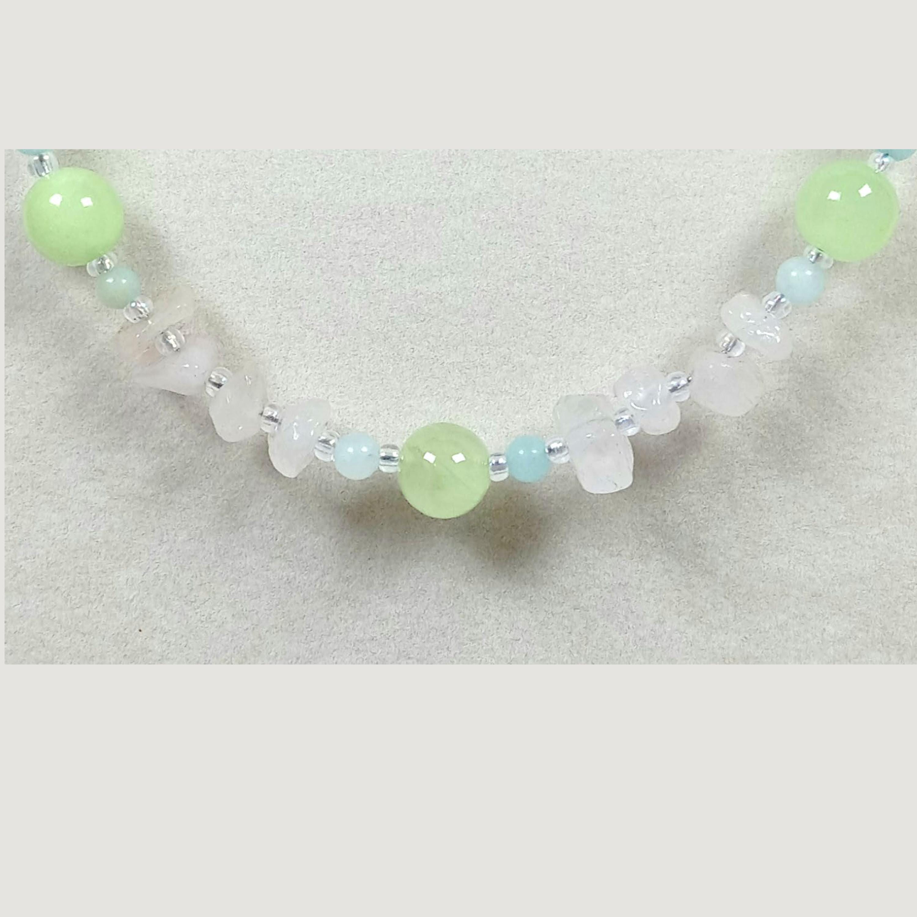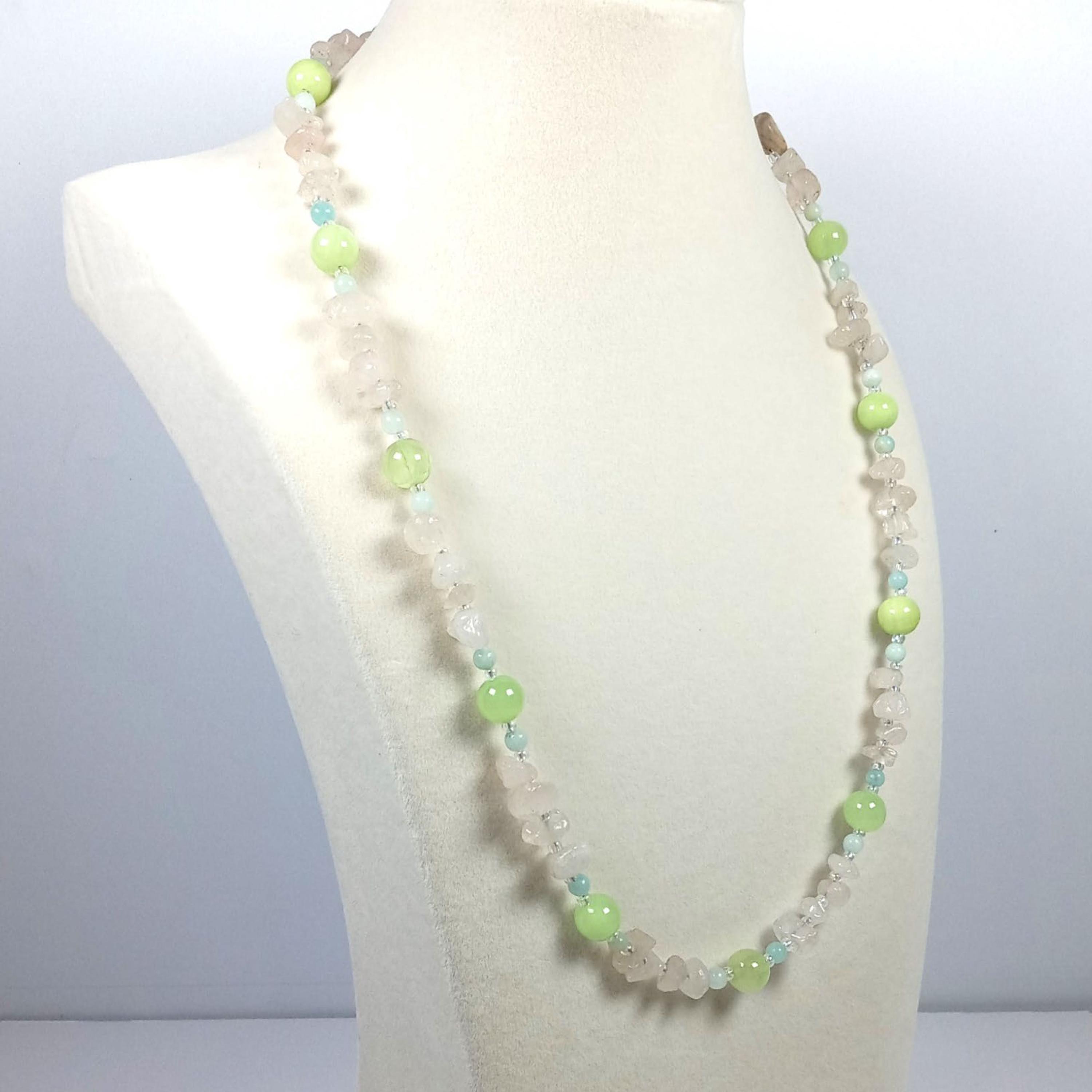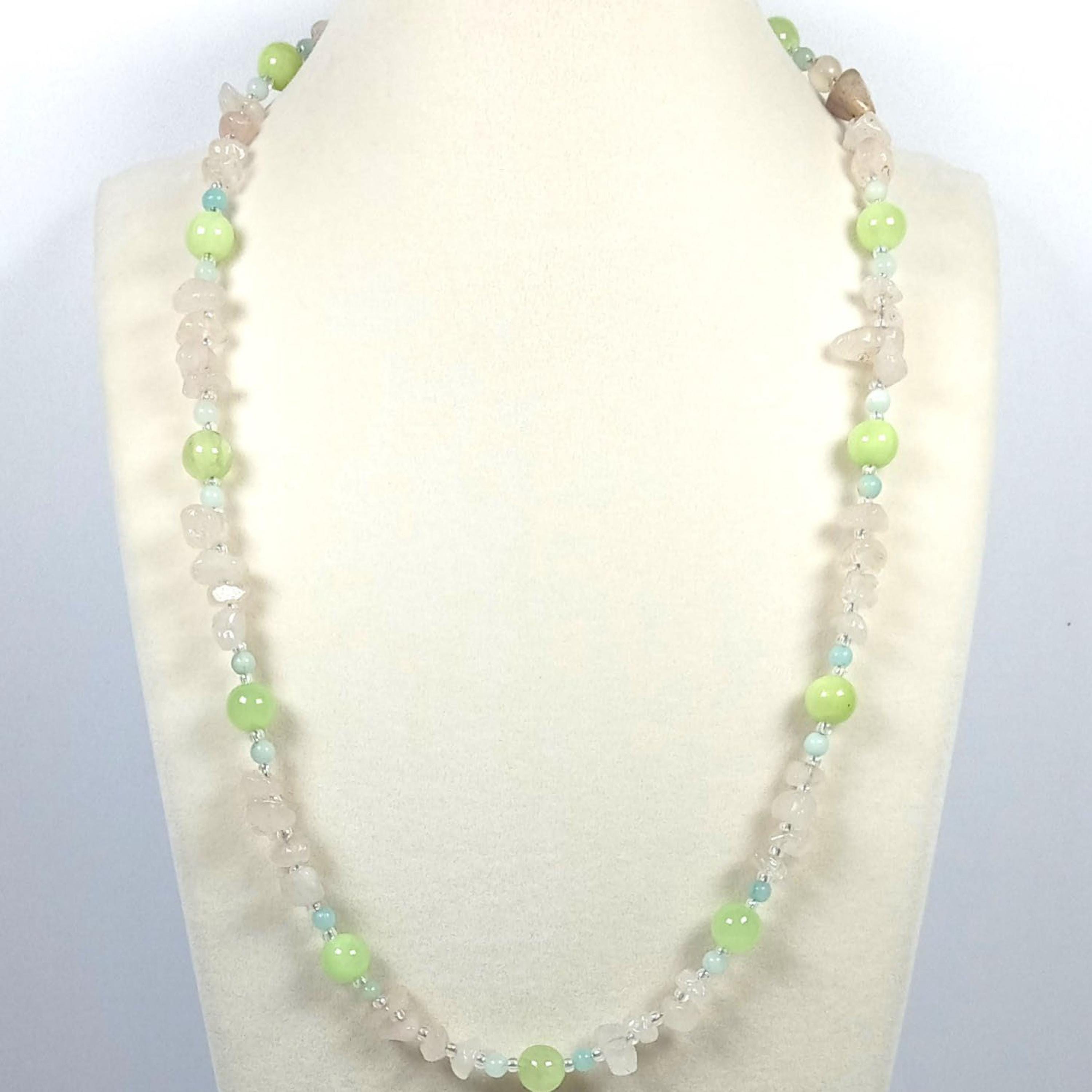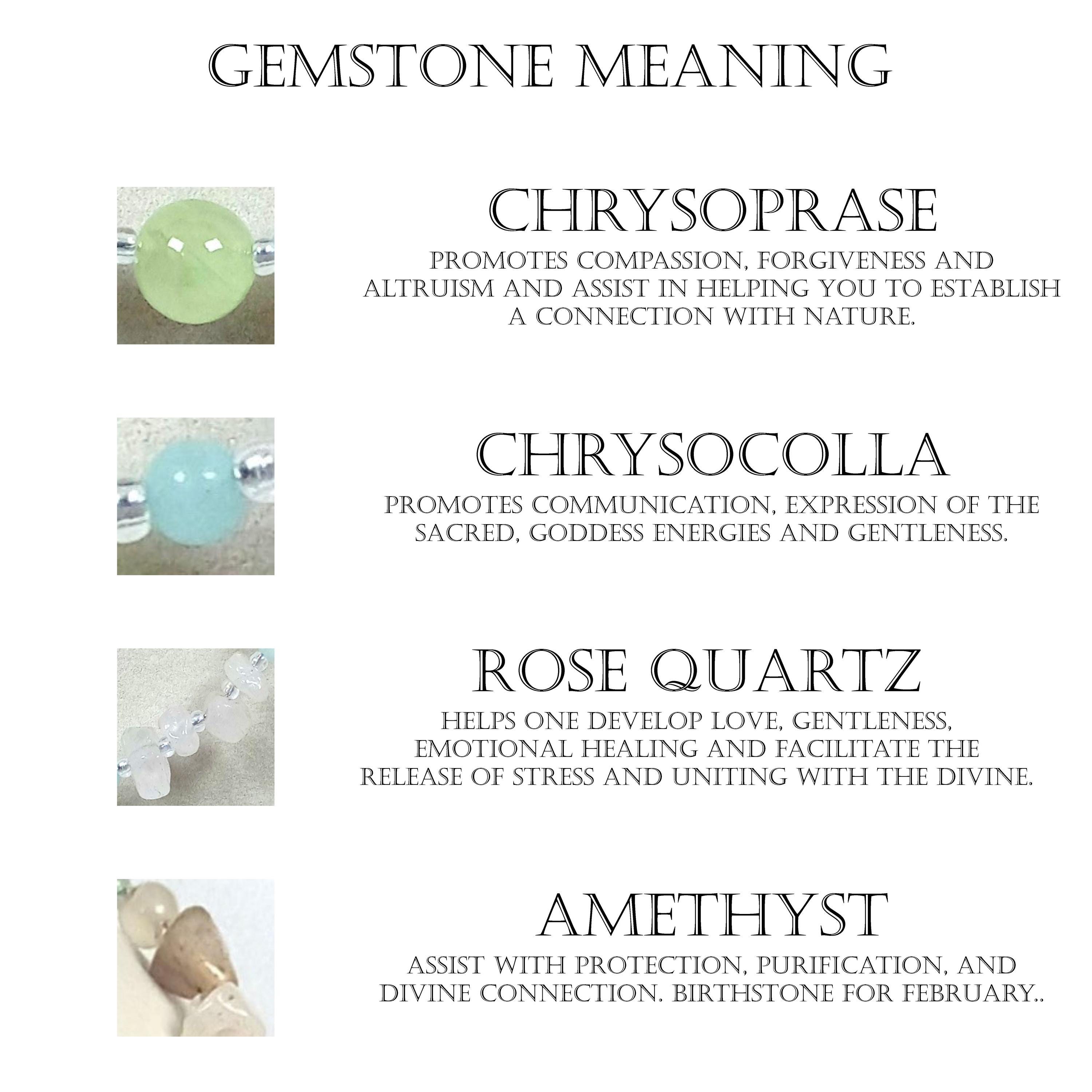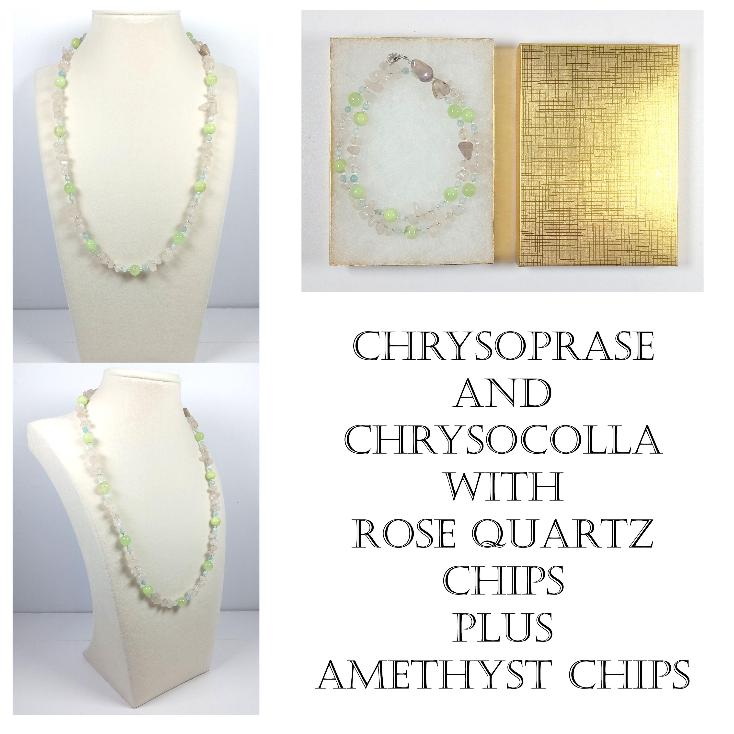 This one-of-a-kind Chrysoprase and Chrysocolla with Rose Quartz Chips plus Amethyst Chips is a necklace made with natural stones. One of the beads are birthstone for the month of February.