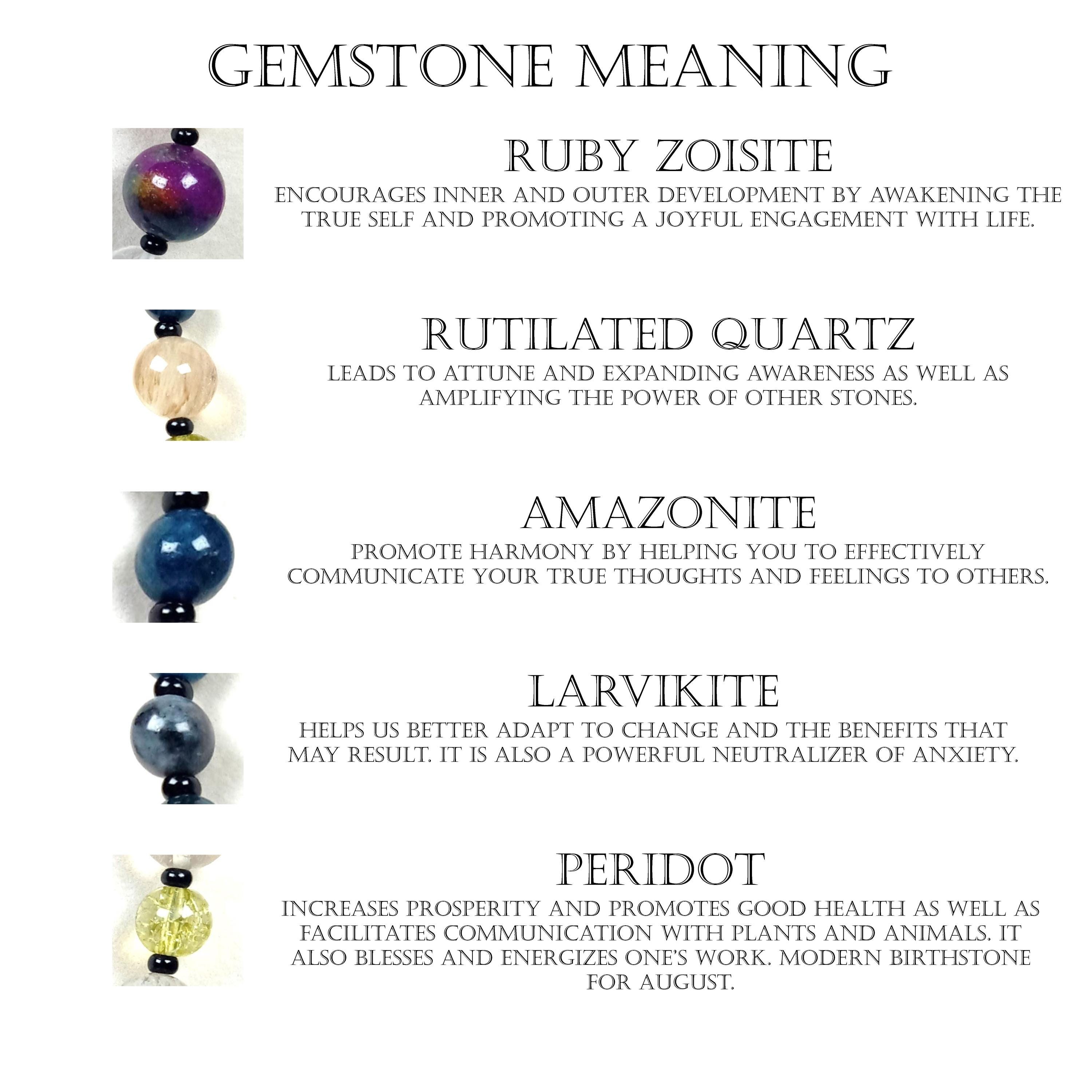 This one-of-a-kind Ruby Zoisite and Rutilated Quartz with Dark Blue Amazonite and Larvikite plus Peridot necklace is made with natural stones. One of the beads are birthstone for the month of August.
