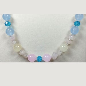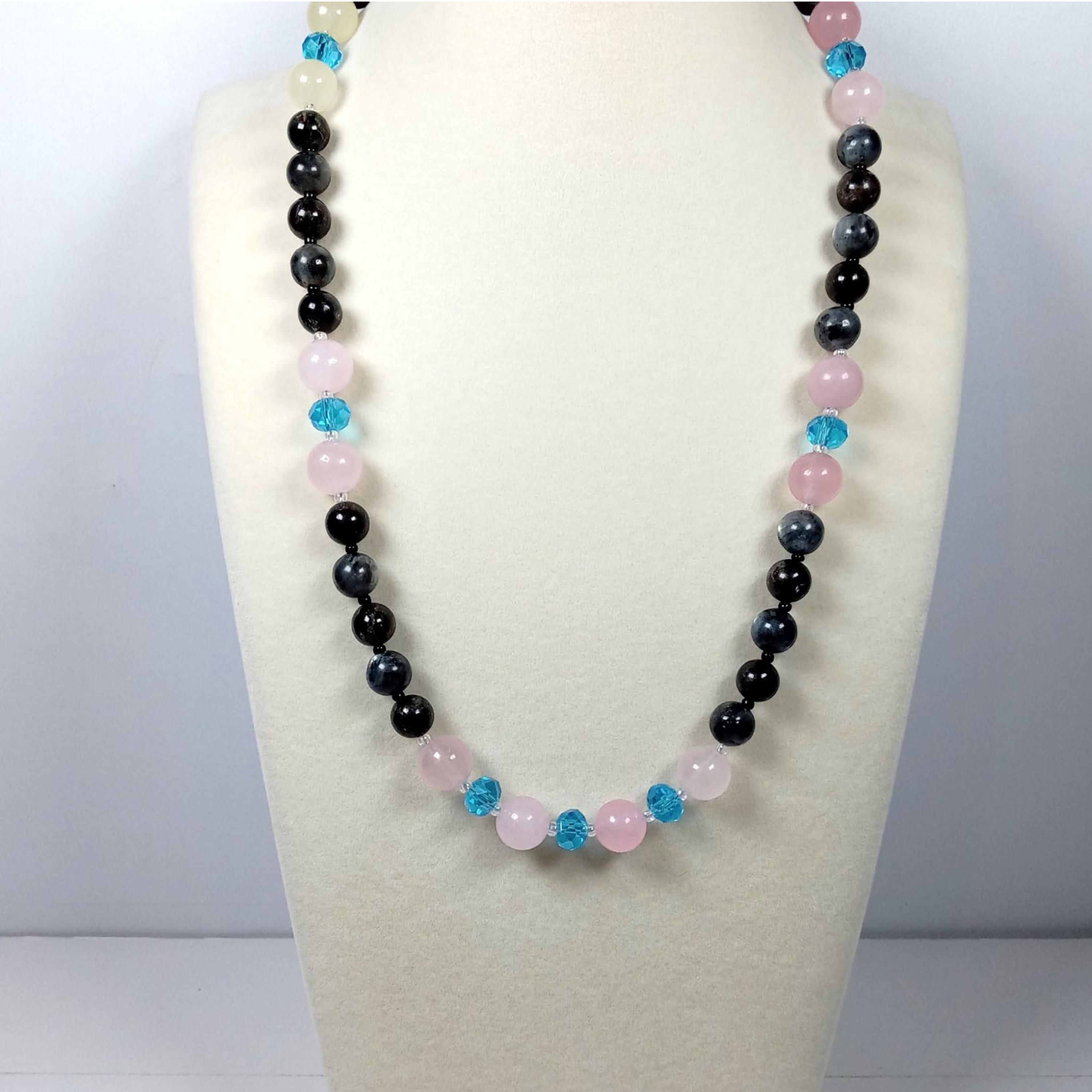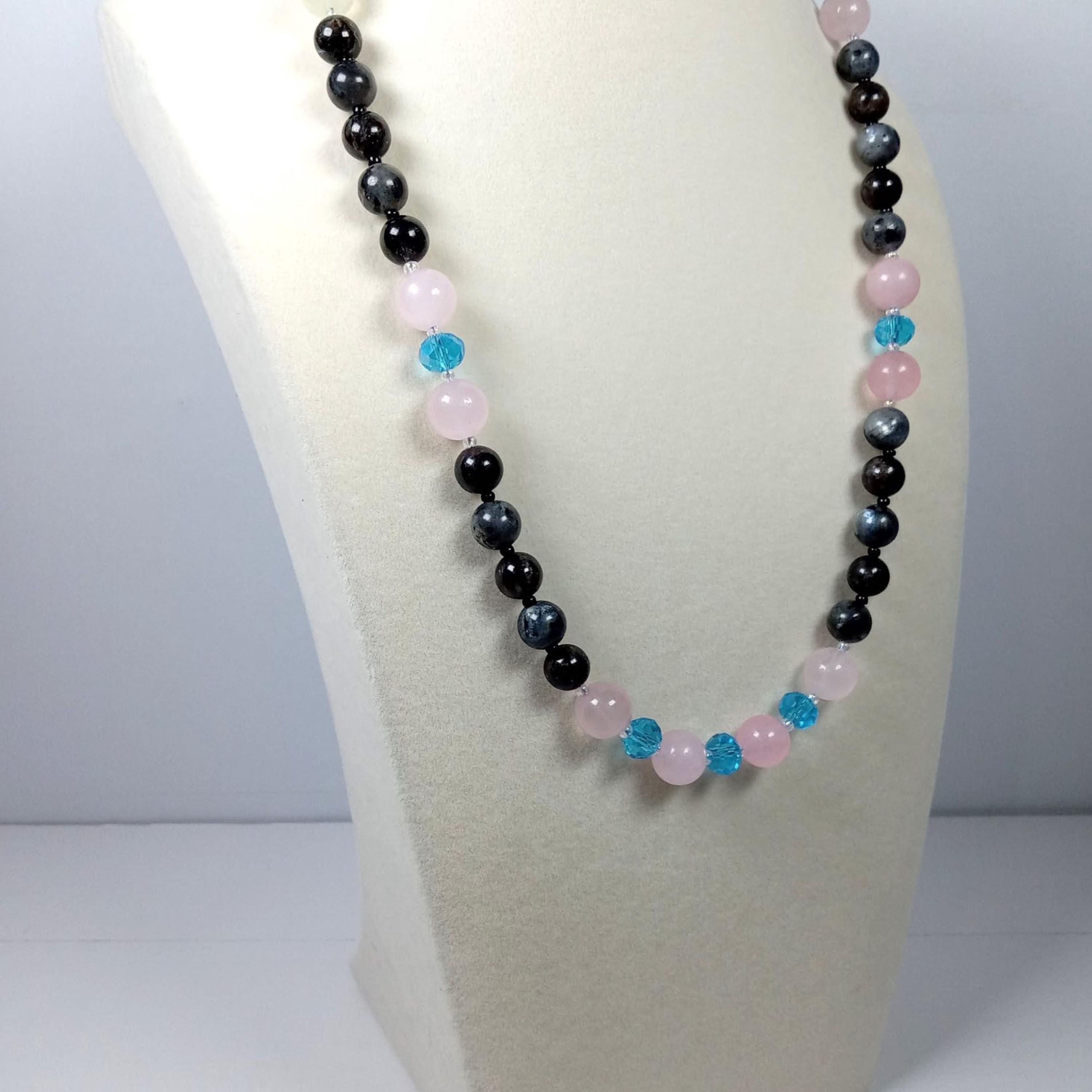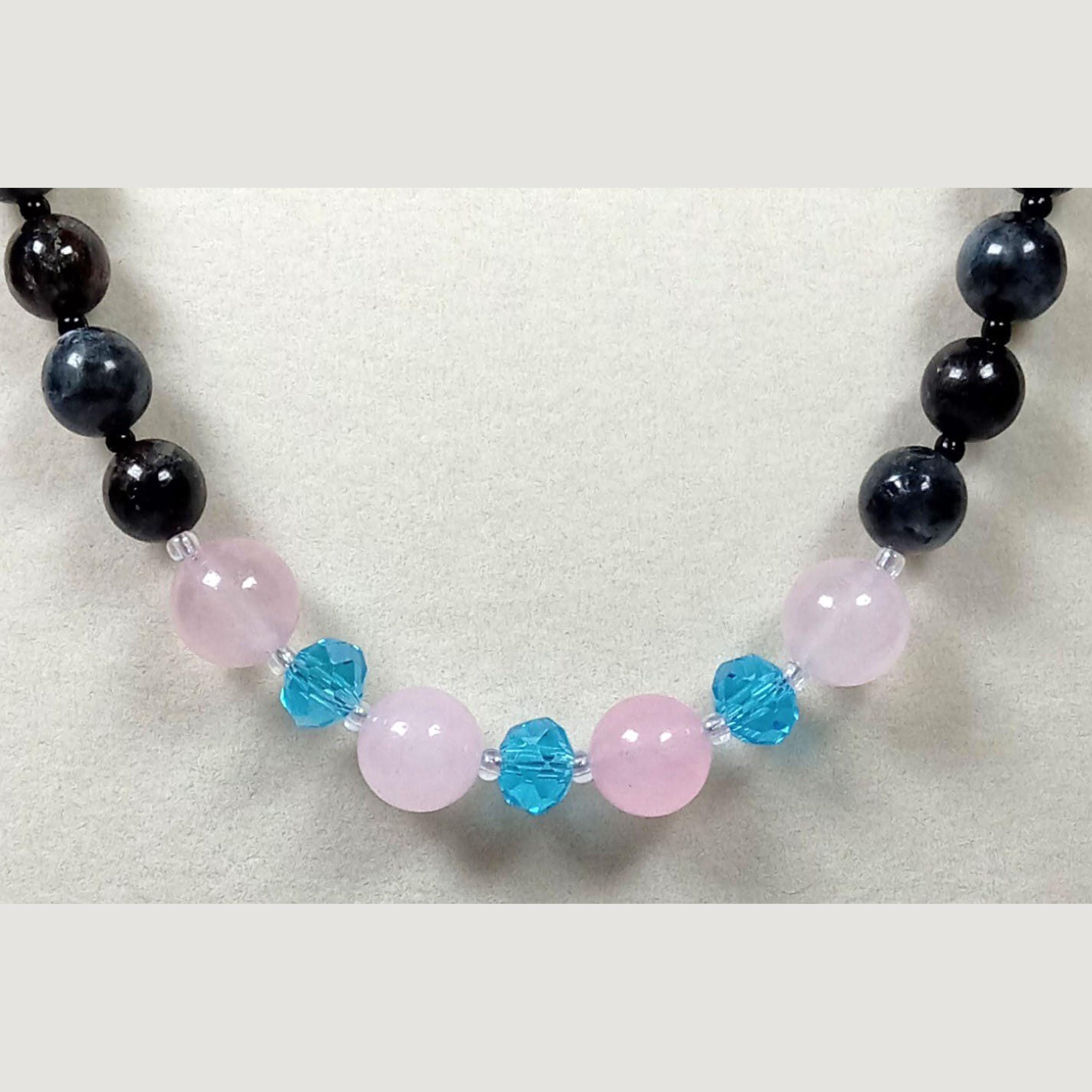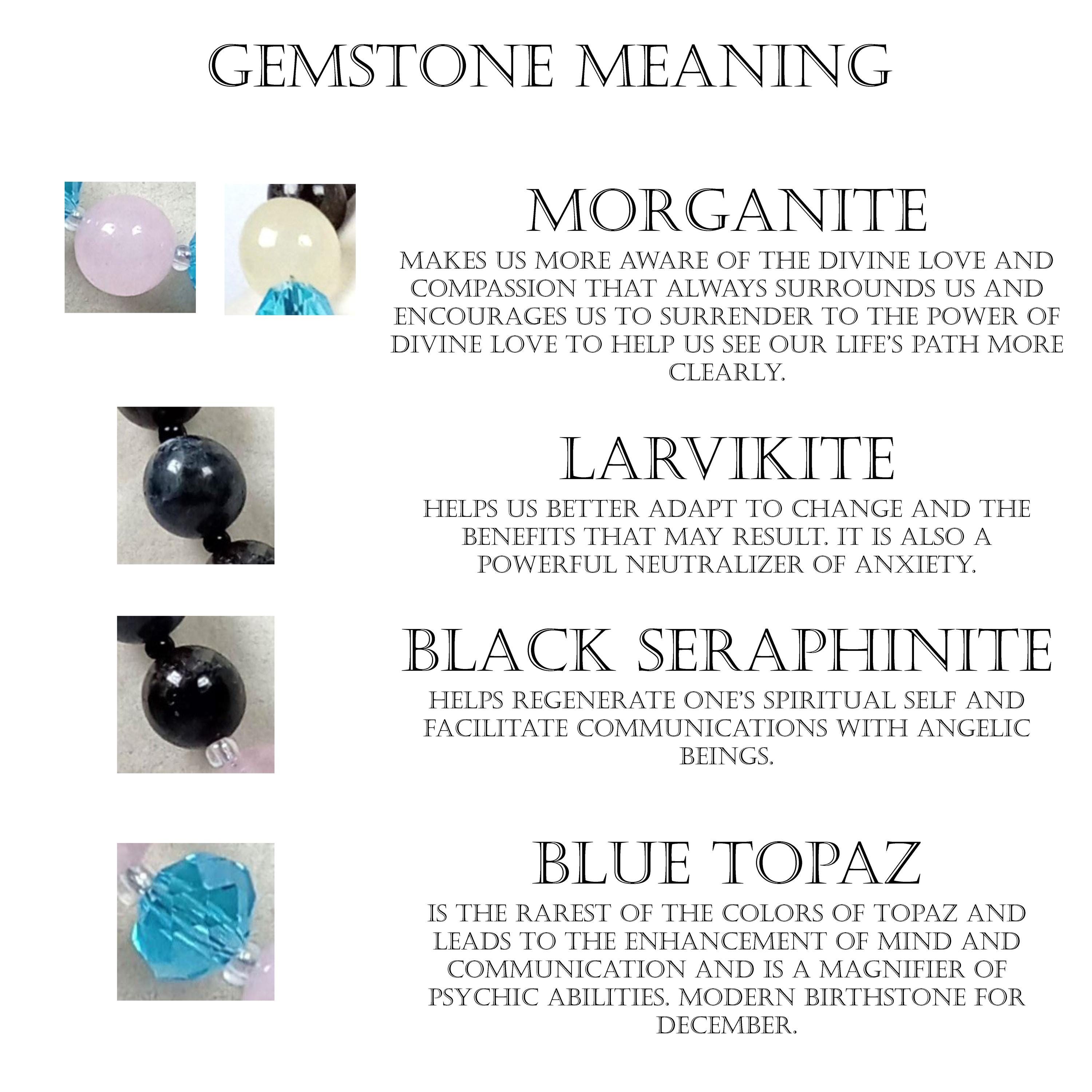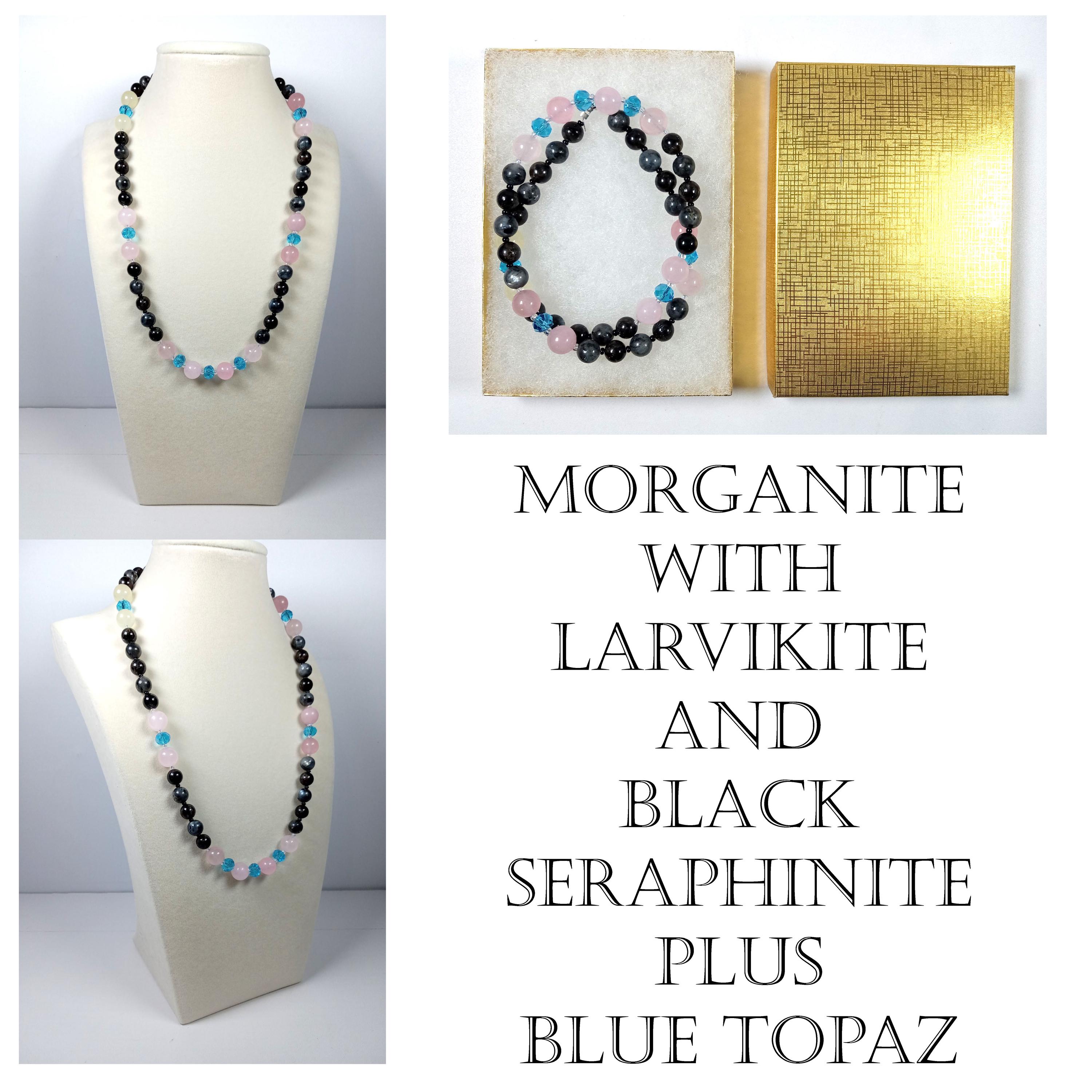 This one-of-a-kind Morganite with Larvikite and Black Seraphinite plus Blue Topaz necklace is made with natural stones. One of the beads are birthstone for the month of December.