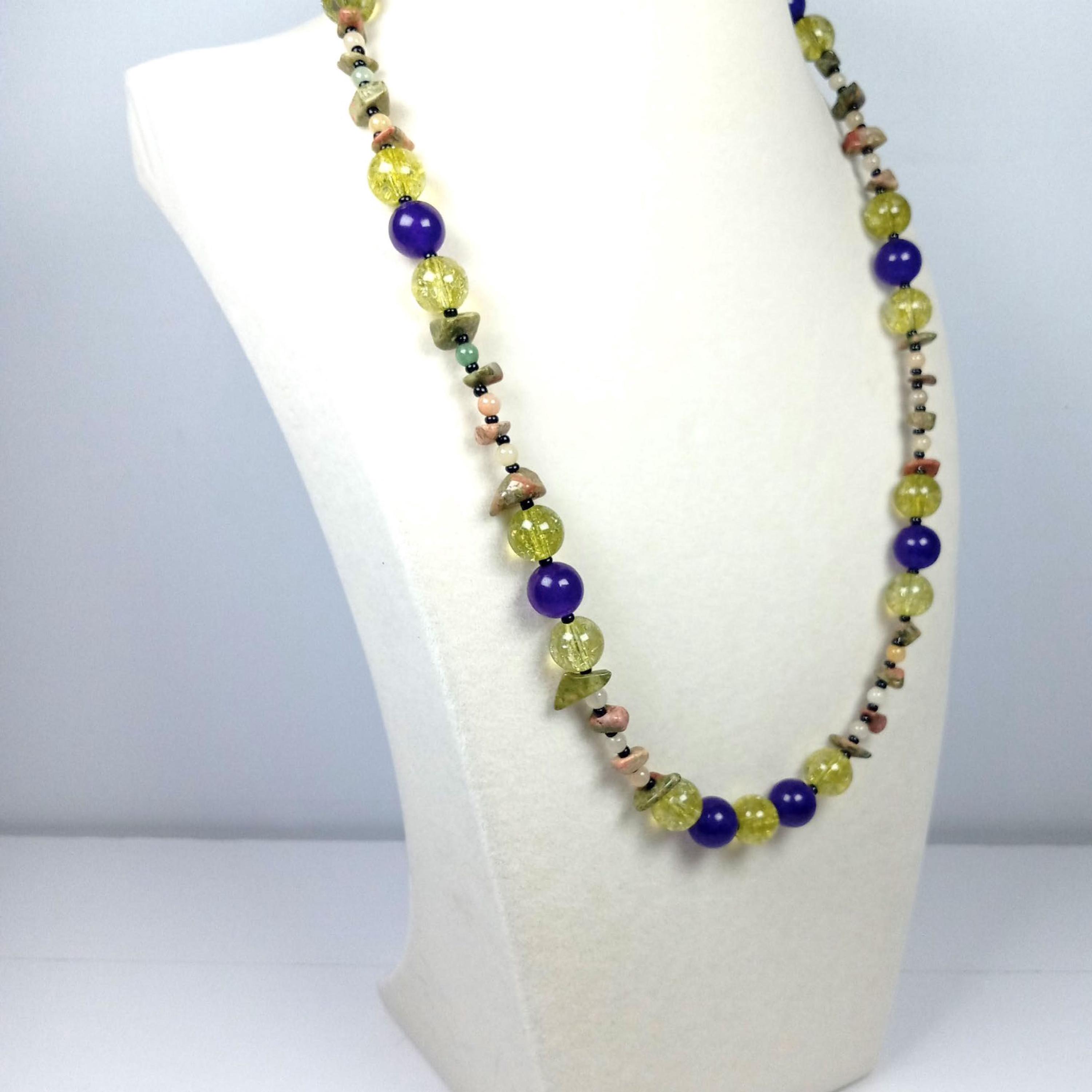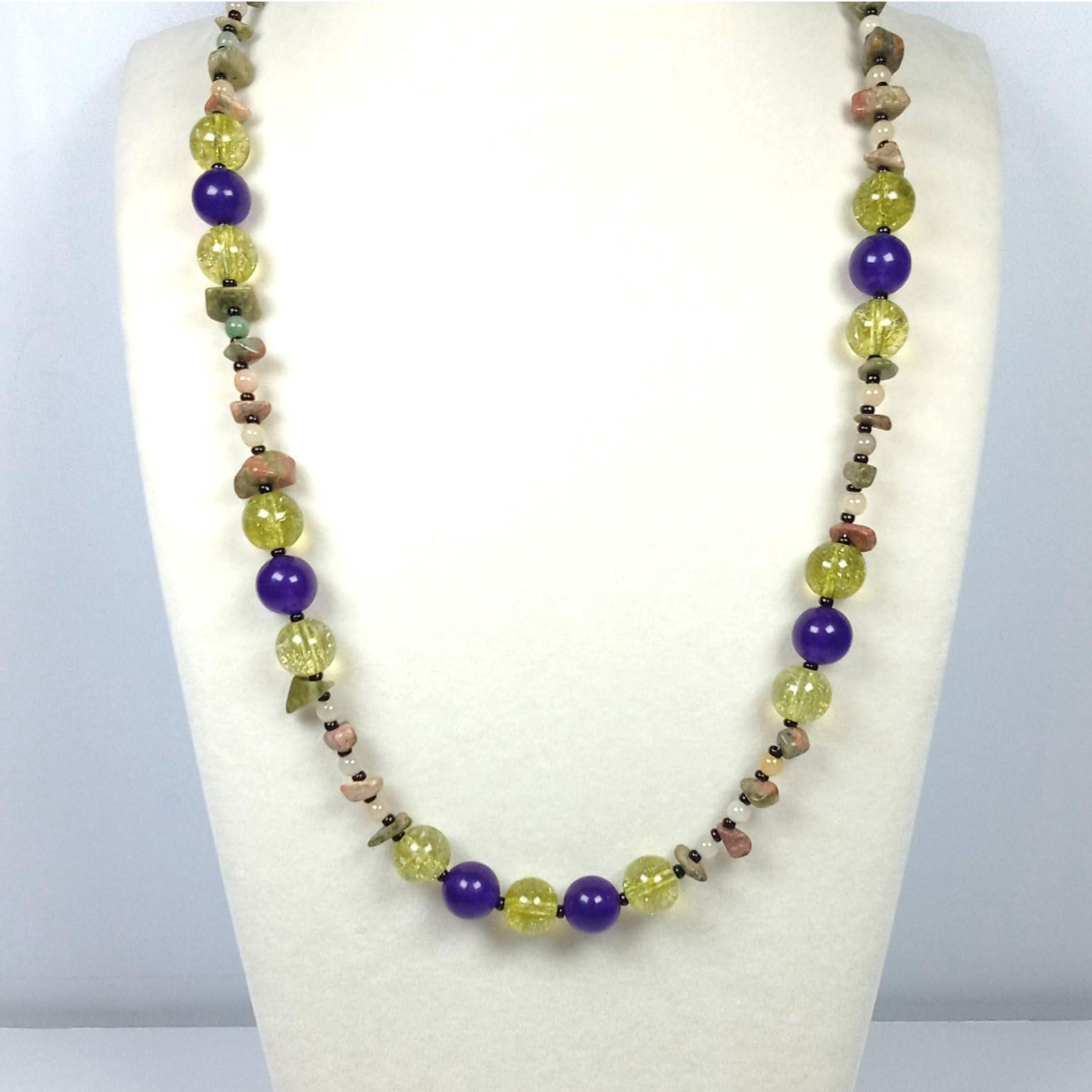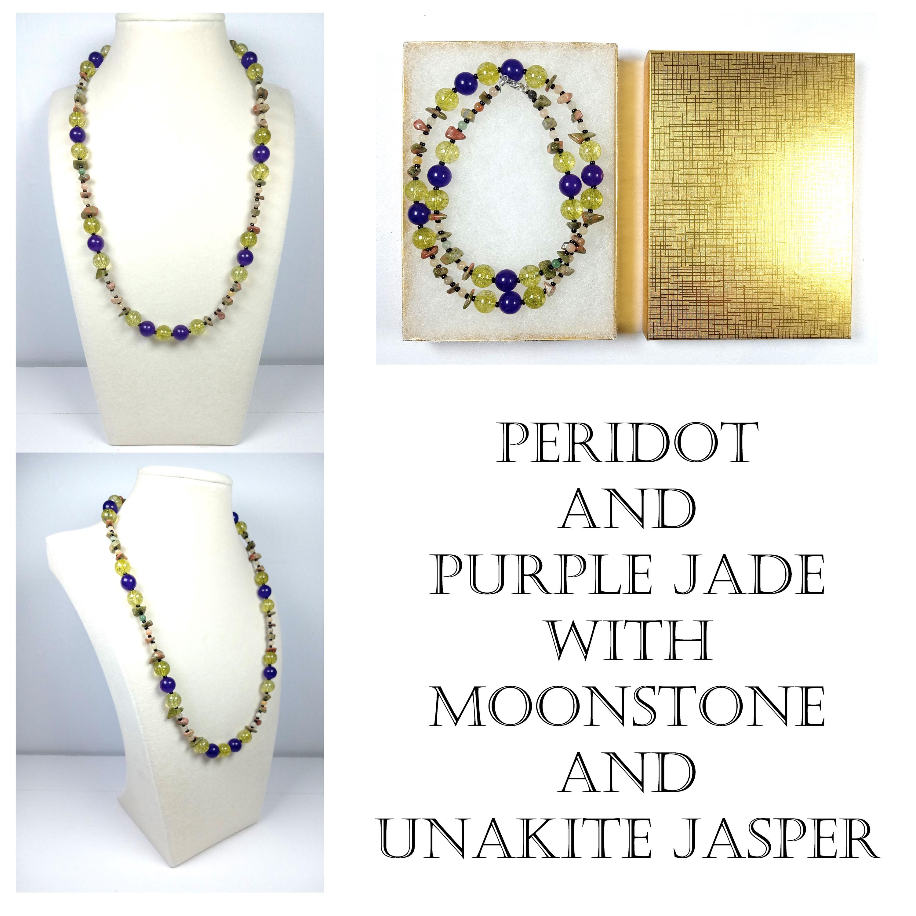 This one-of-a-kind Peridot and Purple Jade with Moonstone and Unakite Jasper necklace is made with natural stones. Two of the beads are birthstones for the months of June and August.