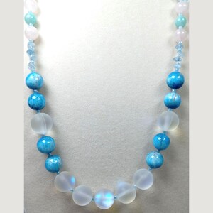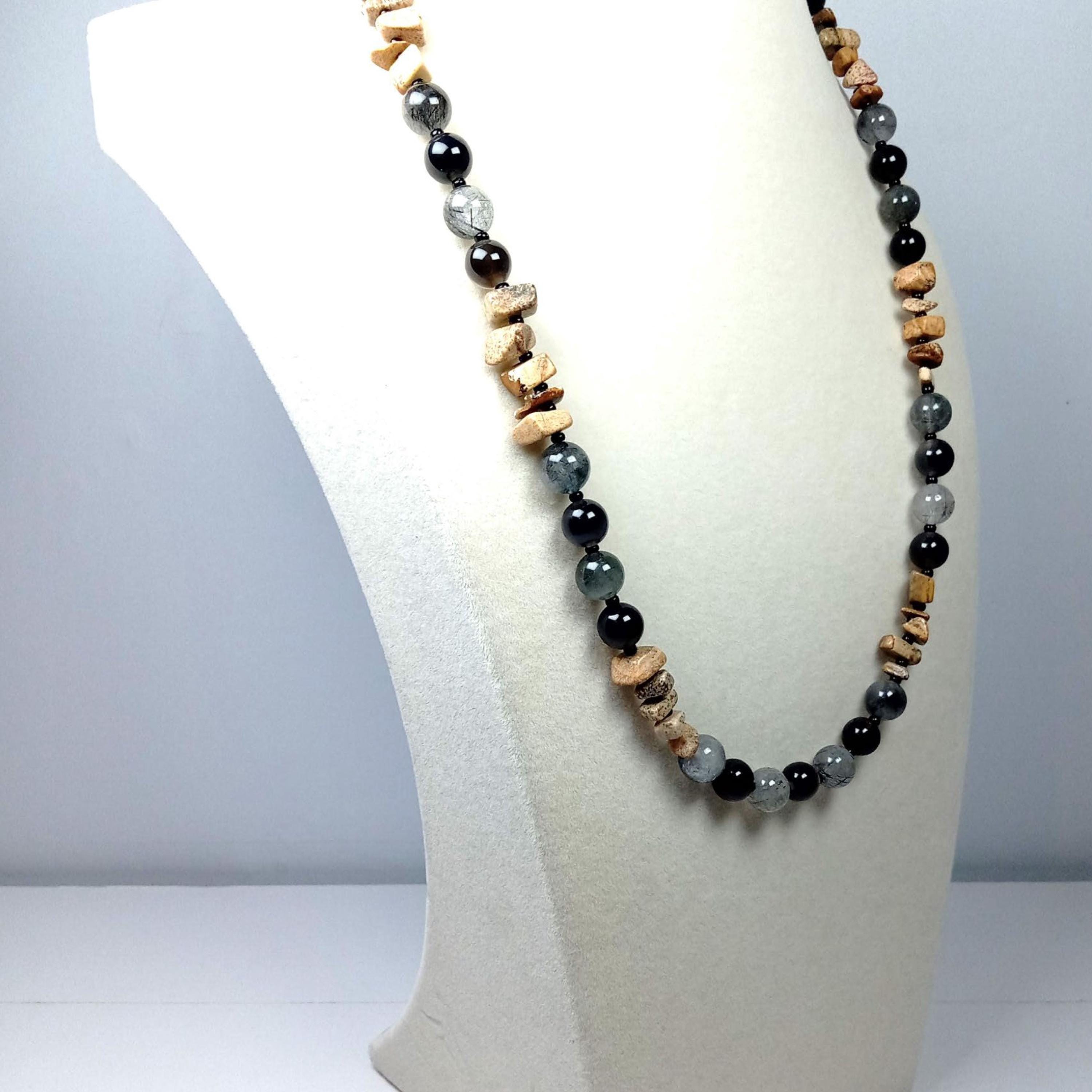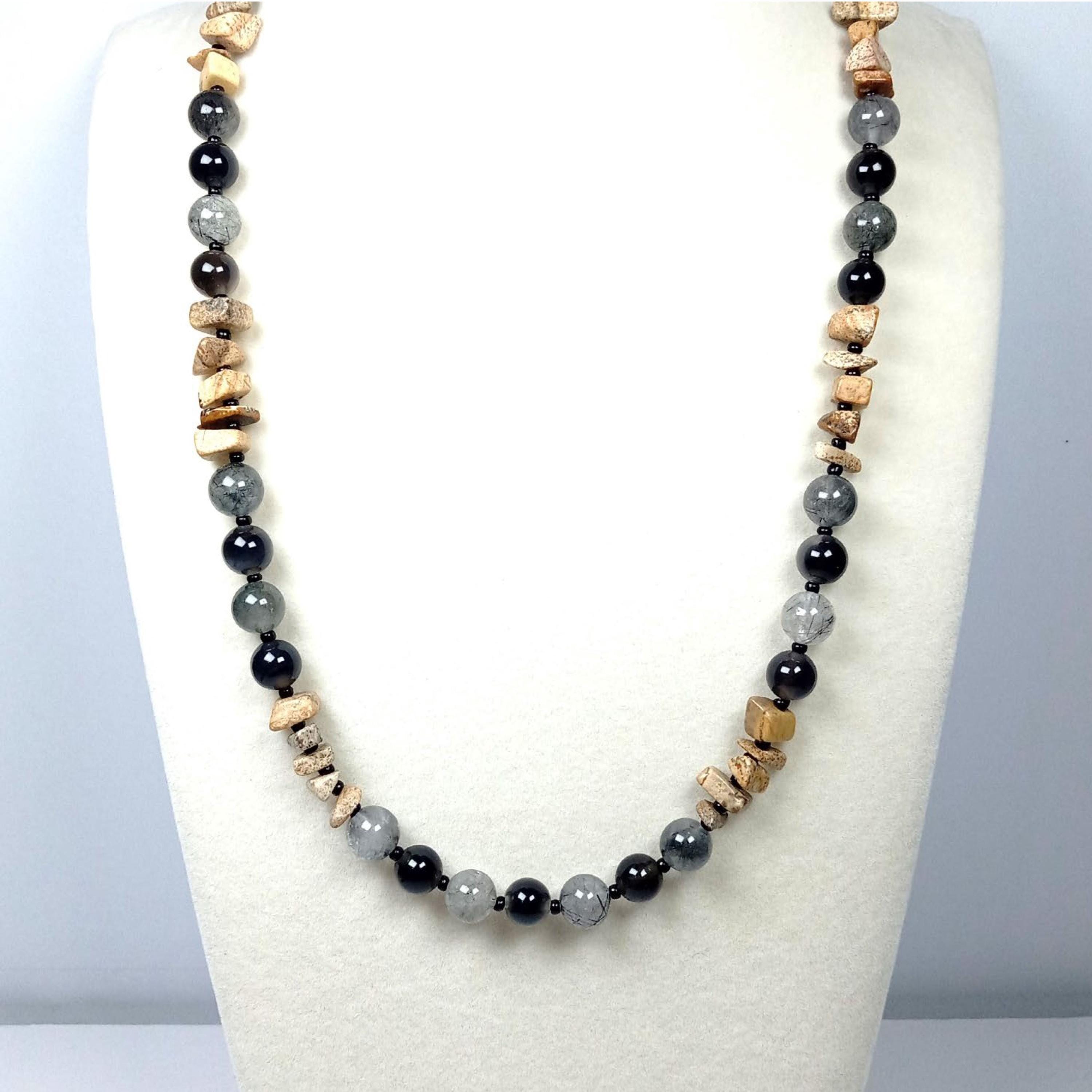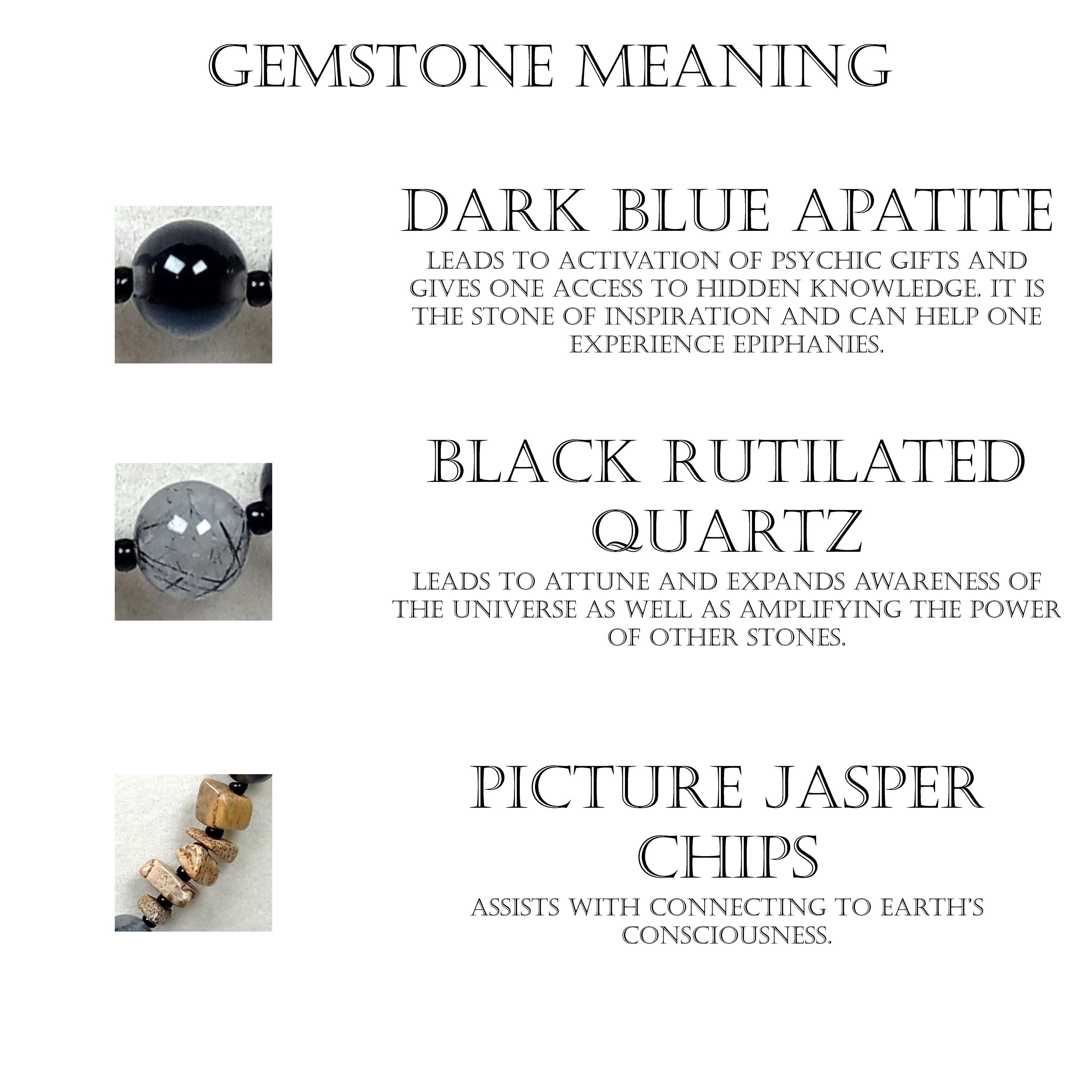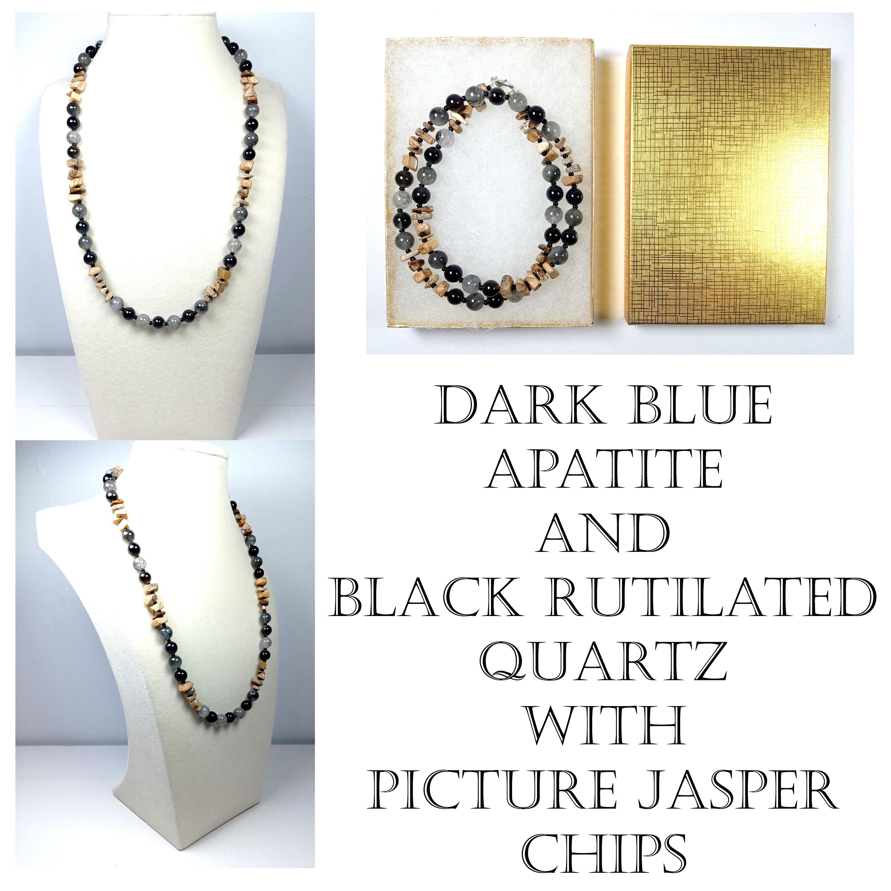 This one-of-a-kind Dark Blue Apatite and Black Rutilated Quartz with Picture Jasper Chips necklace is made with natural stones.