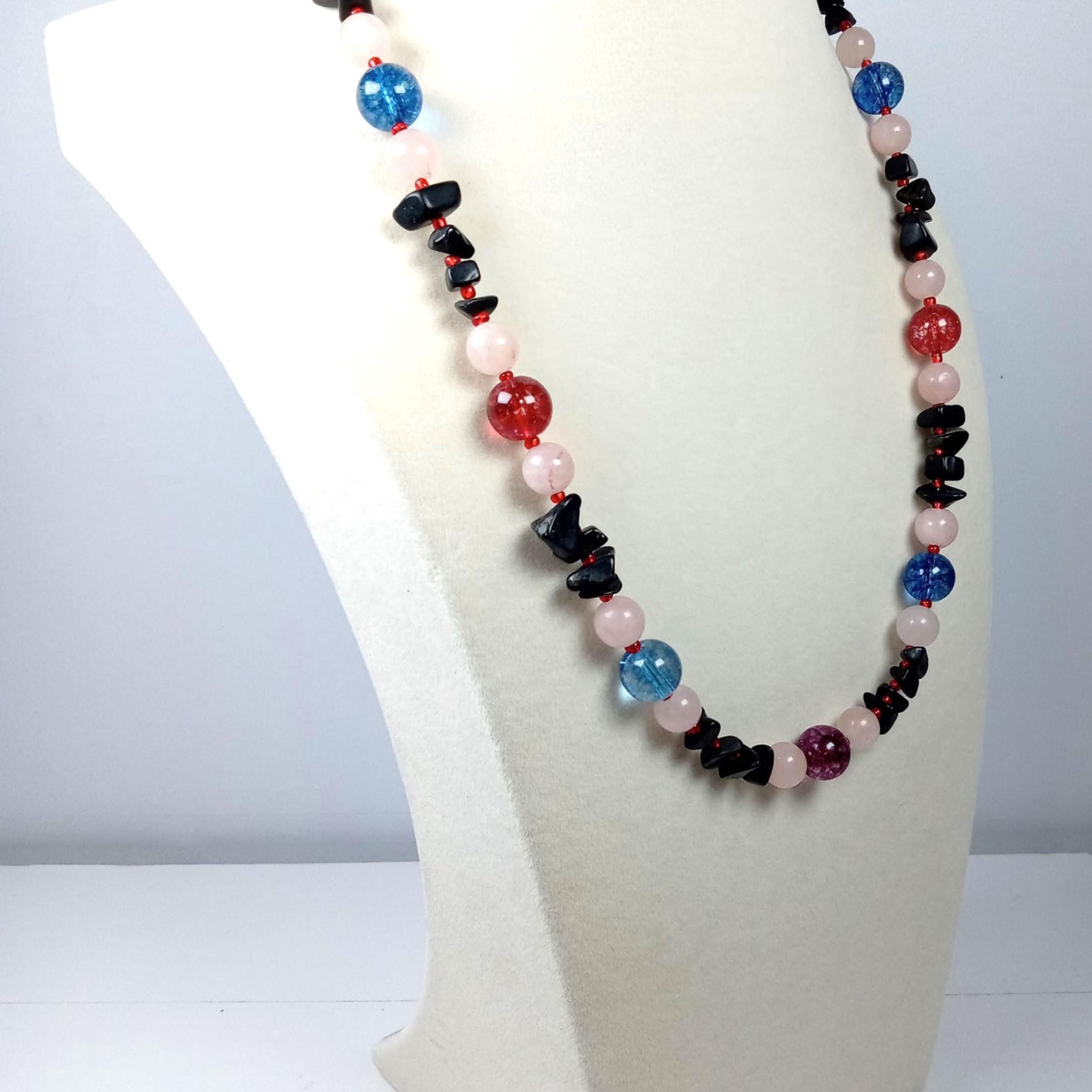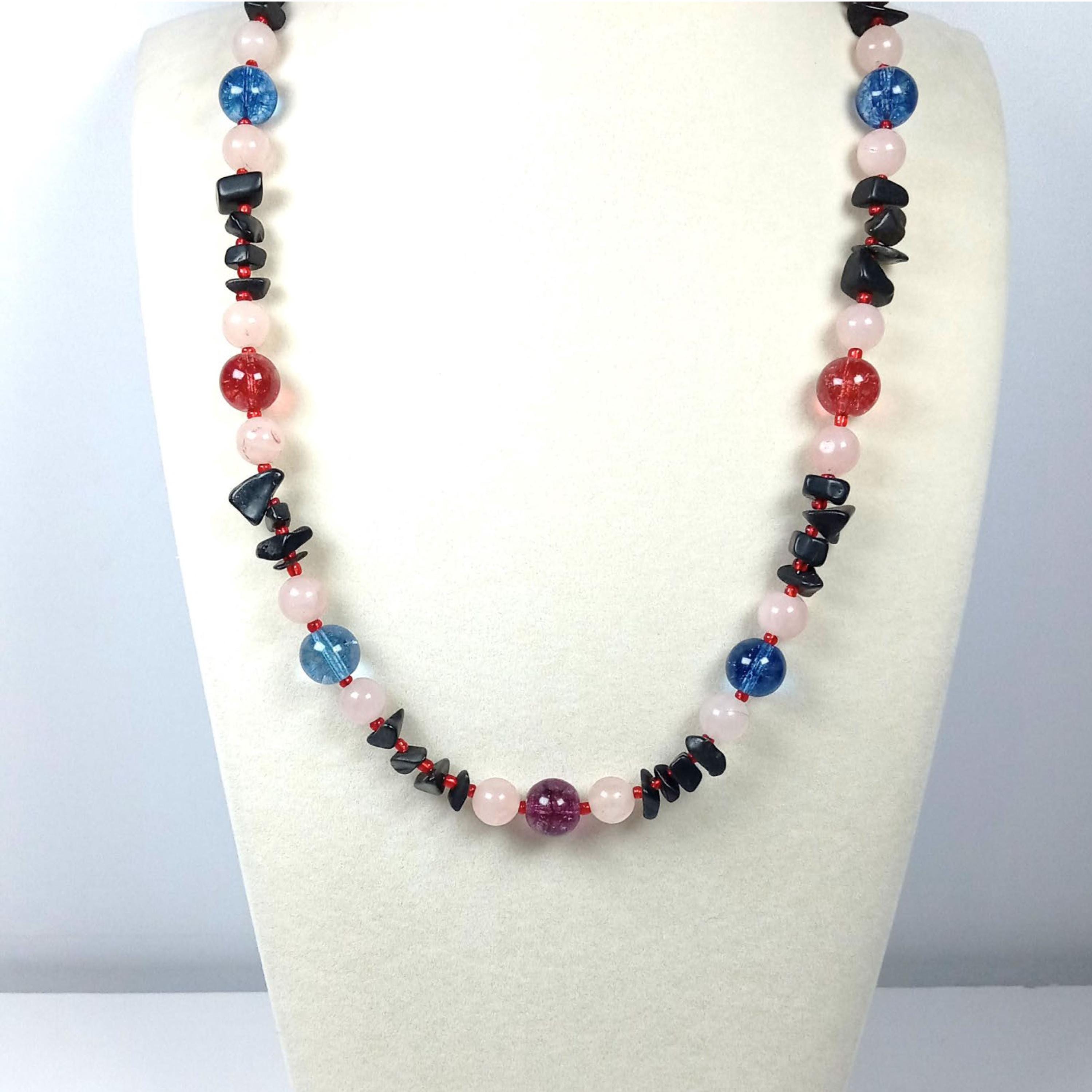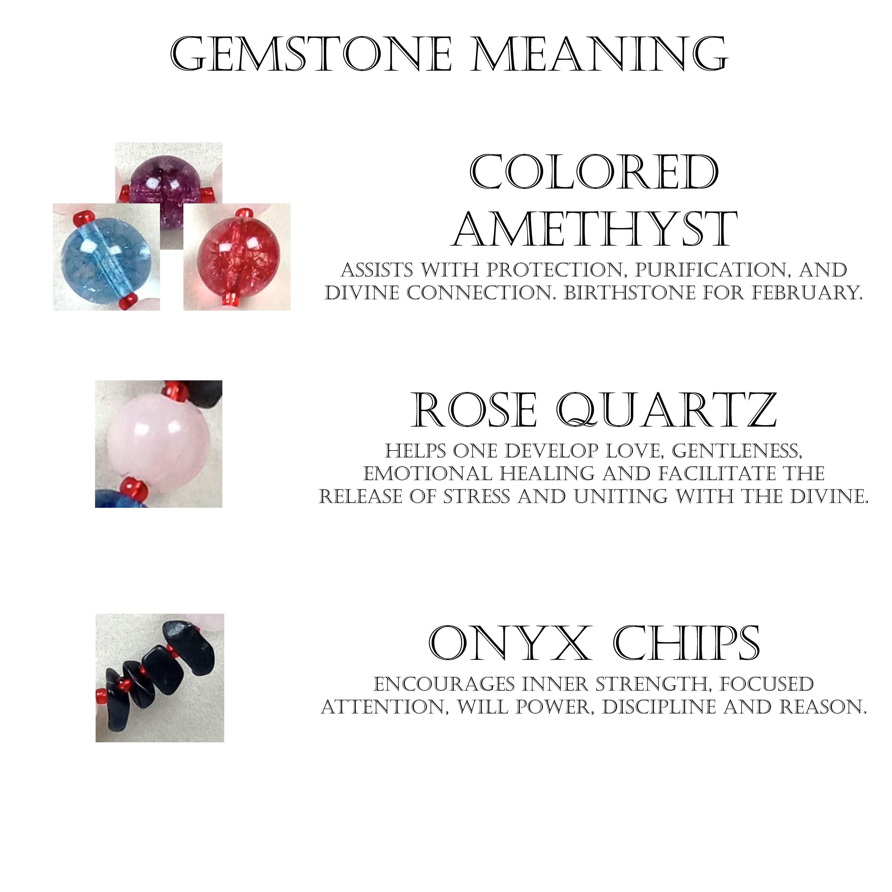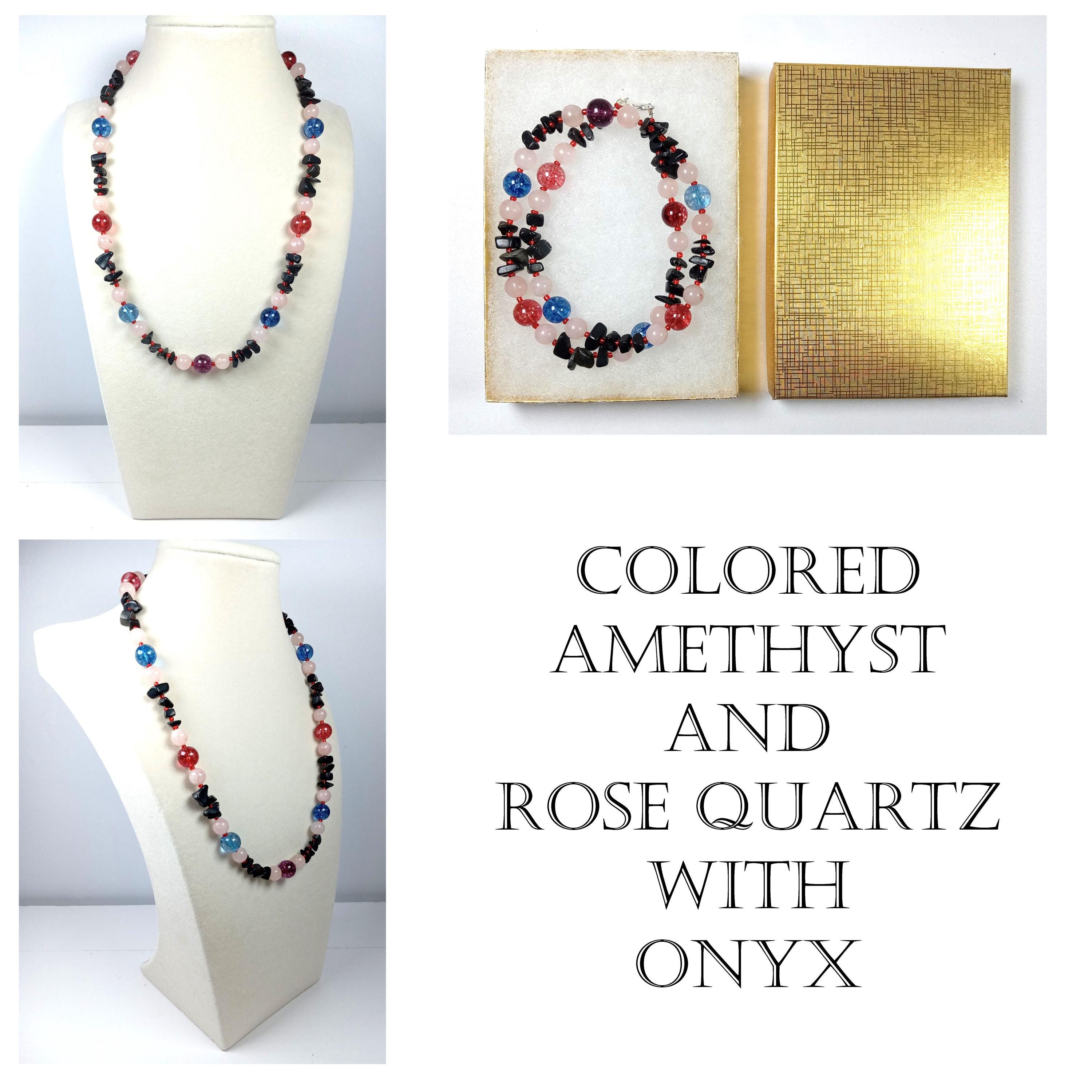 This one-of-a-kind Colored Amethyst and Rose Quartz with Onyx Chips necklace is made with natural stones. One of the beads are birthstone for the month of February.