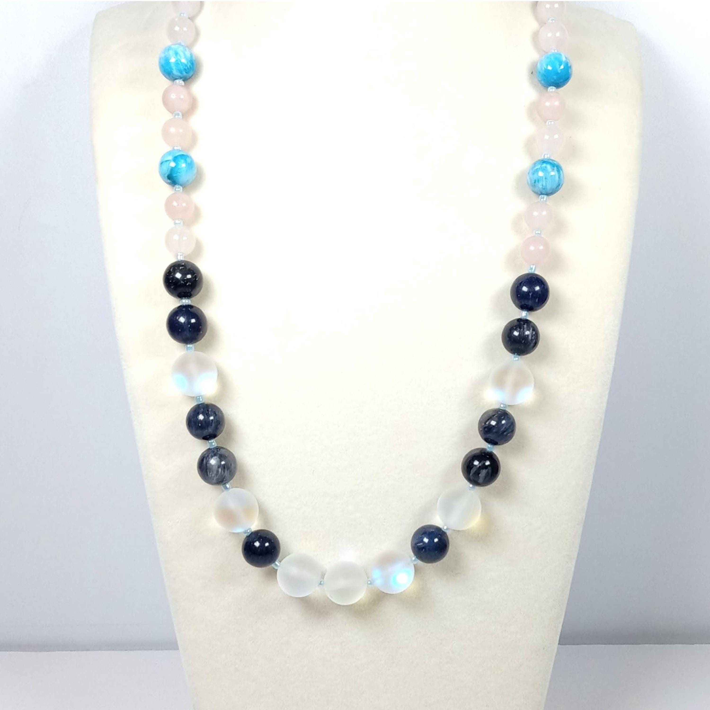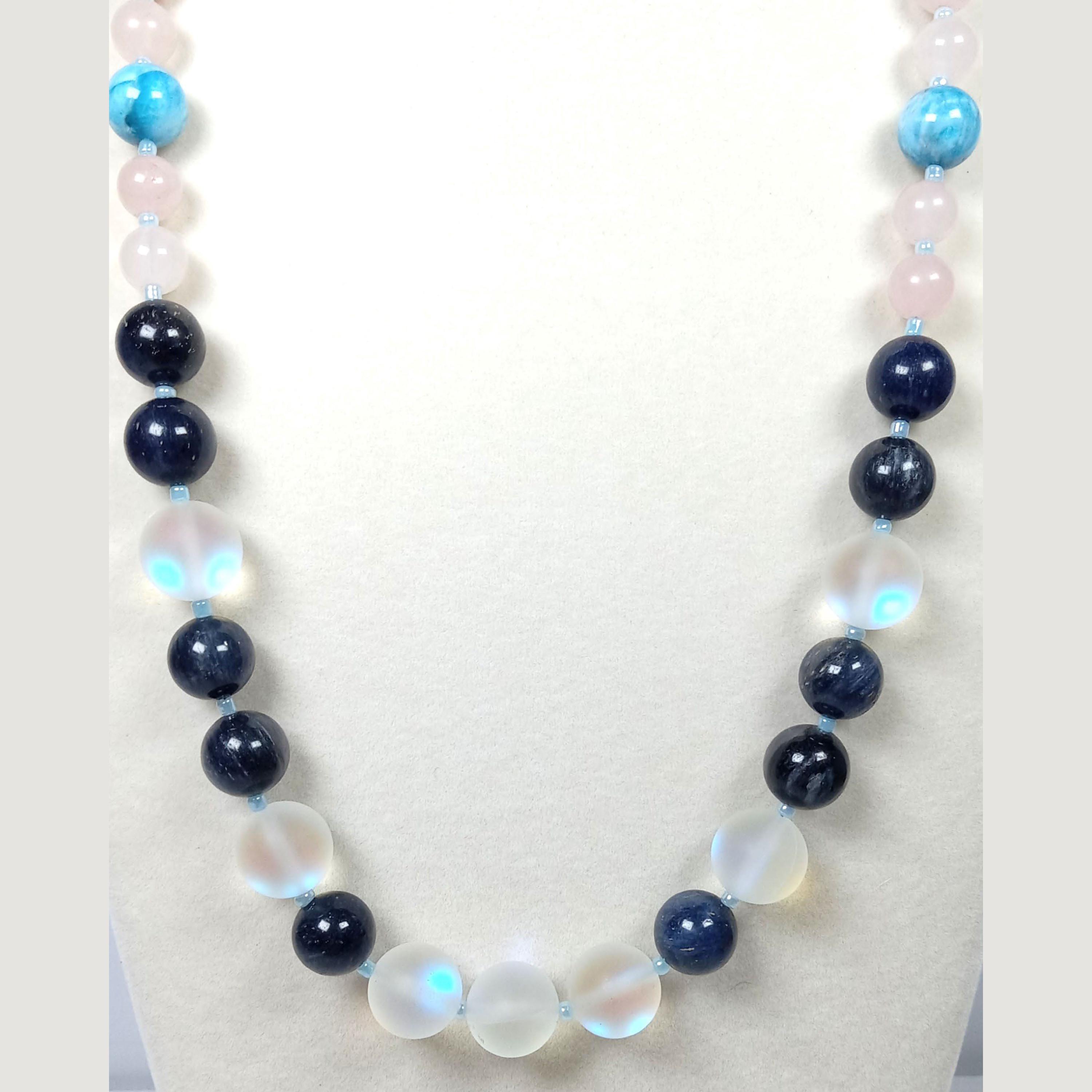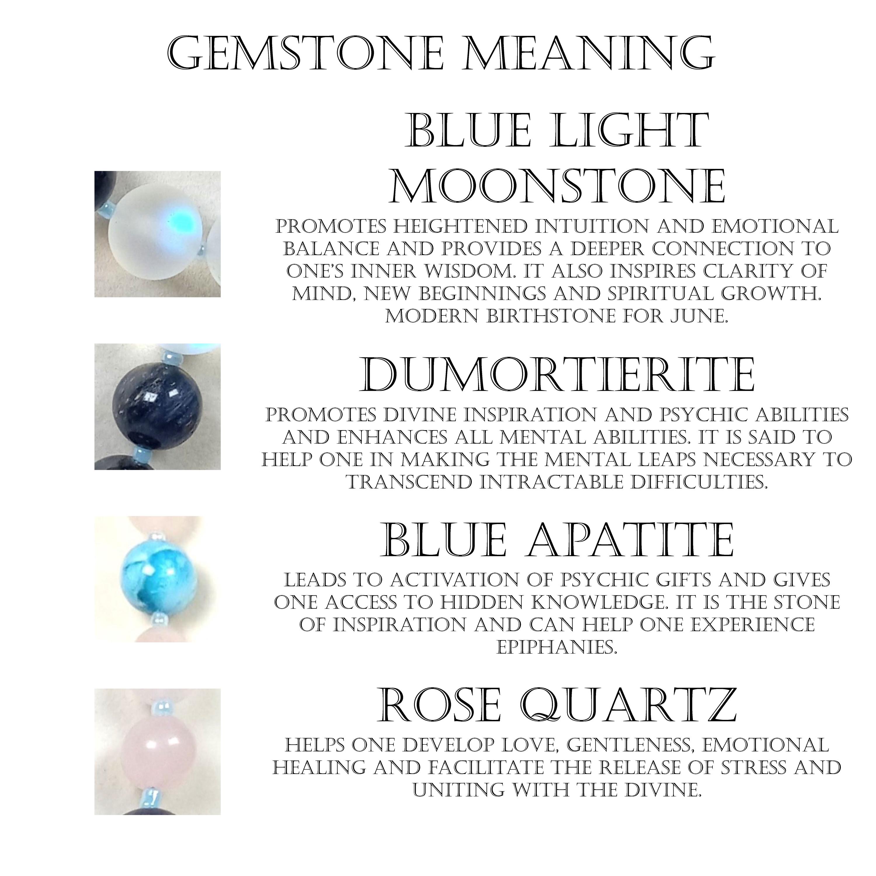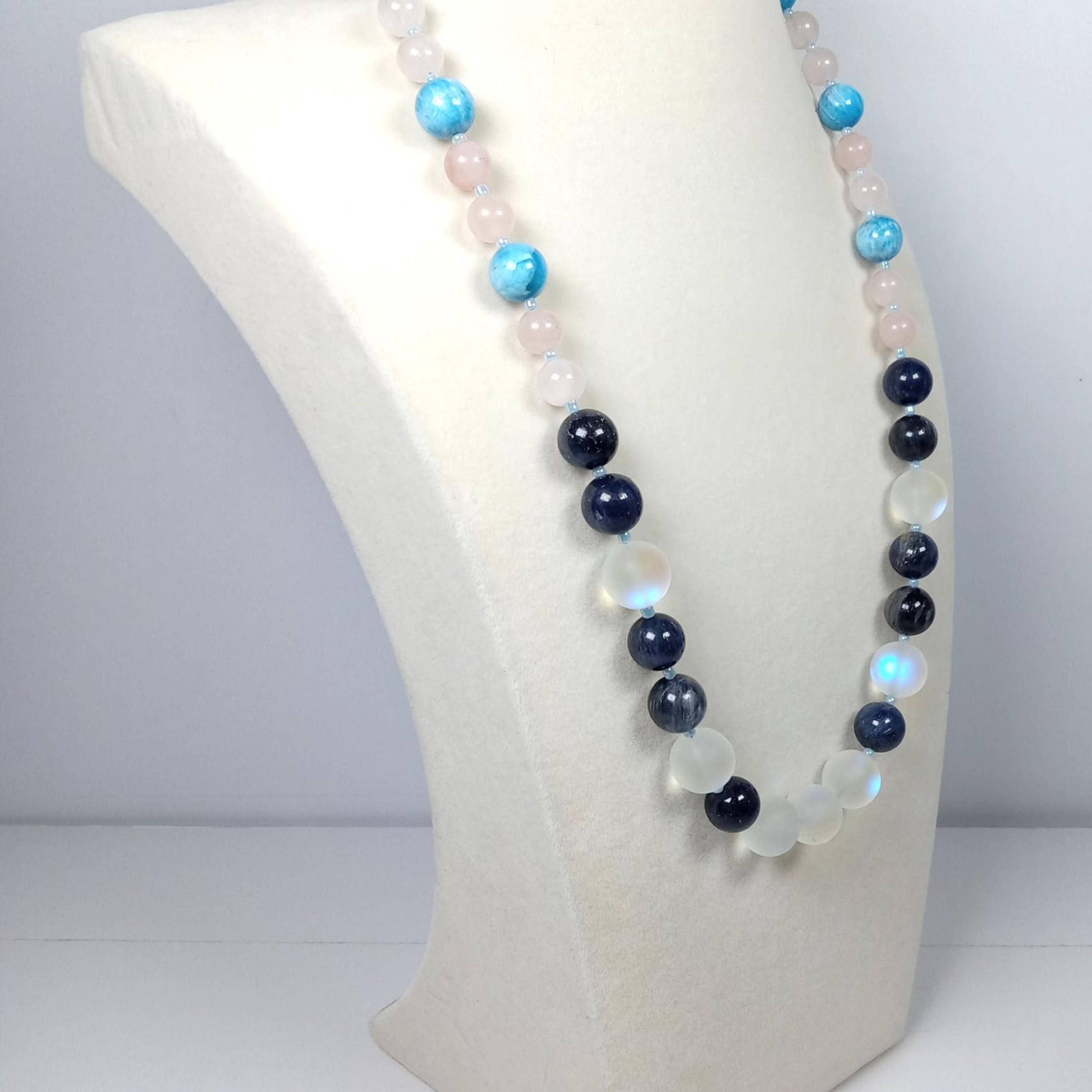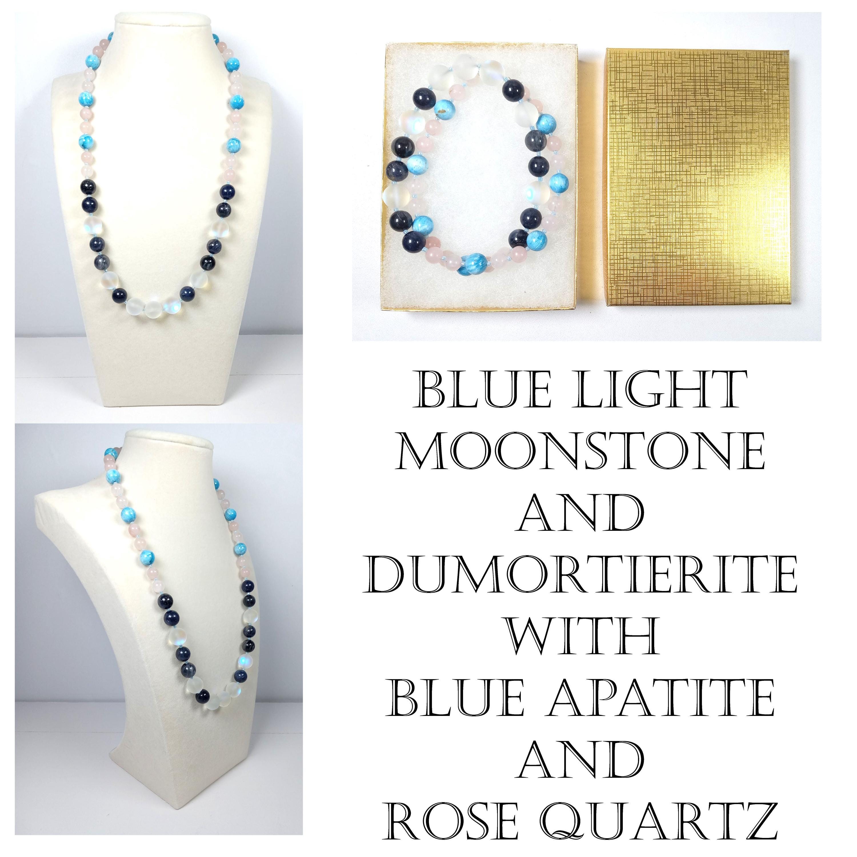 This one-of-a-kind Blue Light Moonstone and Dumortierite with Blue Apatite and Rose Quartz necklace is made with natural stones. One of the beads are birthstone for the month of June.