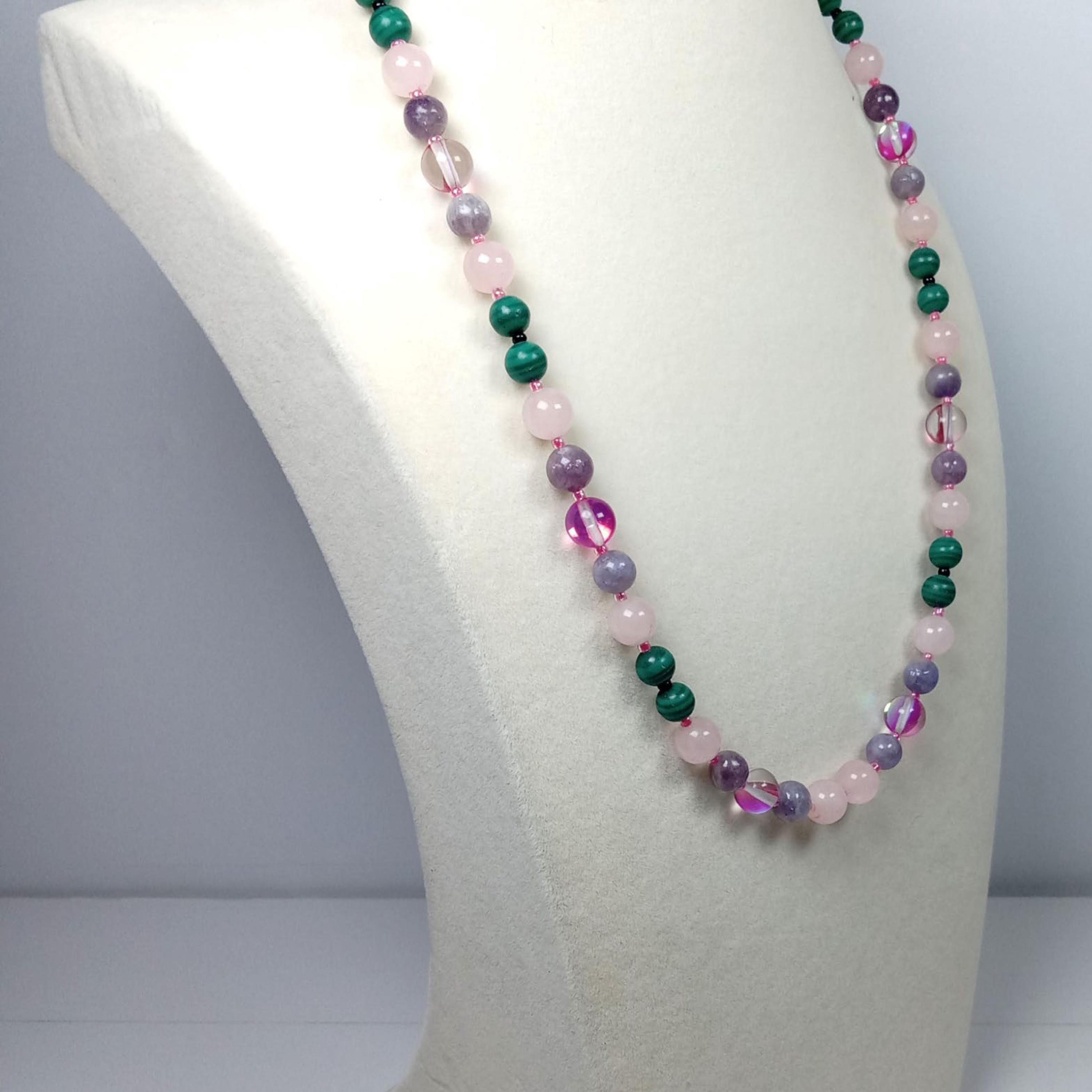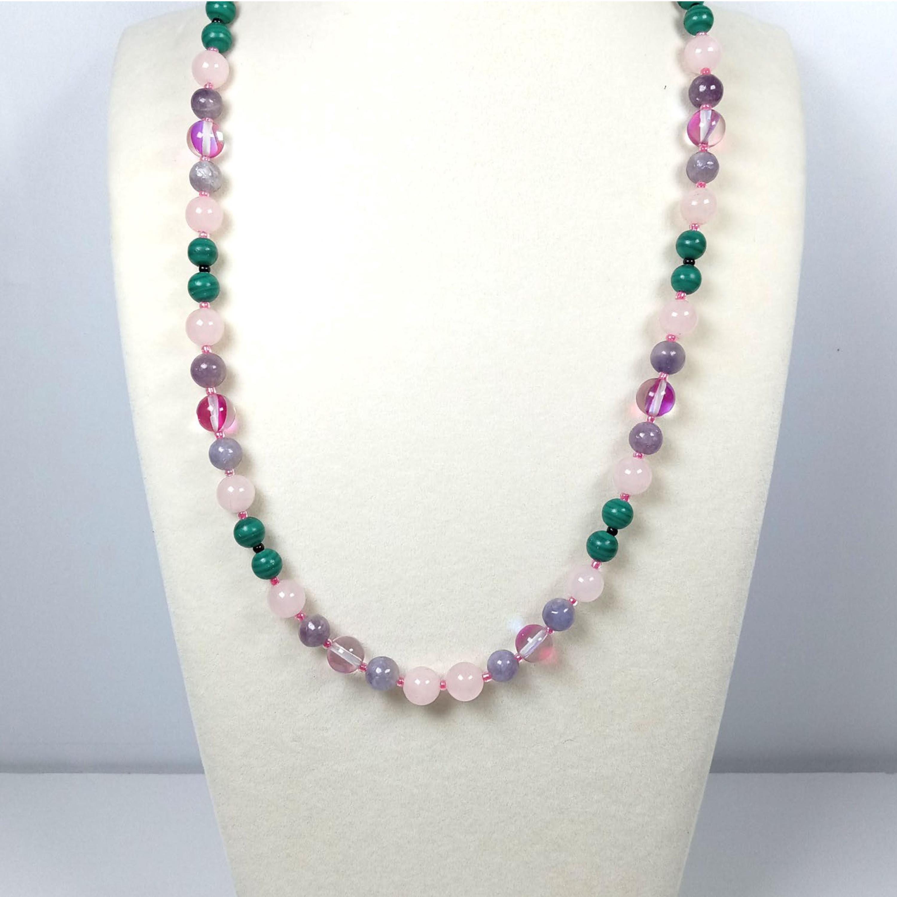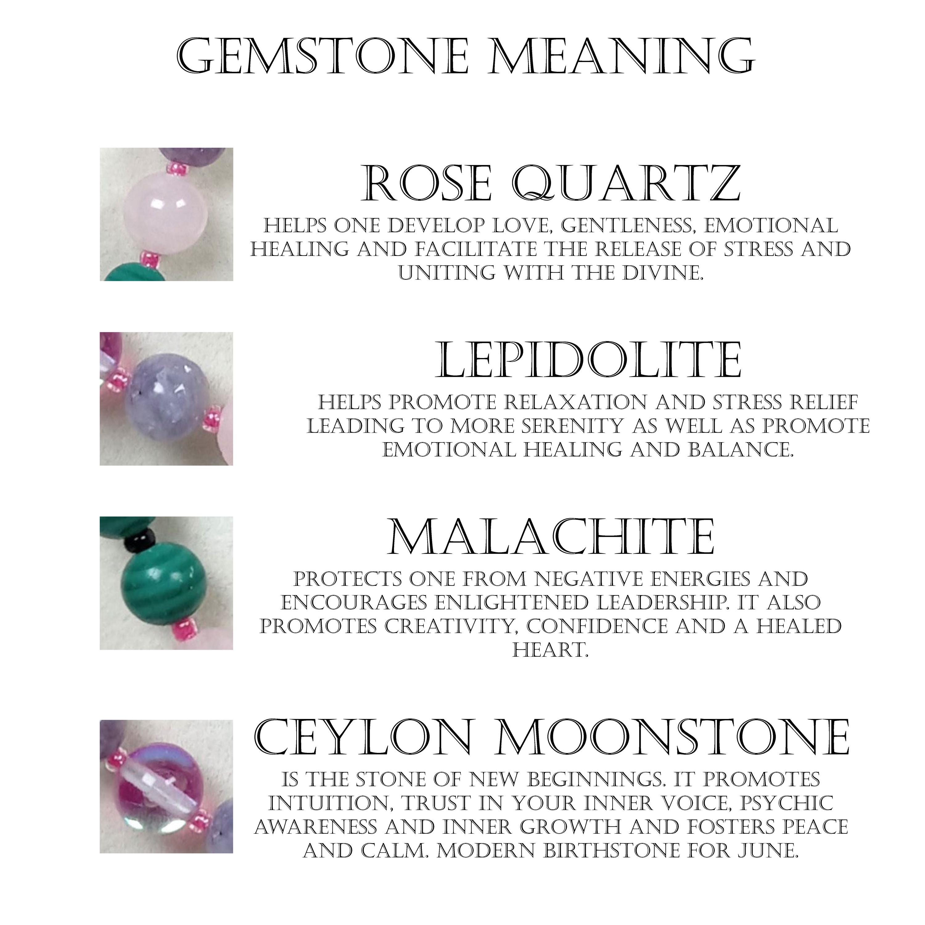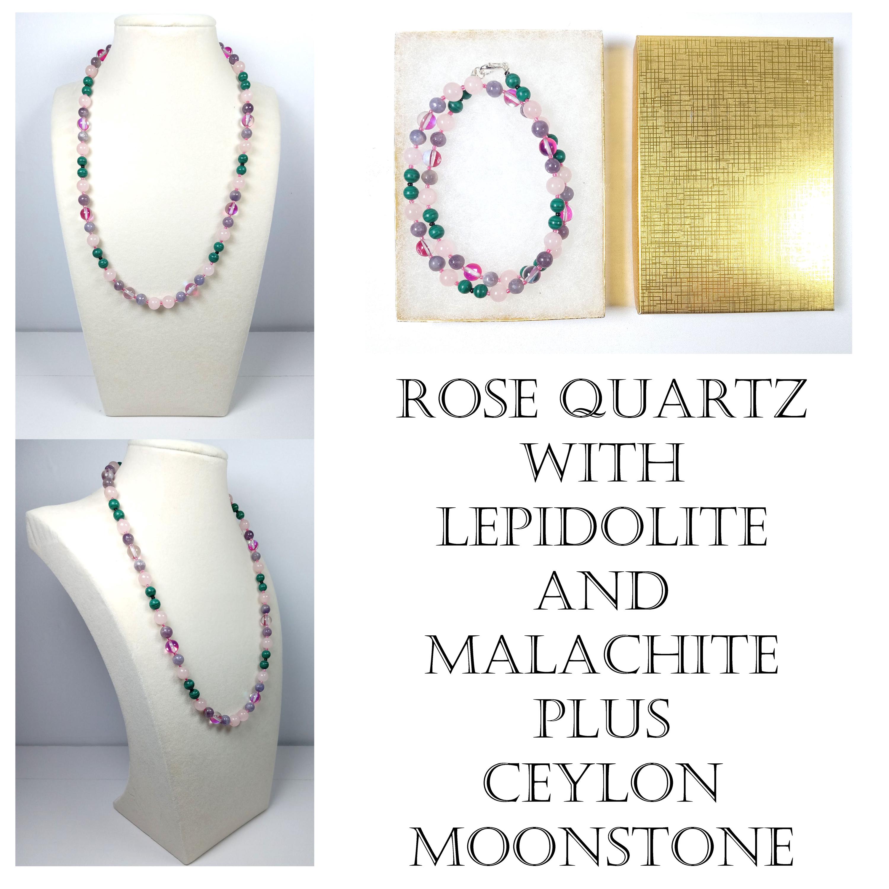 This one-of-a-kind Rose Quartz with Lepidolite and Malachite plus Ceylon Moonstone necklace is made with natural stones. One of the beads are birthstone for the month of June.