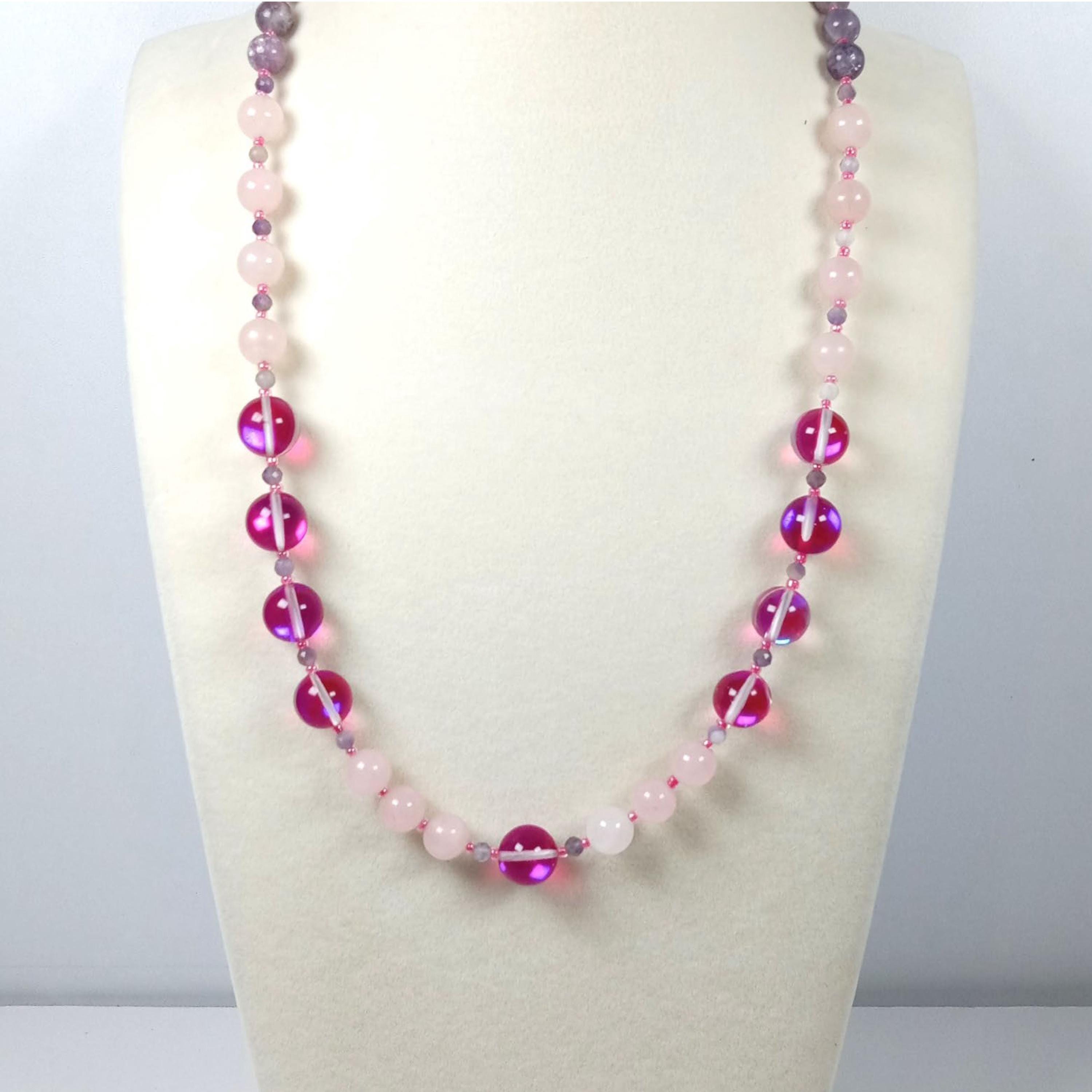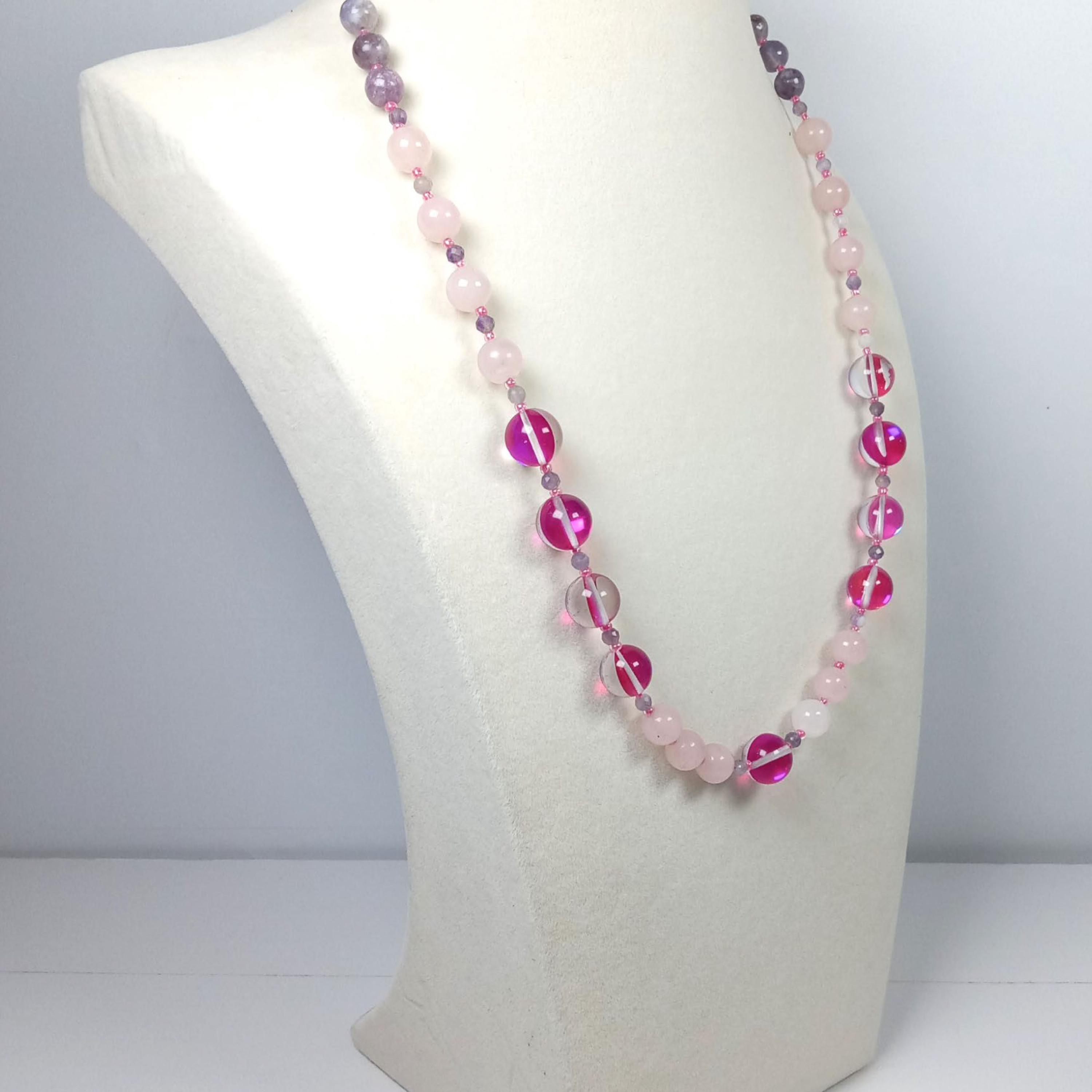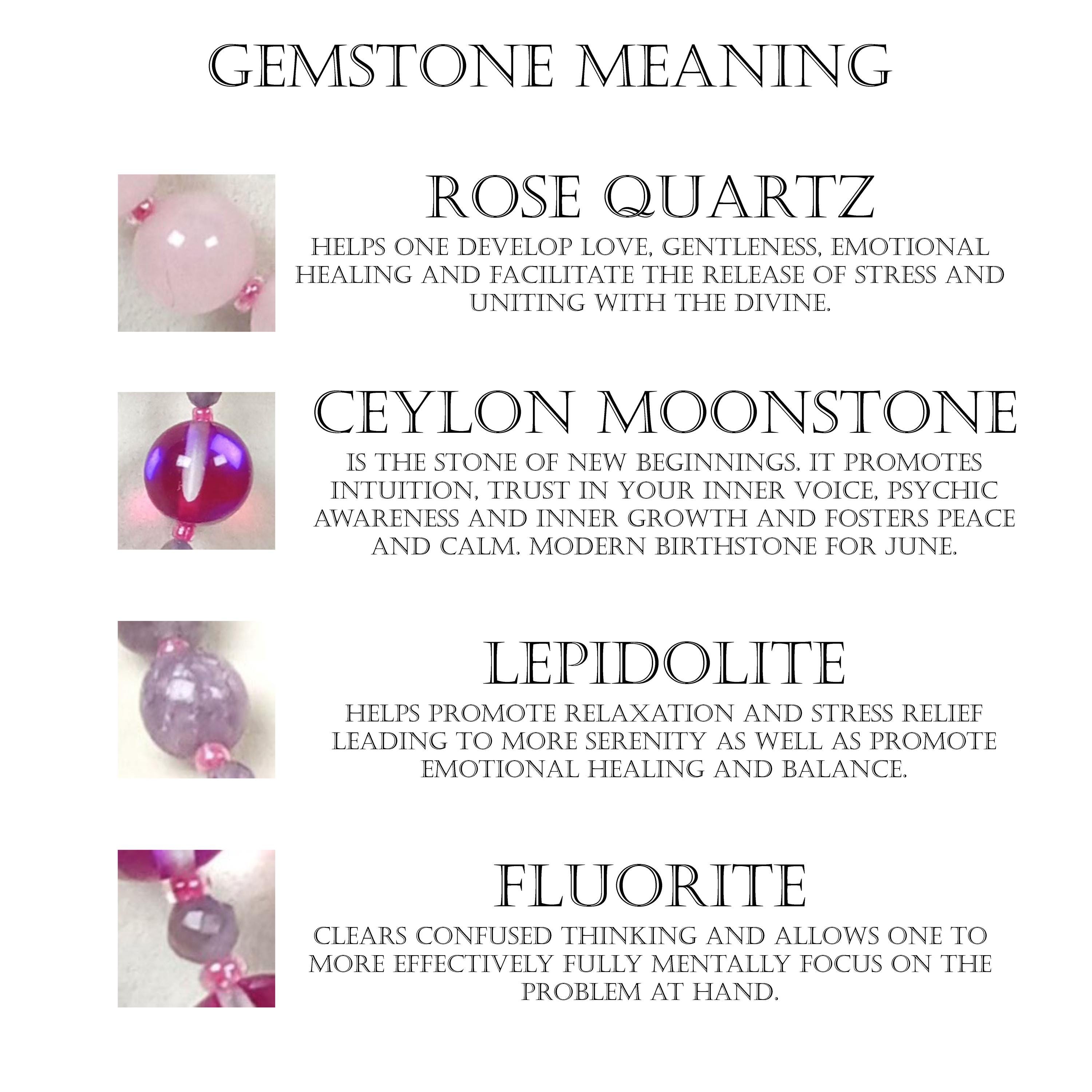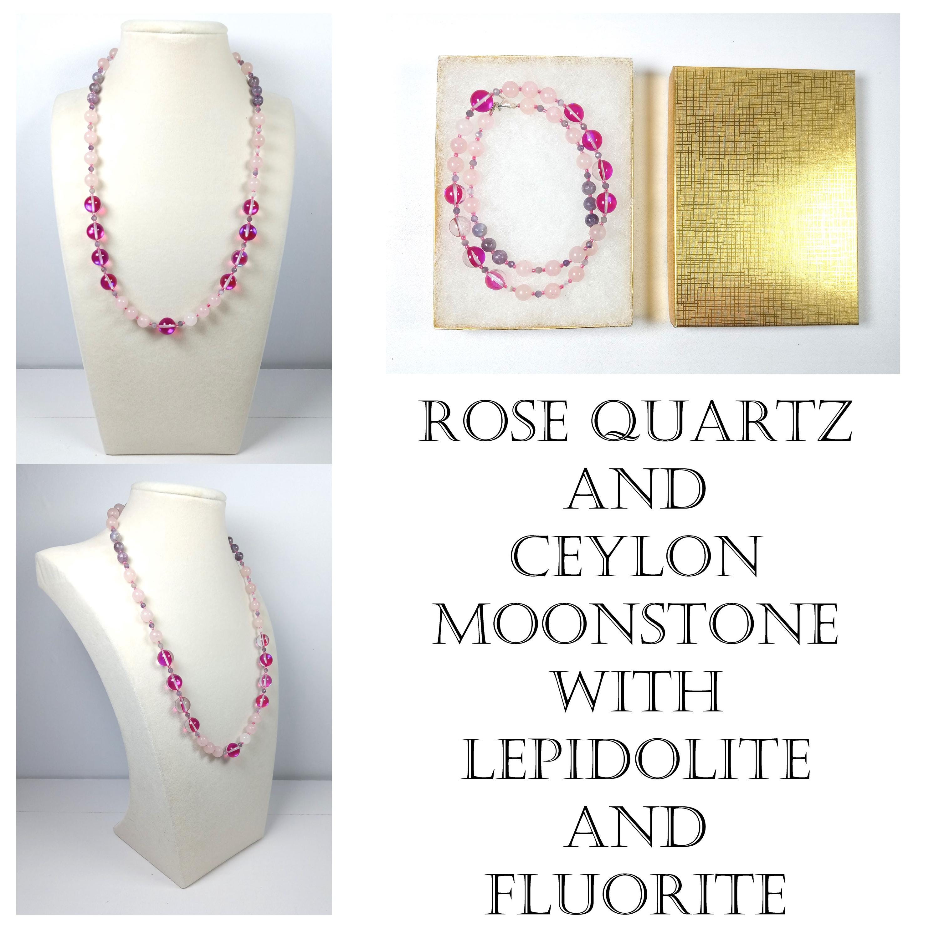 This one-of-a-kind Rose Quartz and Ceylon Moonstone with Lepidolite and Fluorite necklace is made with natural stones. One of the beads are birthstone for the month of June.