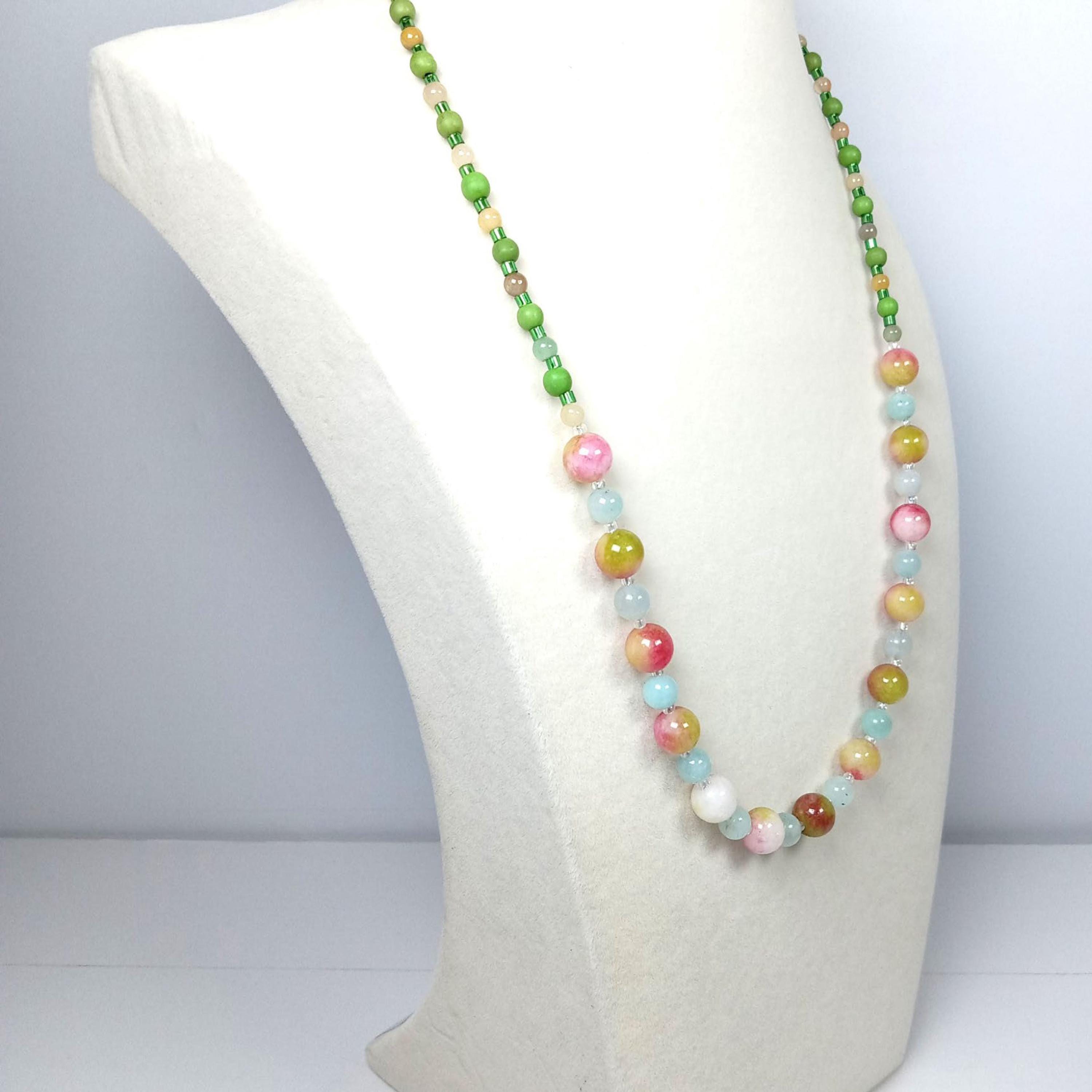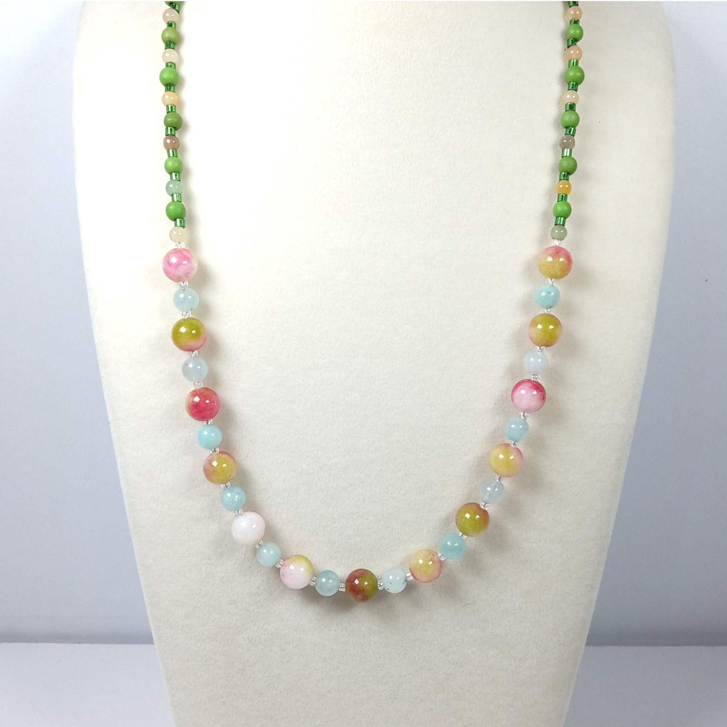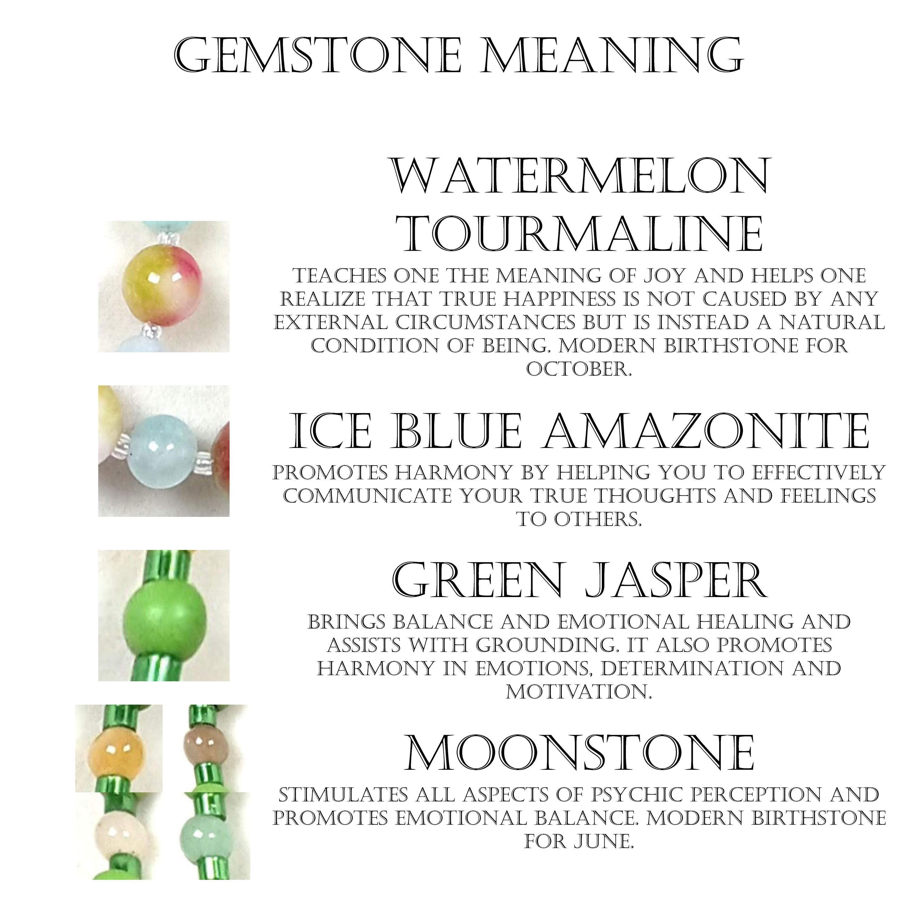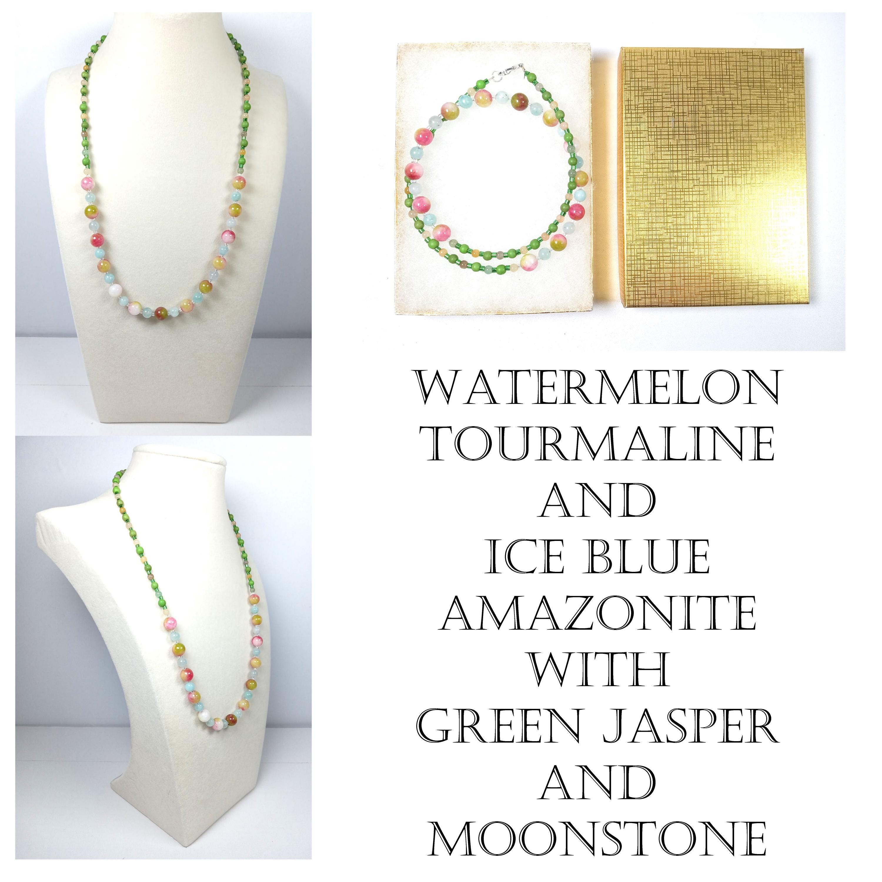 This one-of-a-kind Watermelon Tourmaline and Ice Blue Amazonite with Green Jasper and Moonstone necklace is made with natural stones. Two of the beads are birthstones for the months of June and October.