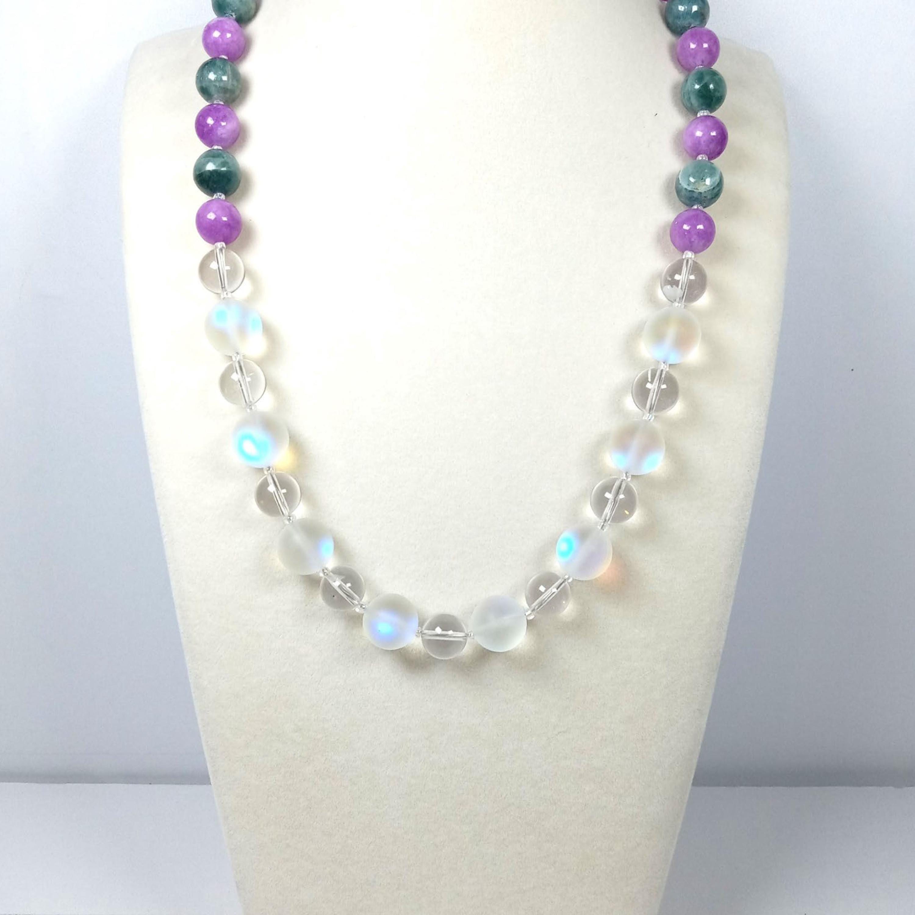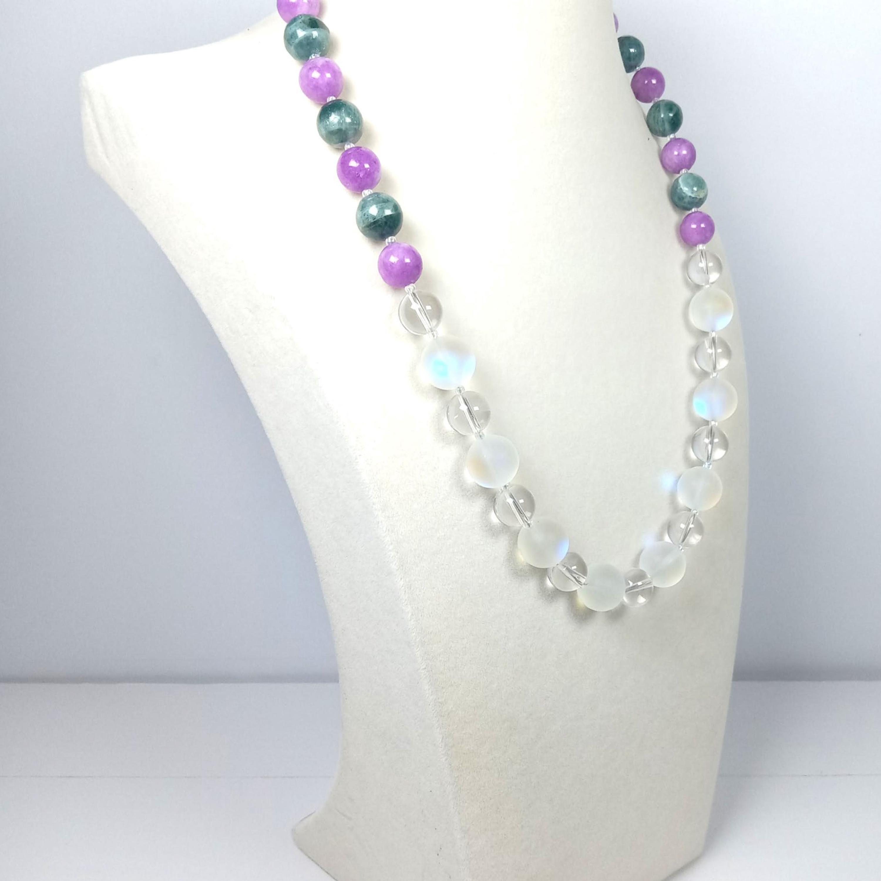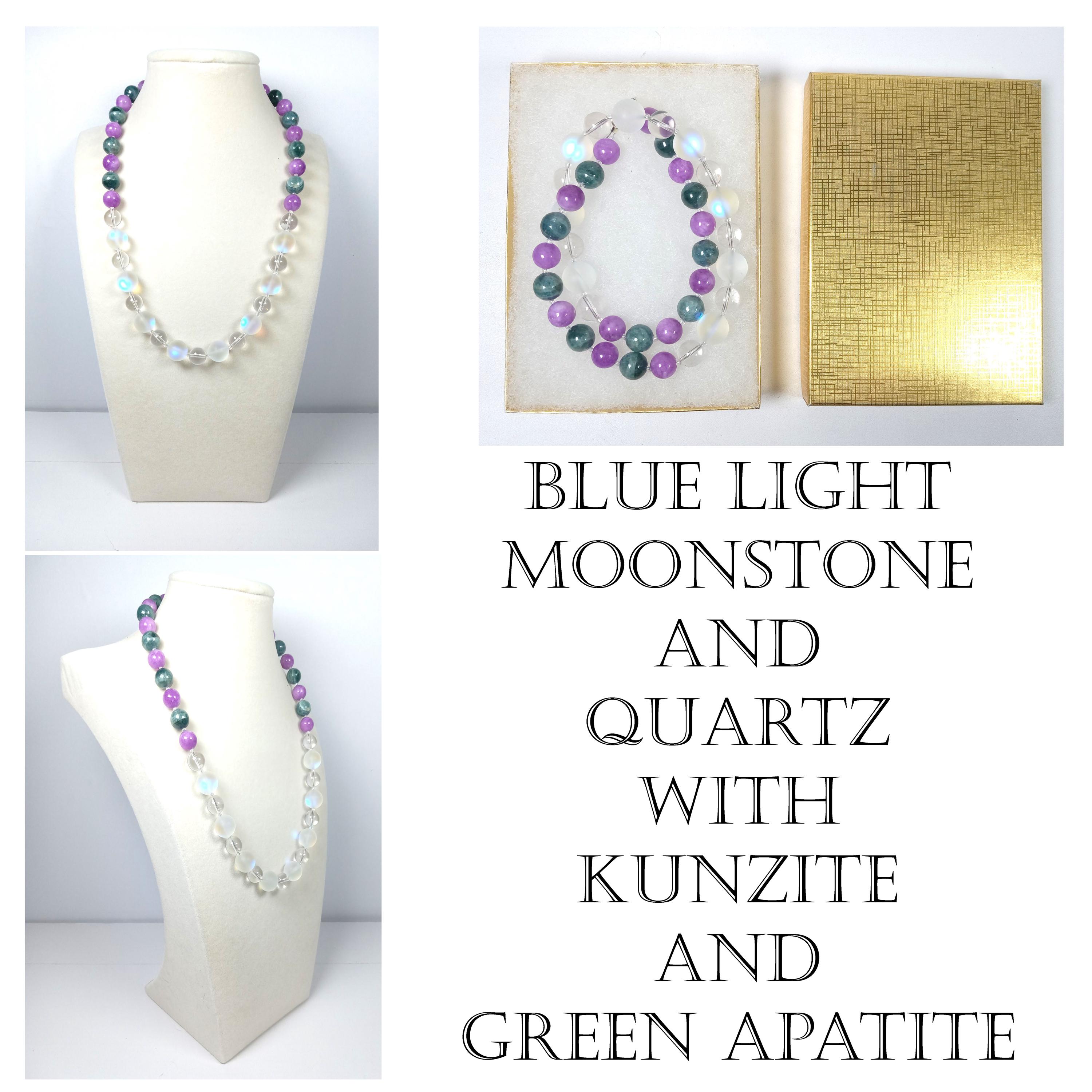 This one-of-a-kind Blue Light Moonstone and Quartz with Kunzite and Green Apatite is a necklace made with natural stones. One of the beads are birthstone for the month of June.