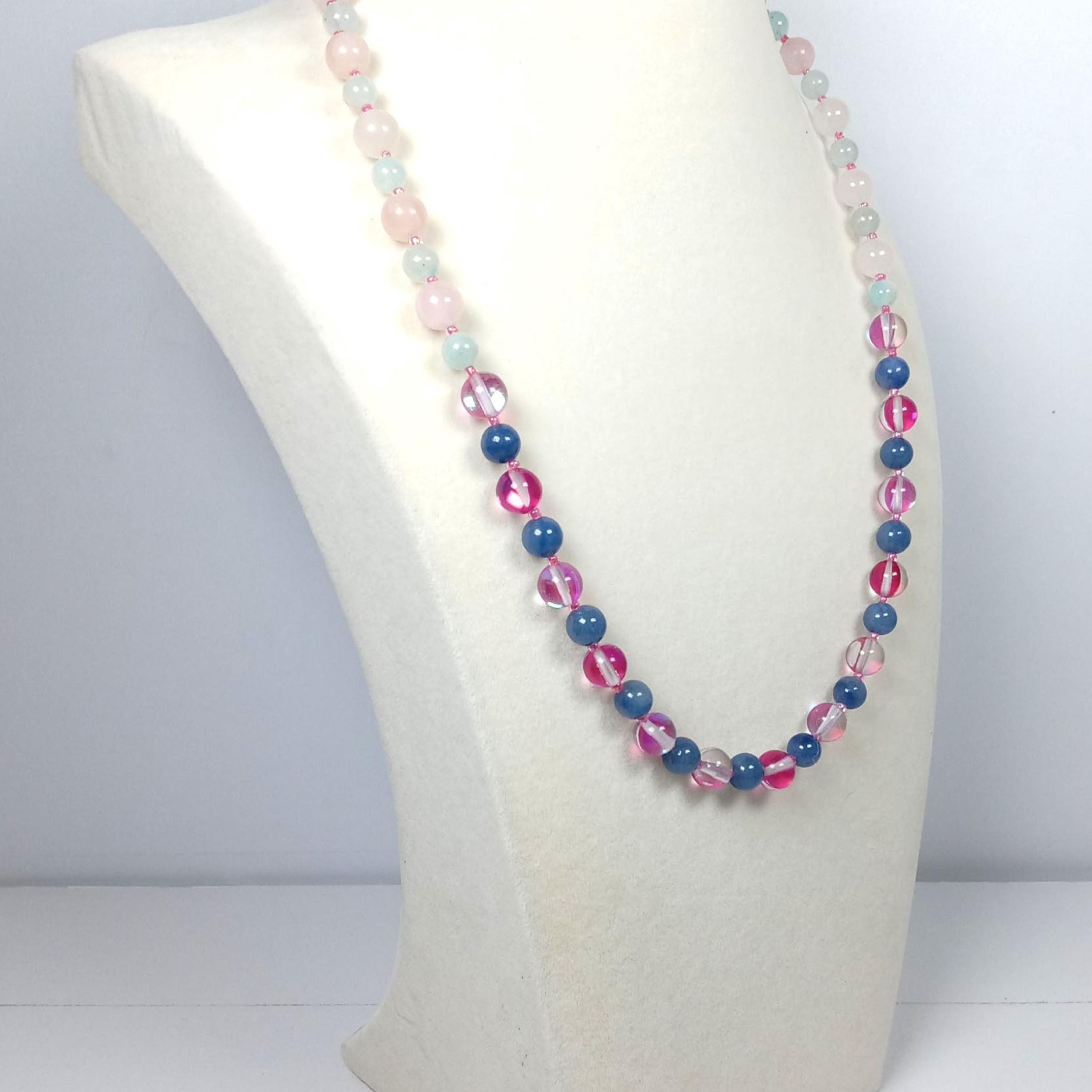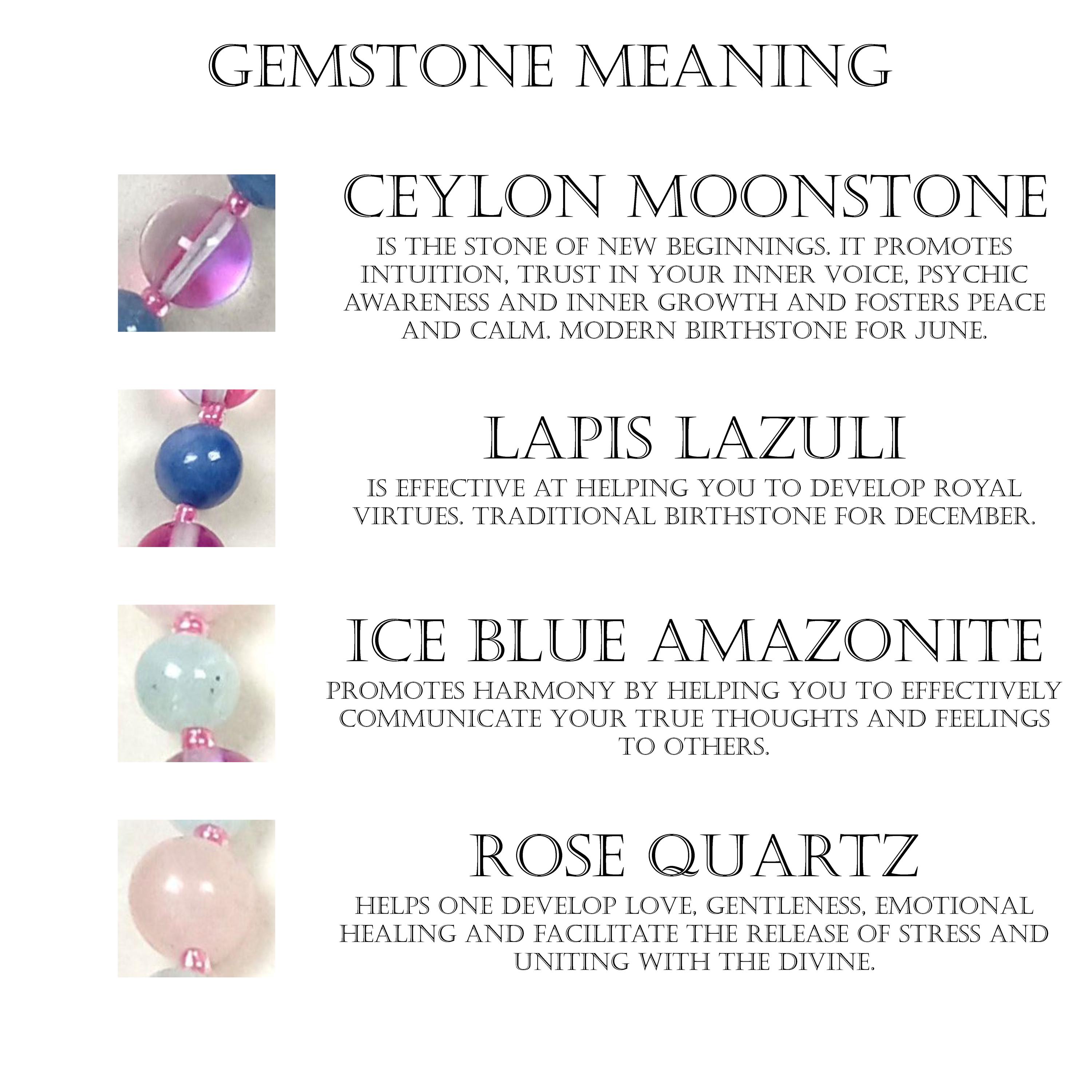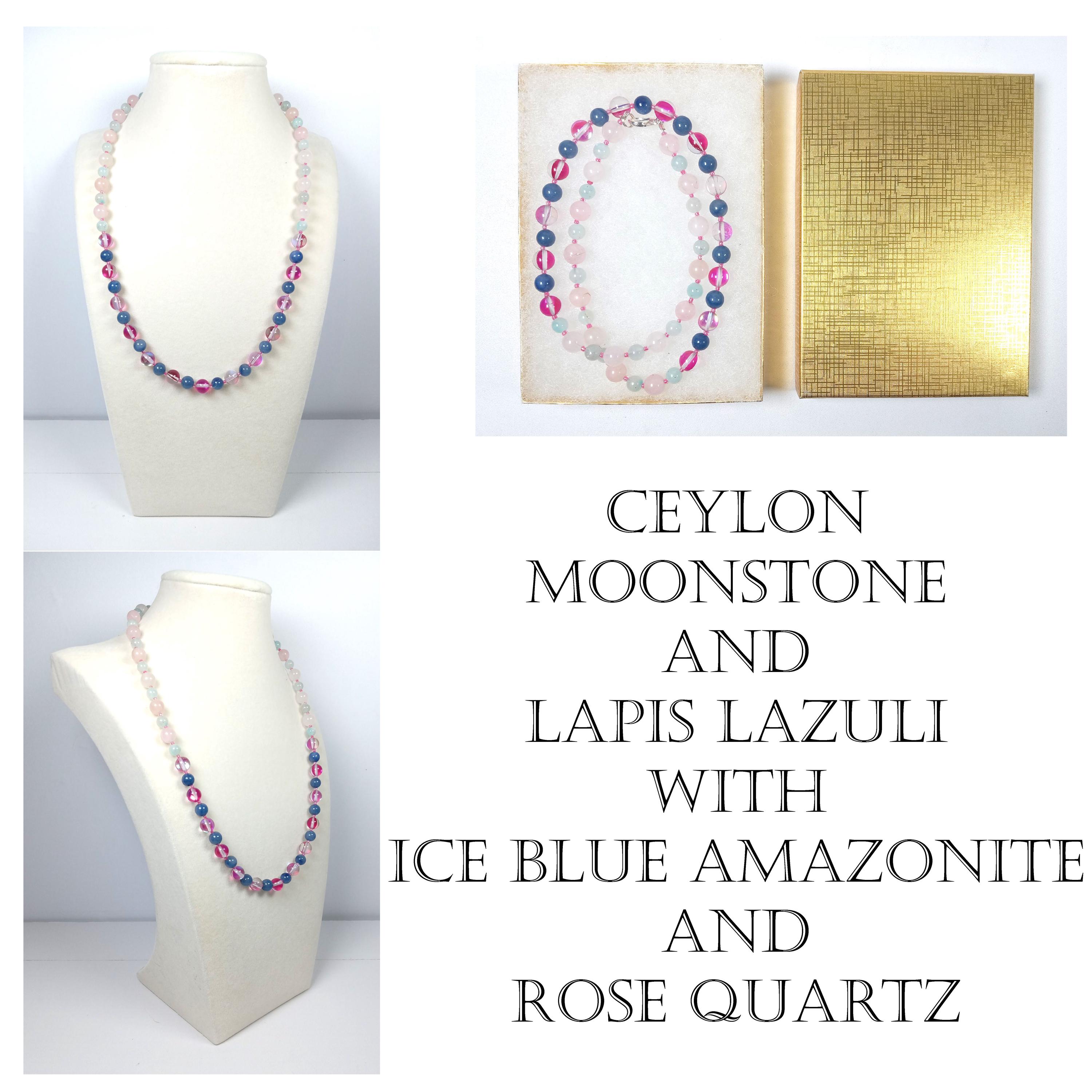 This one-of-a-kind Ceylon Moonstone and Lapis Lazuli with Ice Blue Amazonite and Rose Quartz is a necklace made with natural stones. Two of the beads are birthstones for the months of June and December.