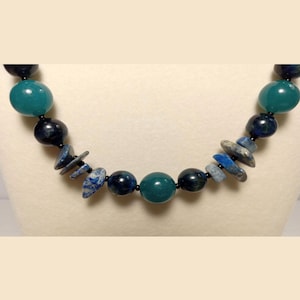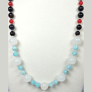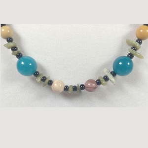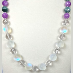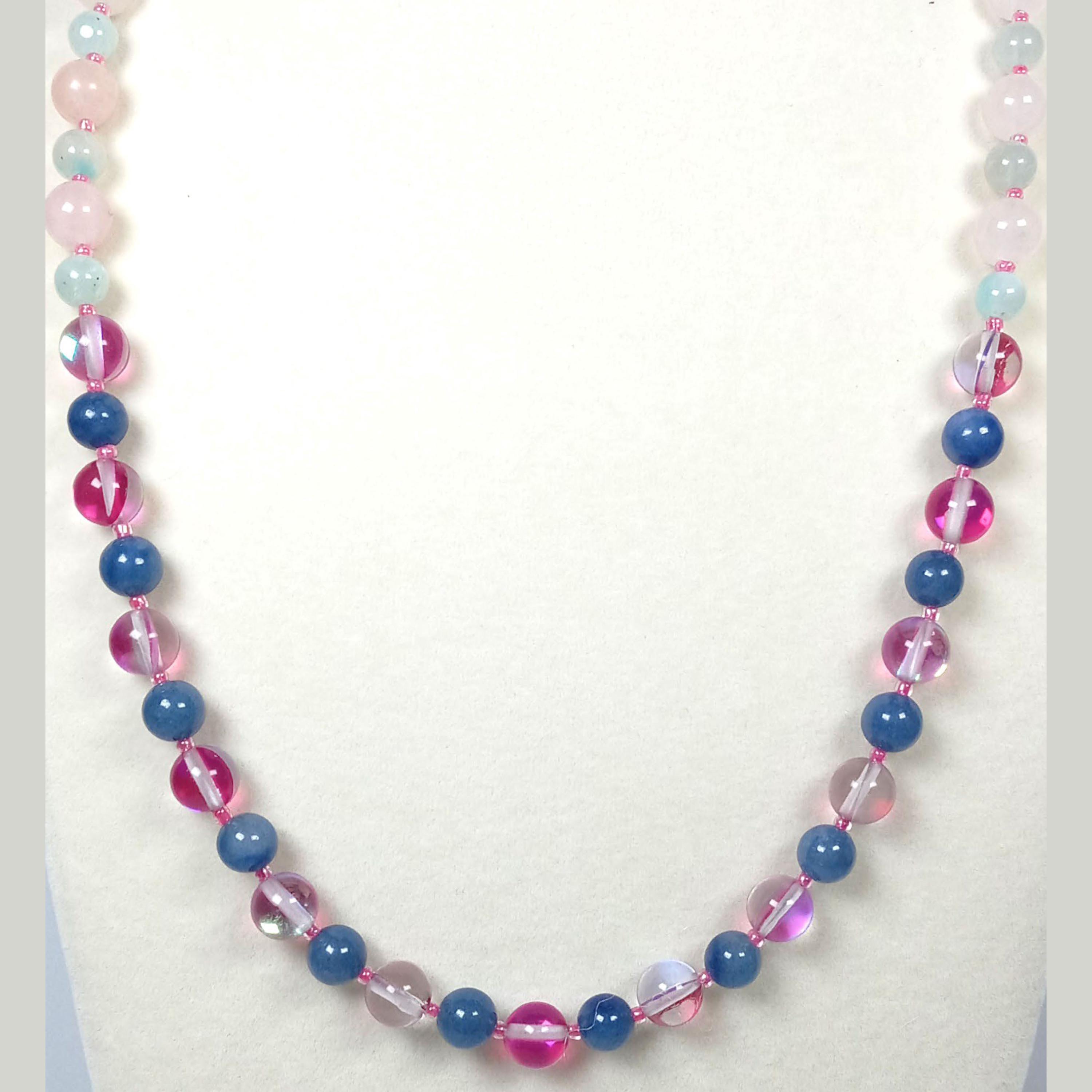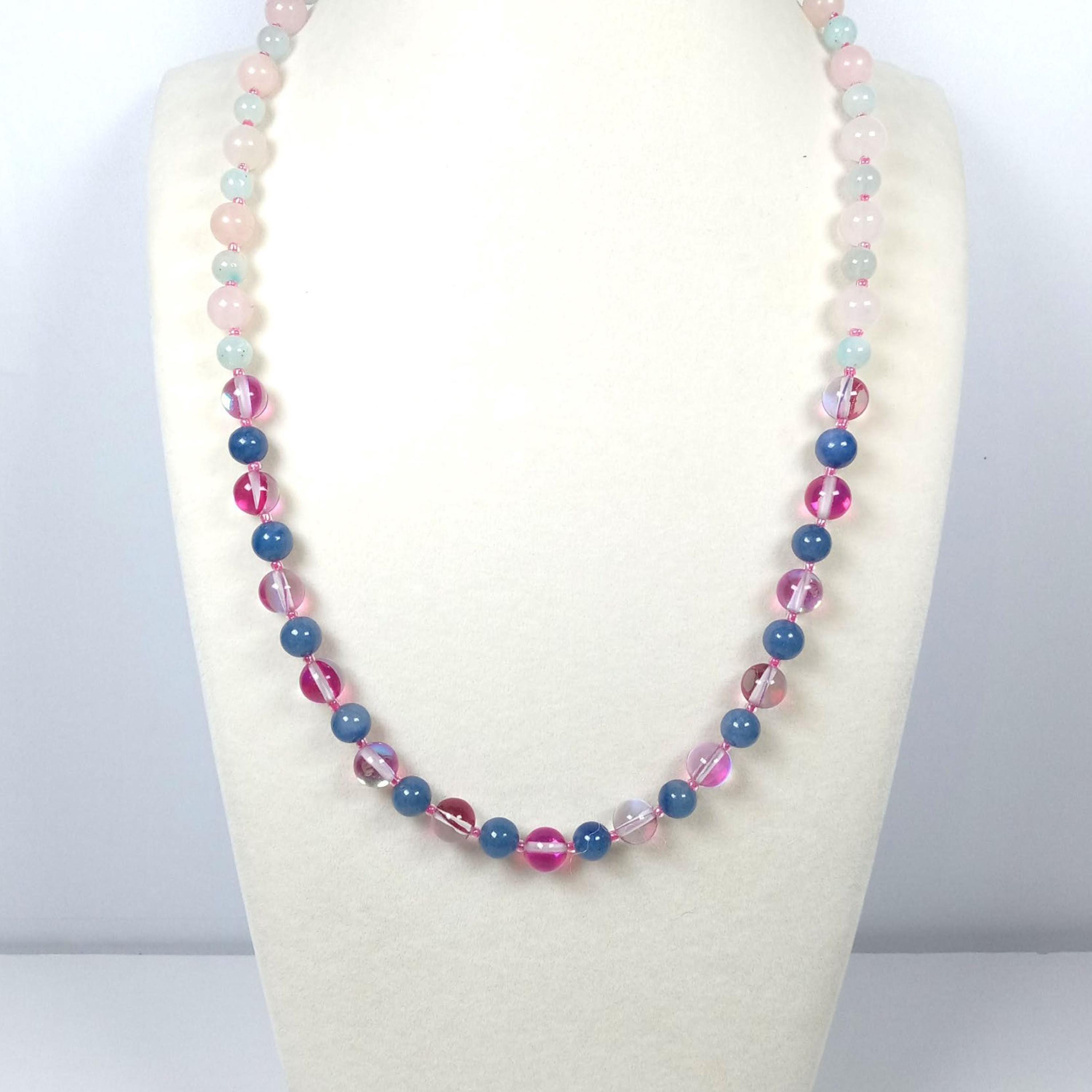 This one-of-a-kind Ceylon Moonstone and Lapis Lazuli with Ice Blue Amazonite and Rose Quartz is a necklace made with natural stones. Two of the beads are birthstones for the months of June and December.