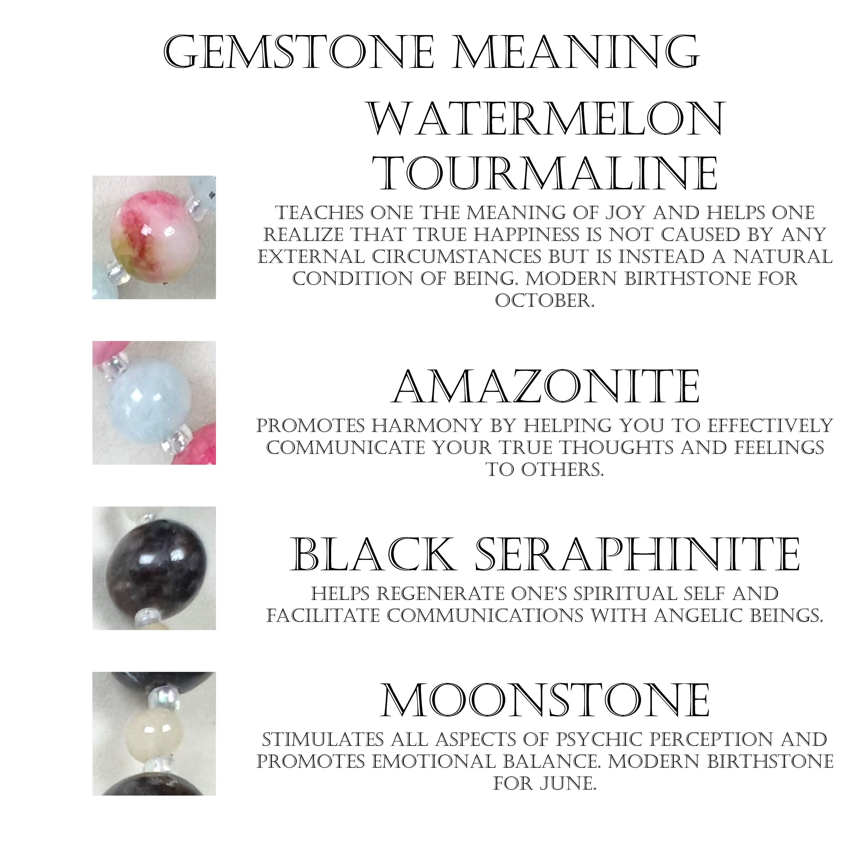 This one-of-a-kind Watermelon Tourmaline and Ice Blue Amazonite with Black Seraphinite and Moonstone is a necklace made with natural stones. Two of the beads are birthstones for the months of June and October.