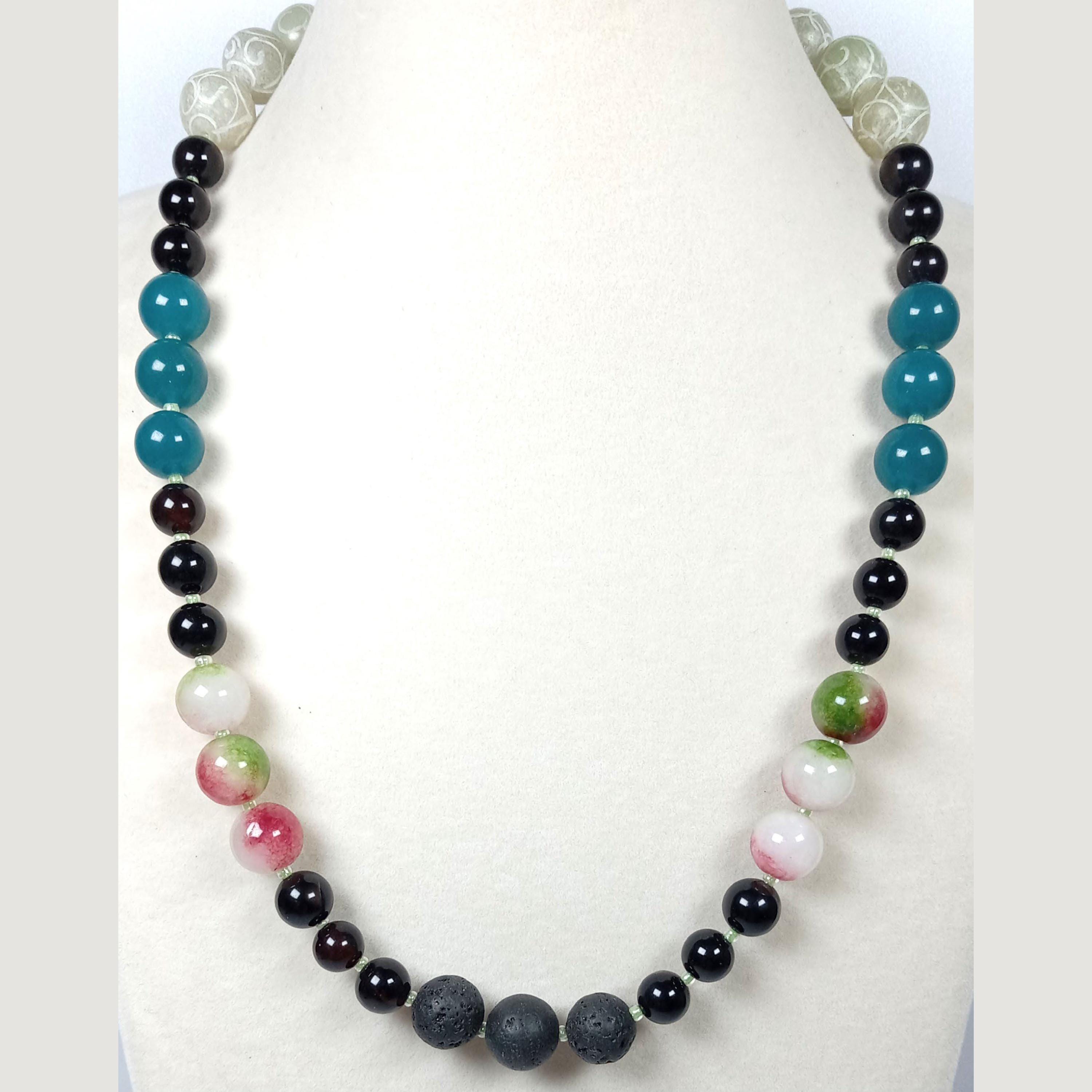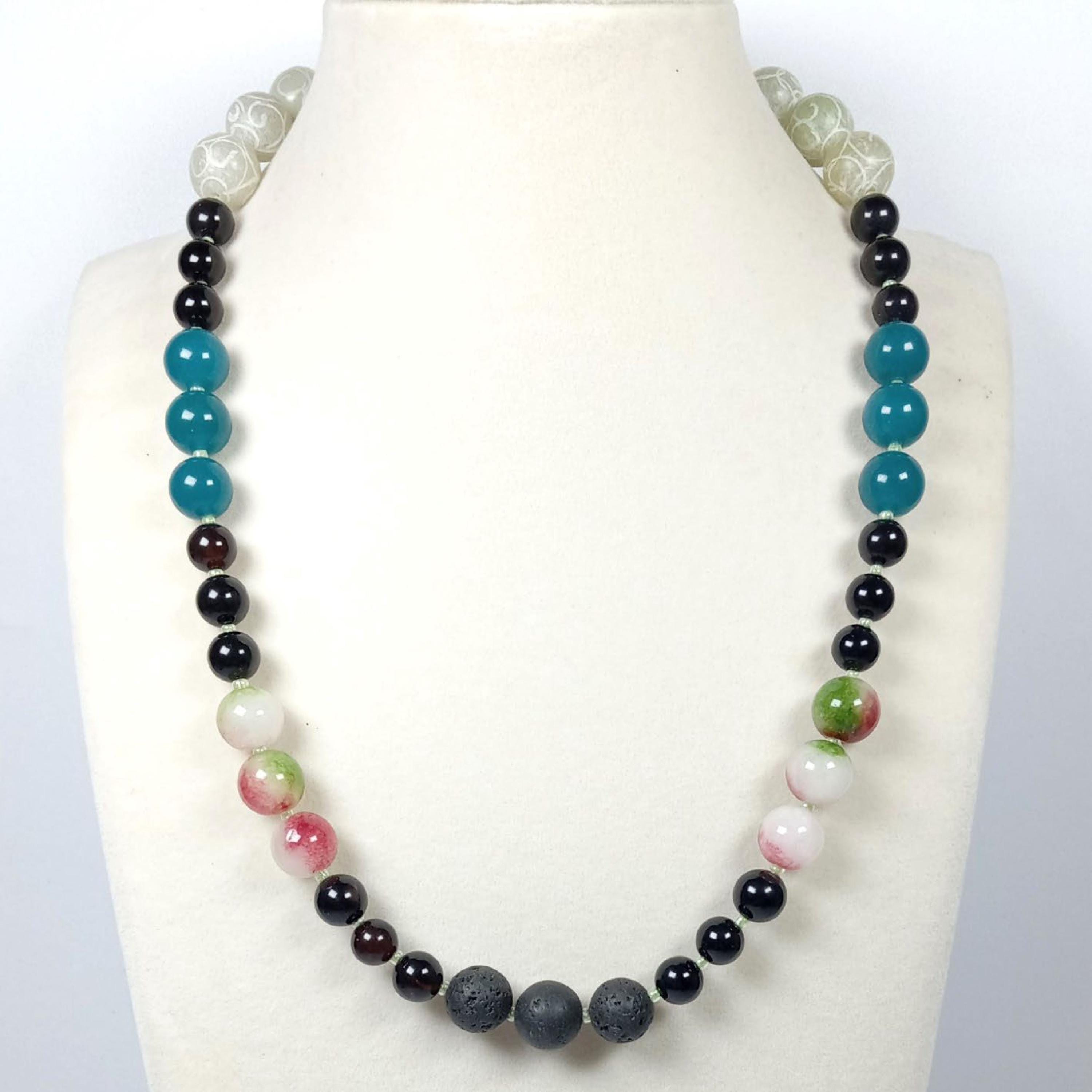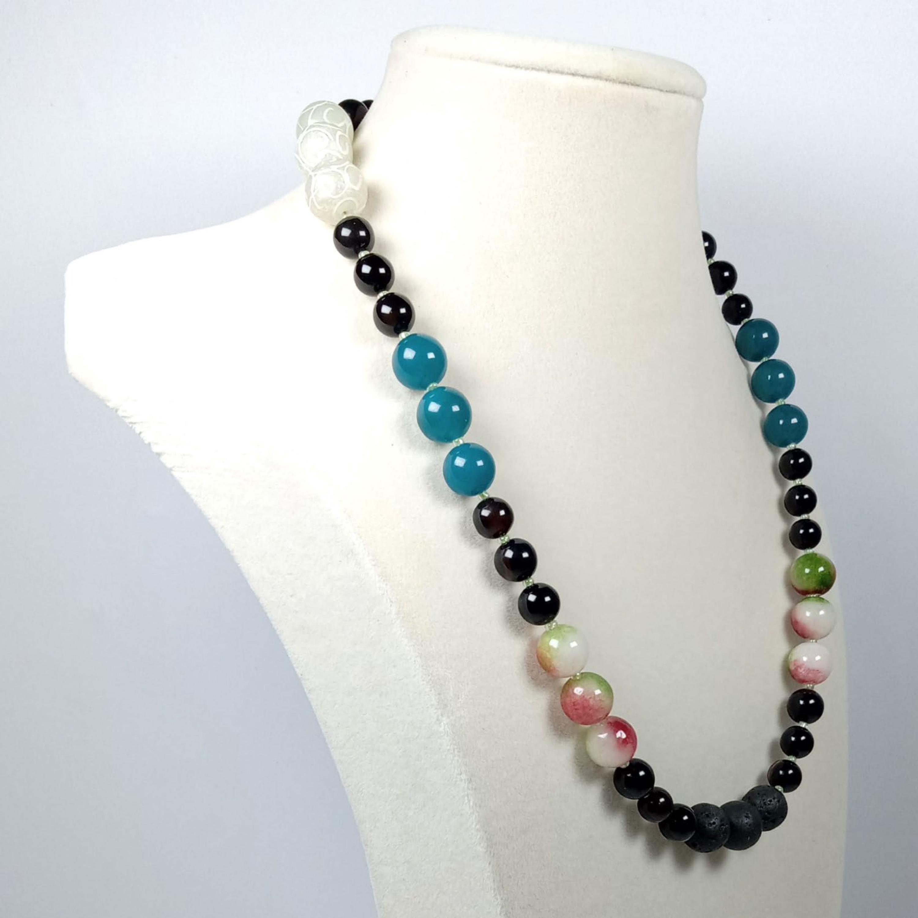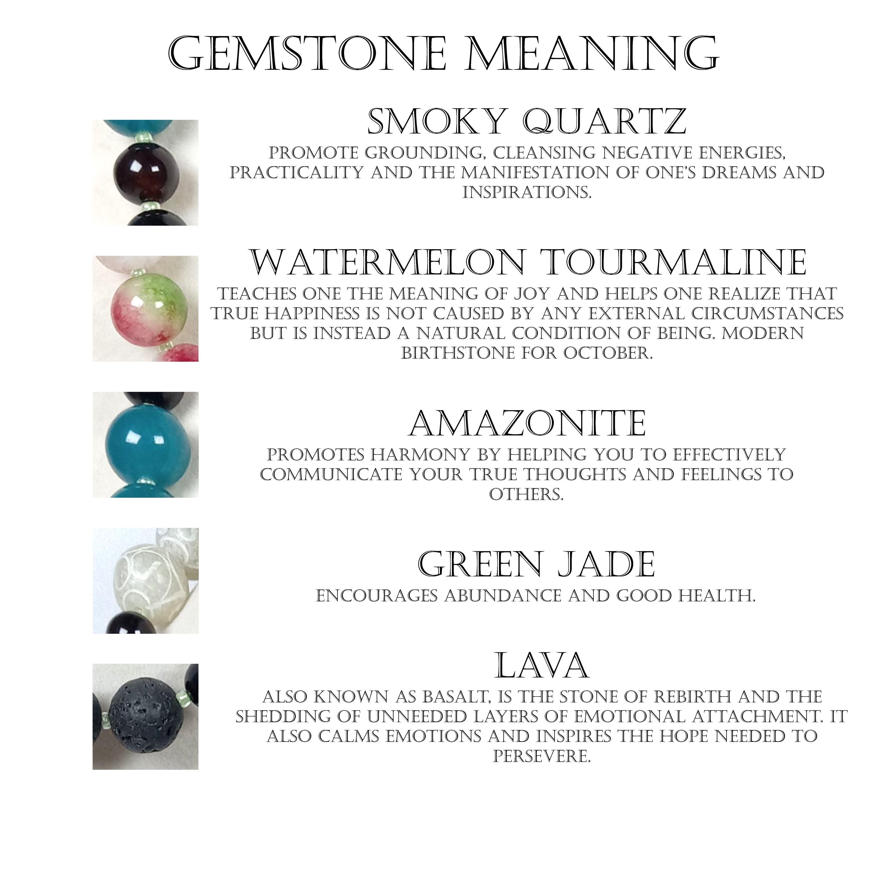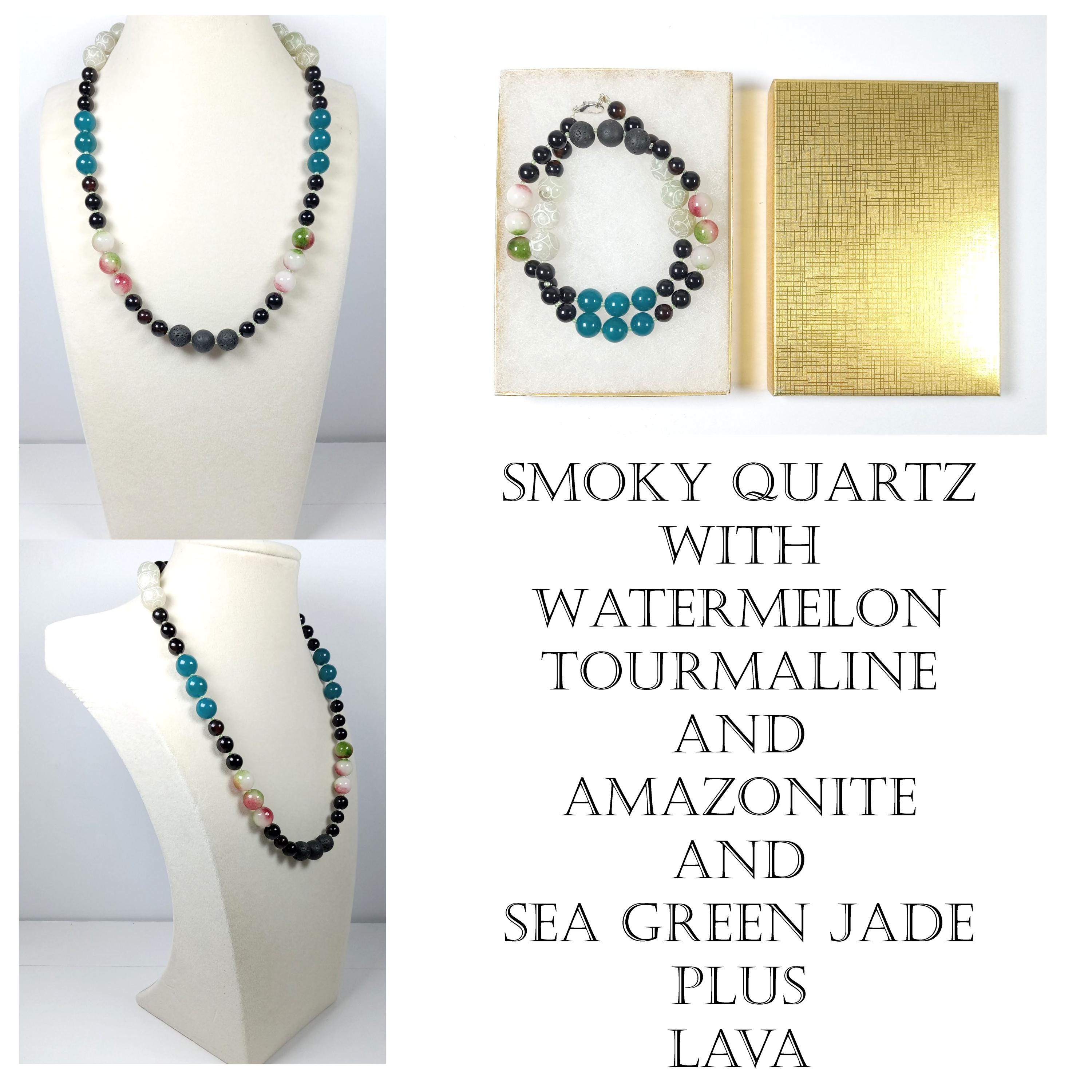This one-of-a-kind Smoky Quartz with Watermelon Tourmaline and Amazonite and Carved Sea Green Jade plus Lava is a necklace made with natural stones. One of the beads are birthstone for the month of October.