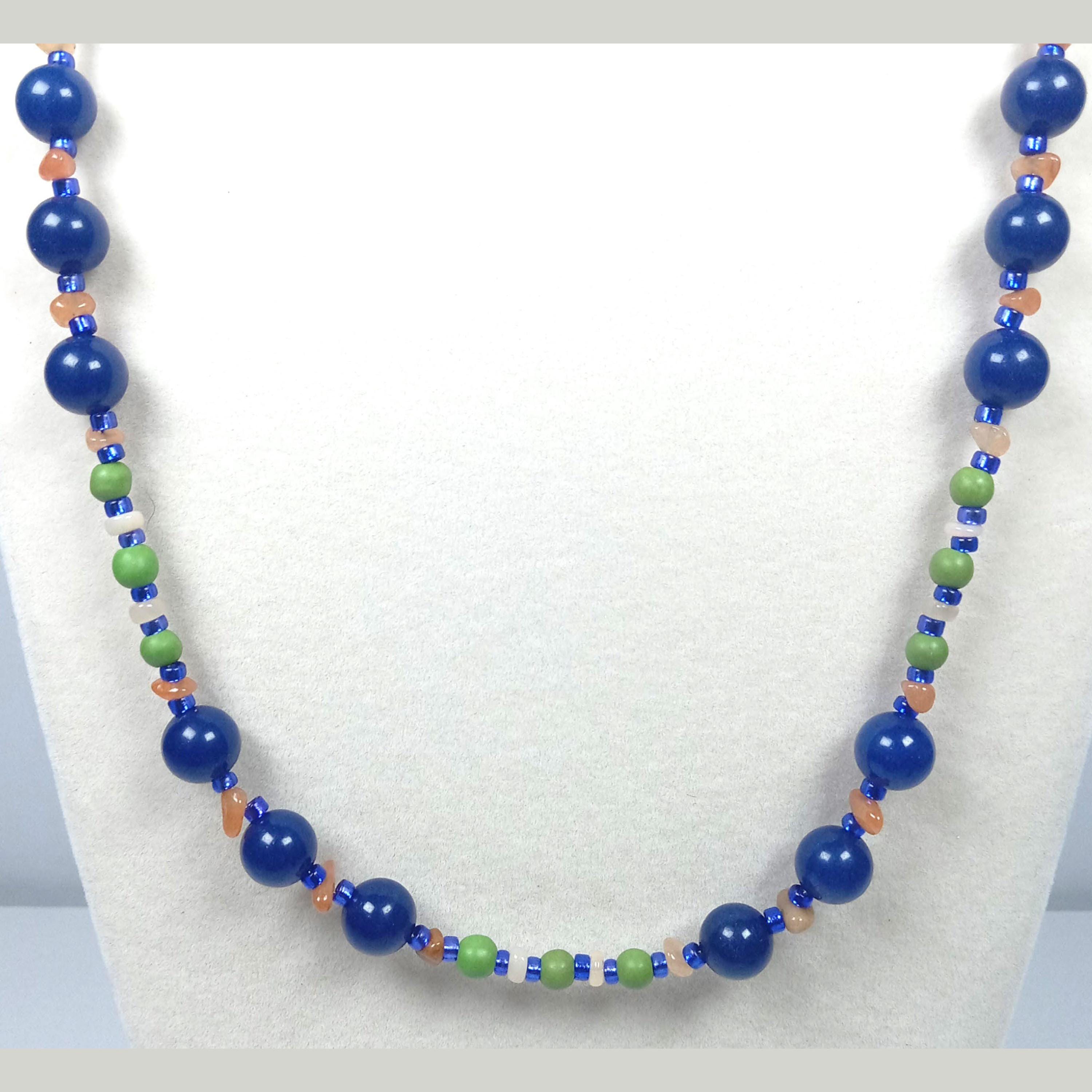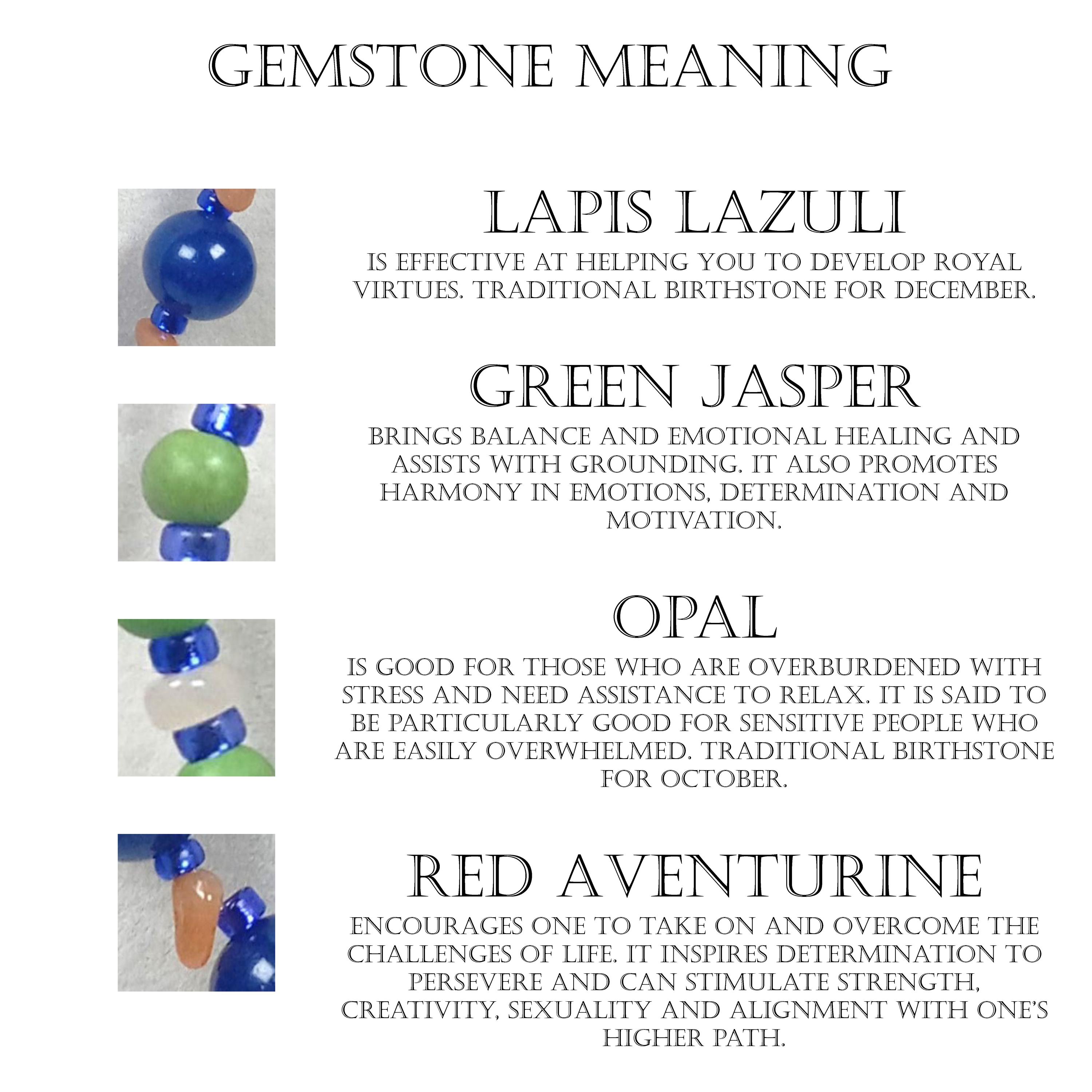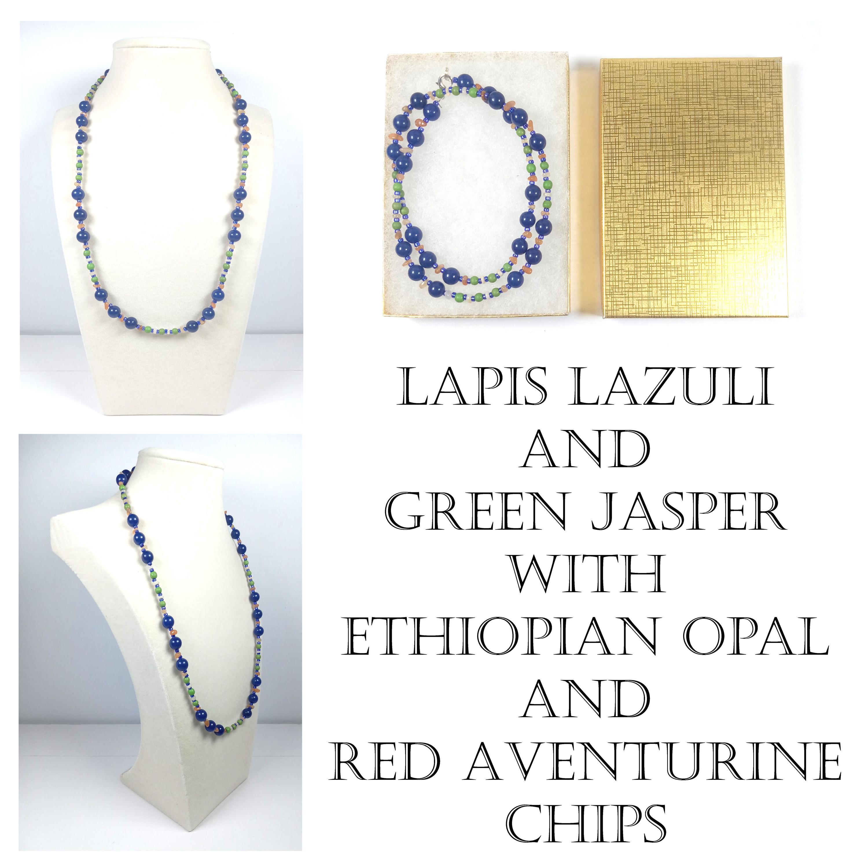 This one-of-a-kind Lapis Lazuli and Green Jasper with Ethiopian Opal and Red Aventurine Chips is a necklace made with natural stones. Two of the beads are birthstones for the months of October and December.