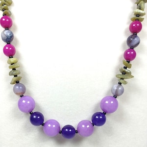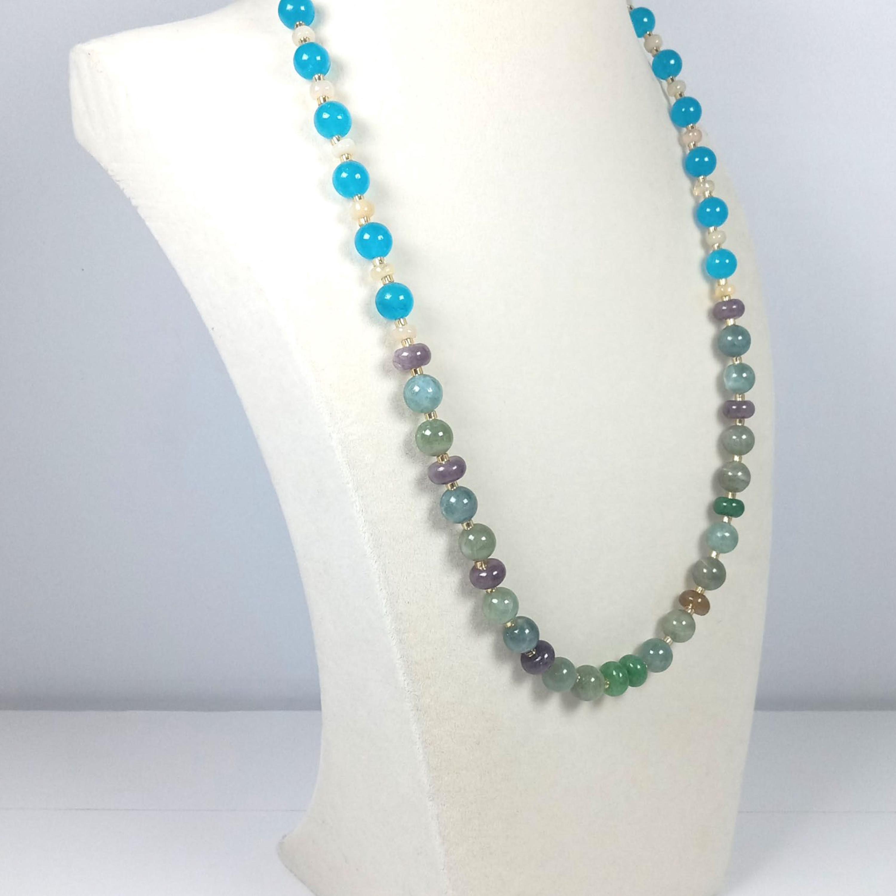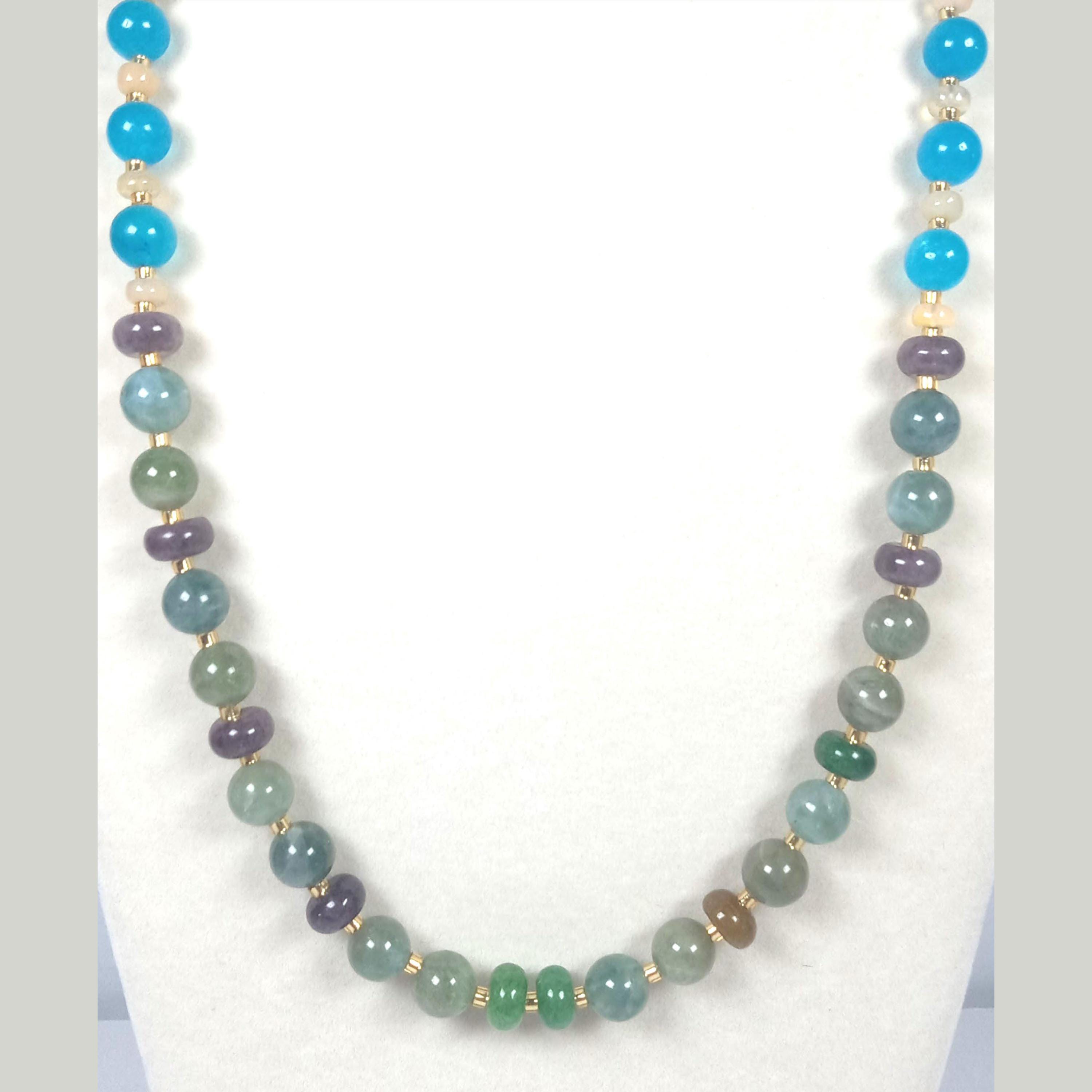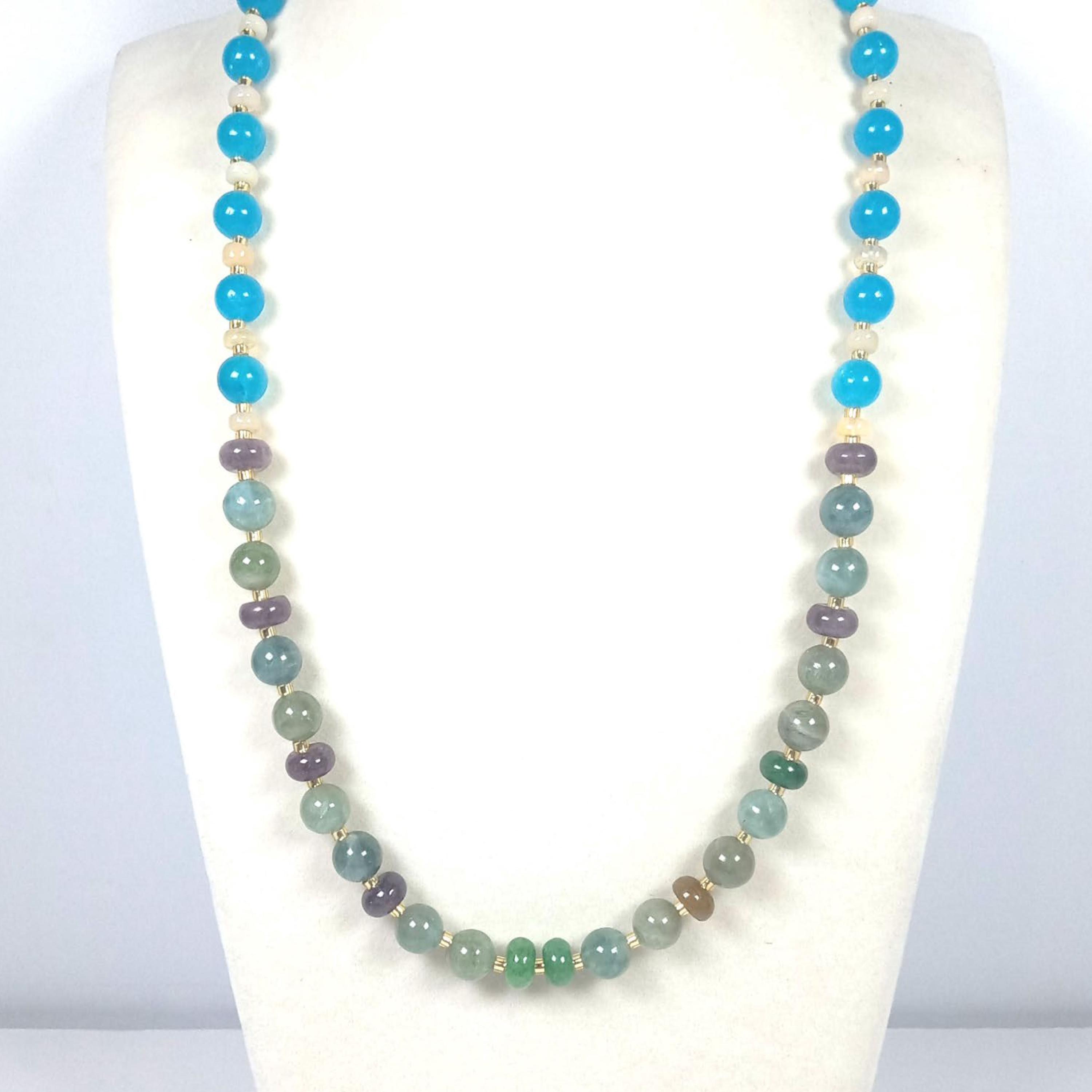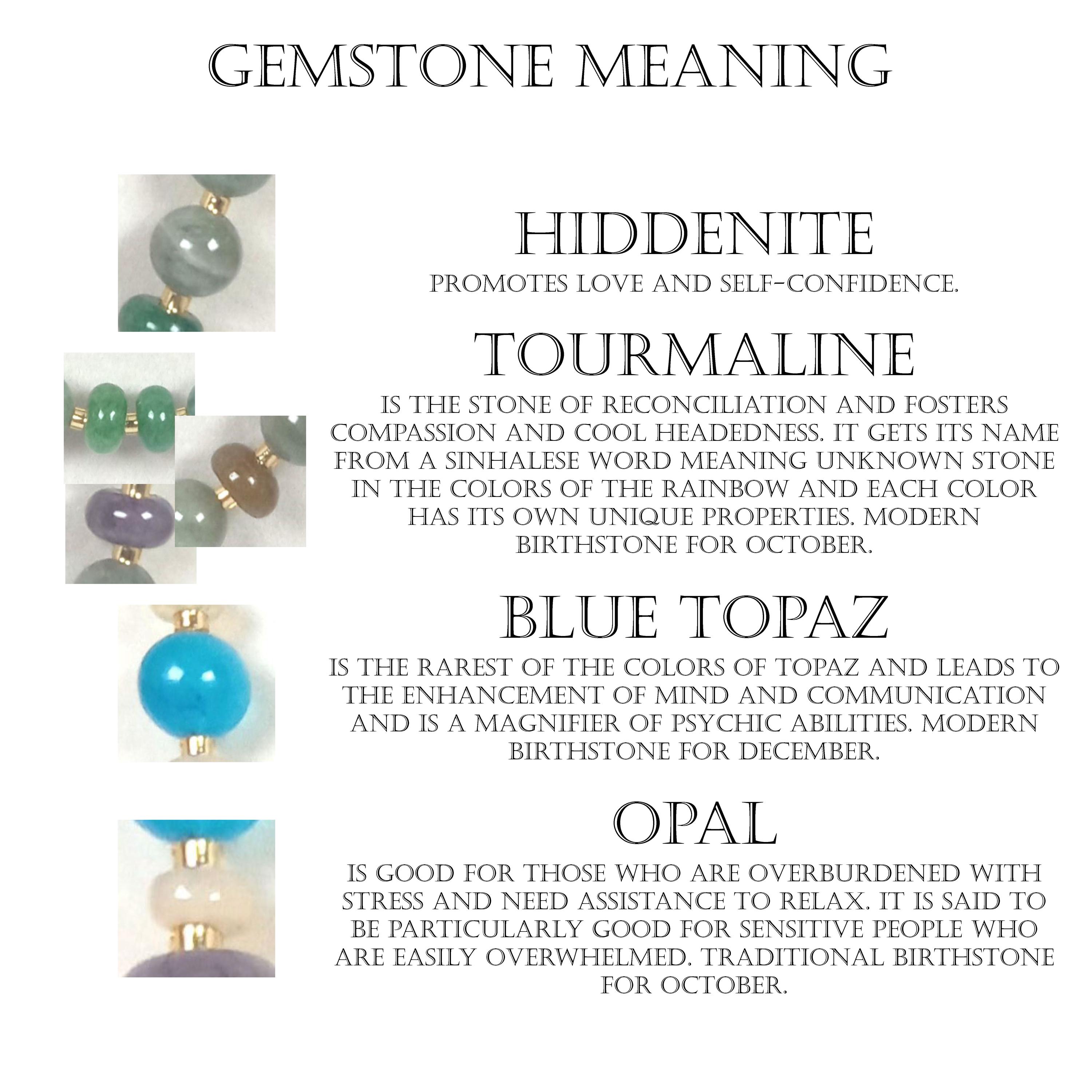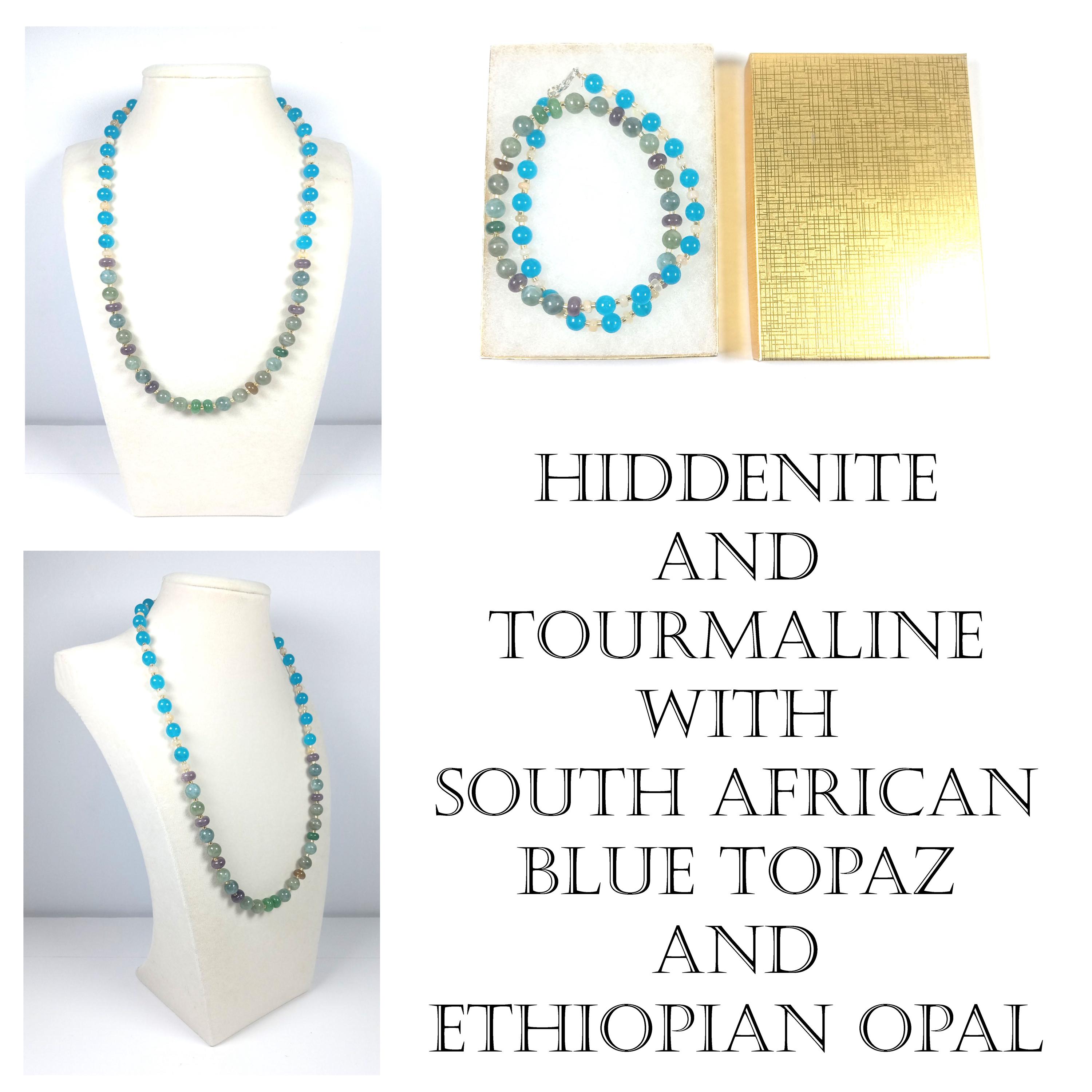 This one-of-a-kind Hiddenite and Tourmaline with South African Blue Topaz and Ethiopian Opal is a necklace made with natural stones. Three of the beads are birthstones for the months of October and December.