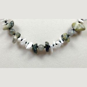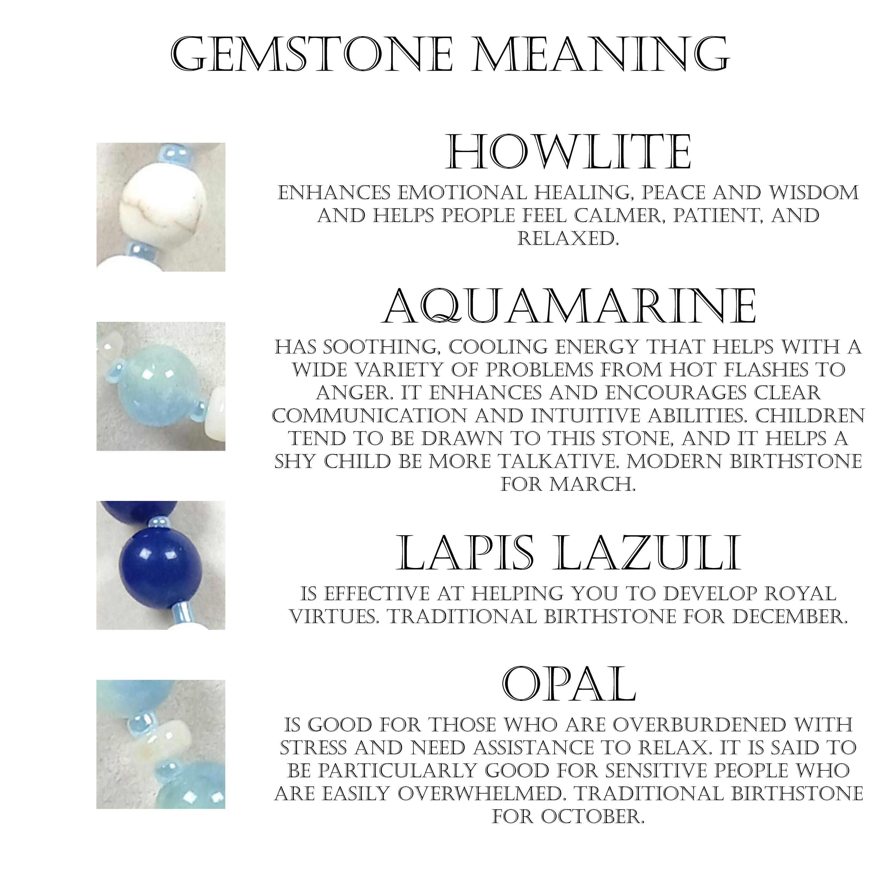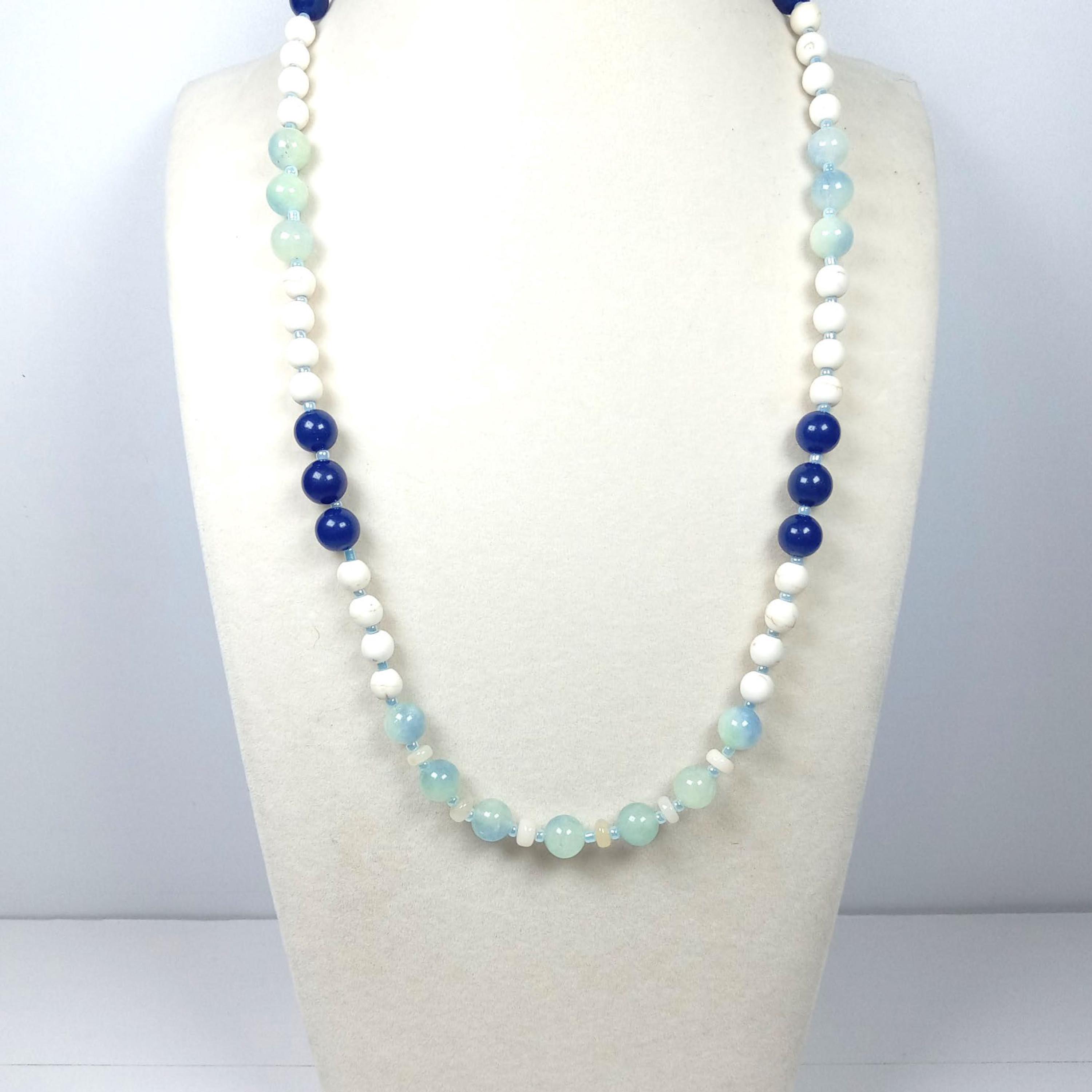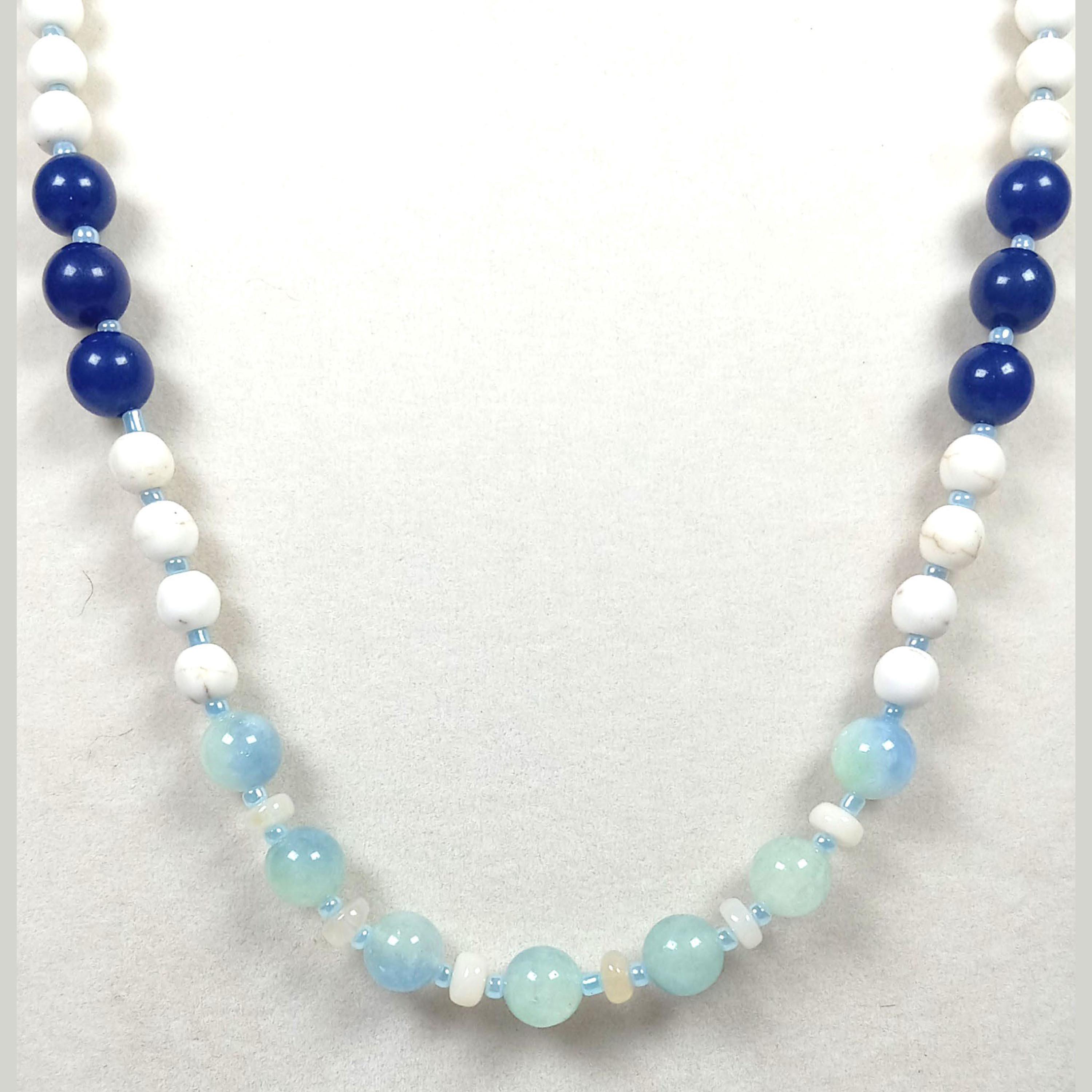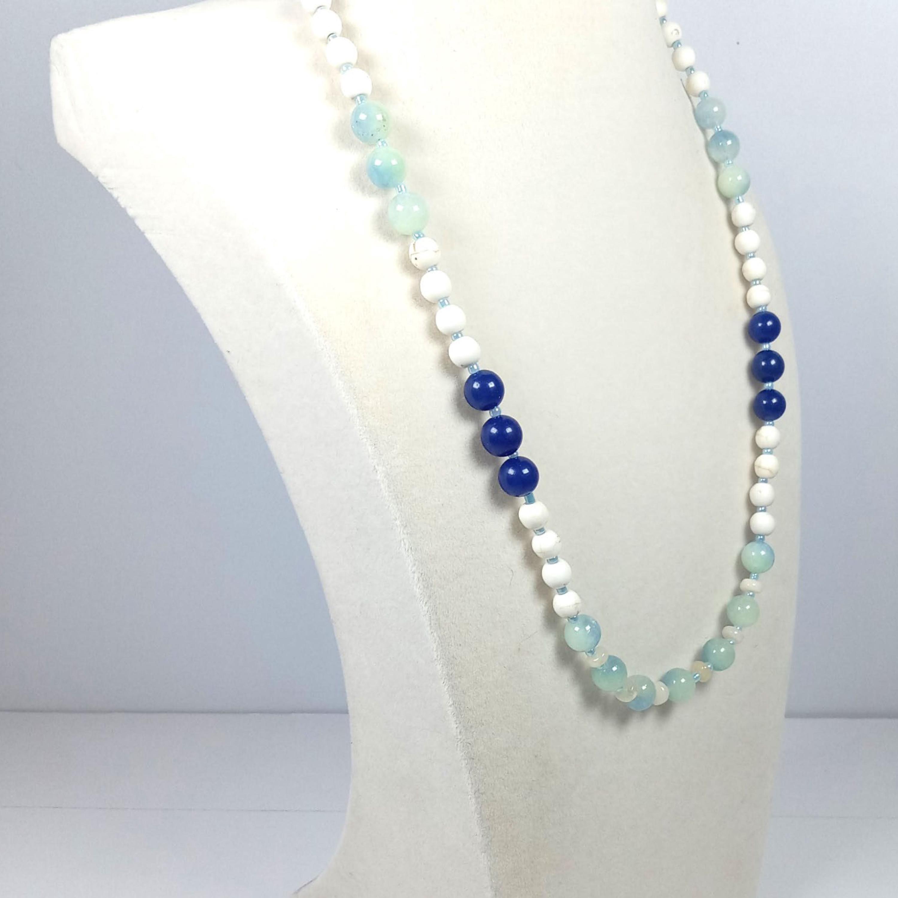 This one-of-a-kind Howlite with Aquamarine and Lapis Lazuli plus Ethiopian Opal is a necklace made with natural stones. Three of the beads are birthstones for the months of March, October, and December.