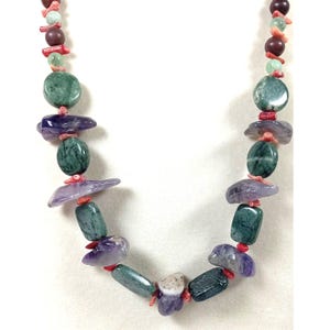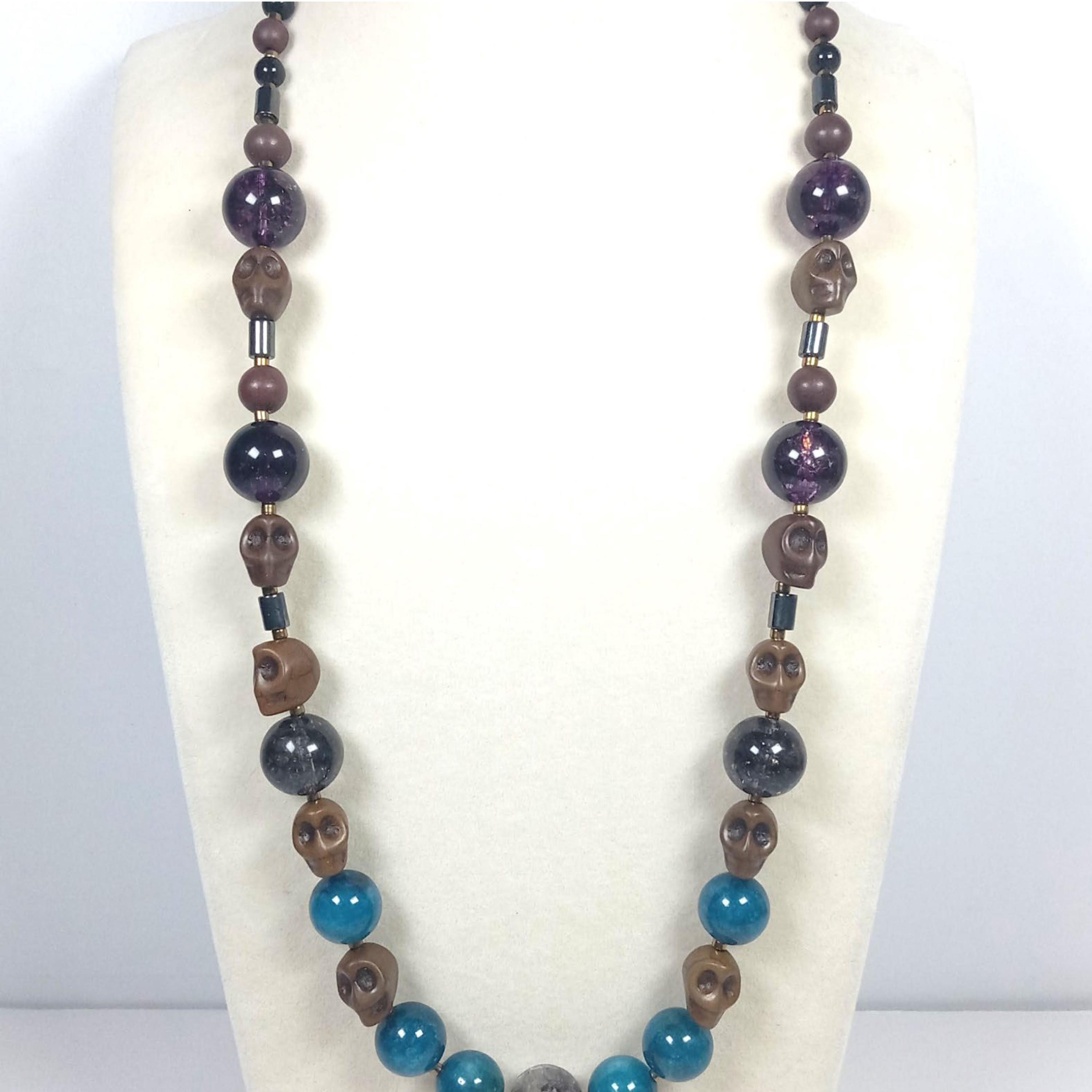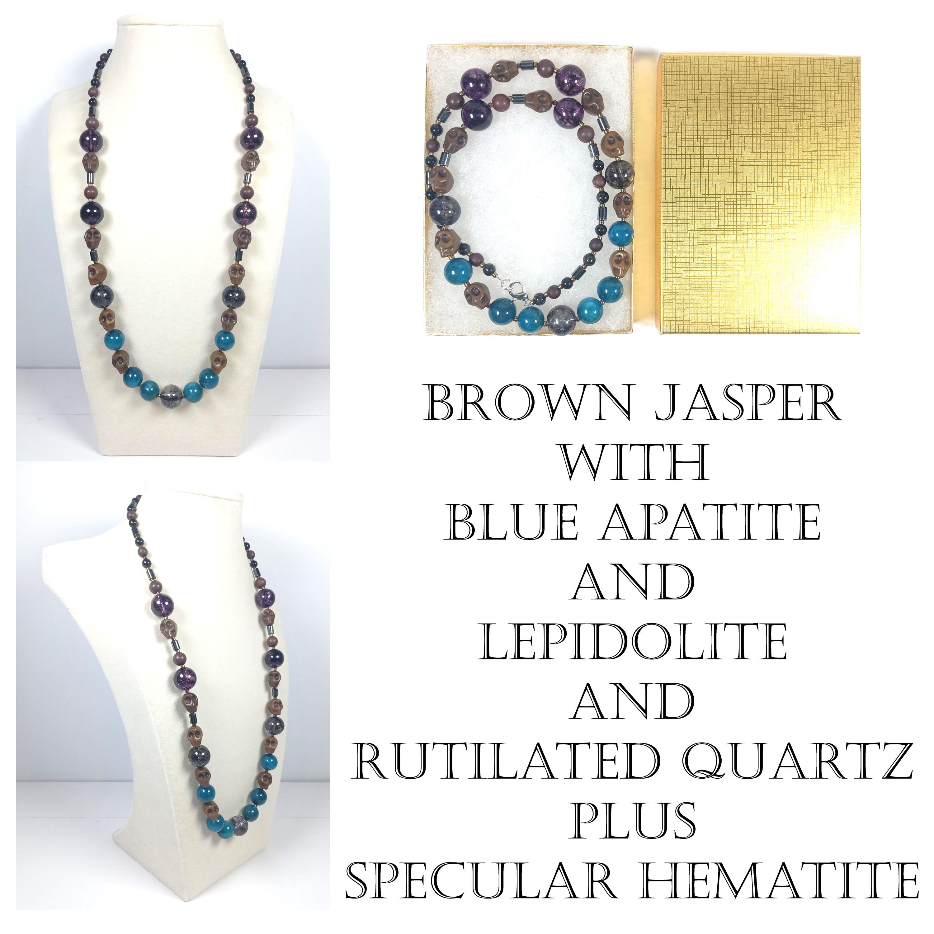 This one-of-a-kind Brown Jasper with Blue Apatite and Lepidolite and Rutilated Quartz plus Specular Hematite is a necklace made with natural stones. Some of the Brown Jaspers are carved skulls.
