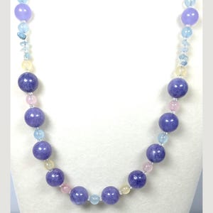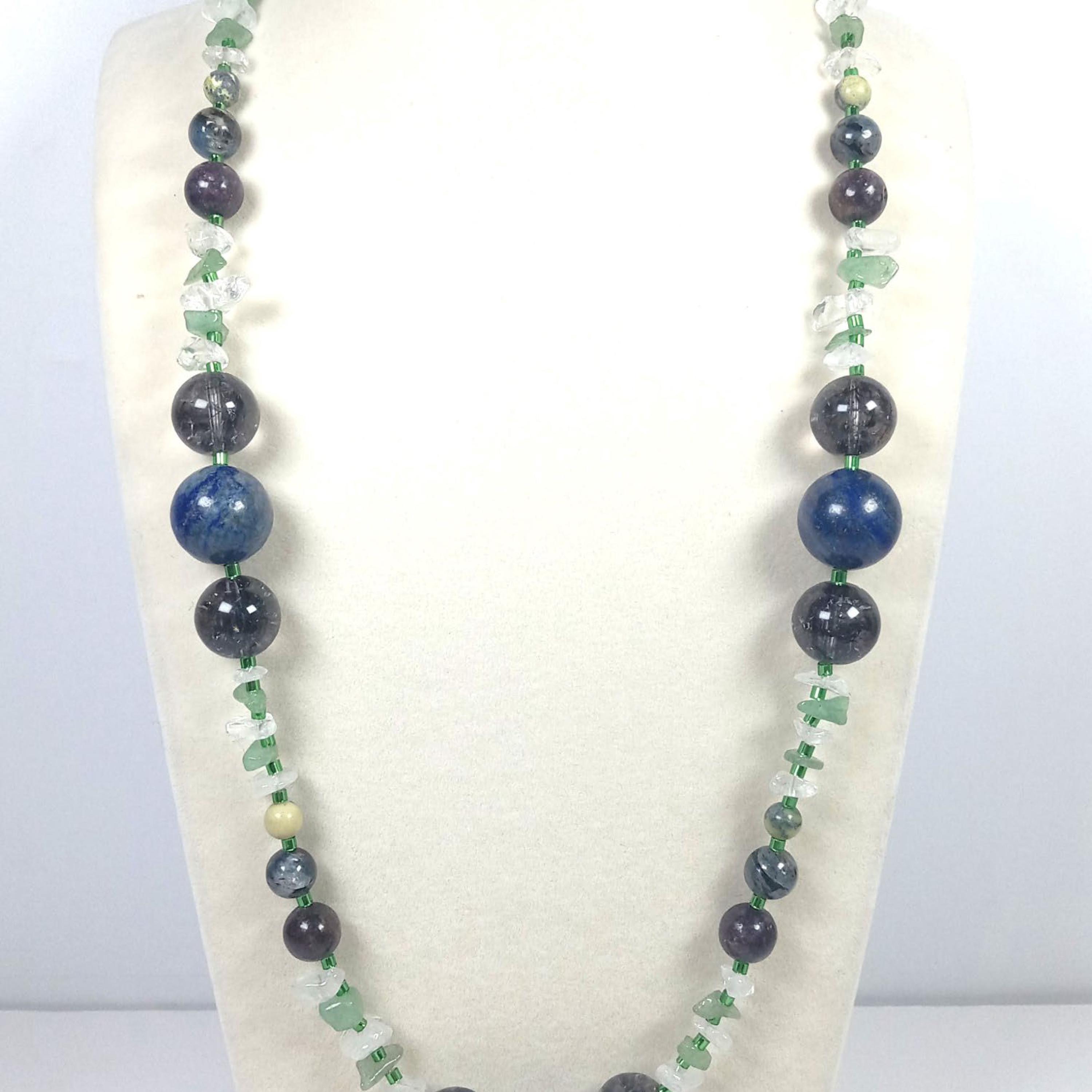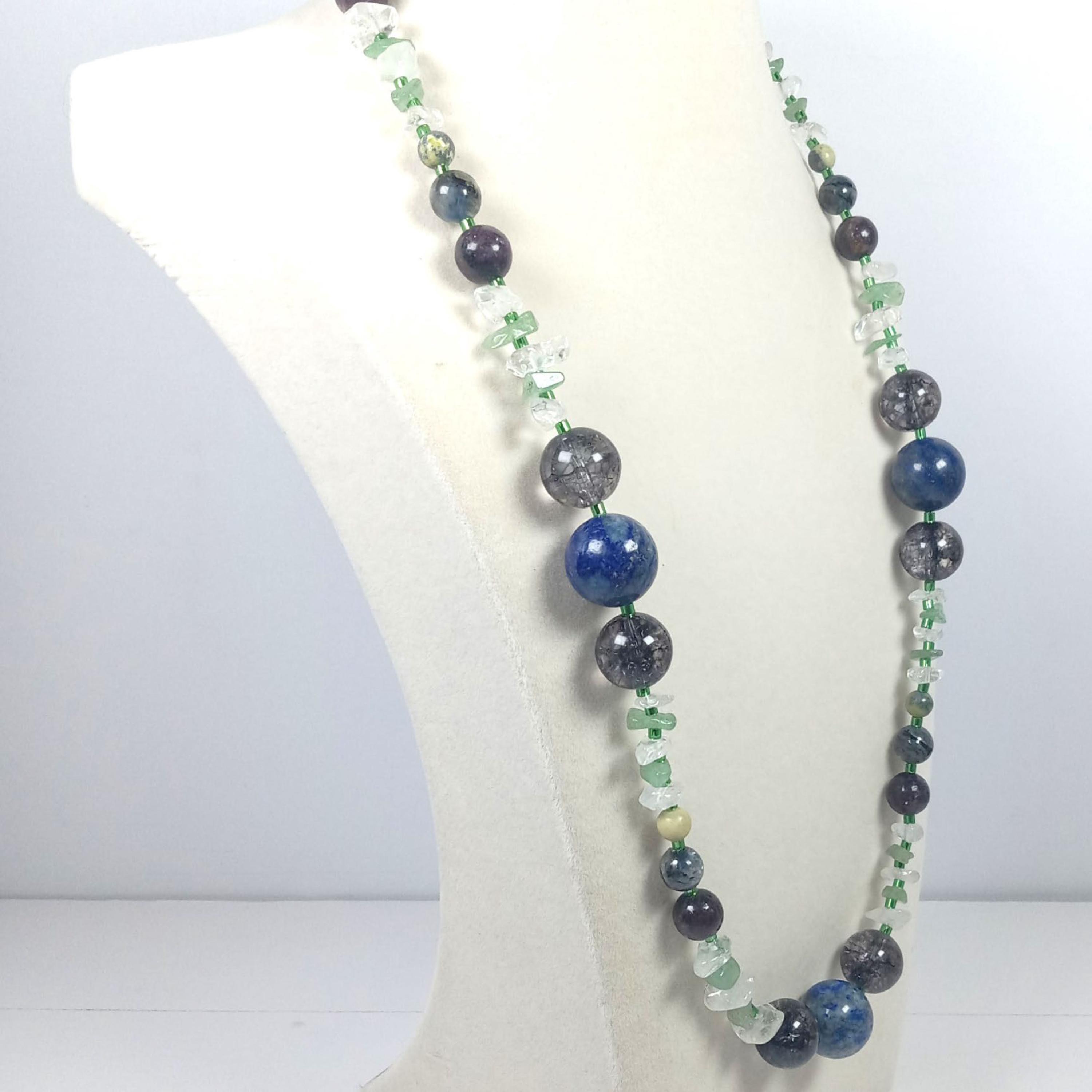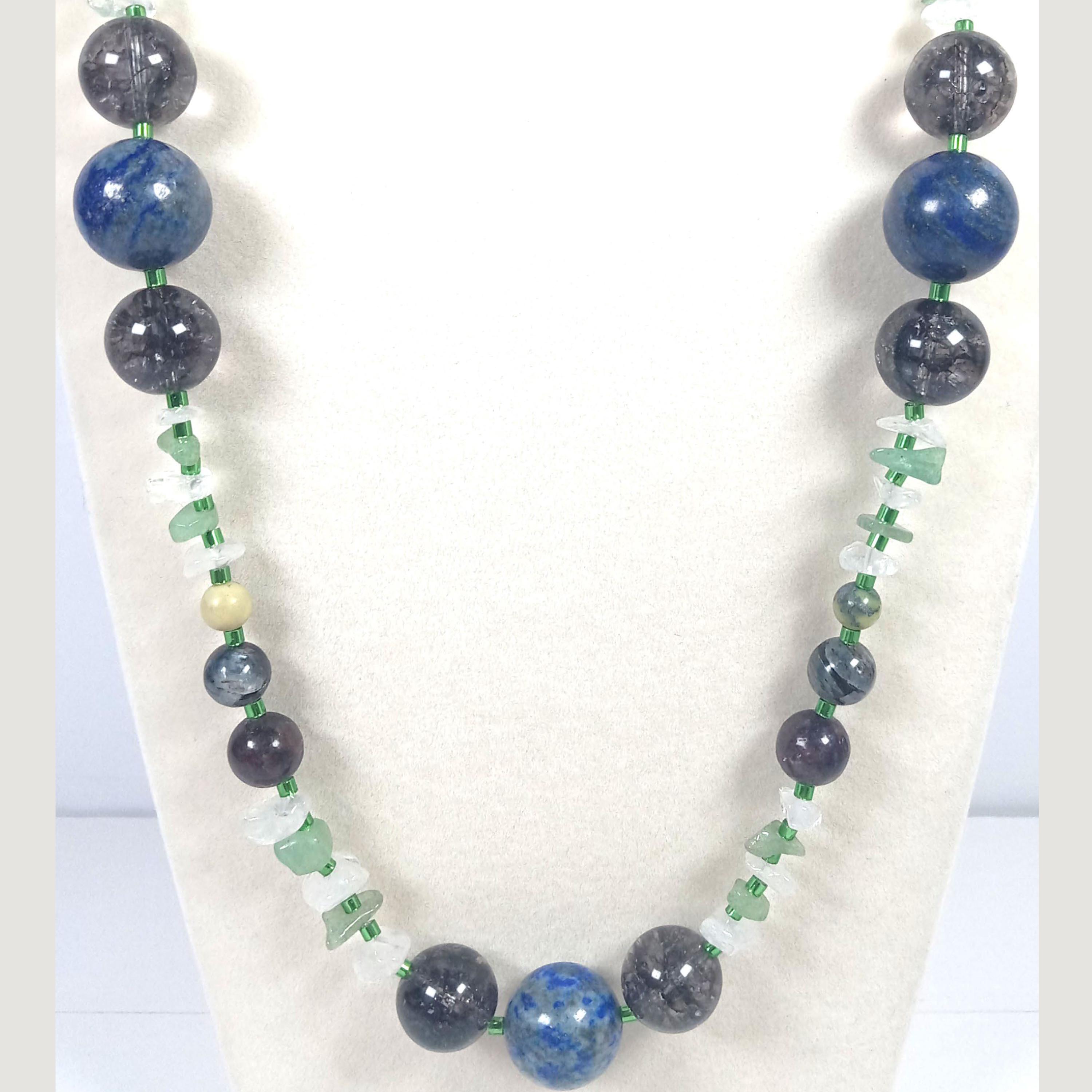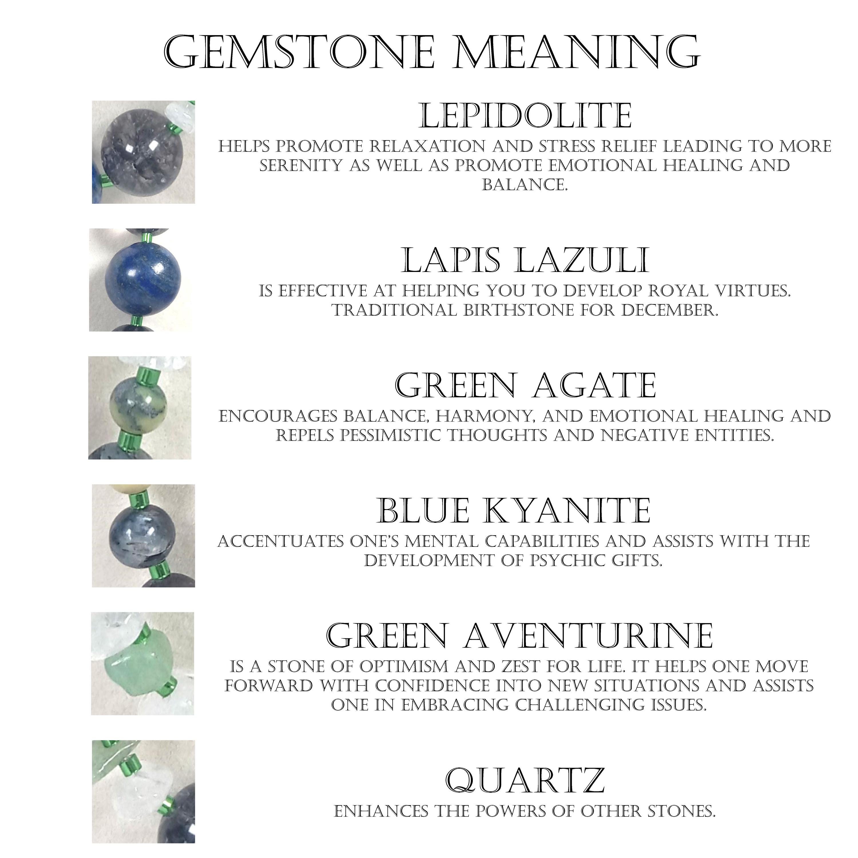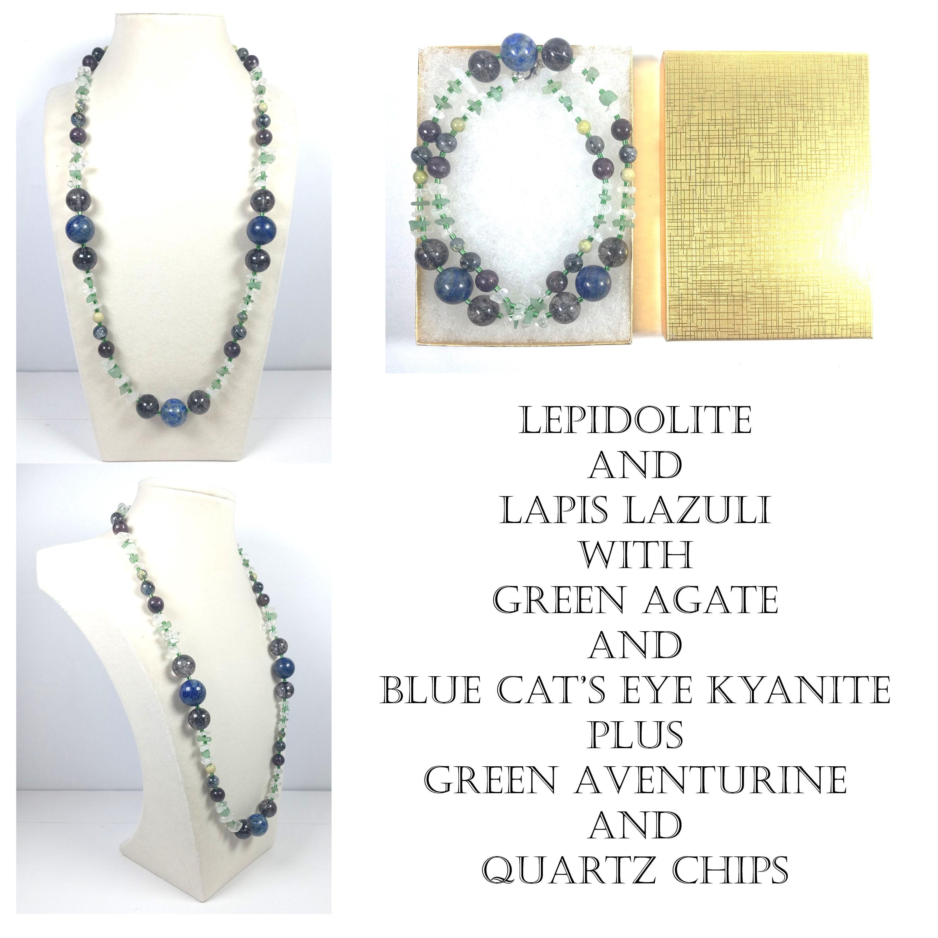 This one-of-a-kind Lepidolite and Lapis Lazuli with Green Agate and Blue Catโs Eye Kyanite plus Green Aventurine and Quartz Chips is a necklace made with natural stones. One of the beads are birthstone for the month of December.