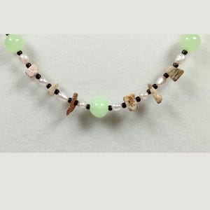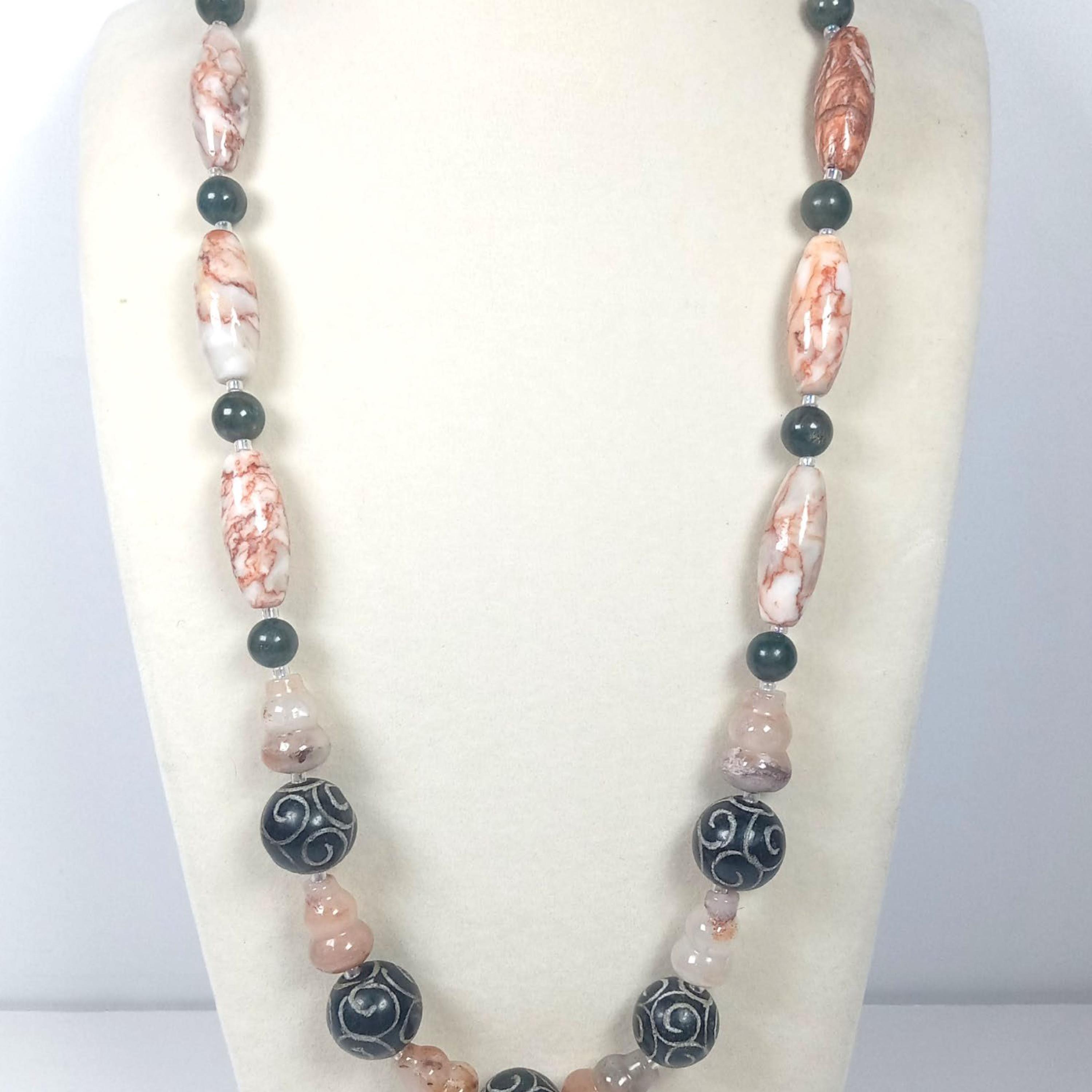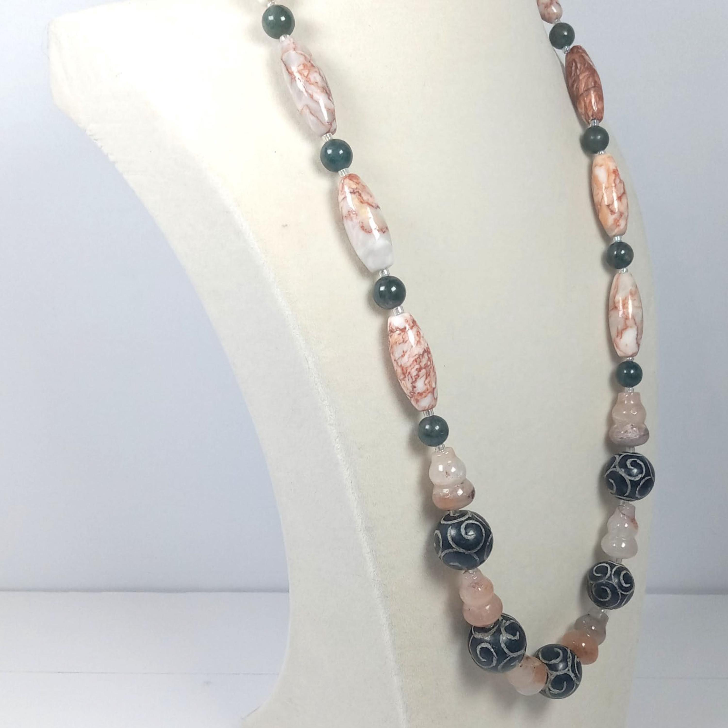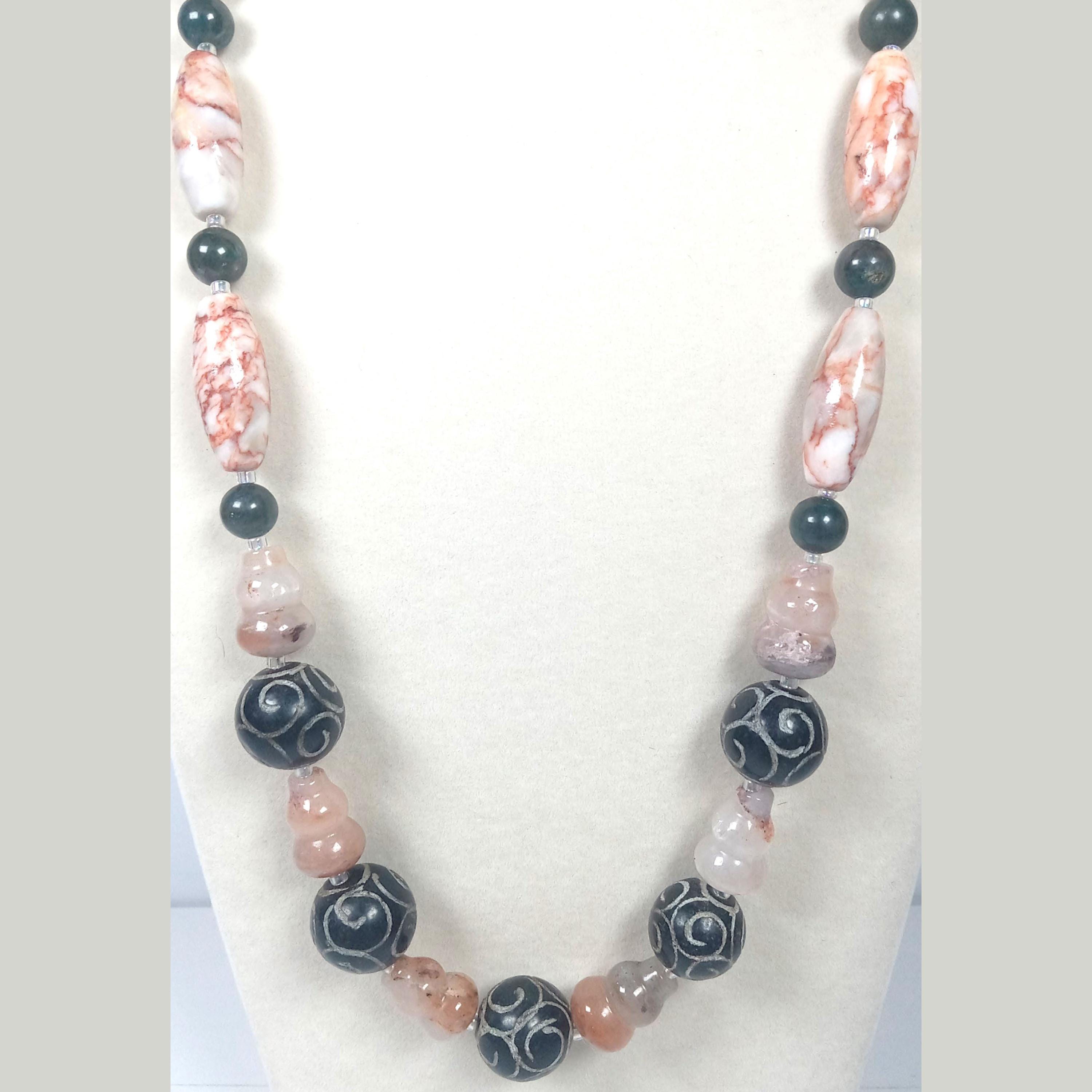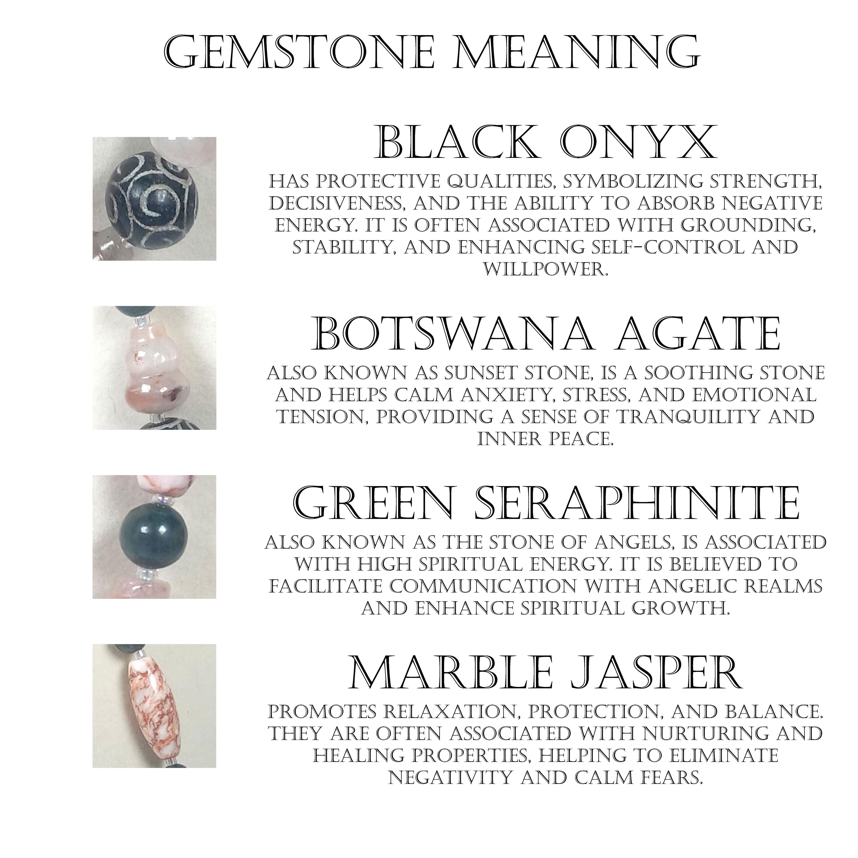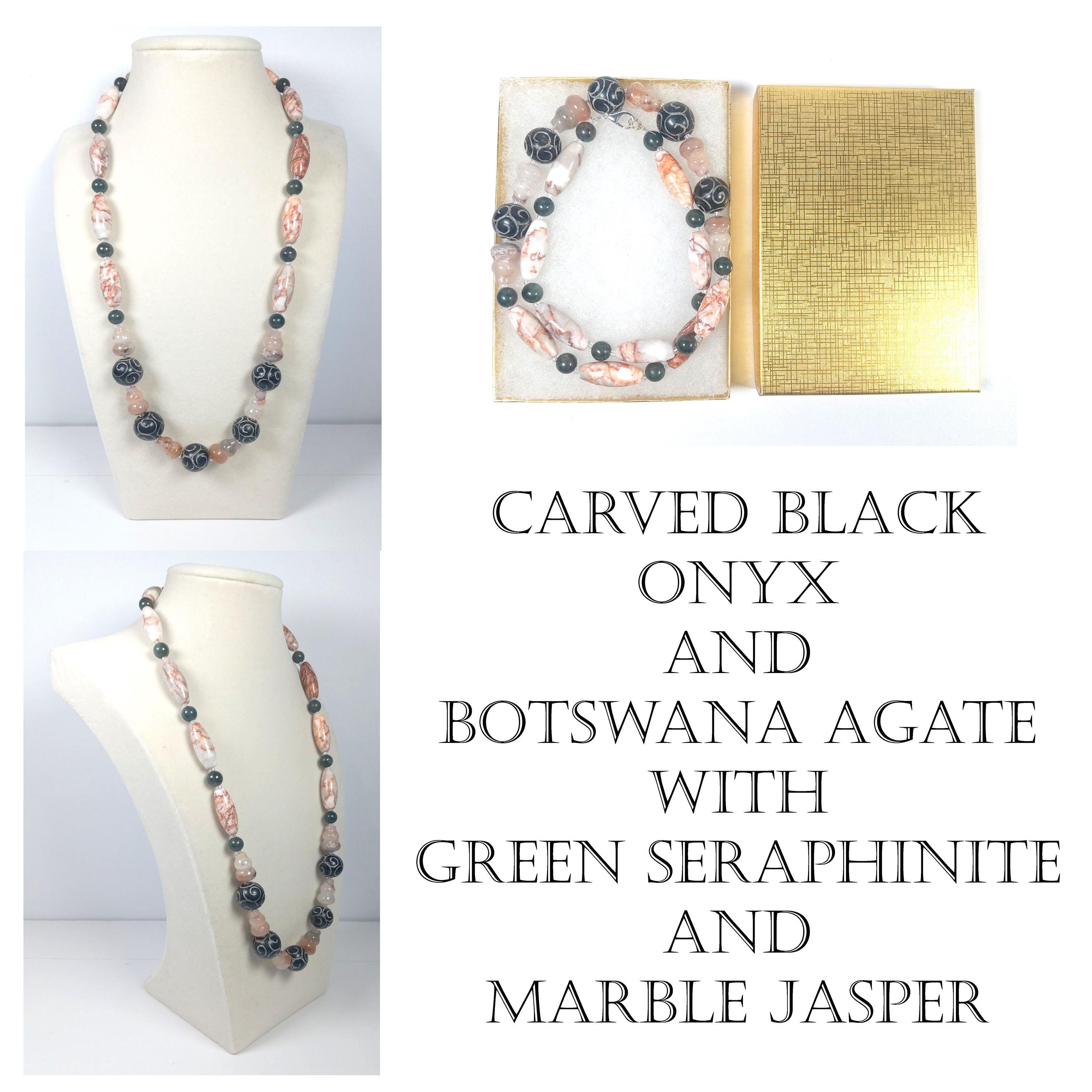 This one-of-a-kind Carved Black Onyx and Botswana Agate with Green Seraphinite and Marble Jasper is a necklace made with natural stones.