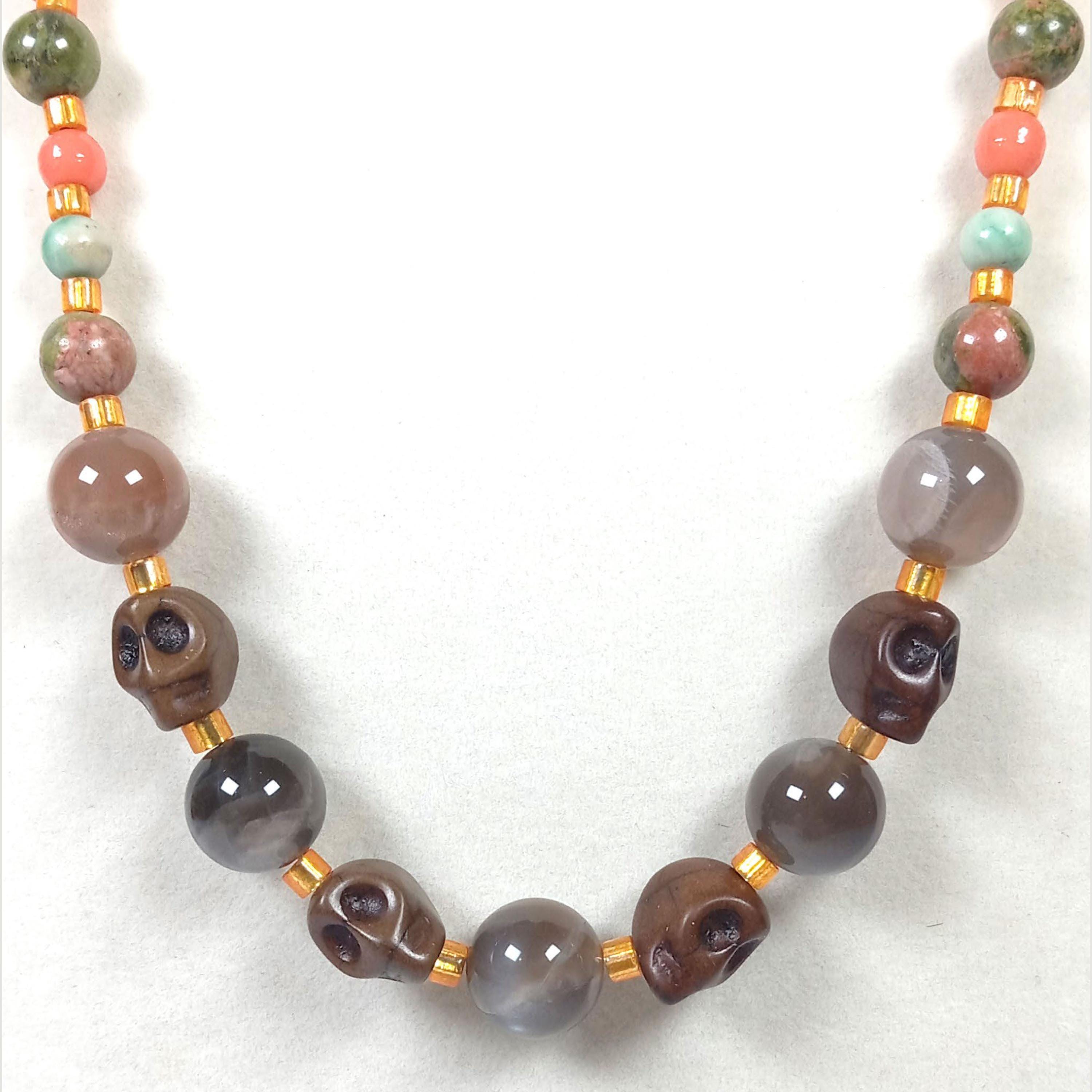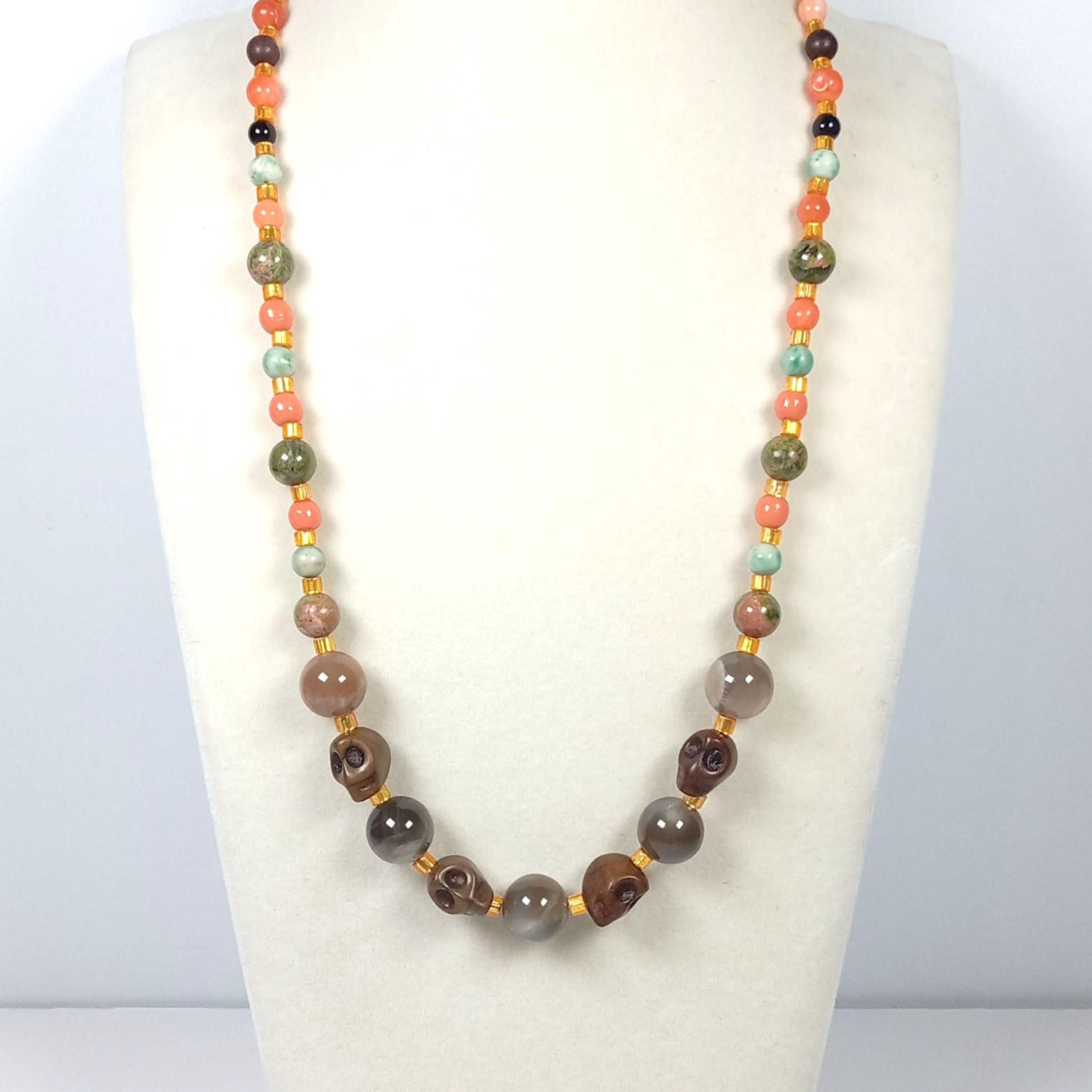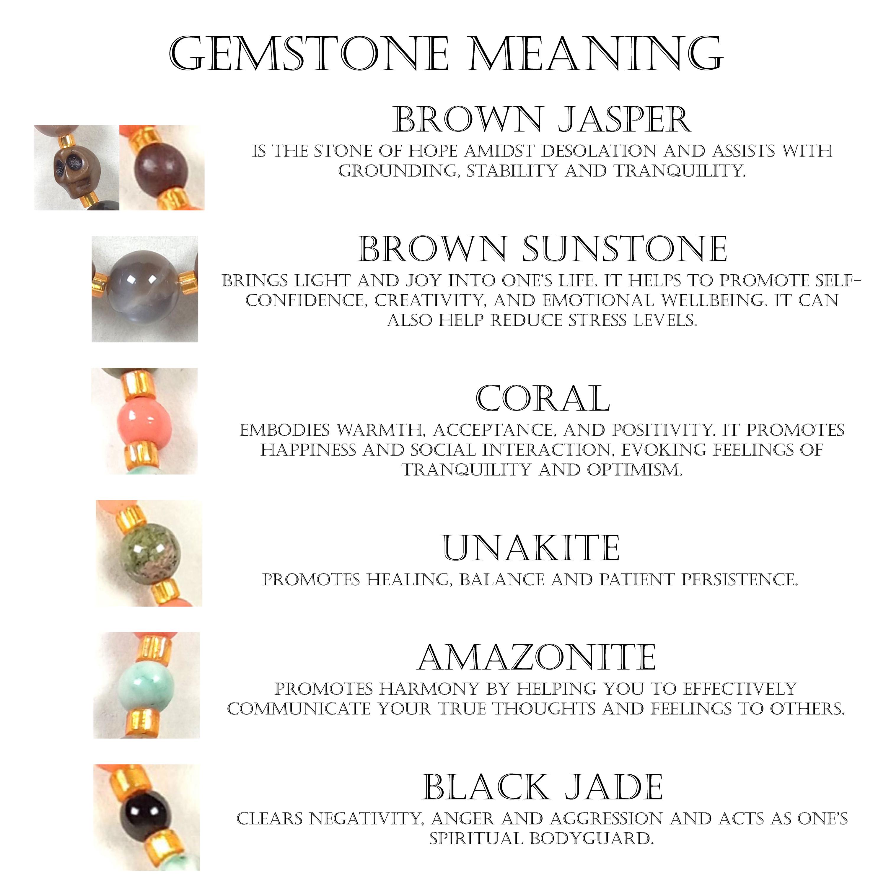 This one-of-a-kind Brown Jasper and Brown Sunstone plus Coral with Unakite and Amazonite and Black Jade is a necklace made with natural stones.