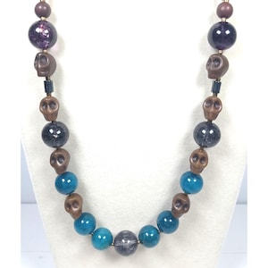This one-of-a-kind Amethyst and Lapis Lazuli with Turquoise and Ametrine and Citrine is a necklace made with natural stones. Four of the beads are birthstones for the months of February, November, and December.