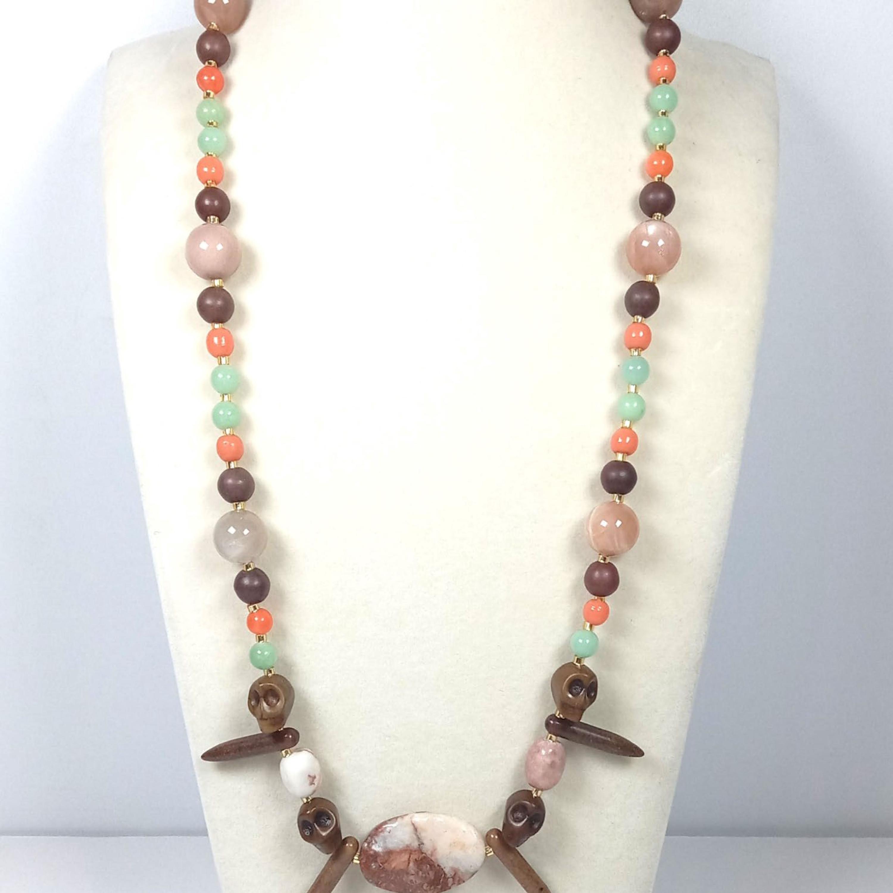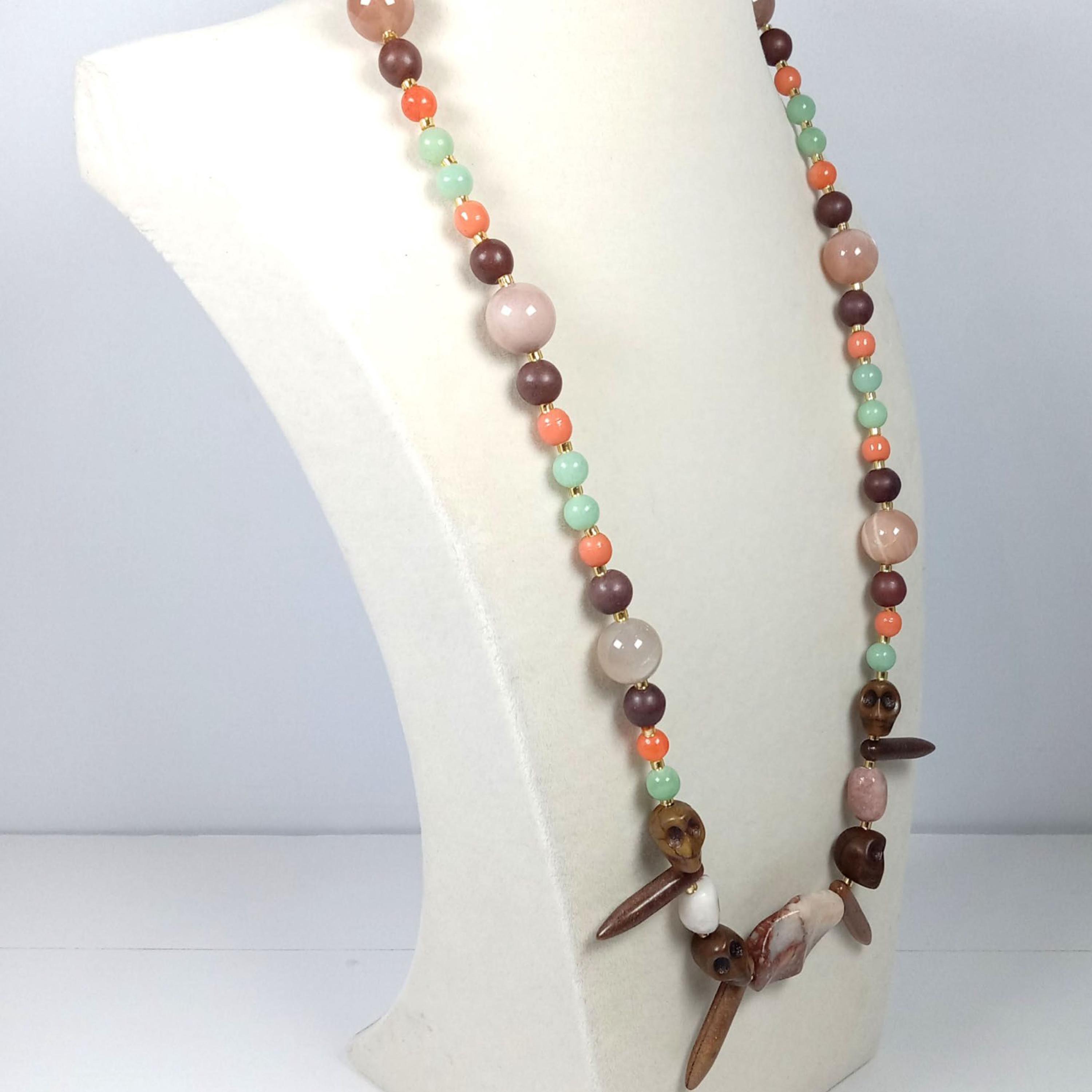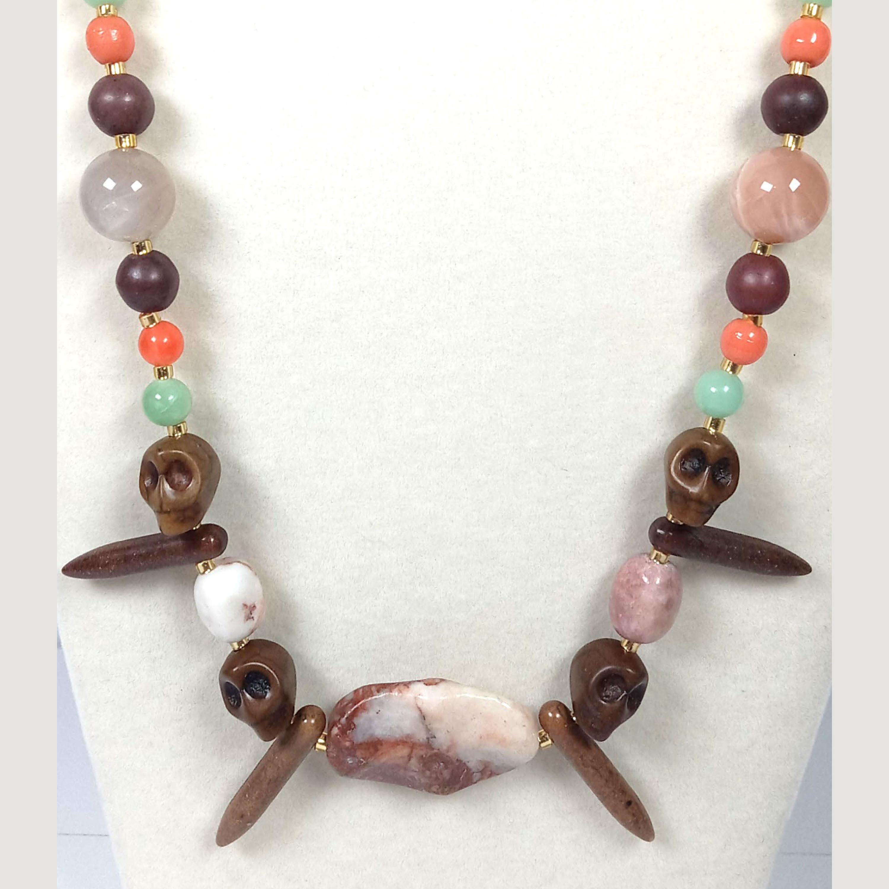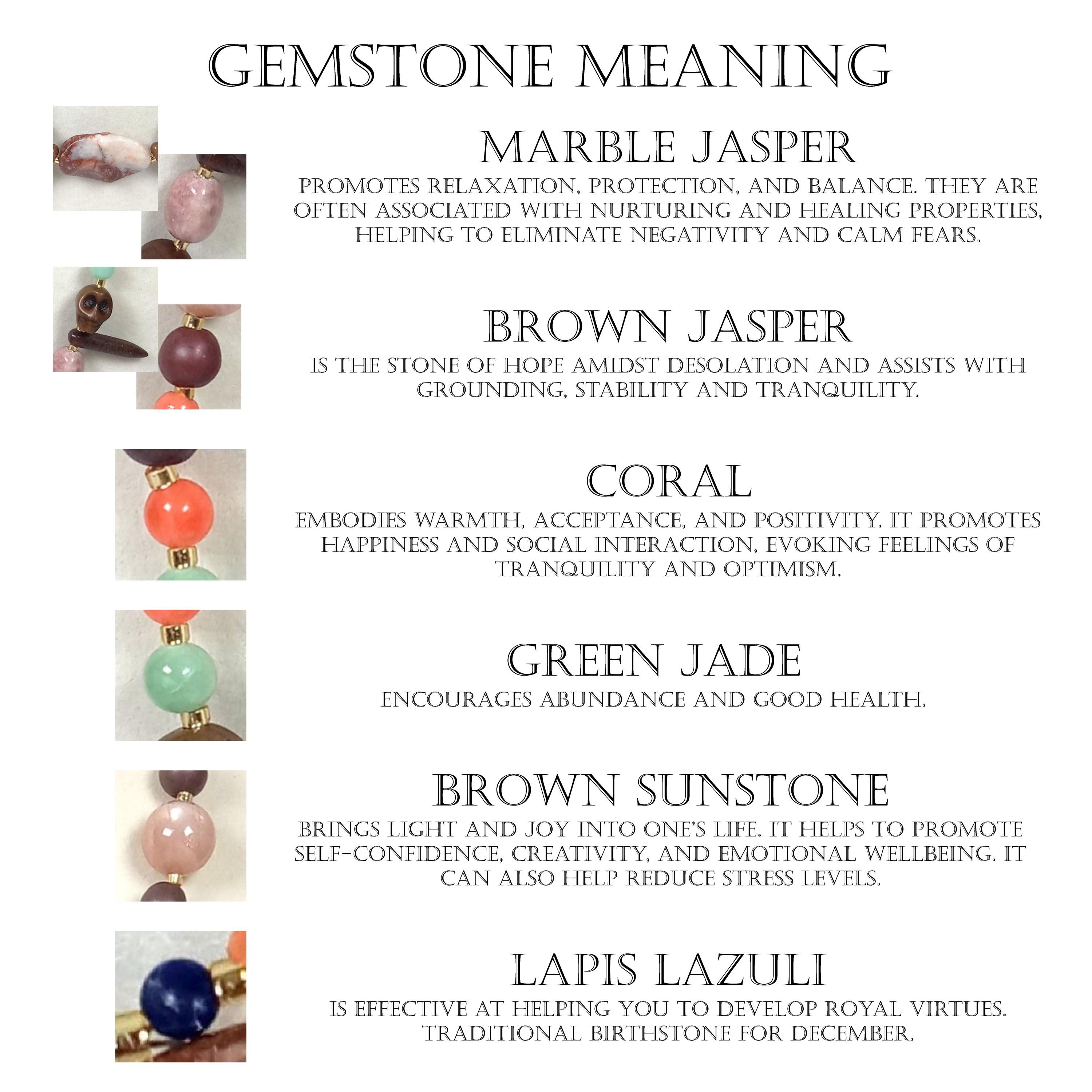 This one-of-a-kind Marble Jasper and Brown Jasper with Coral and Sea Green Jade plus Brown Sunstone and Lapis Lazuli is a necklace made with natural stones. Some of the Brown Jasper are Skulls and Daggers. One of the beads are birthstone for the month of December.