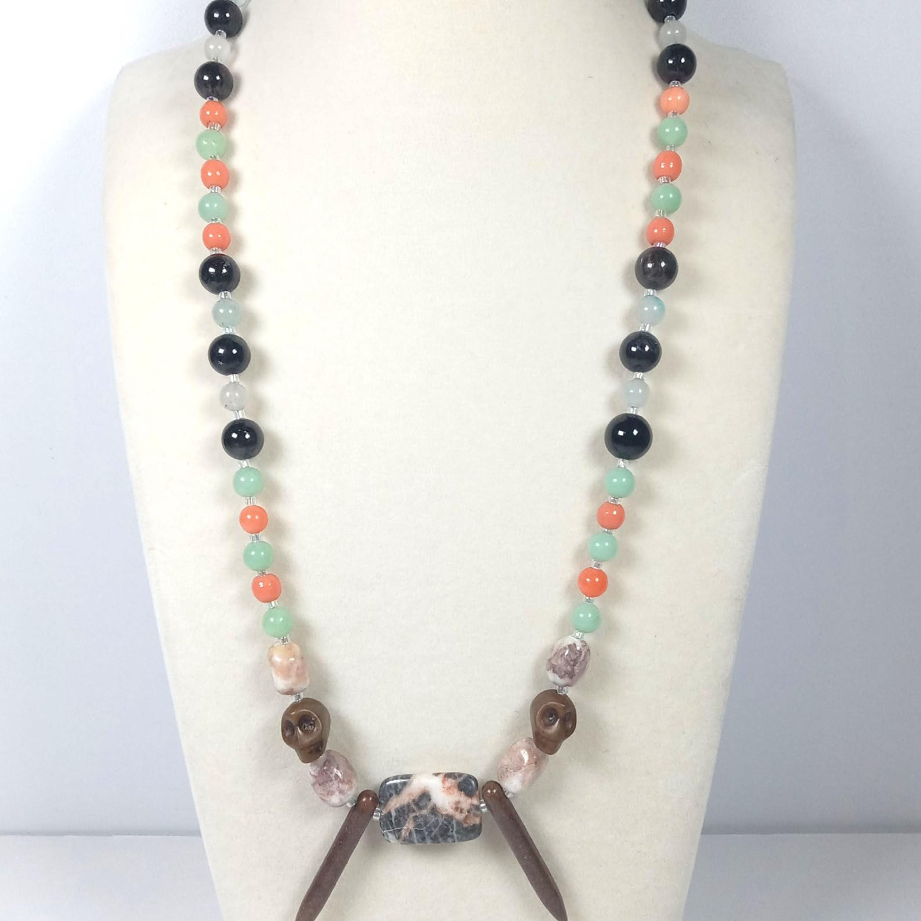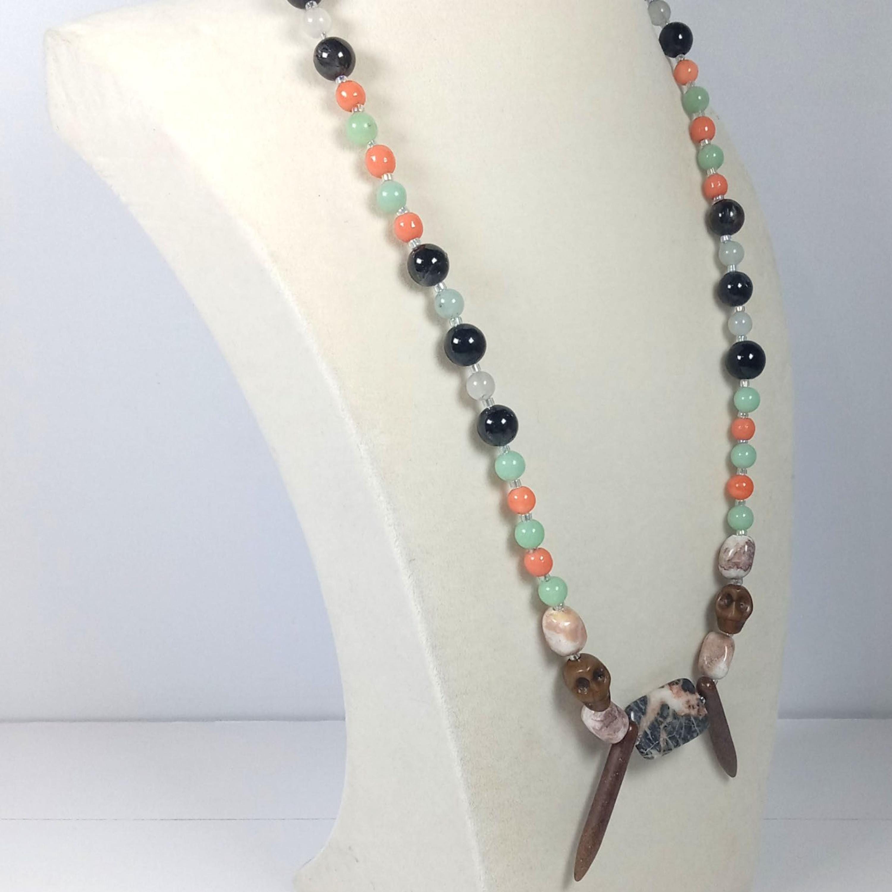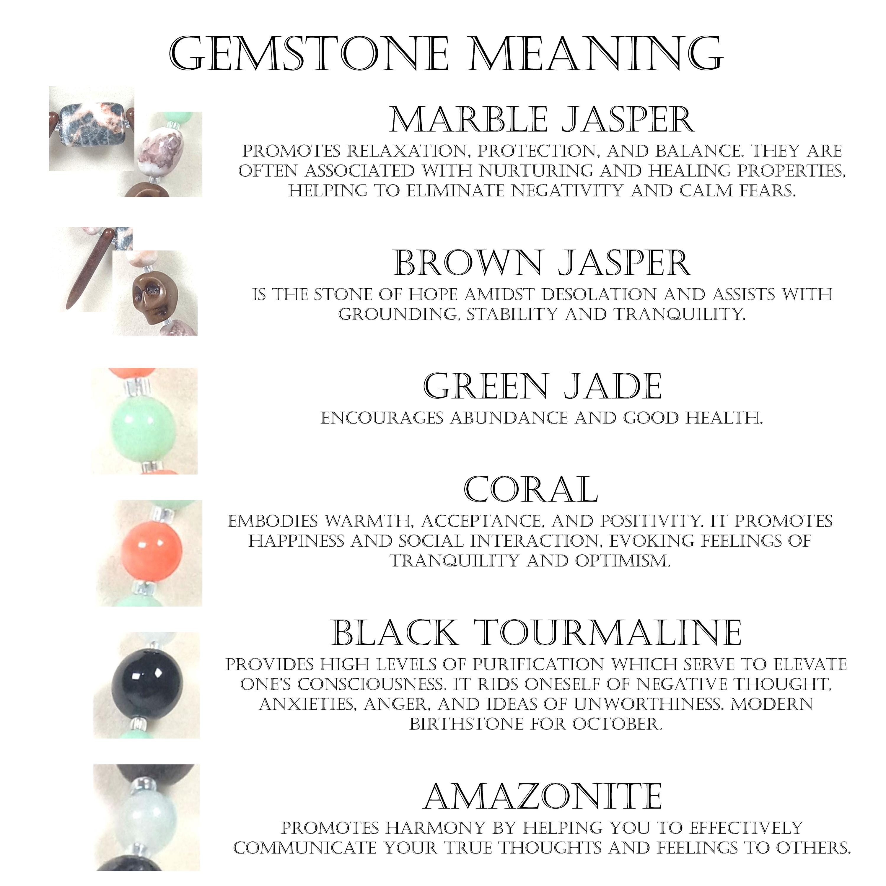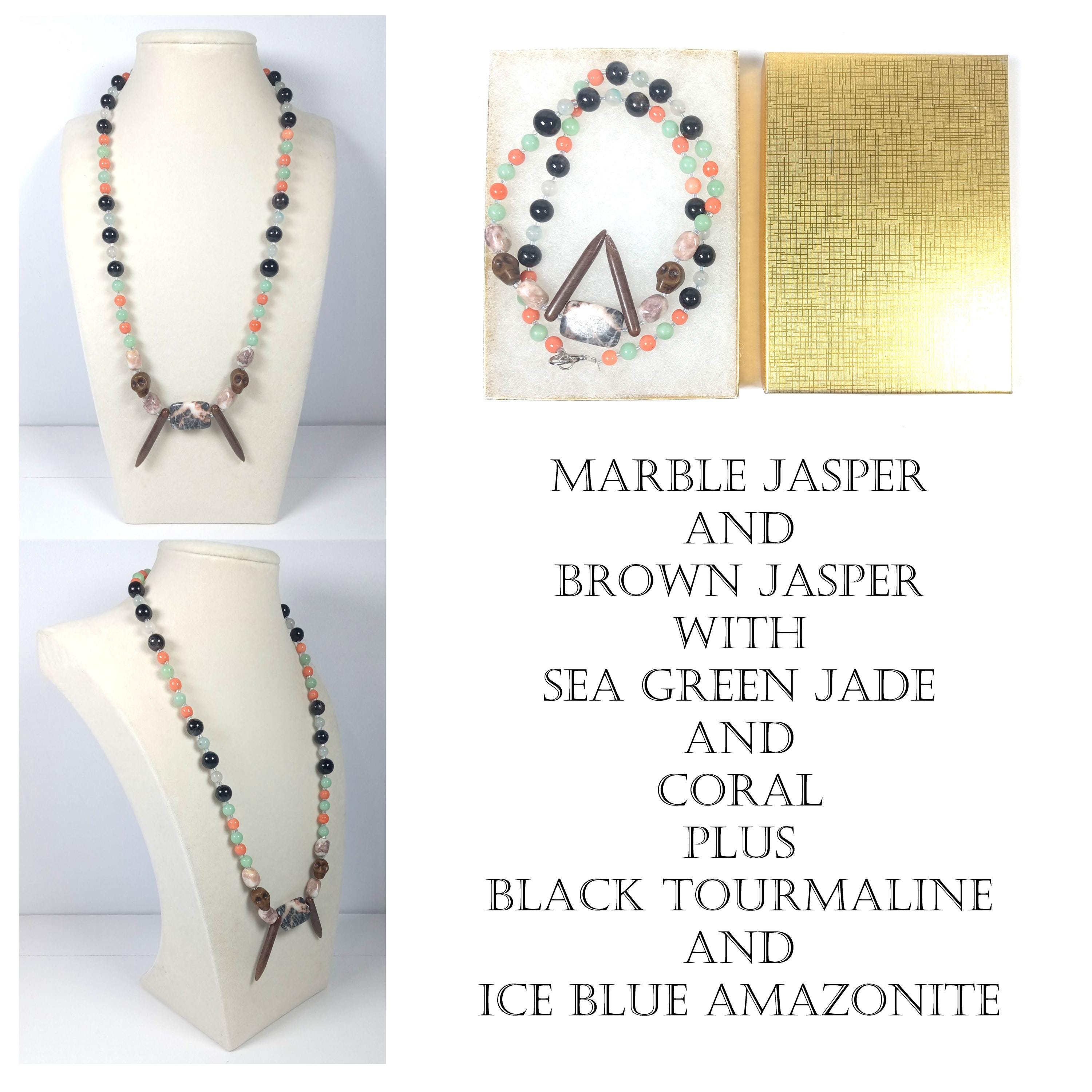 This one-of-a-kind Marble Jasper and Brown Jasper with Sea Green Jade and Coral plus Black Tourmaline and Ice Blue Amazonite is a necklace made with natural stones. The Brown Jaspers are Skulls and Daggers. One of the beads are birthstone for the month of October.