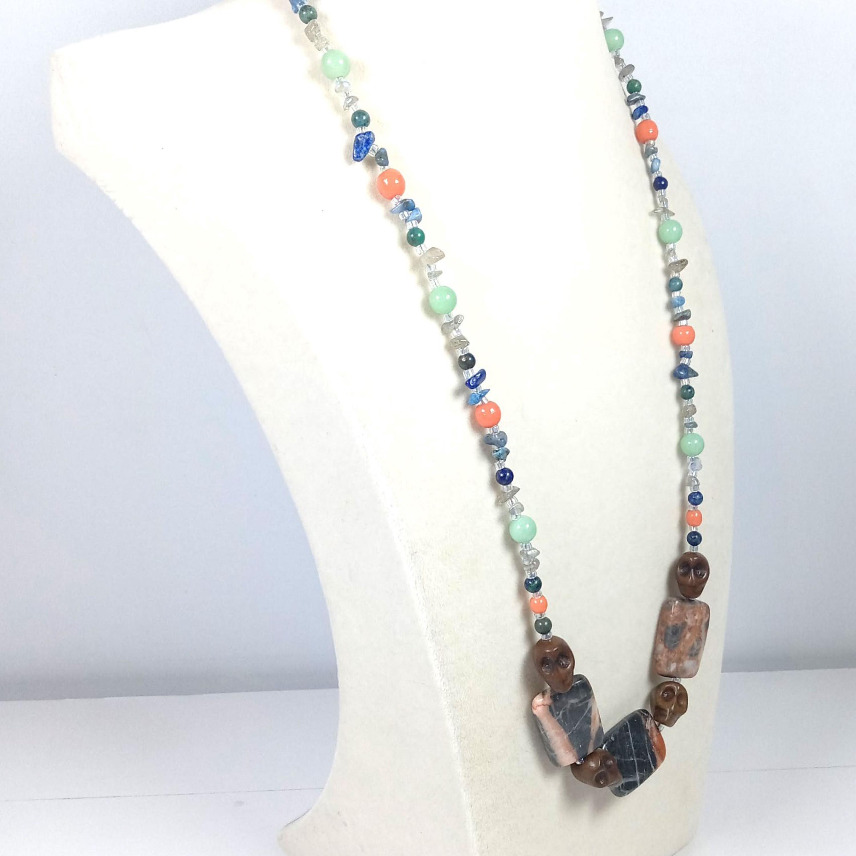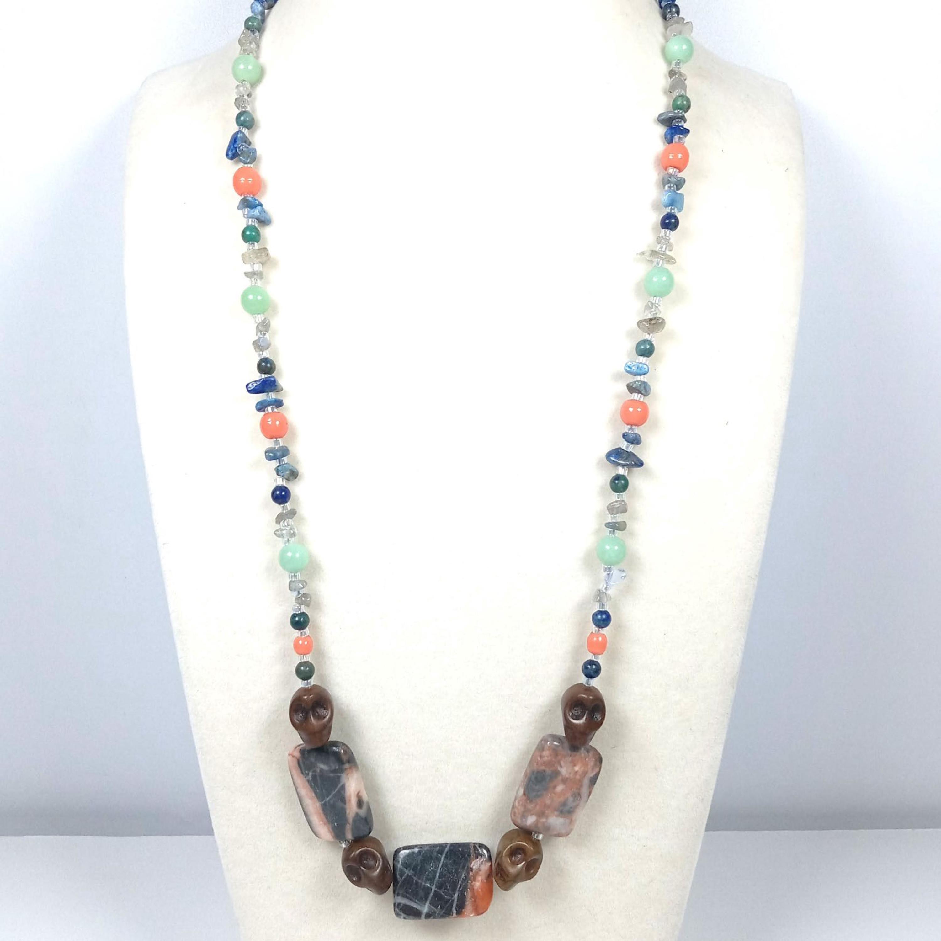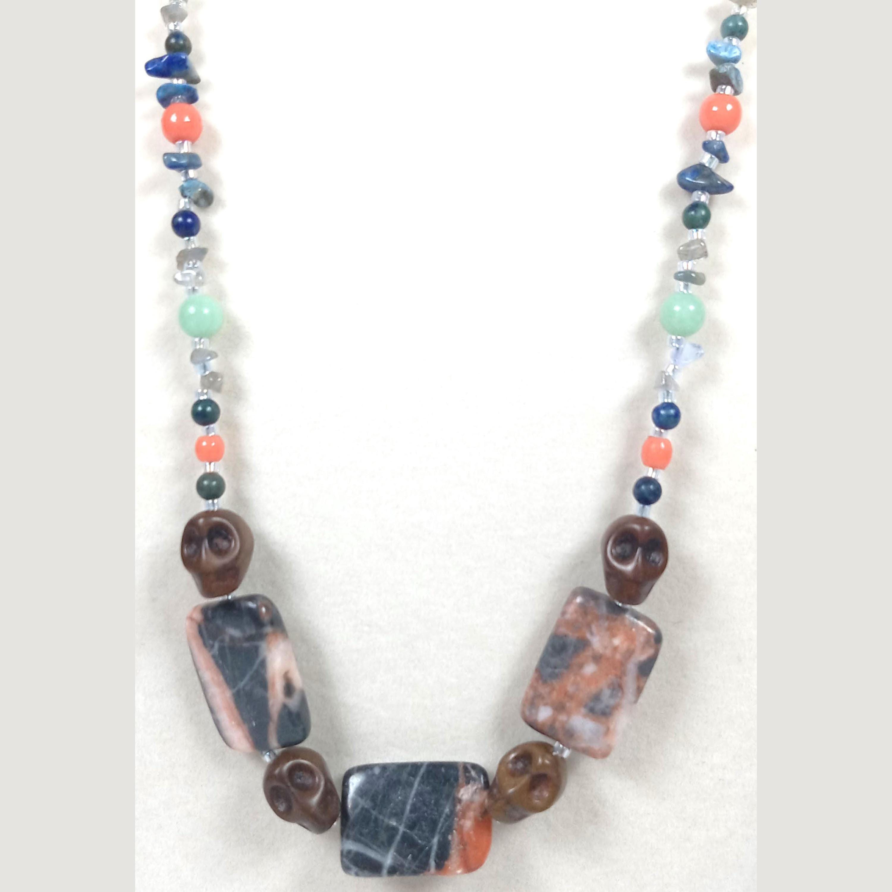 This one-of-a-kind Brown Jasper and Sodalite with Coral and Sea Green Jade and Lapis Lazuli plus Labradorite Chips is a necklace made with natural stones. The Brown Jasper are Skulls. One of the beads are birthstone for the month of December.