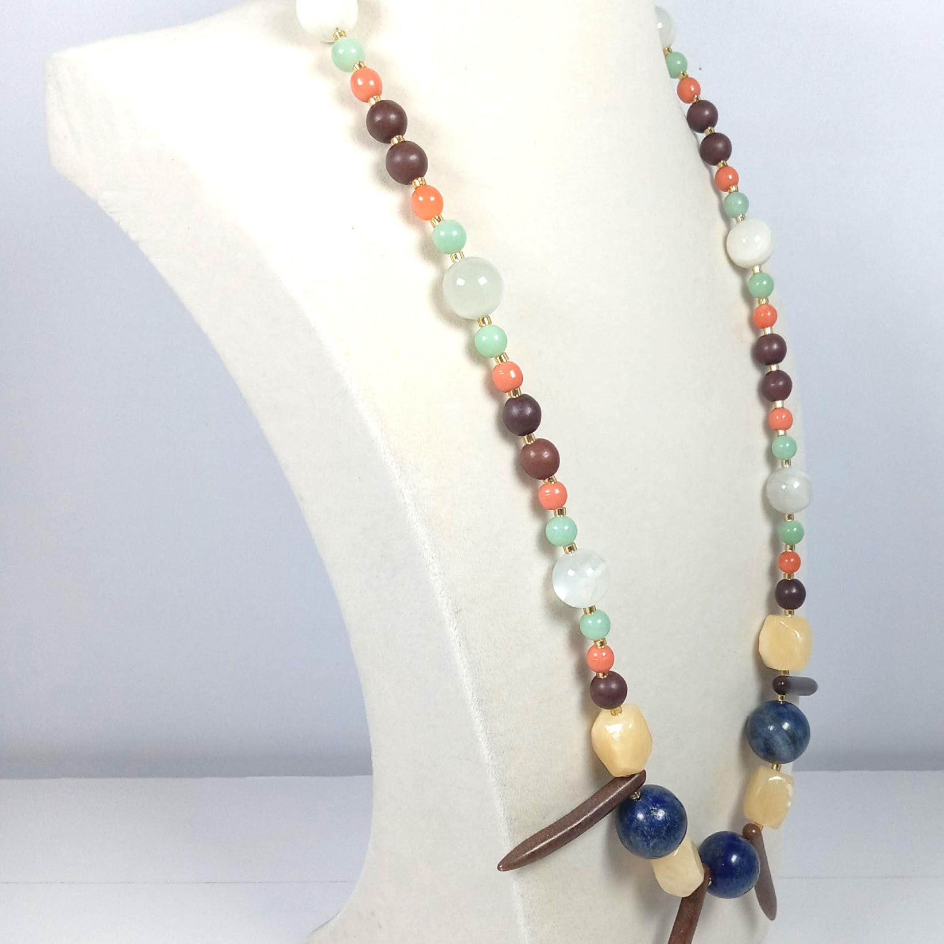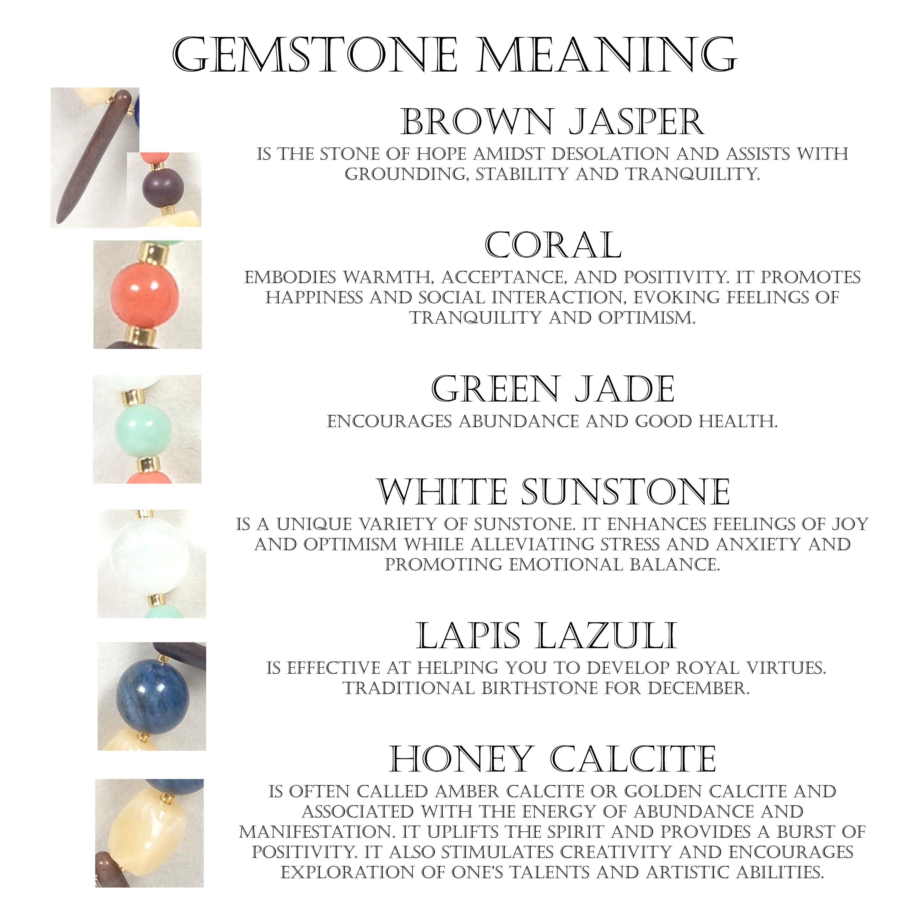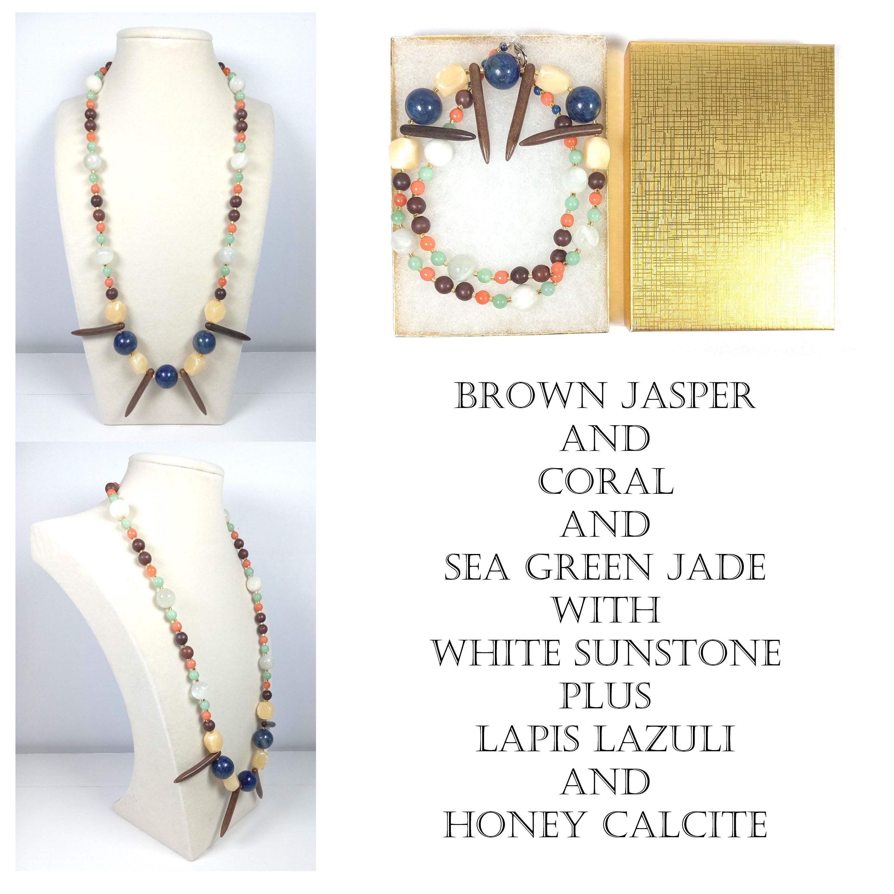 This one-of-a-kind Brown Jasper and Coral and Sea Green Jade with White Sunstone plus Lapis Lazuli and Honey Calcite is a necklace made with natural stones. One of the beads are birthstone for the month of December.