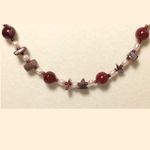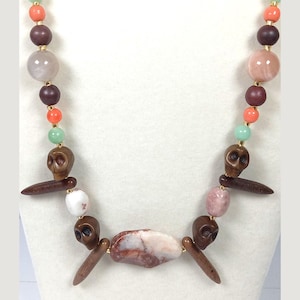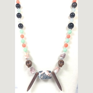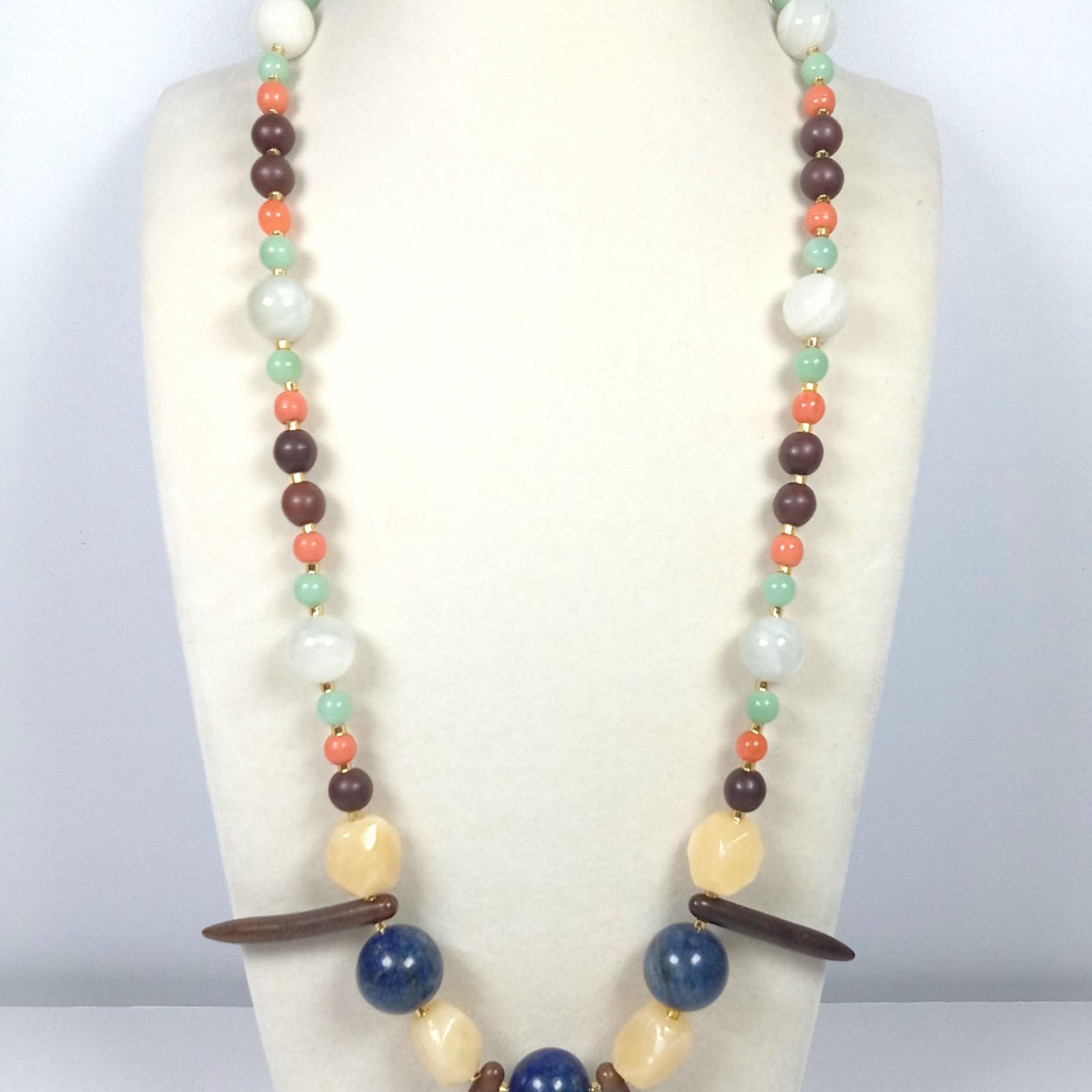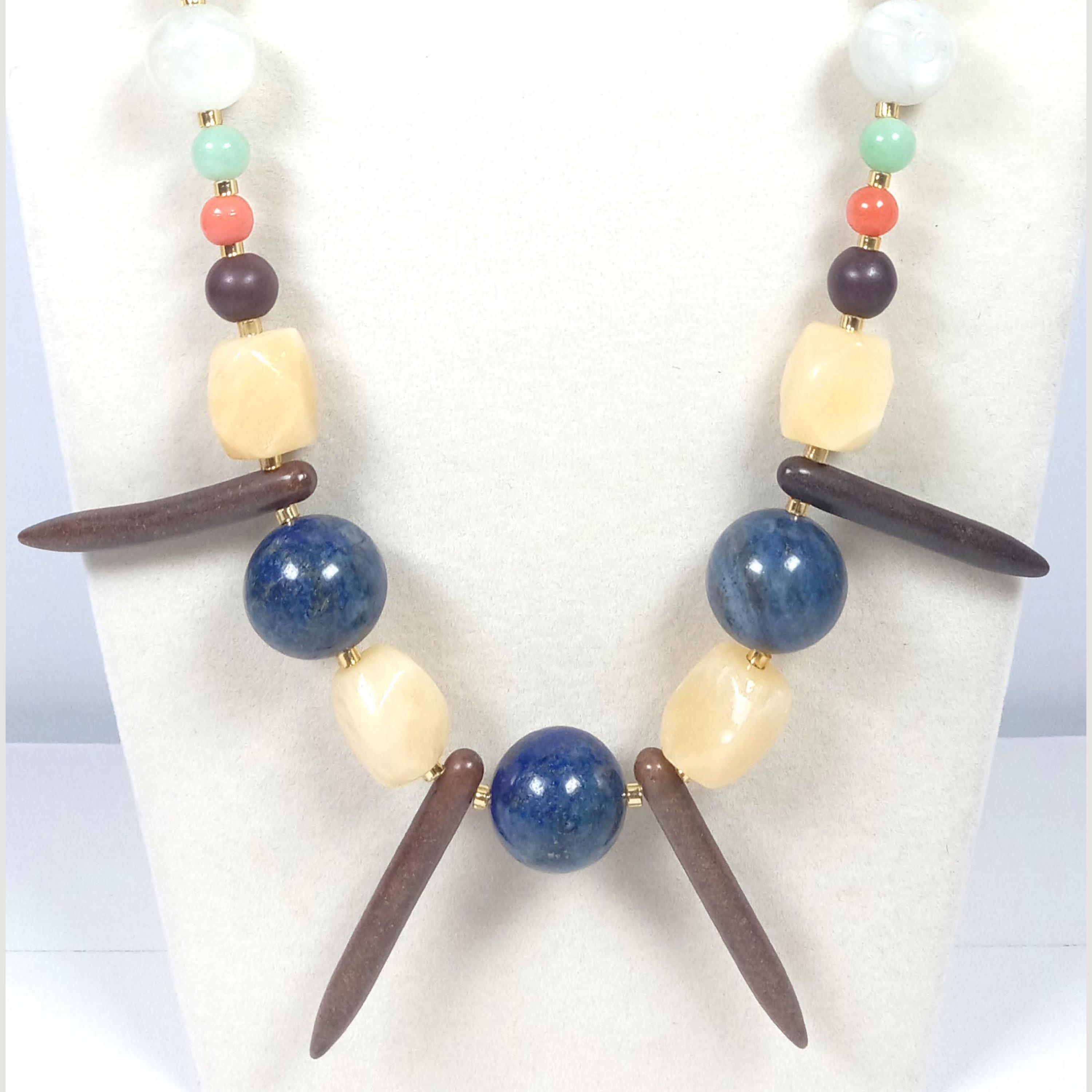 This one-of-a-kind Brown Jasper and Coral and Sea Green Jade with White Sunstone plus Lapis Lazuli and Honey Calcite is a necklace made with natural stones. One of the beads are birthstone for the month of December.