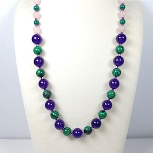 This one-of-a-kind Argentinian Rose, Chrysoprase, Honey Calcite, Quartz, and Black Seraphinite is a necklace made with natural stones.