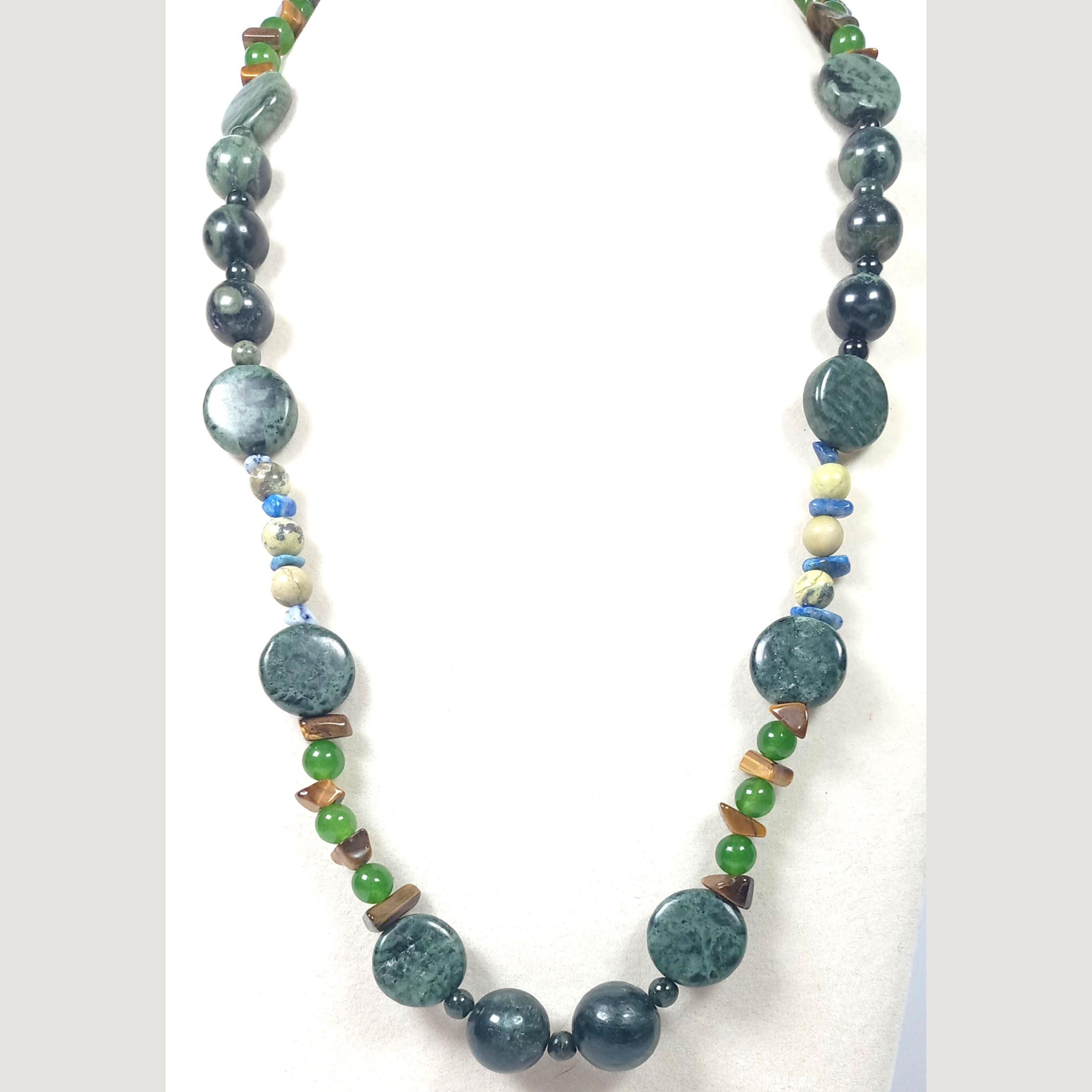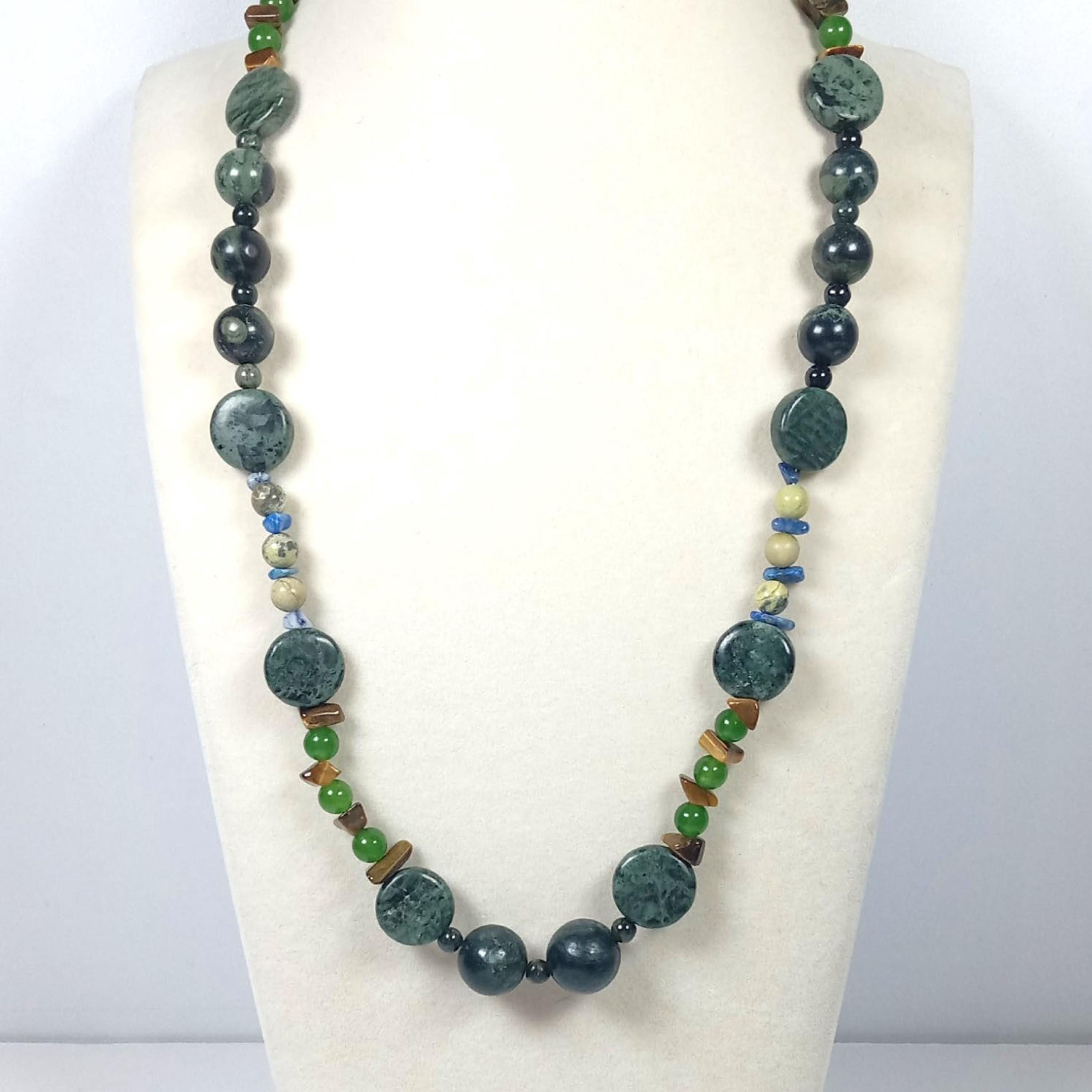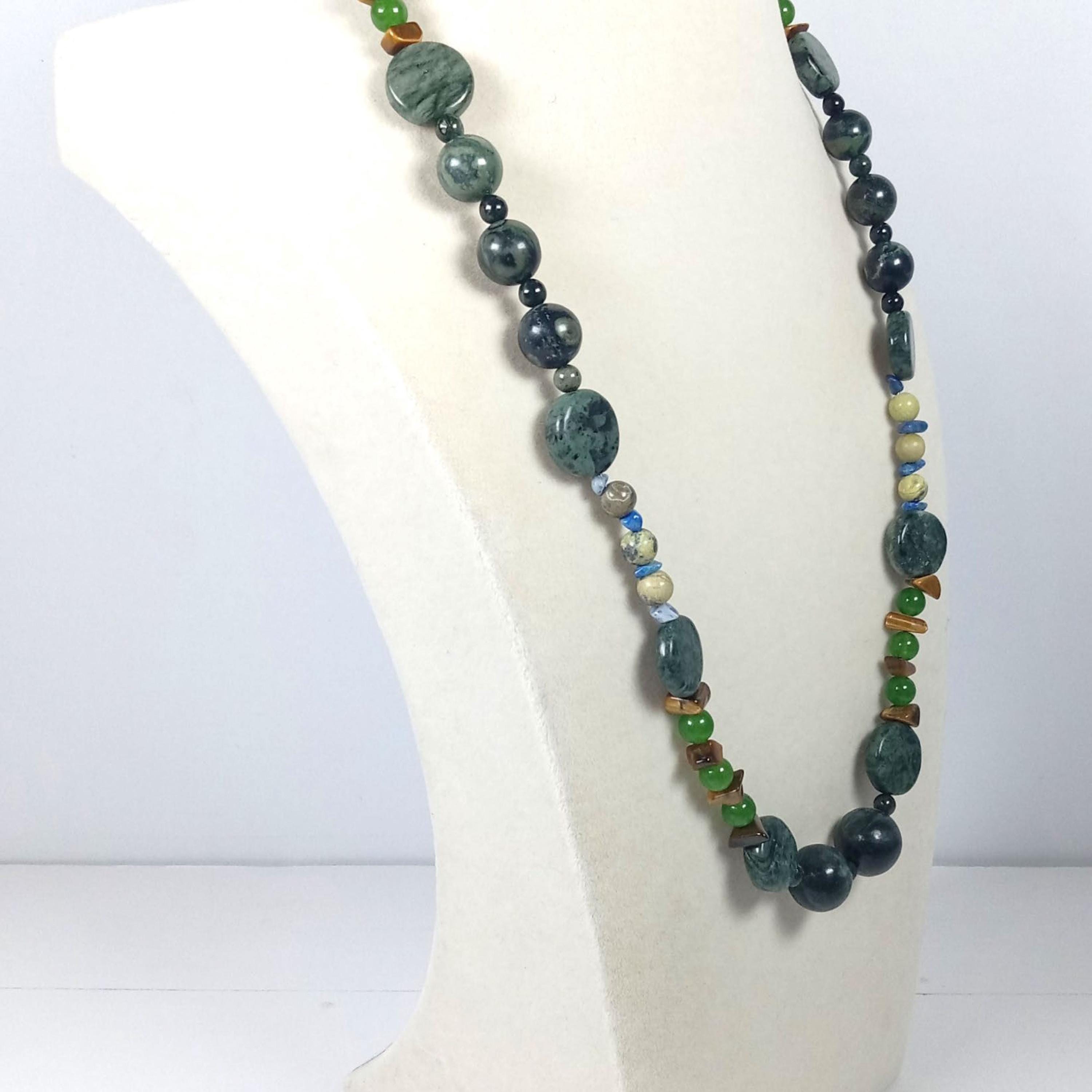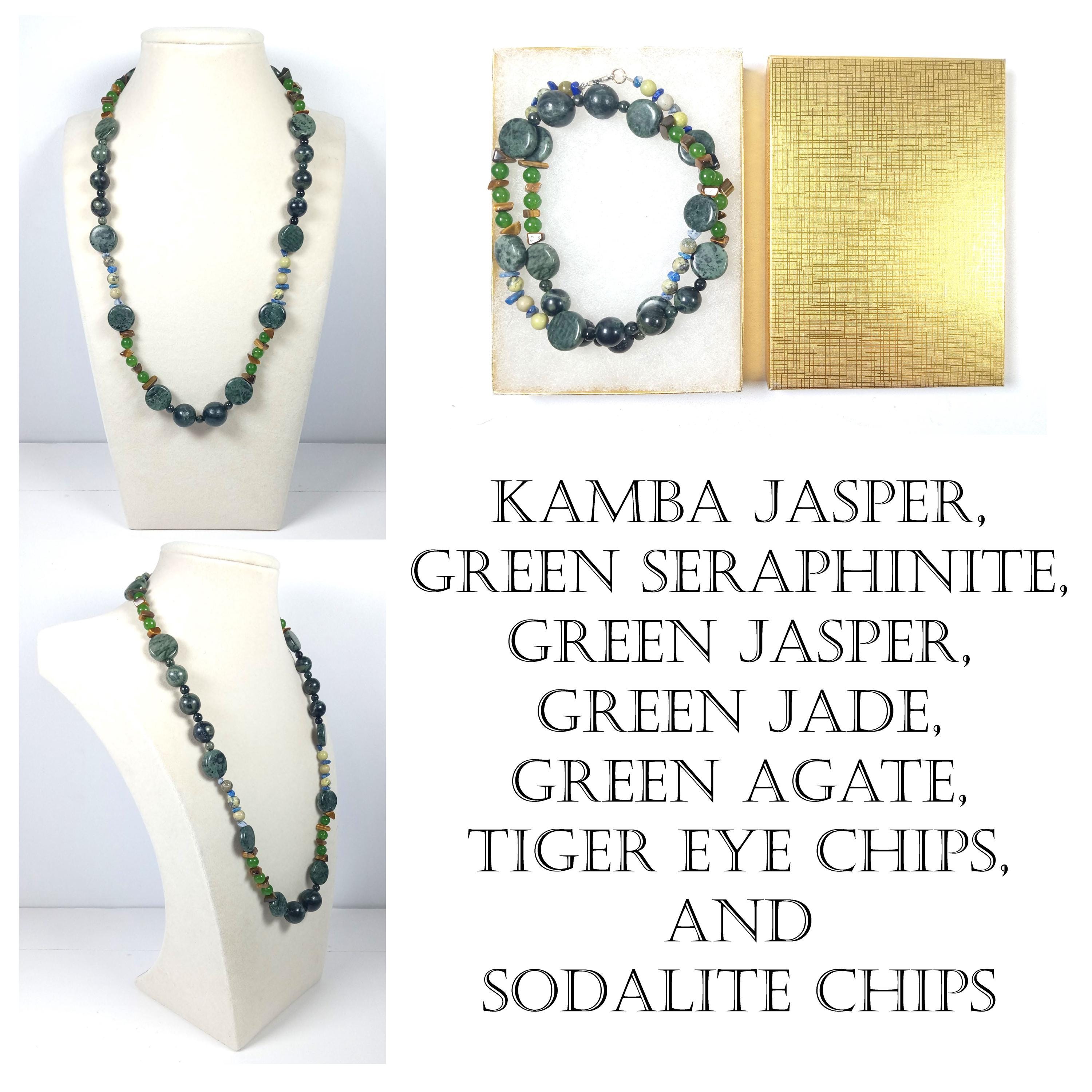 This one-of-a-kind Kamba Jasper, Green Seraphinite, Green Jasper, Green Jade, Green Agate, Tiger Eye Chips, and Sodalite Chips is a necklace made with natural stones.