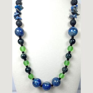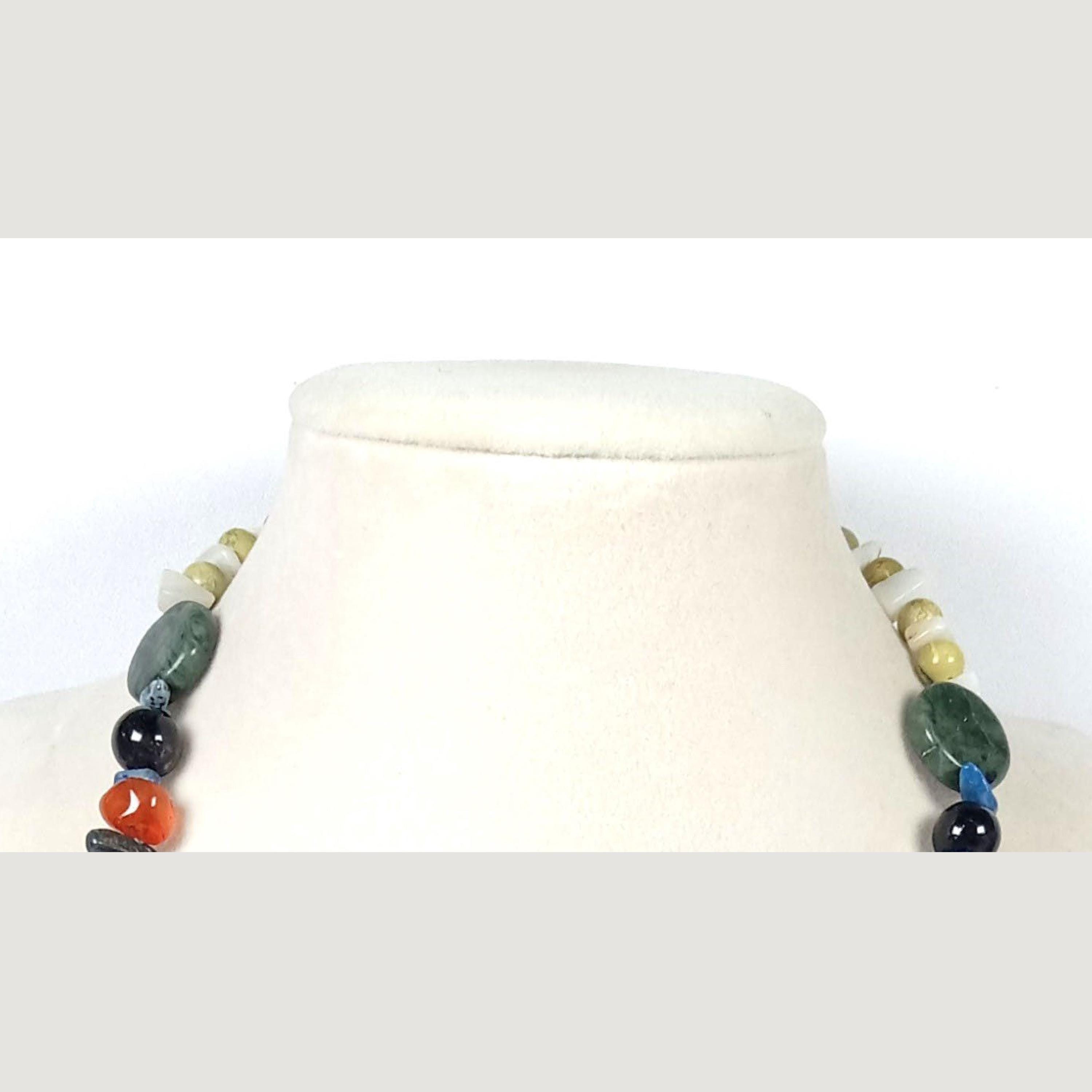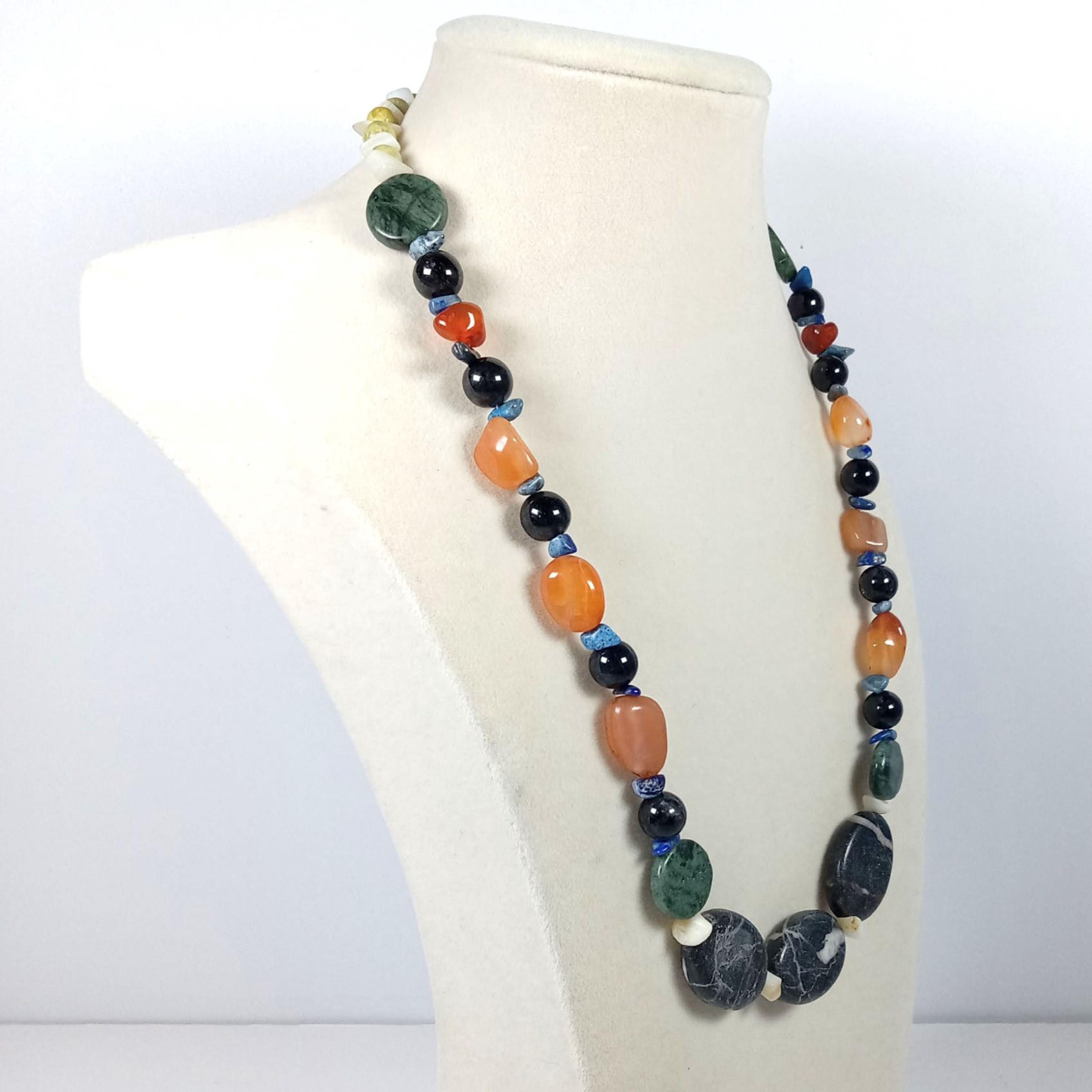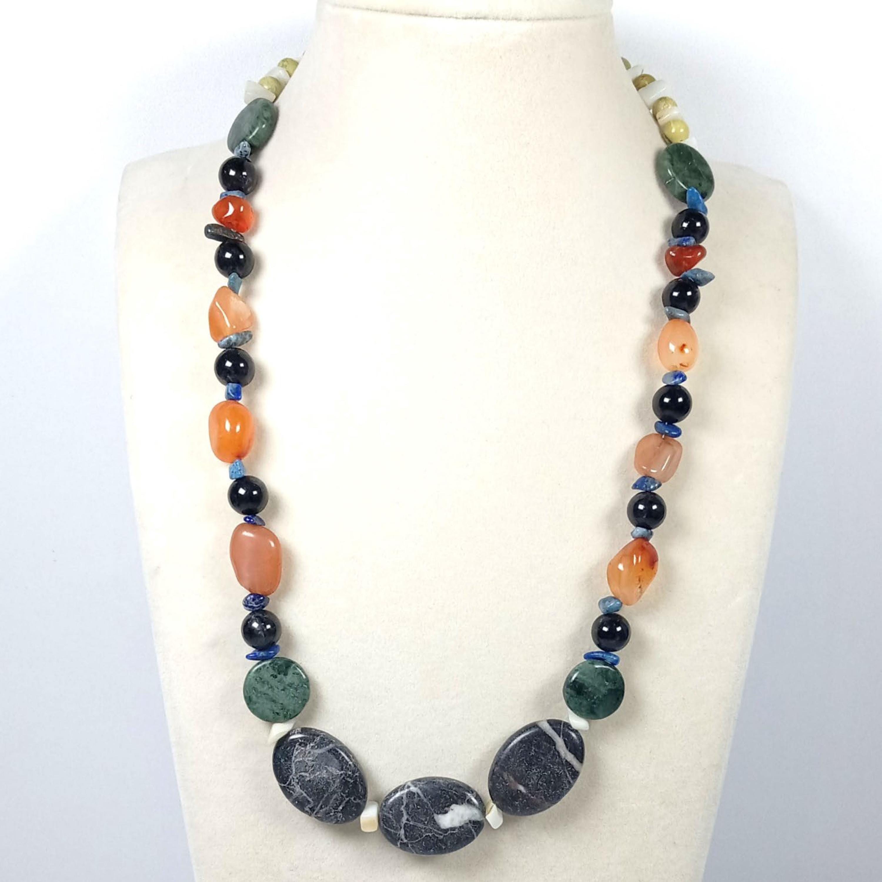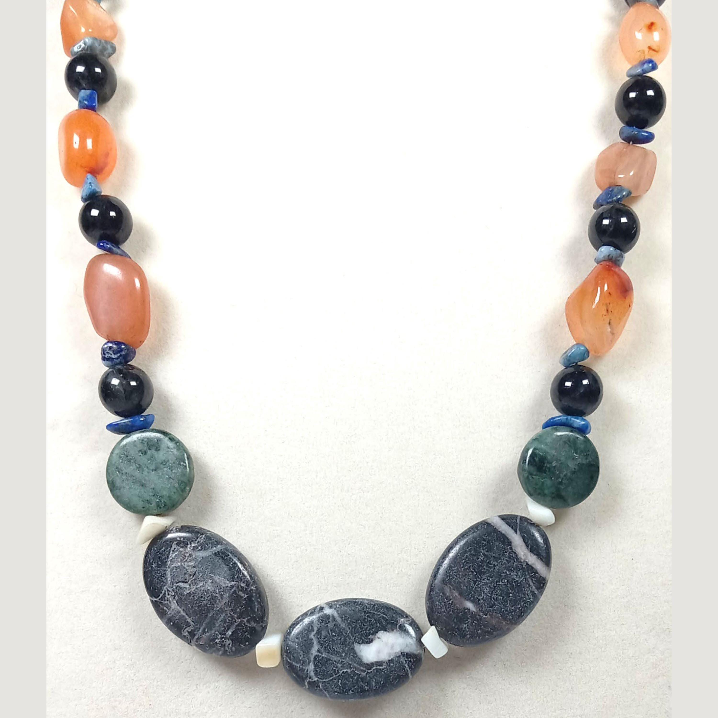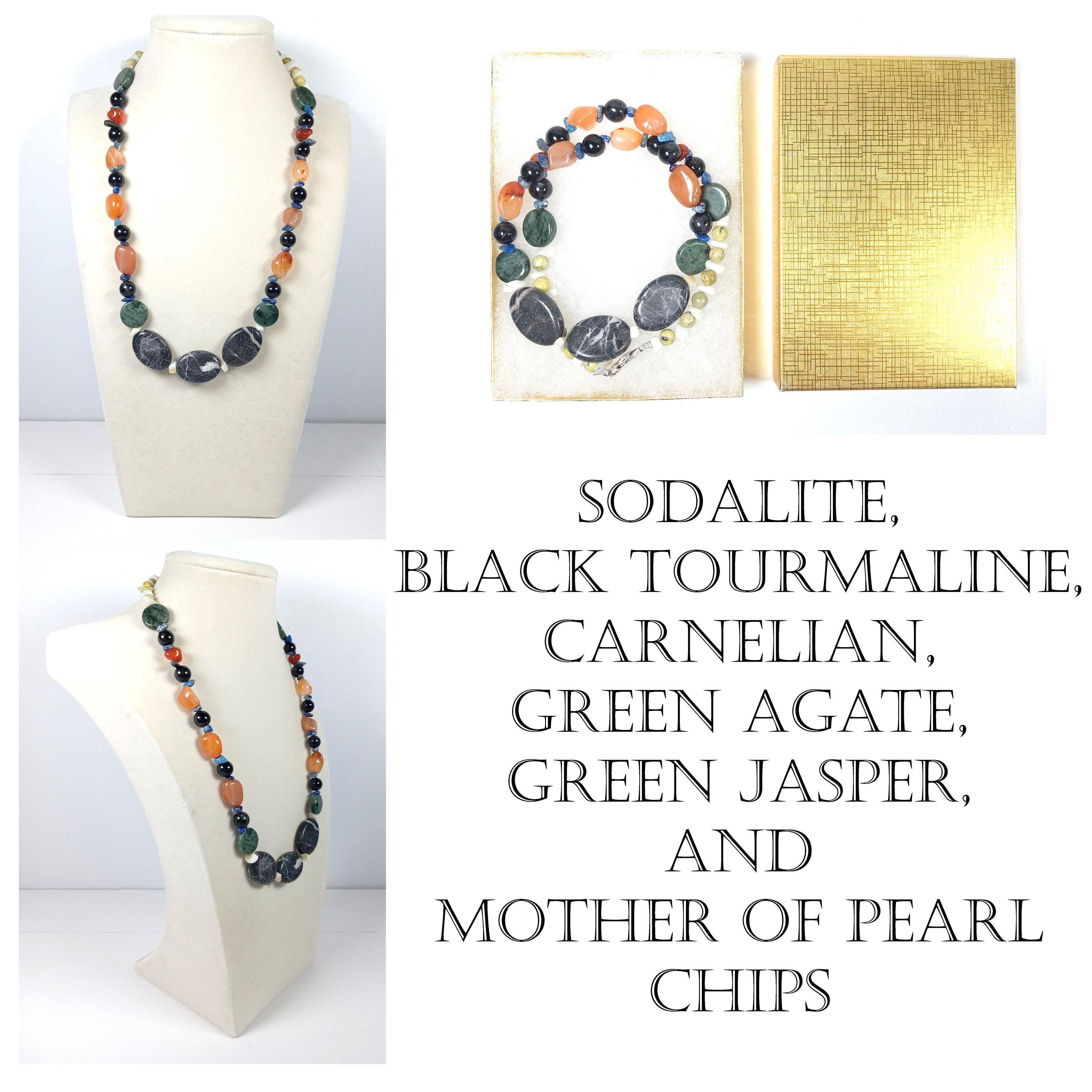 This one-of-a-kind Sodalite, Black Tourmaline, Carnelian, Green Agate, Green Jasper, and Mother of Pearl Chips is a necklace made with natural stones. Two of the beads are birthstones for the months of June and October.